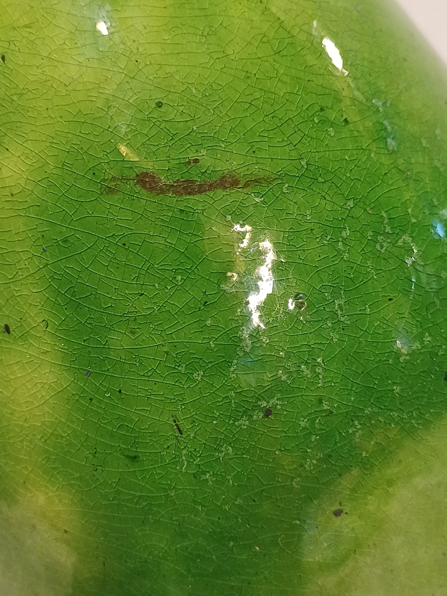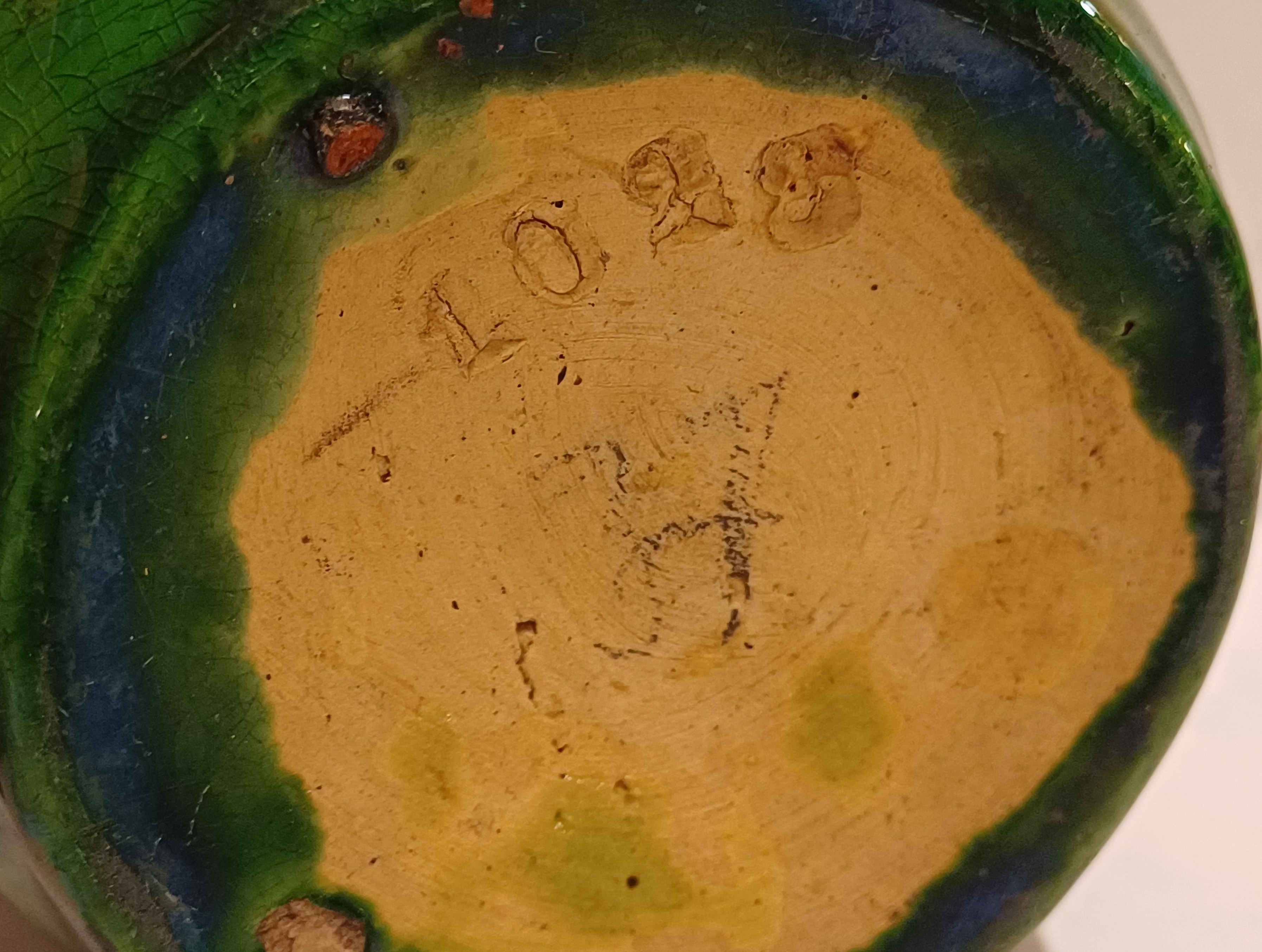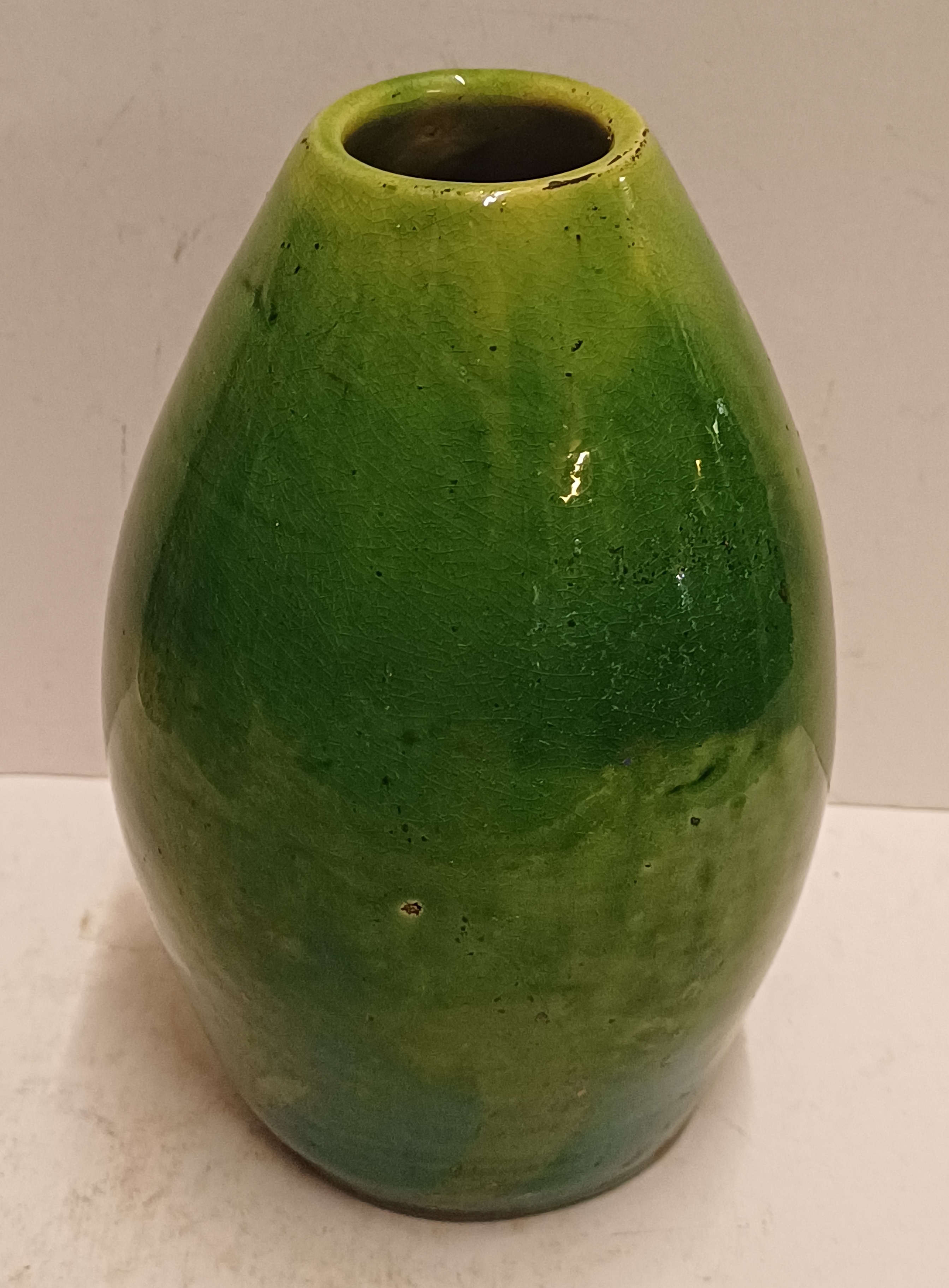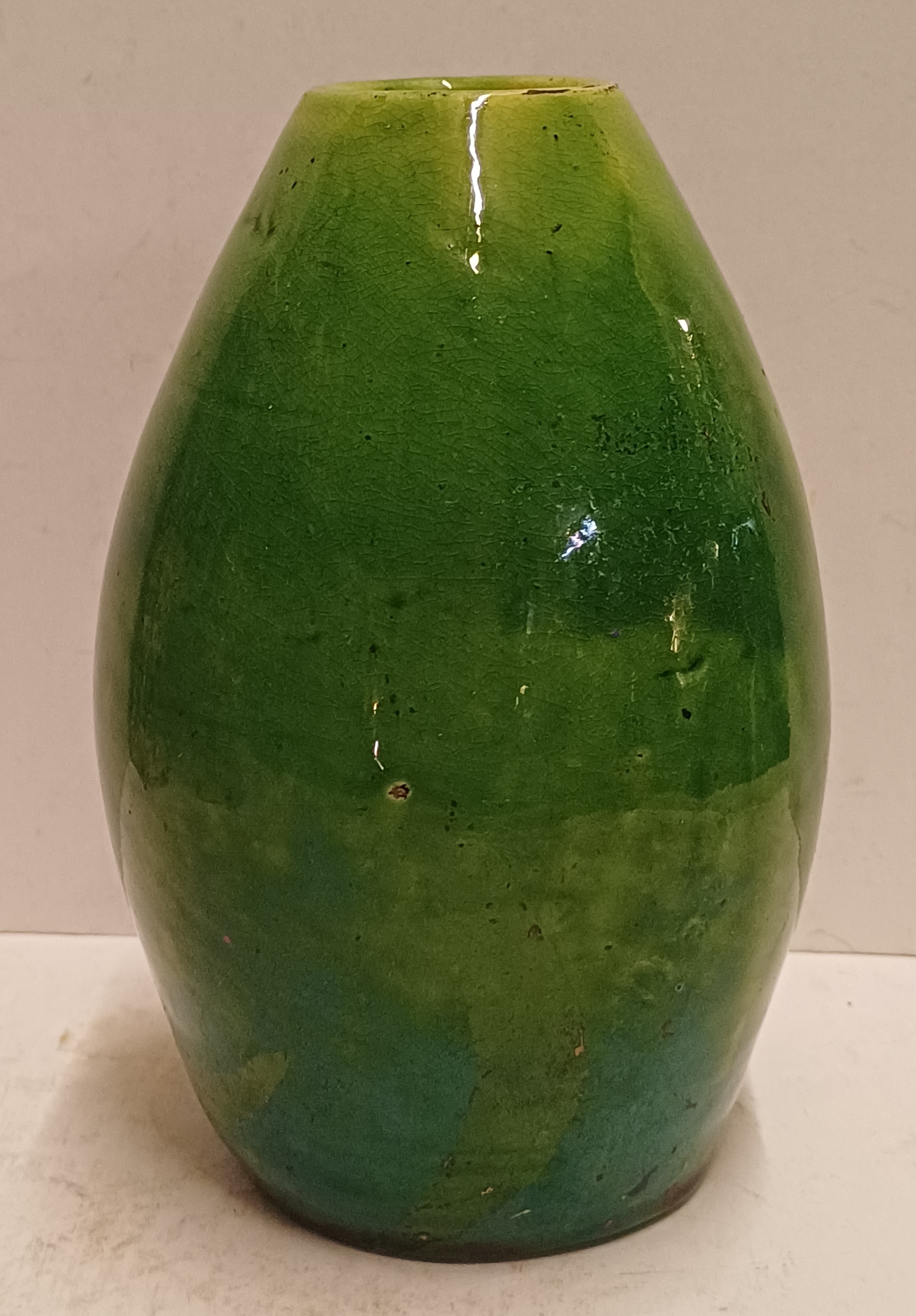 Aardewerken gedraaide vaas met boeren groene glazuur. Onderzijde met ingedrukt modelnummer.