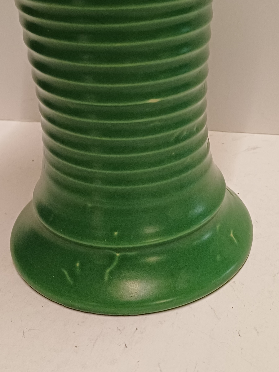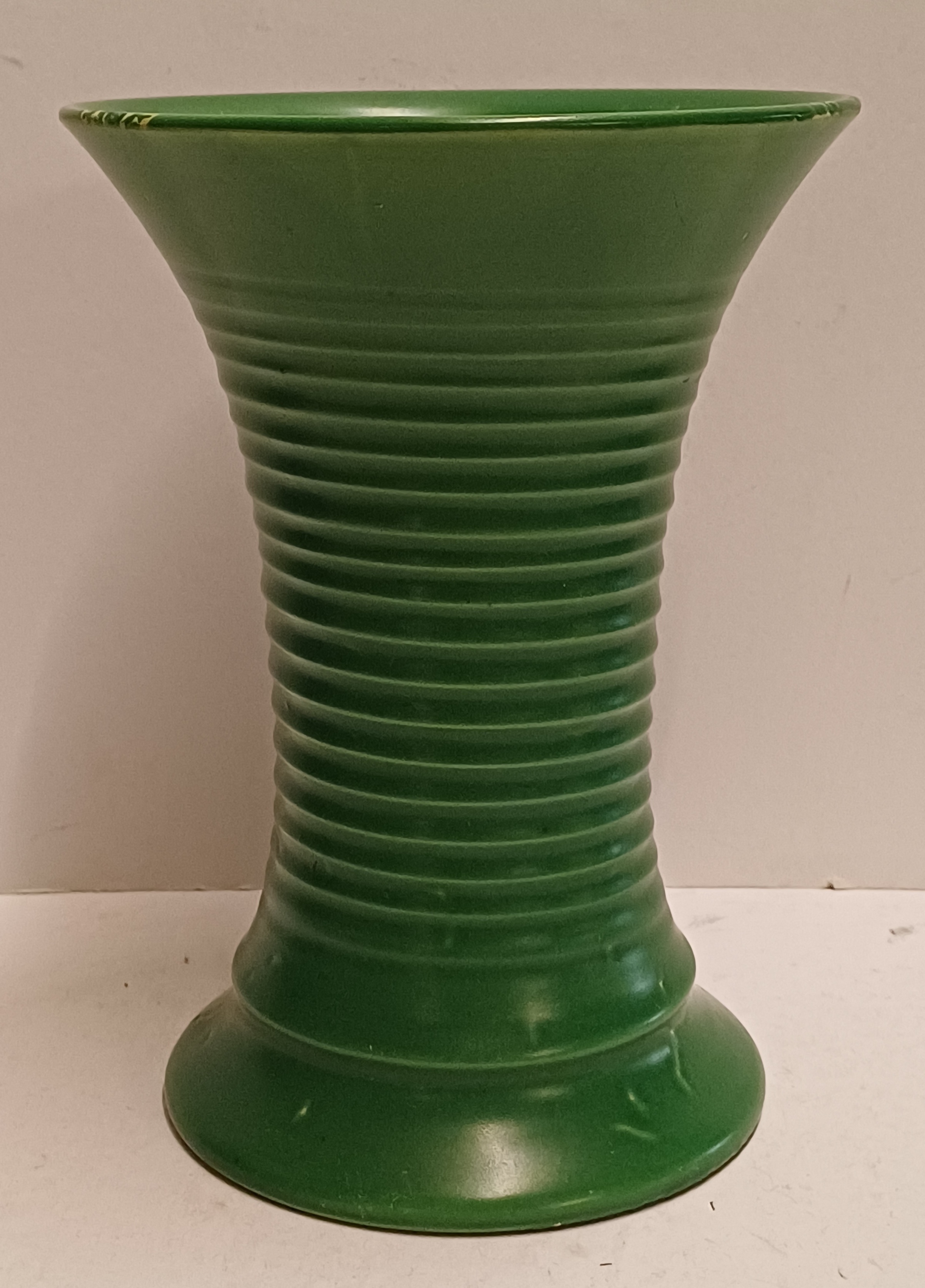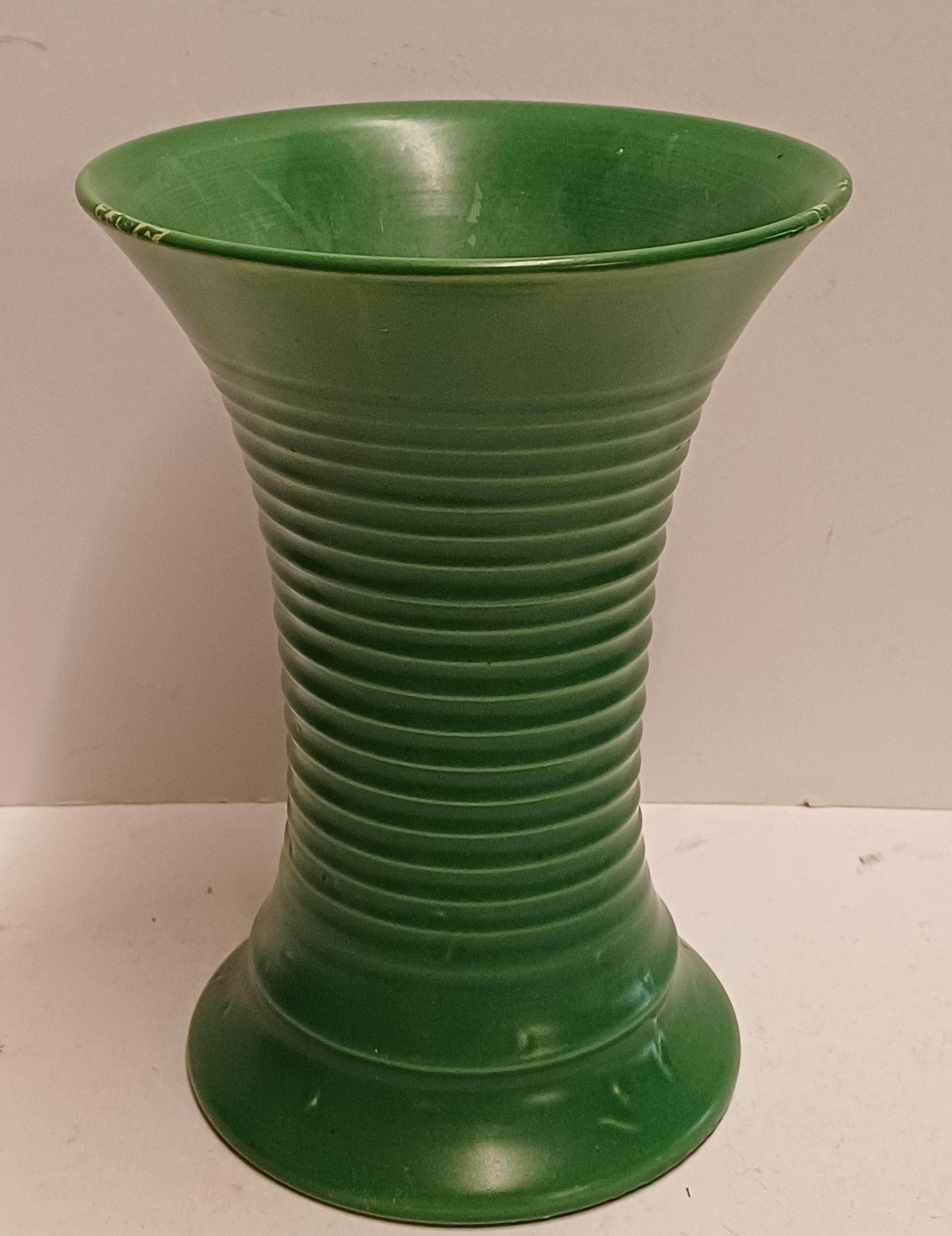 Earthenware diabolo vase with green glaze. Marked on the bottom and model number 1027.