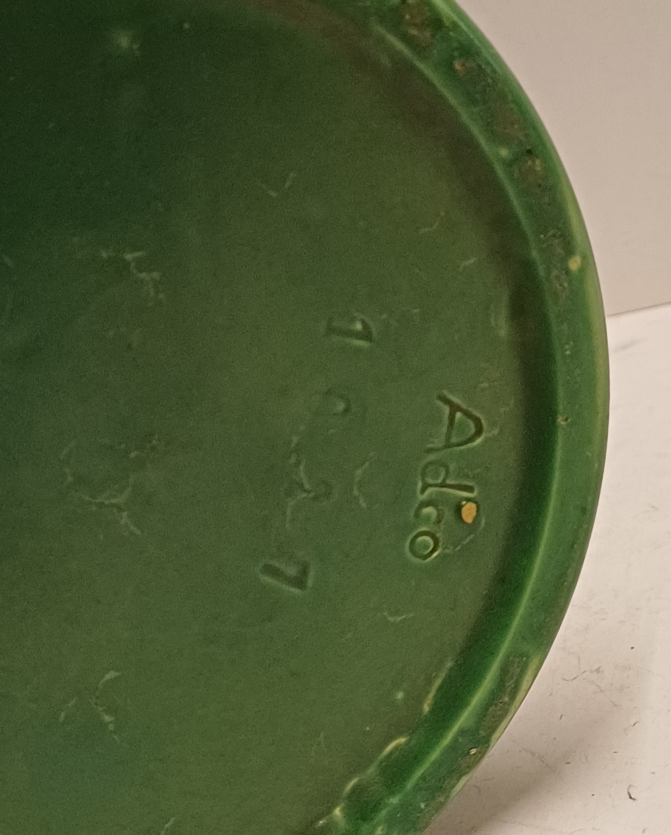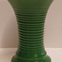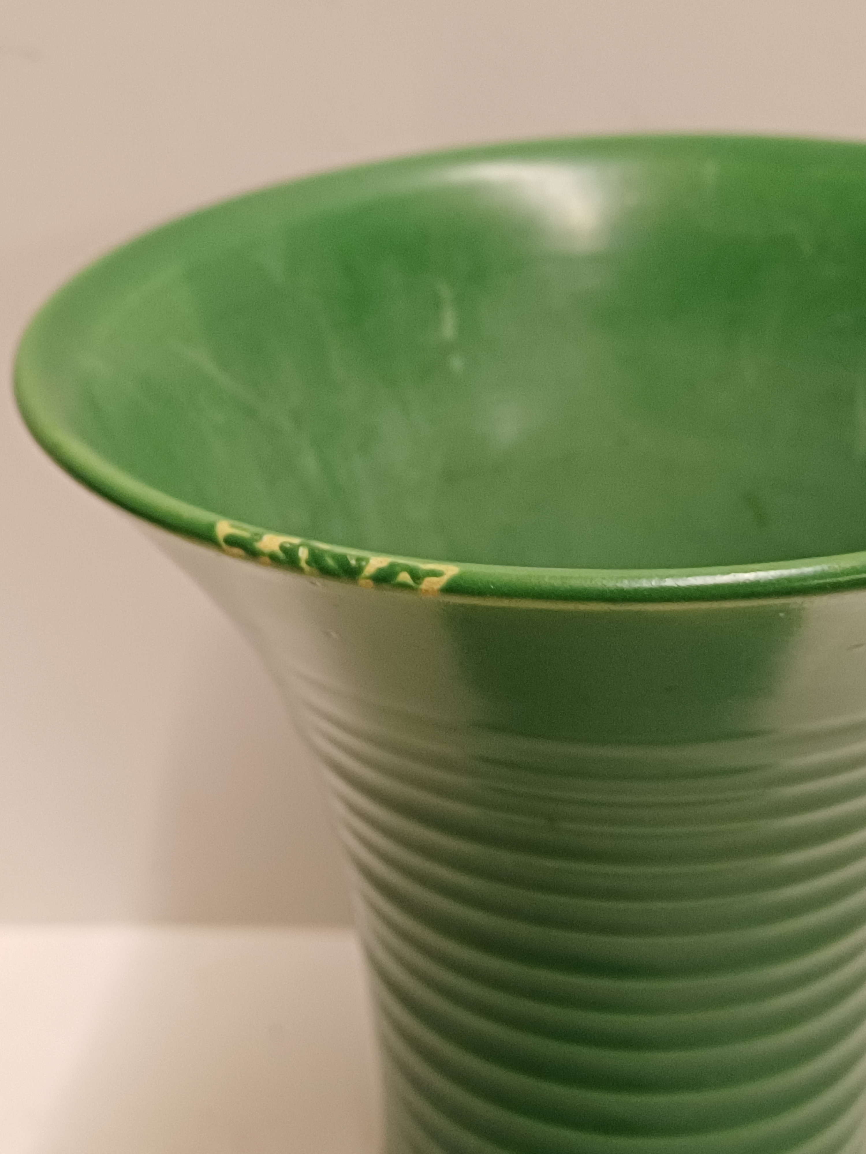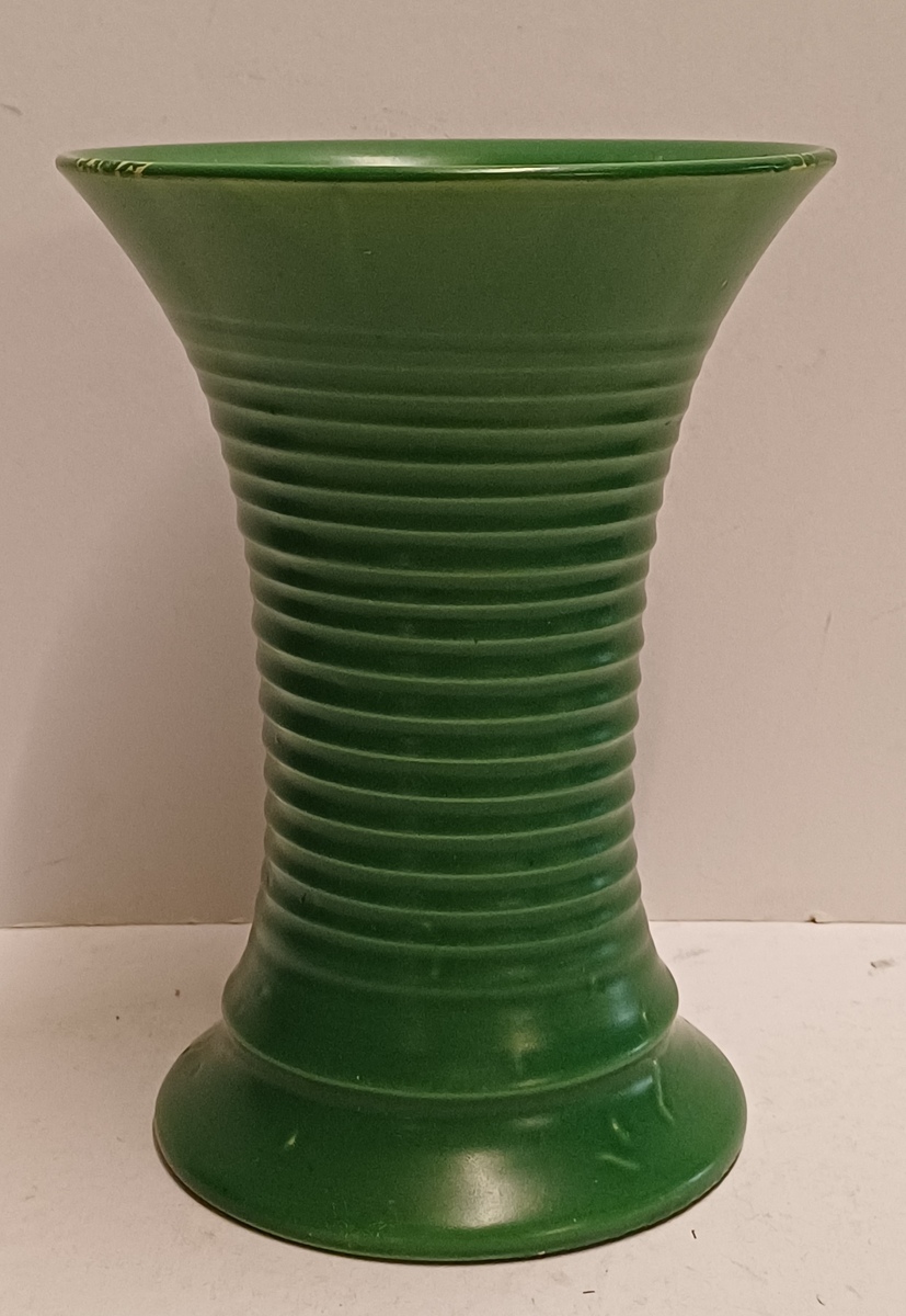 Earthenware diabolo vase with green glaze. Marked on the bottom and model number 1027.