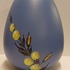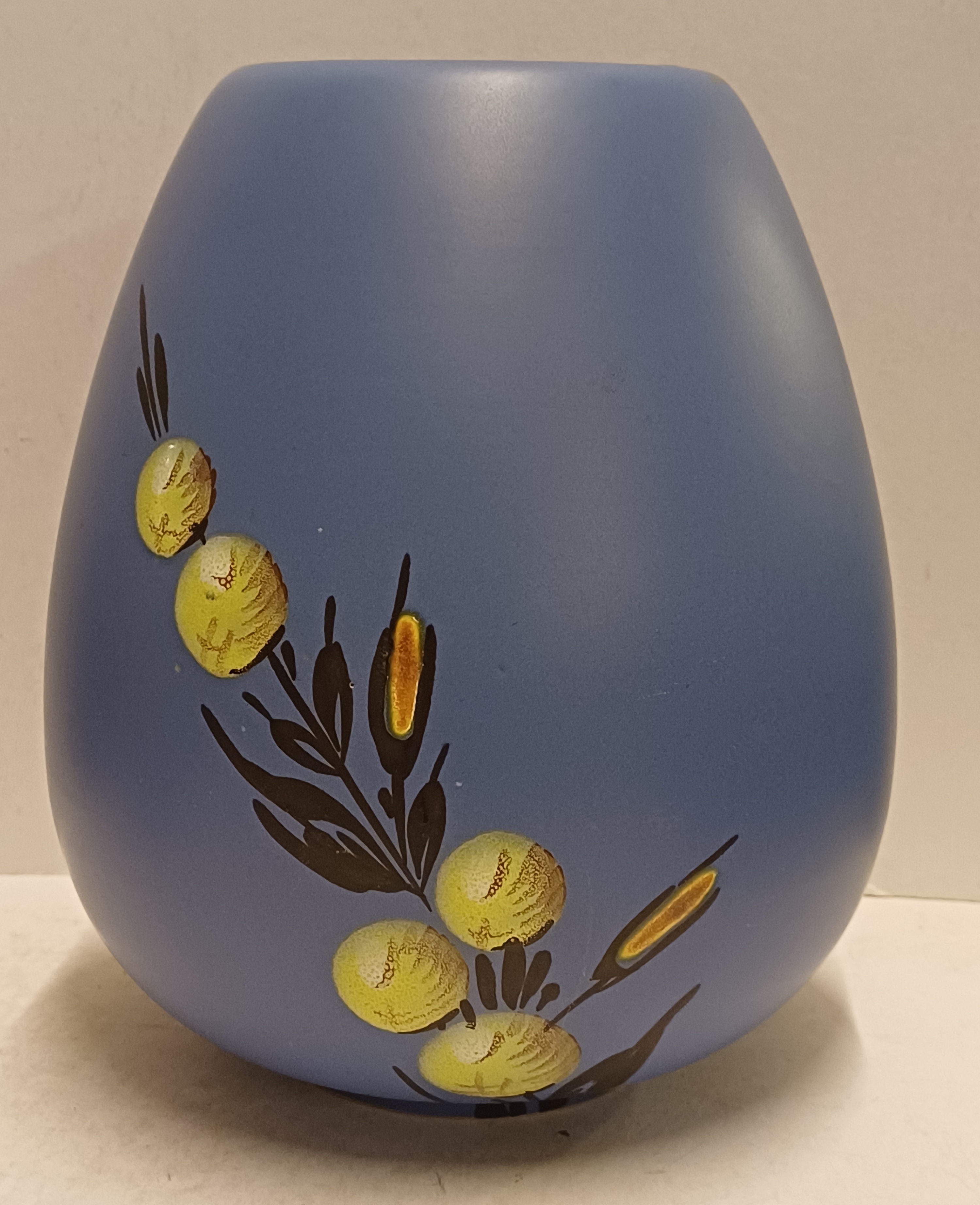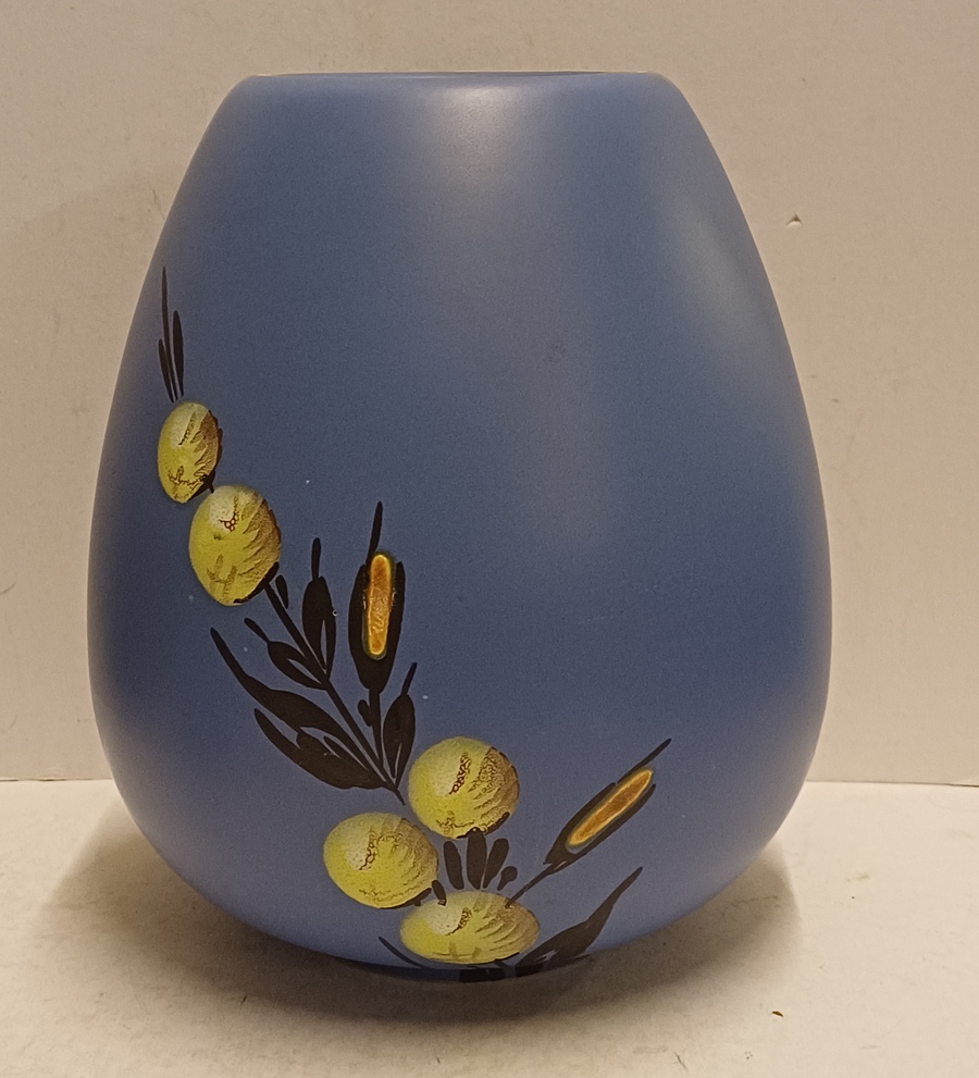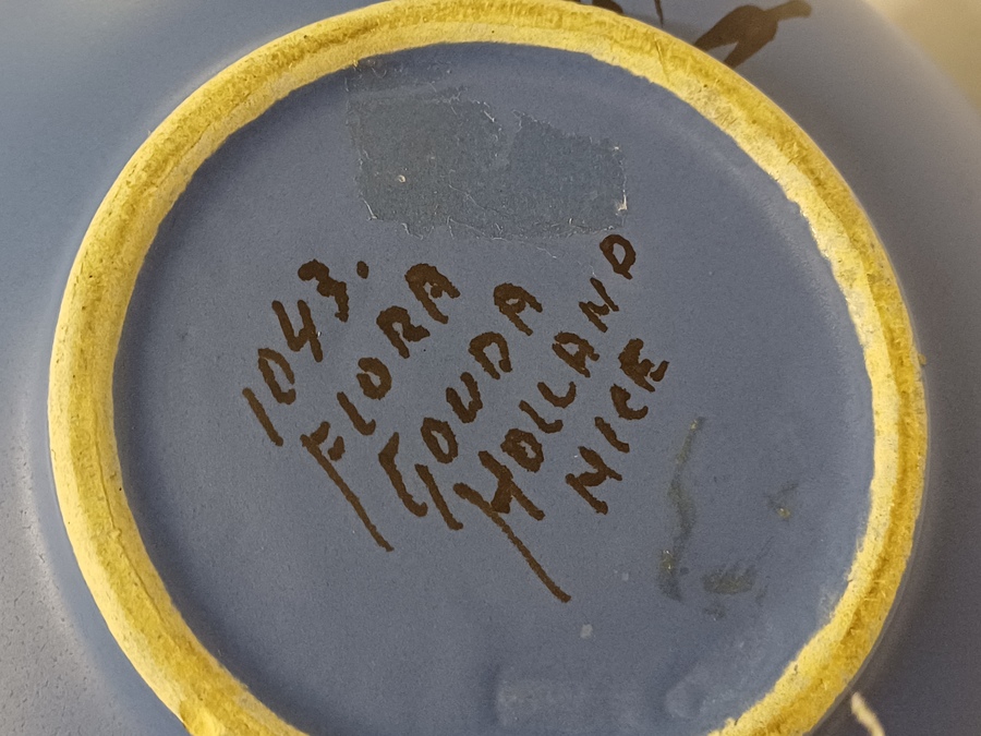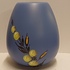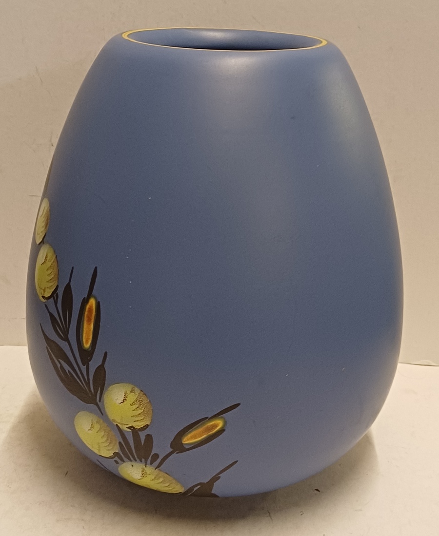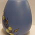 Platelen vaas met floraal decor op blauwe ondergrond. Onderzijde gemerkt.