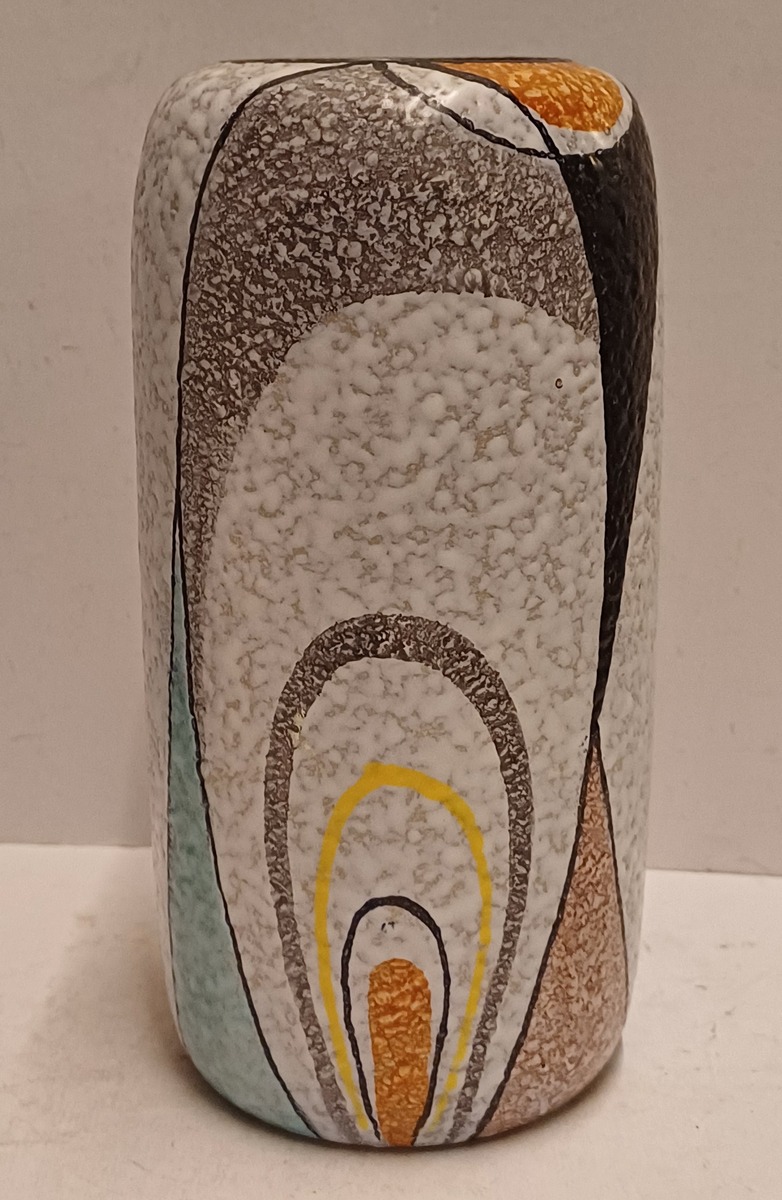 Platelen vaas met decor Rumba op grijs fond. Onderzijde met fabrieksmerk en modelnummer.