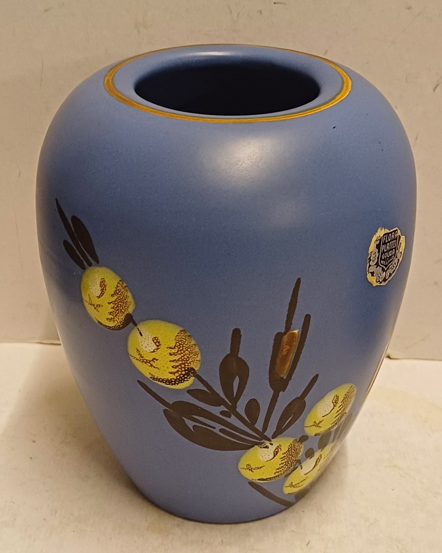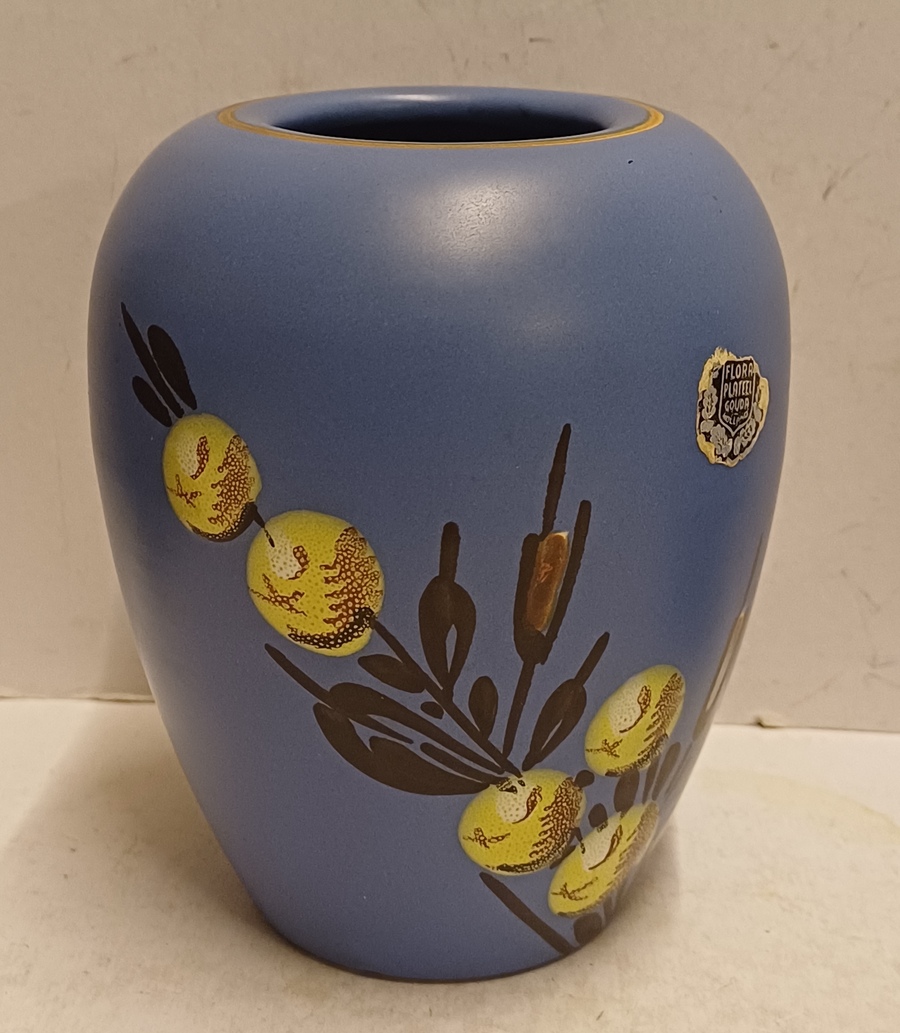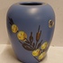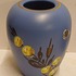 Platelen vaasje met floraal decor op blauwe ondergrond. Onderzijde gemerkt.