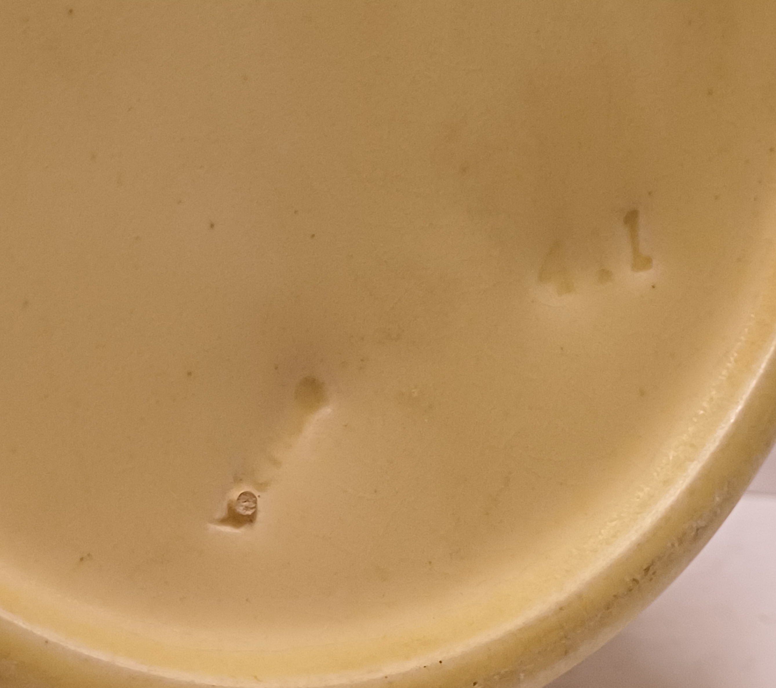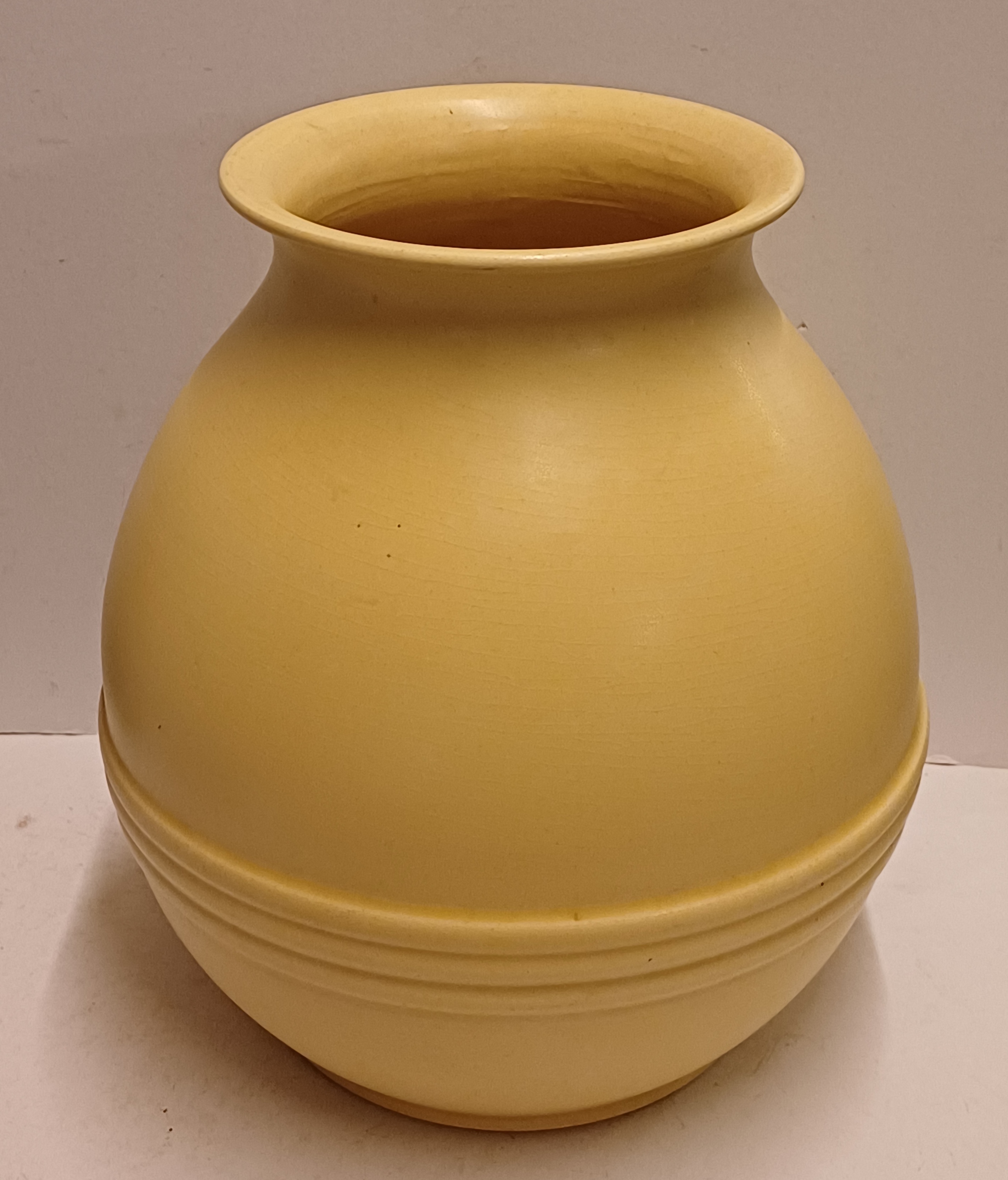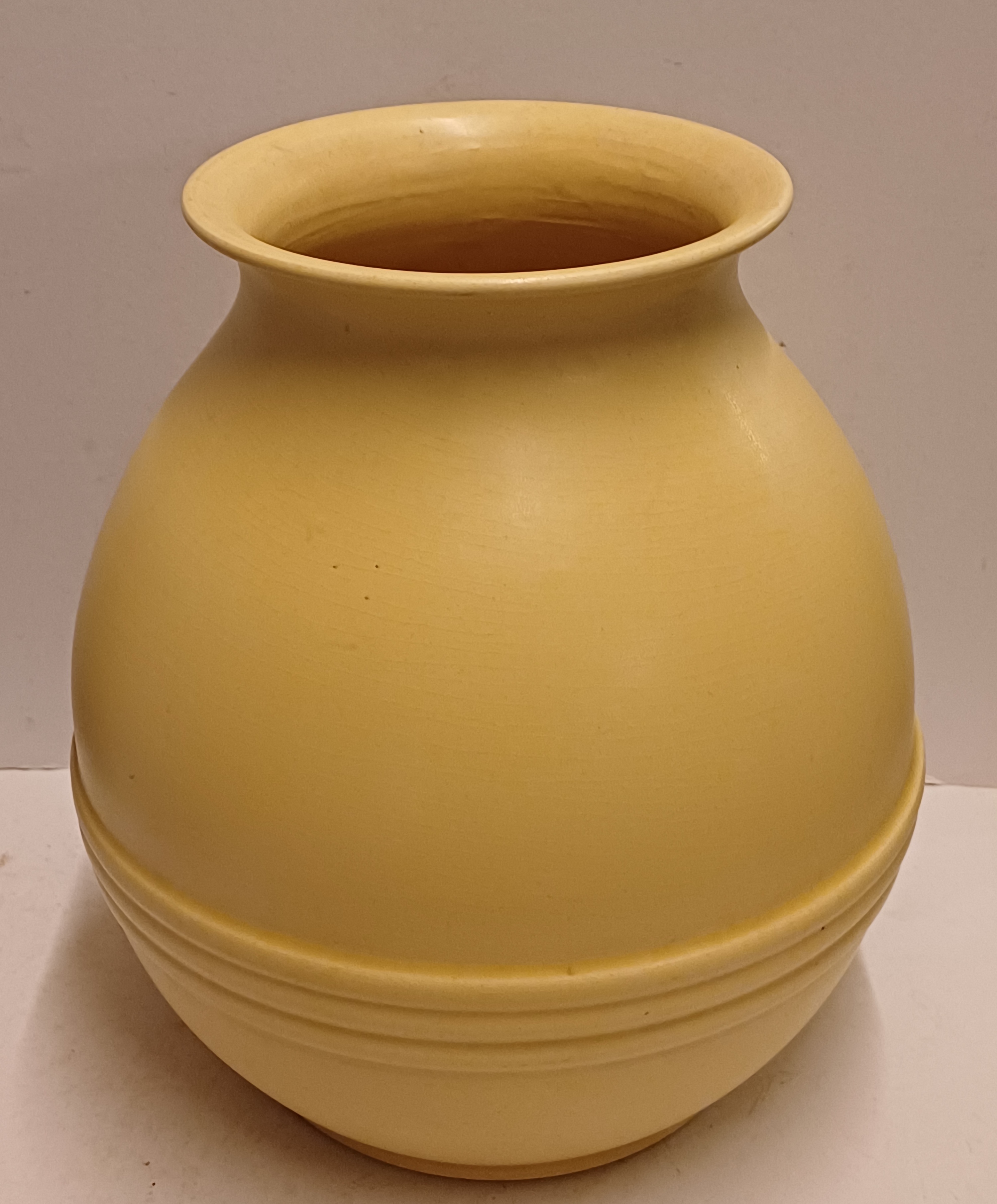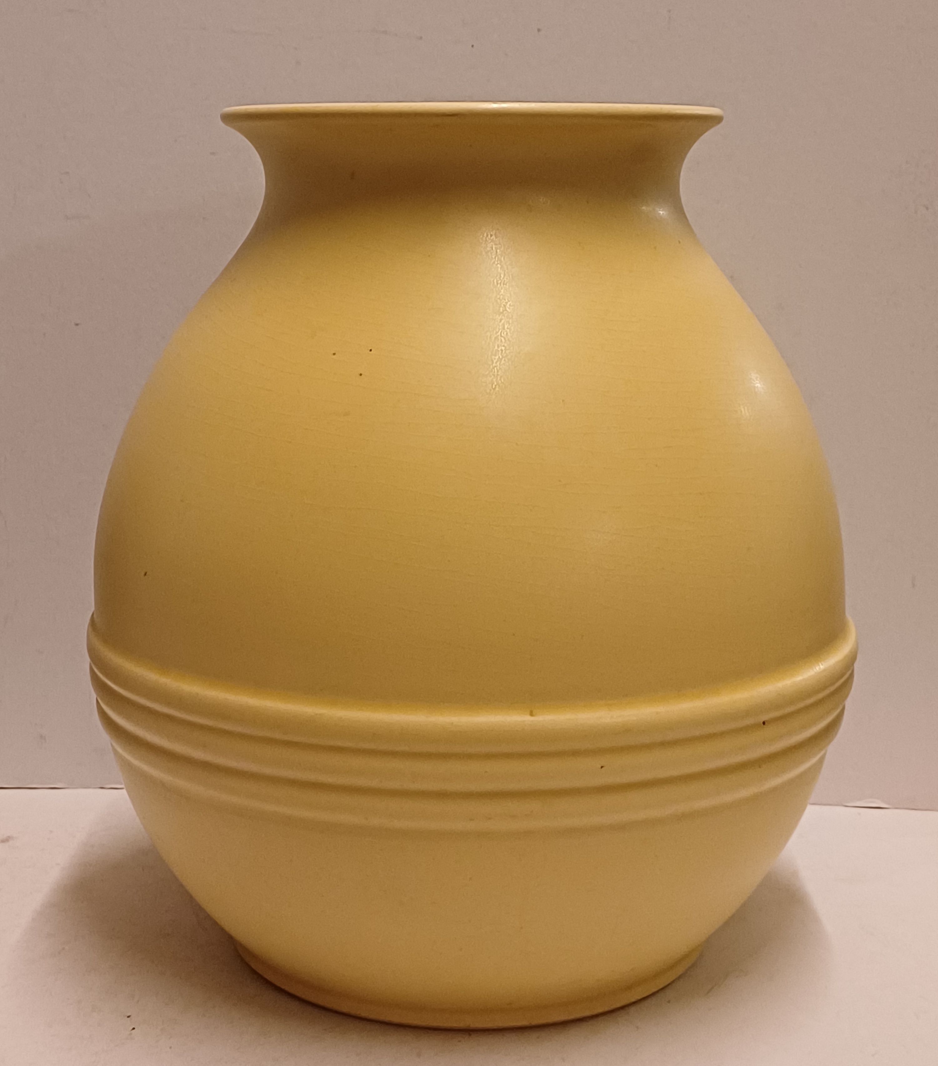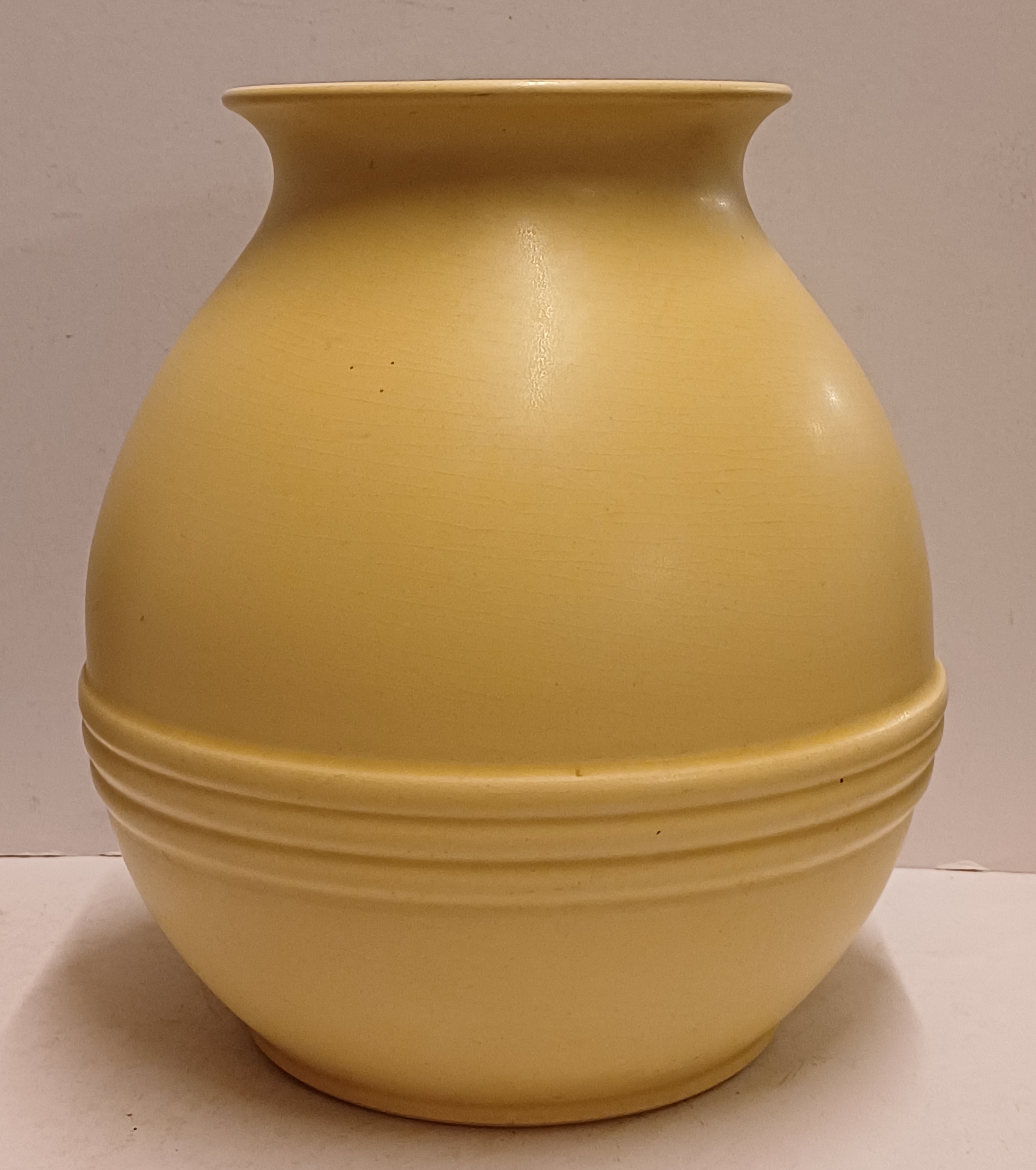 Grote creme geglazuurde vaas met 3 horizontale banden. Onderzijde gemerkt en genummerd.