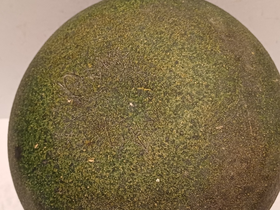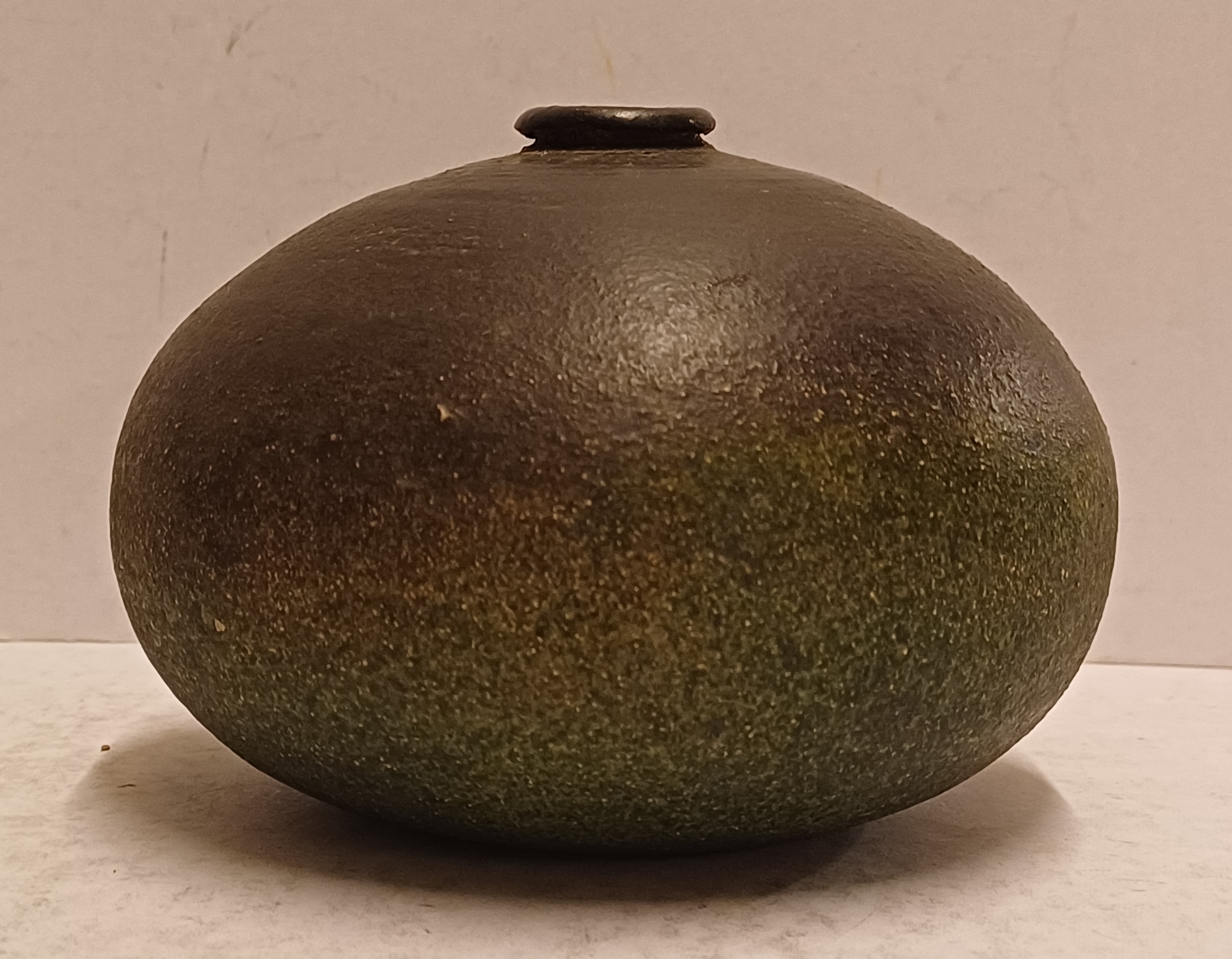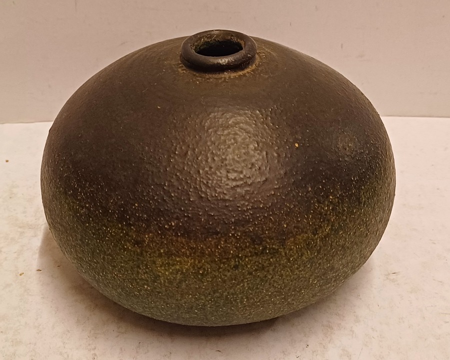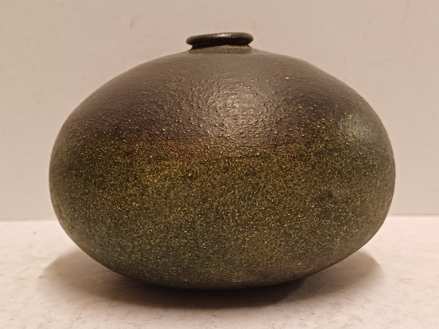 Vroege vaas met donkergroene glazuur op ruwe ondergrond. Onderzijde gemerkt en gedateerd.