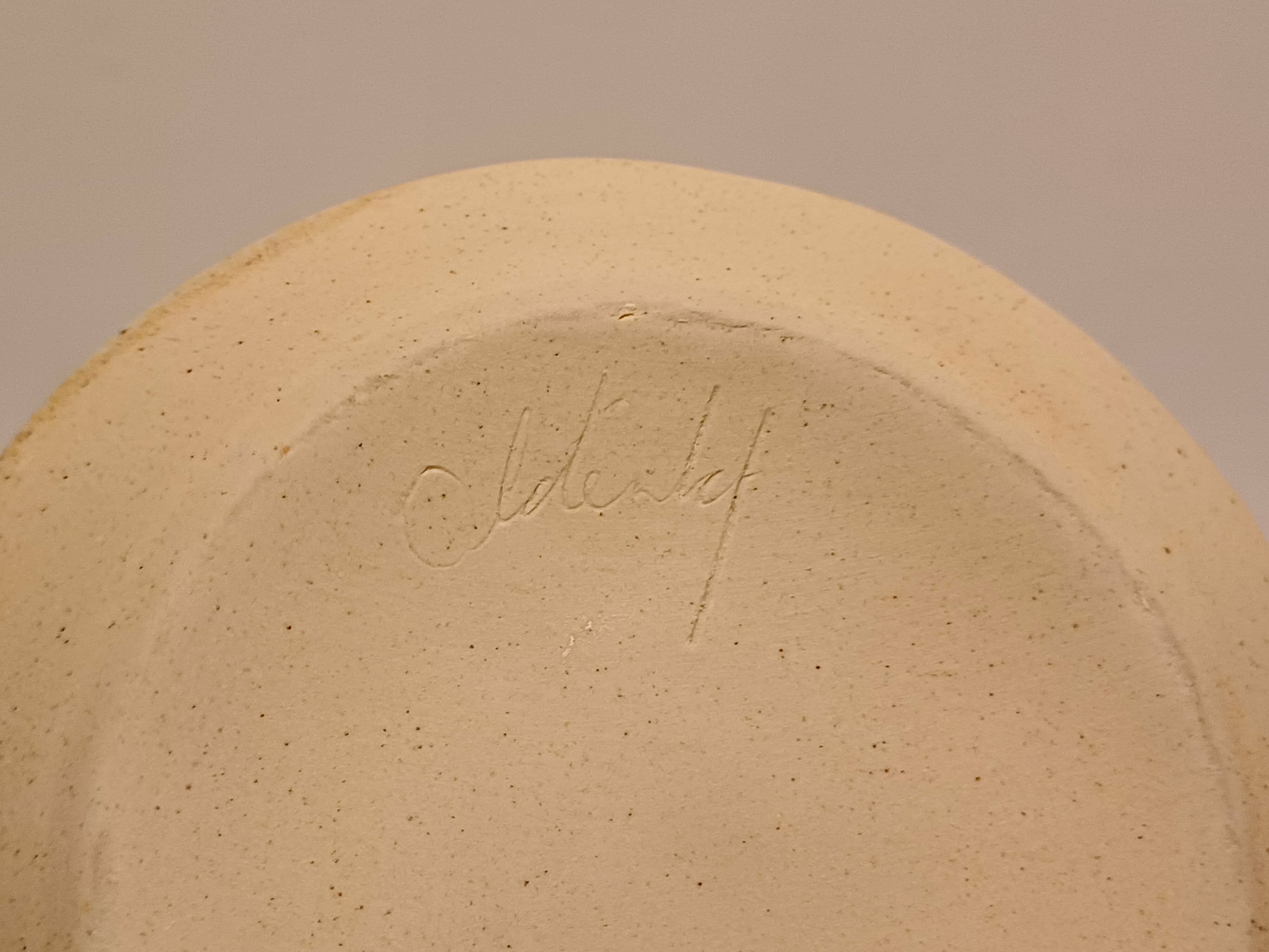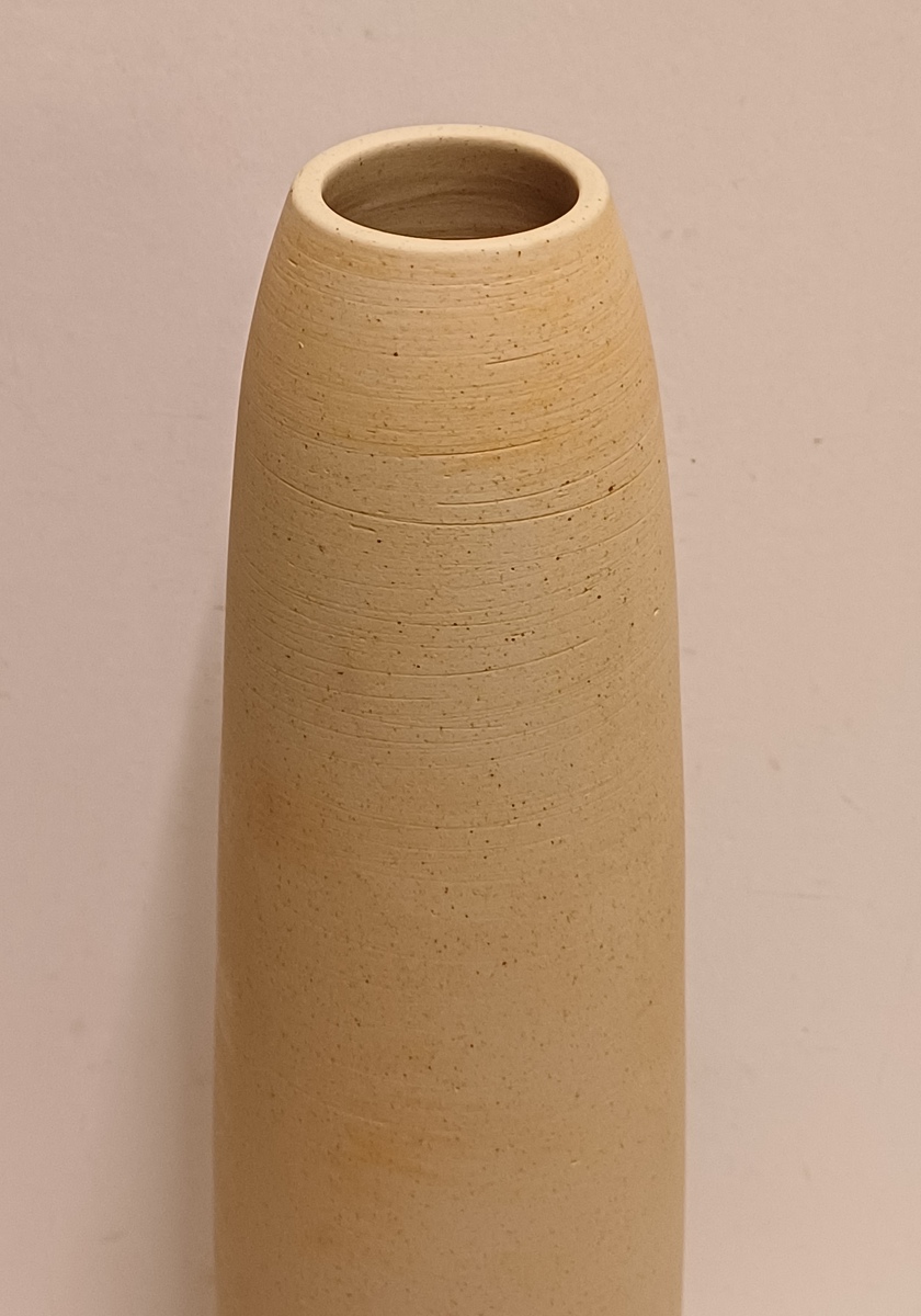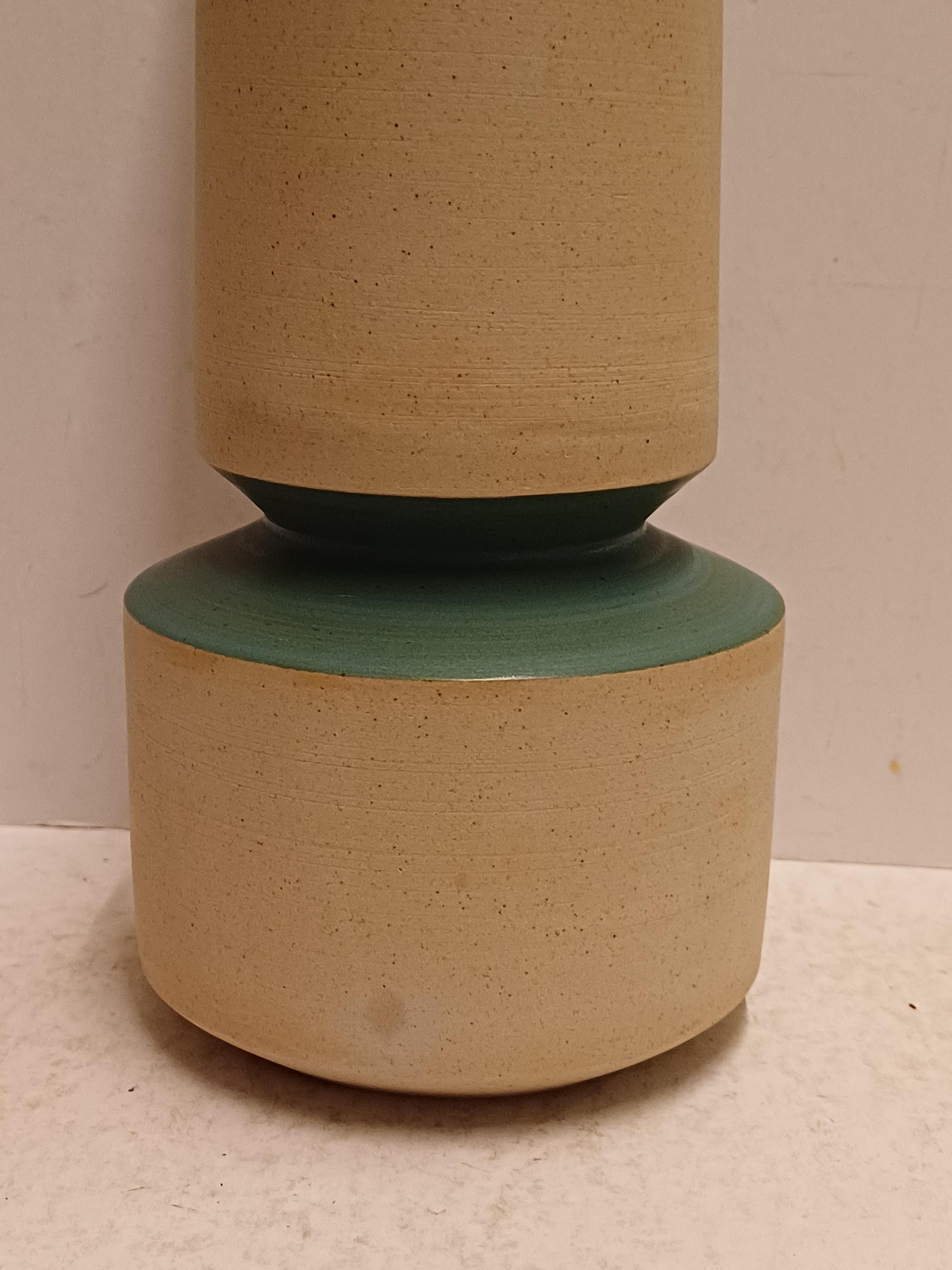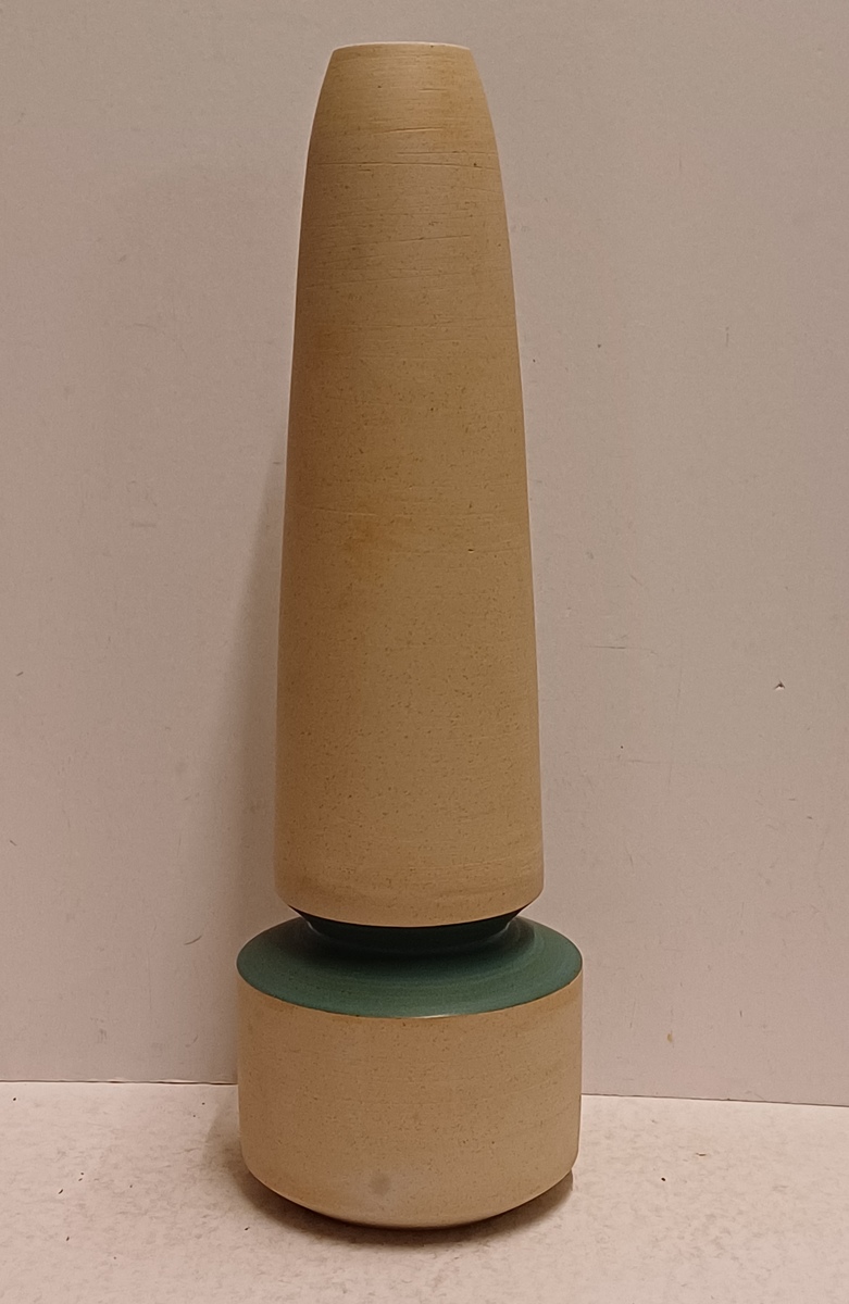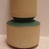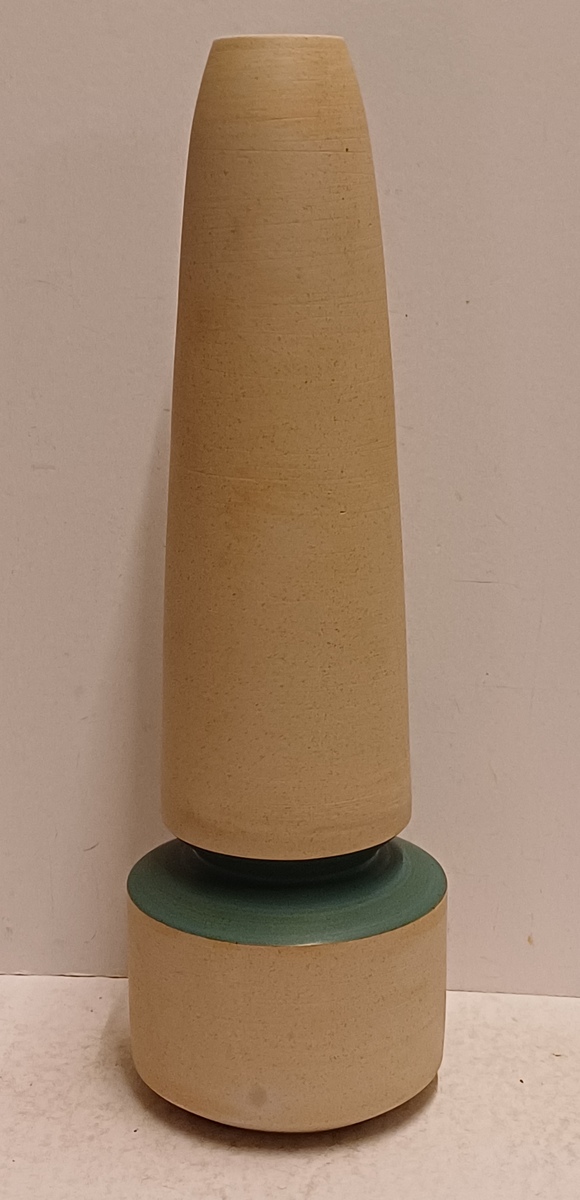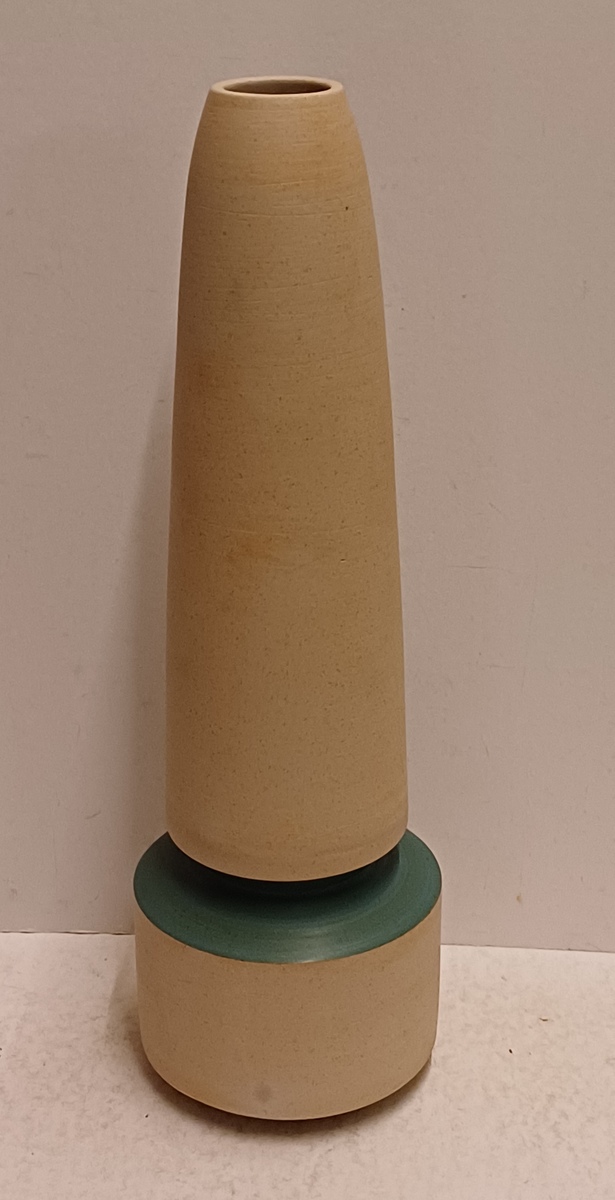 Ongeglazuurd porseleinen vaas met blauw groene geglazuurde tussenring. Onderzijde gesigneerd. Uitvoering in eigen atelier
