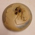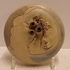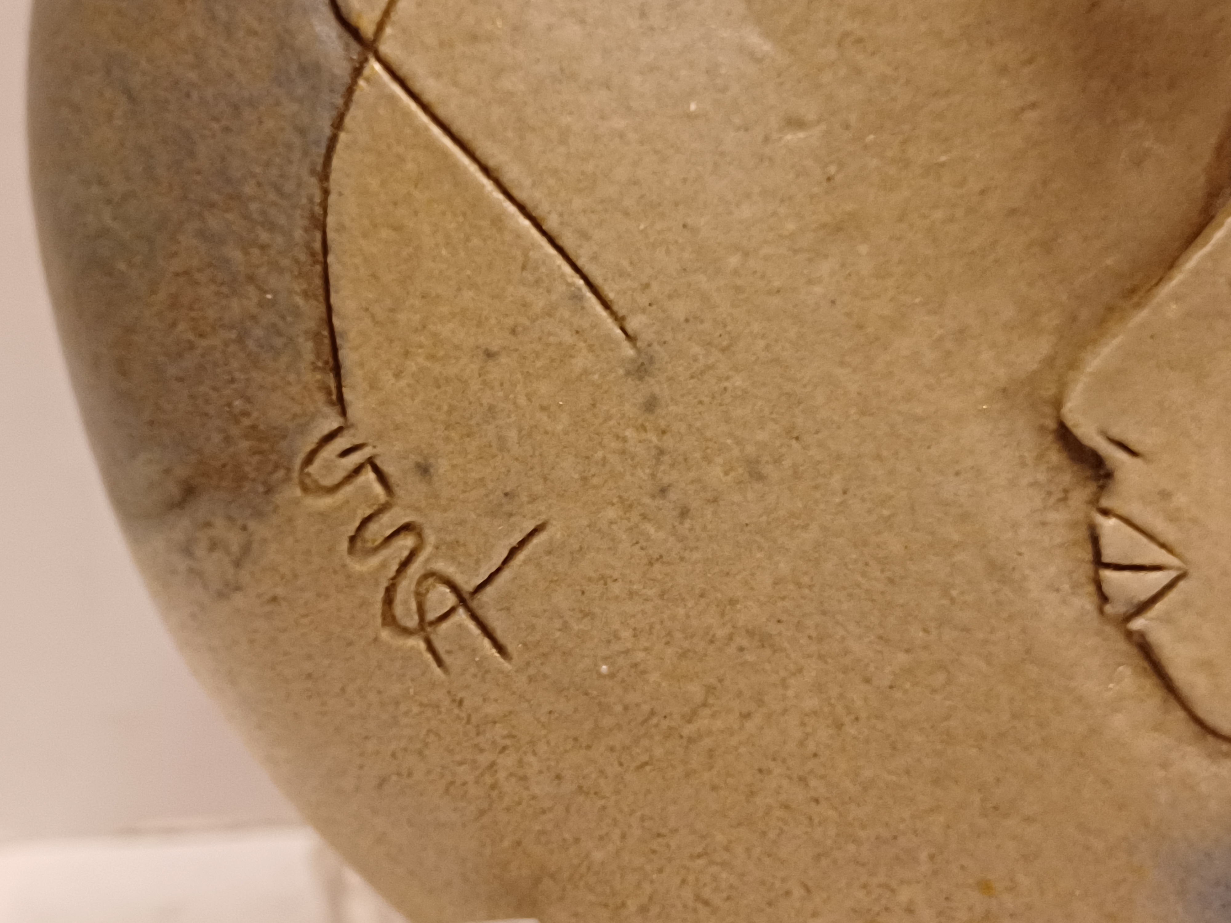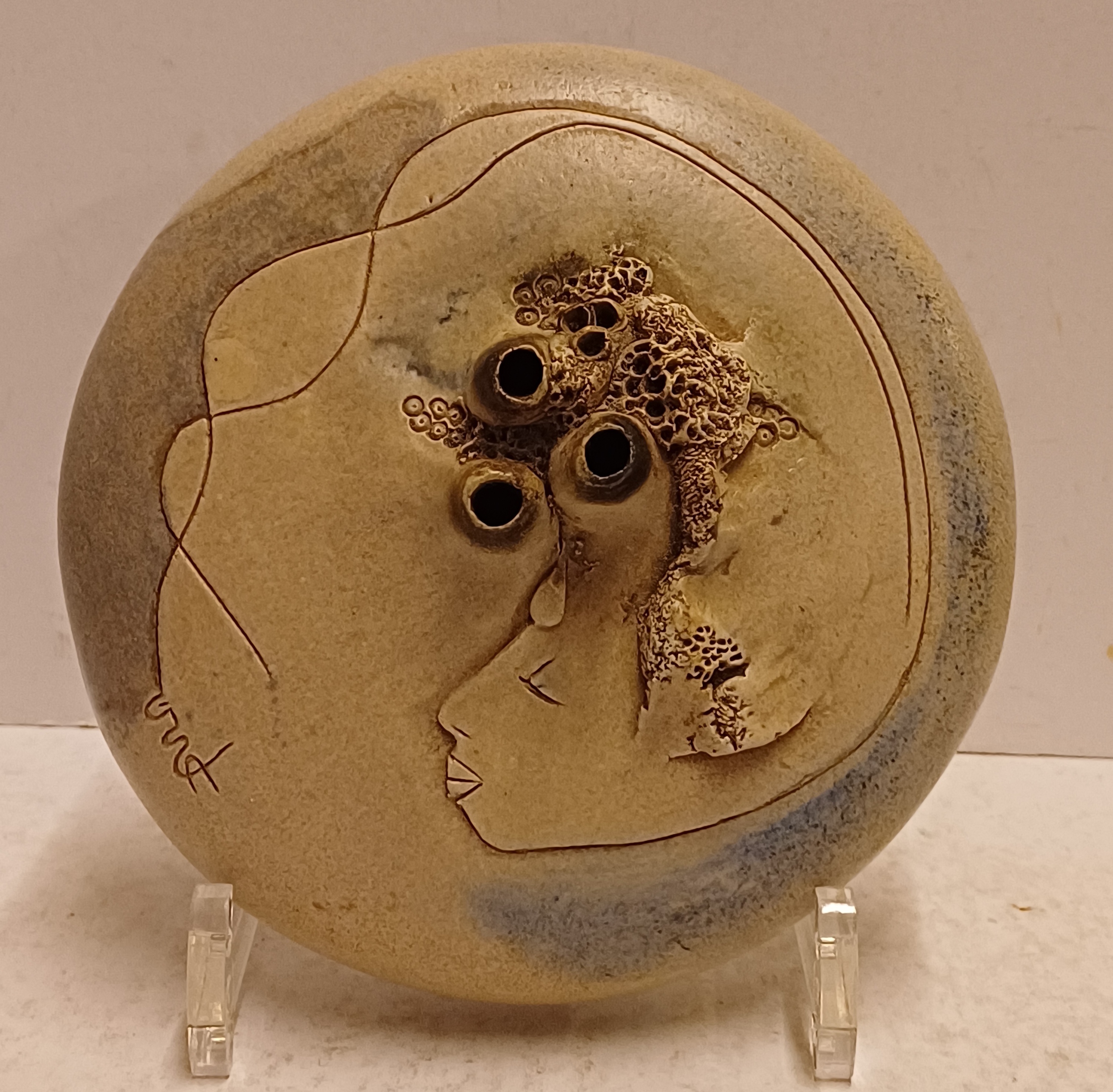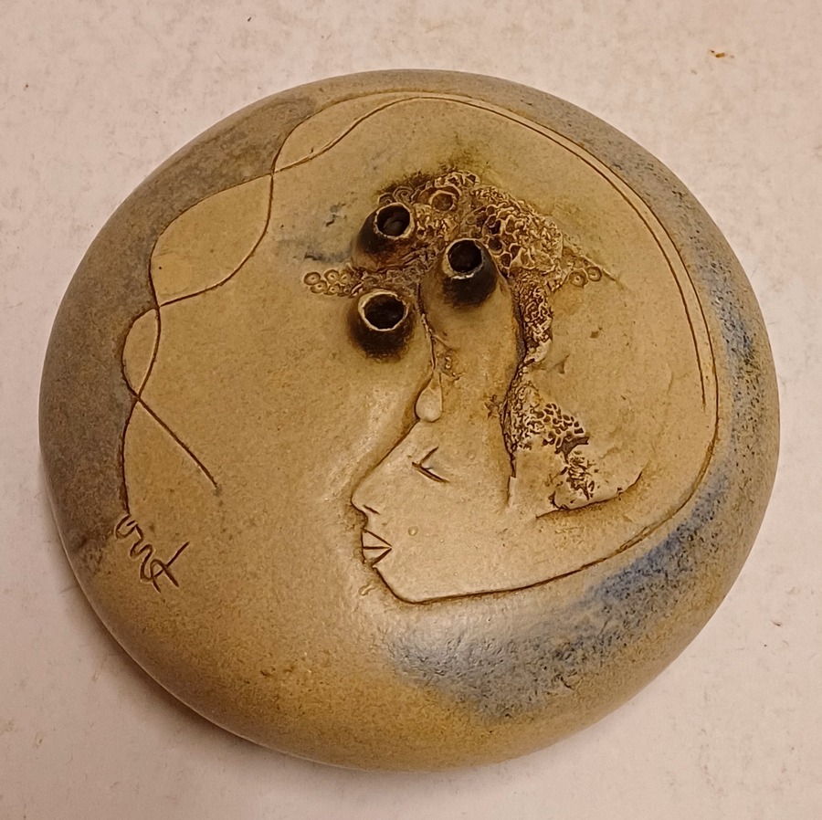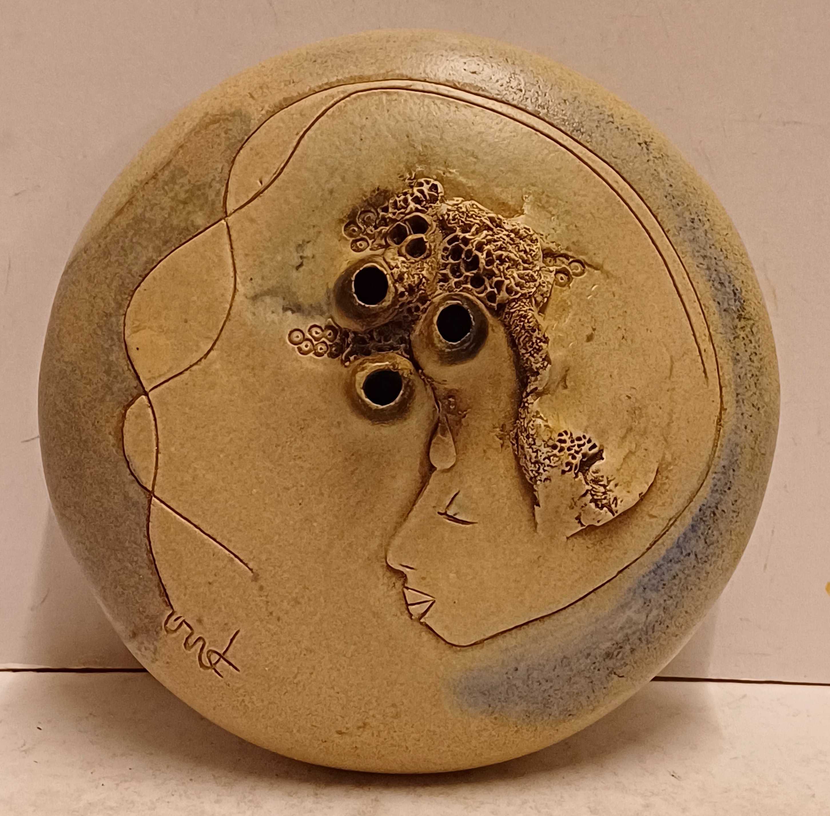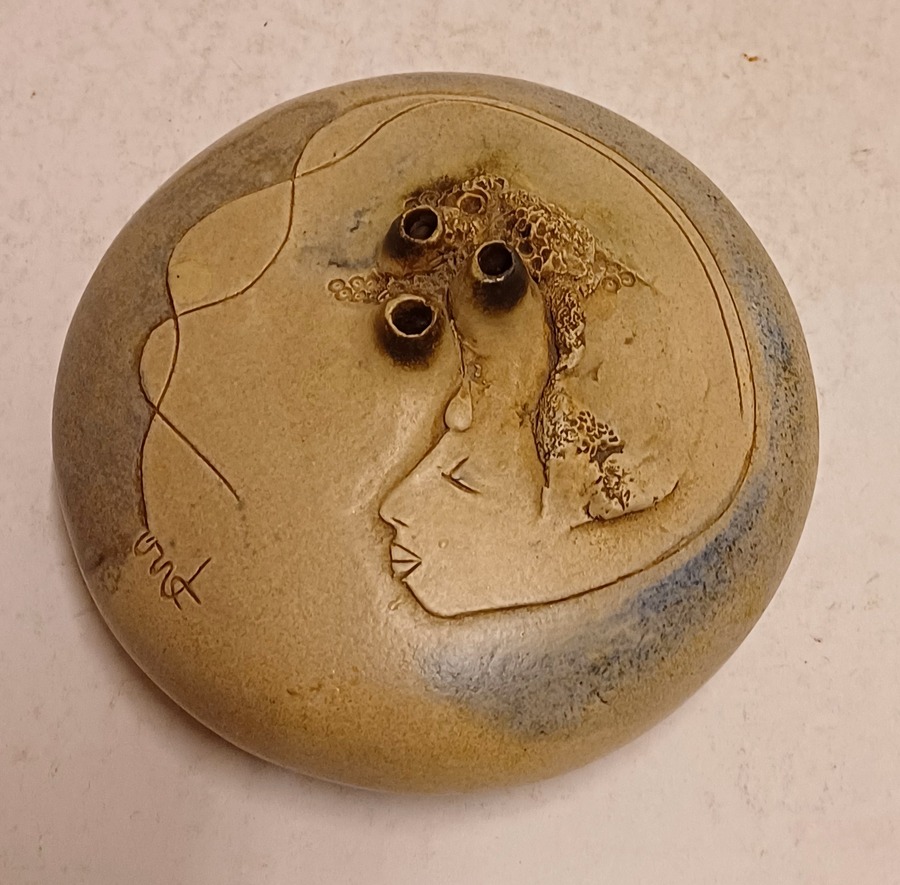 Platte vaas met 3 kleine openingen en decoratie van een vrouwen gezicht. Aan de bovenzijde gesigneerd