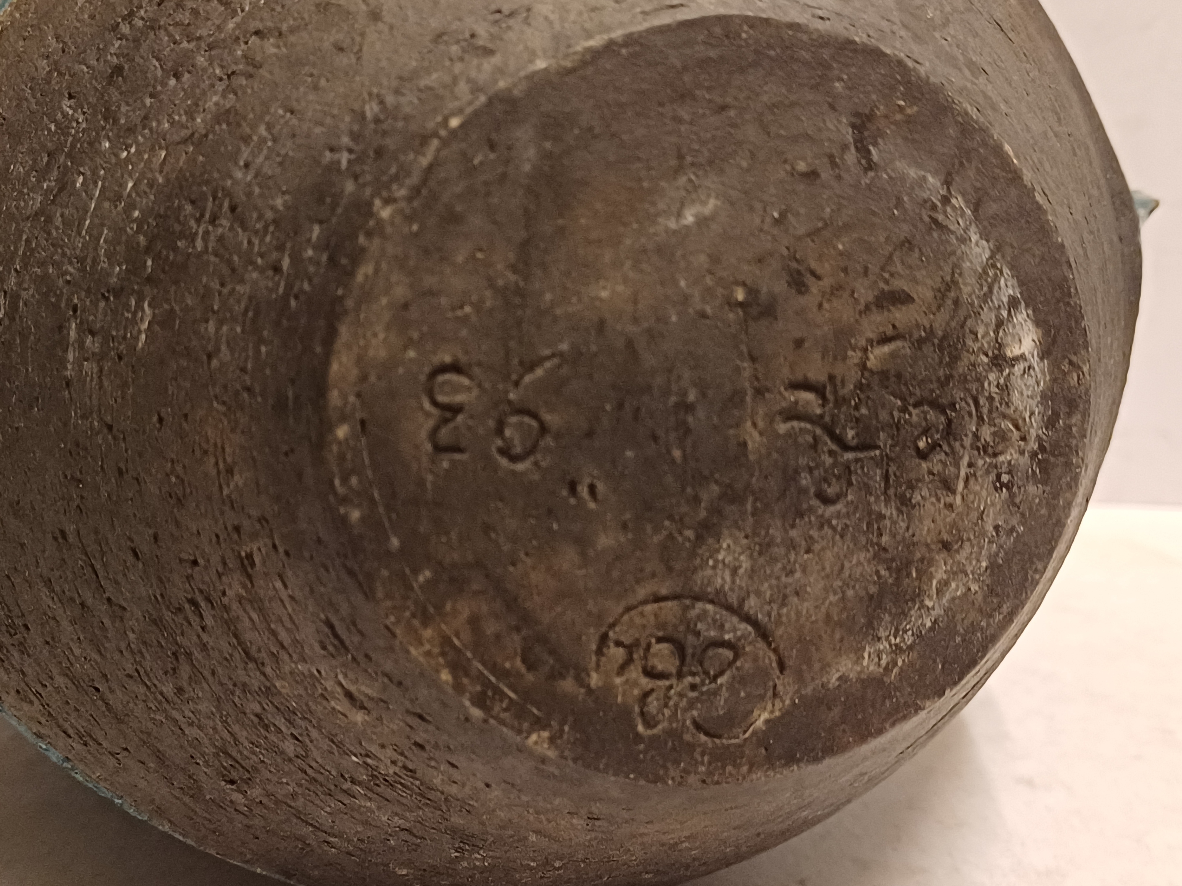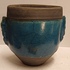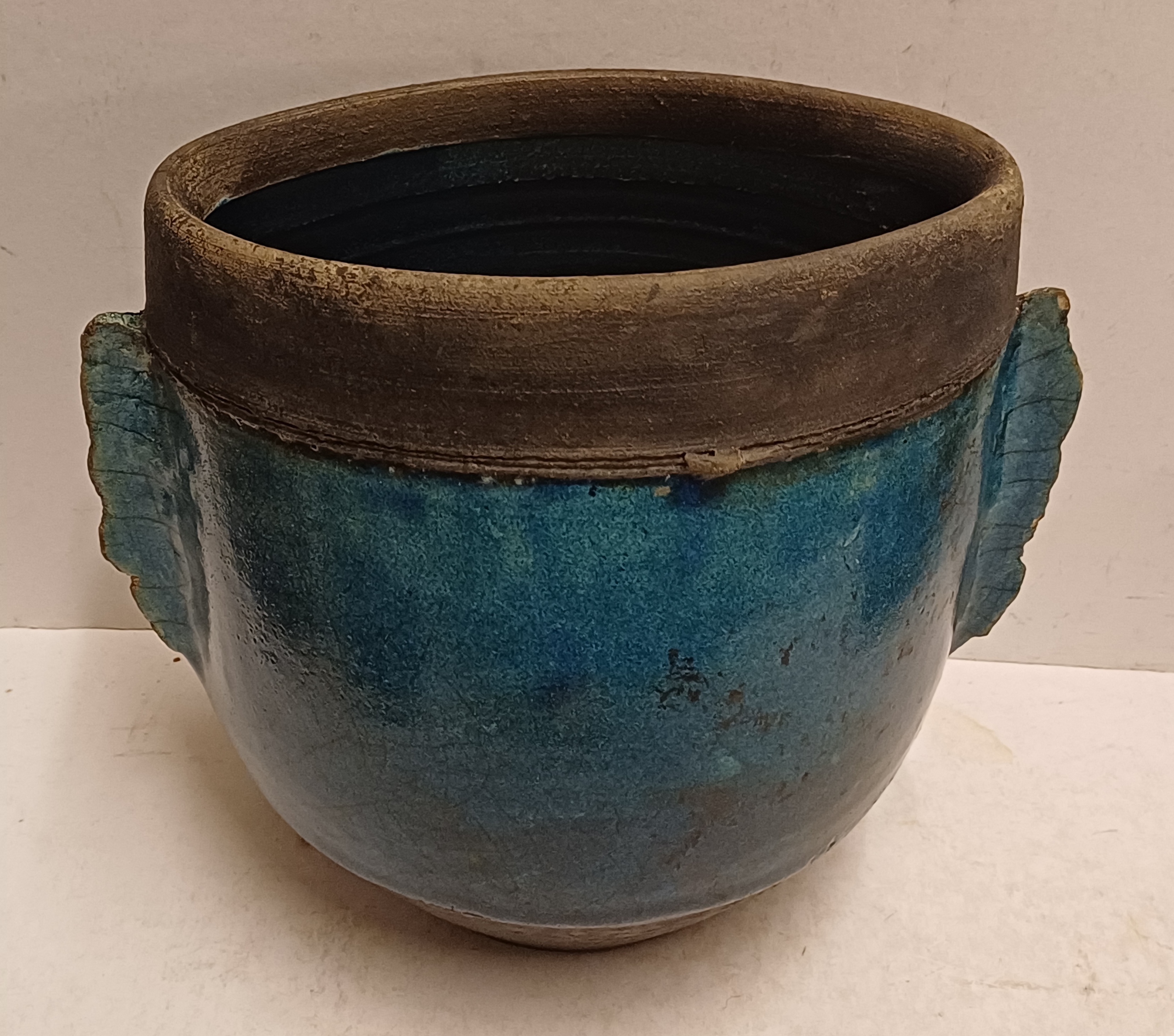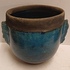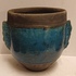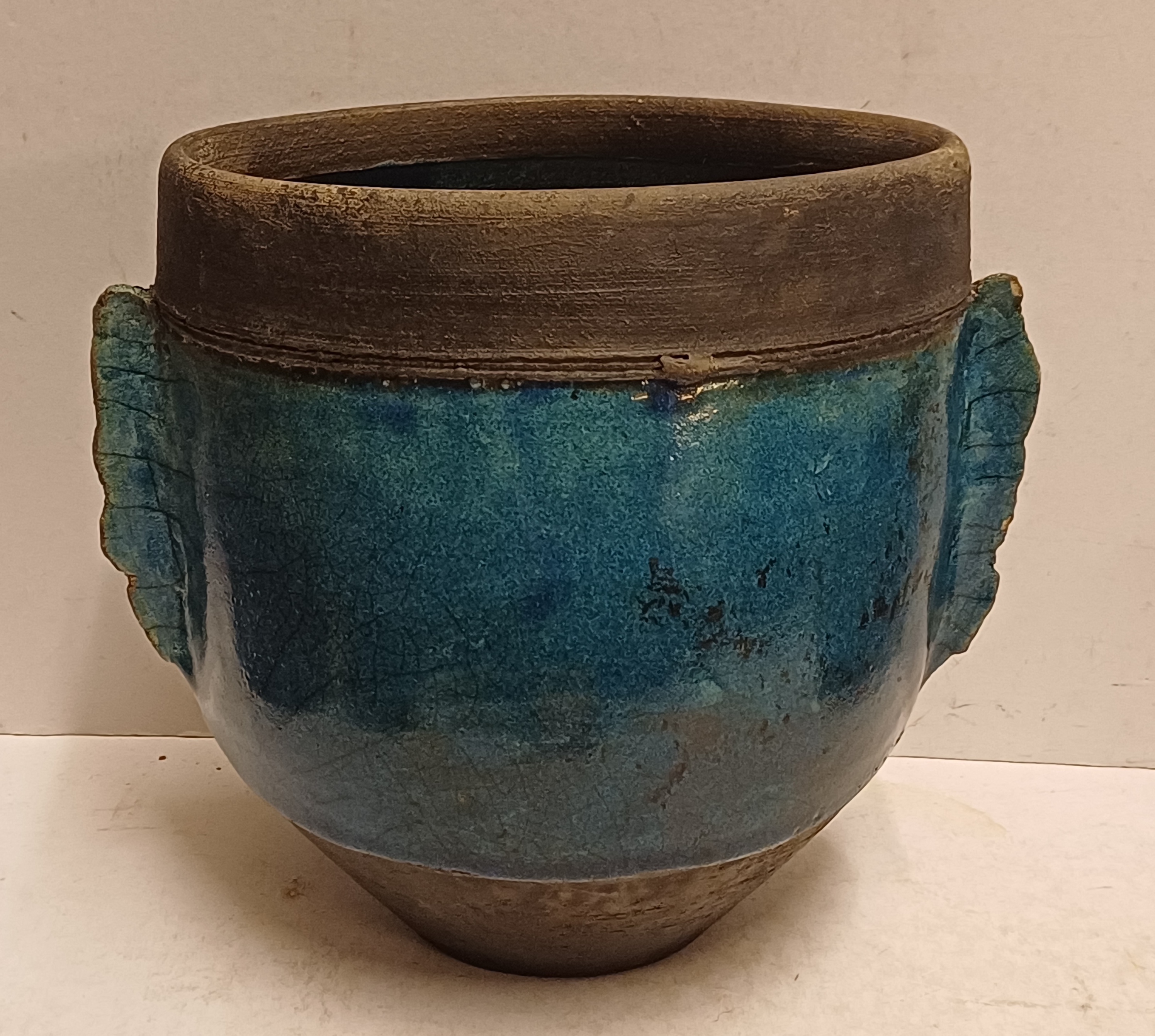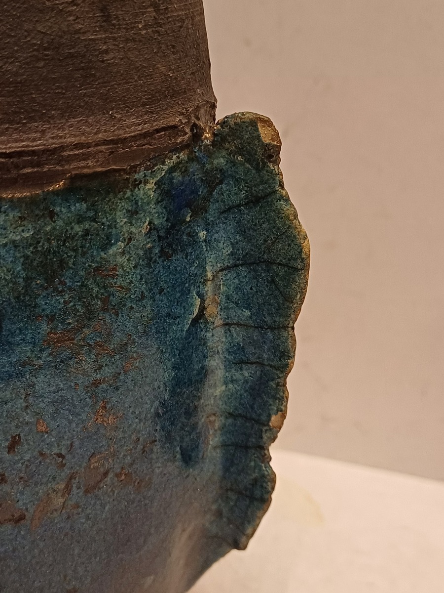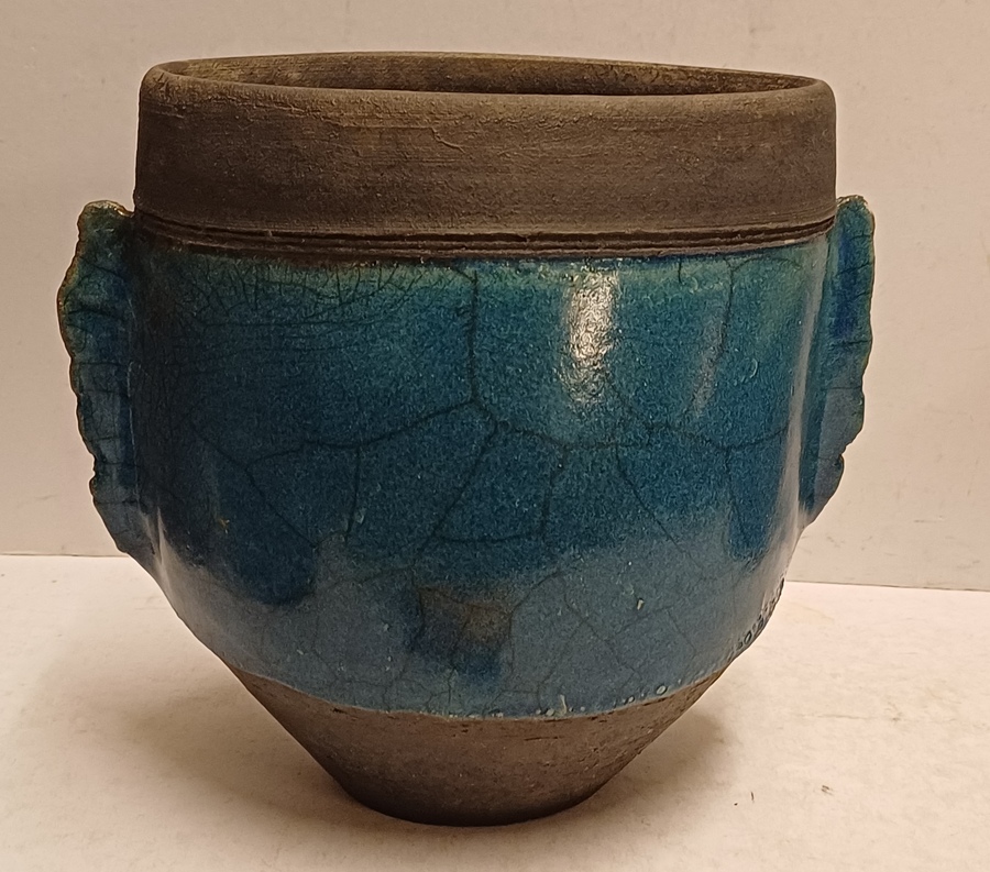 Raku gestookte vaas met 2 kleine vleugels, het midden met perzisch blauwe glazuur. Onderzijde gesigneerd