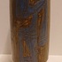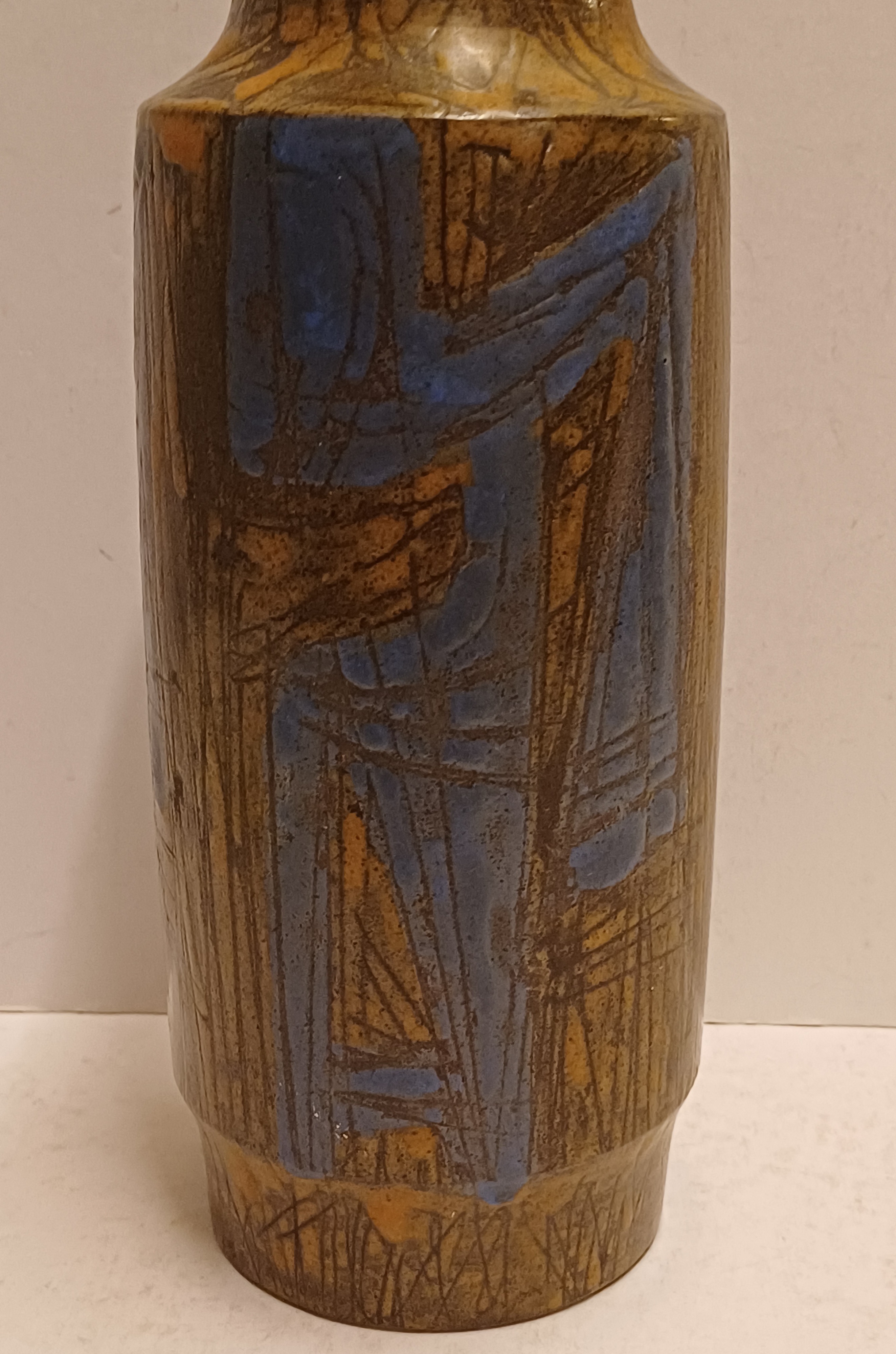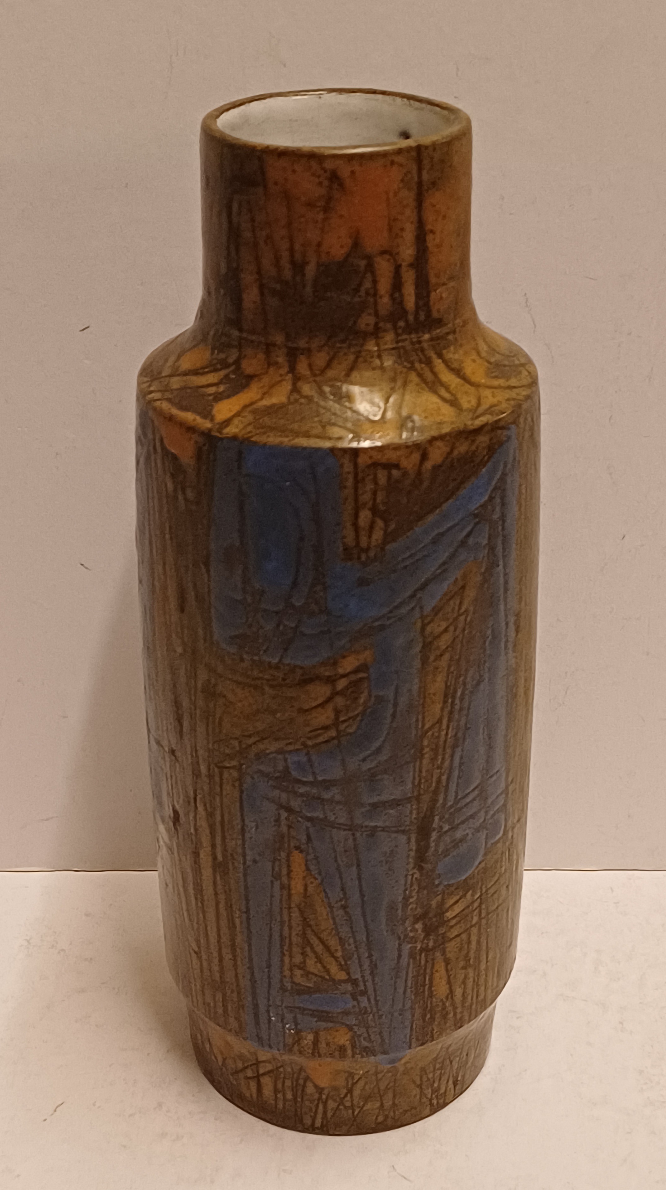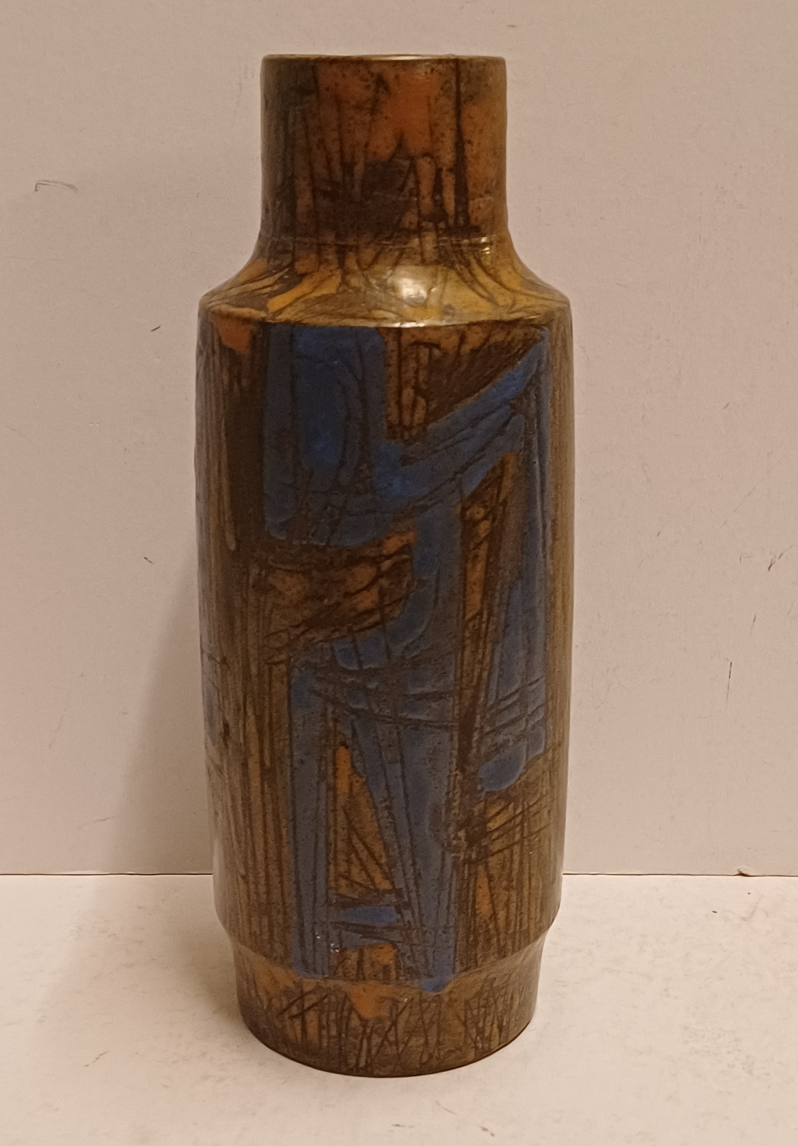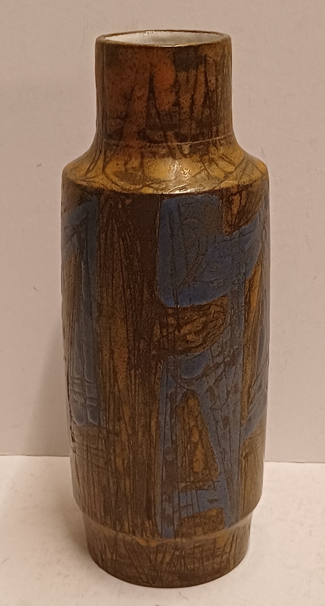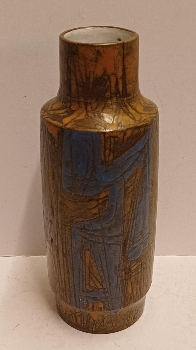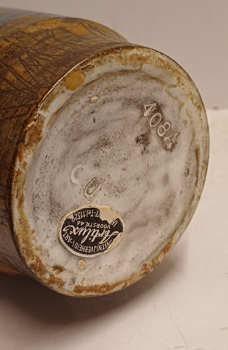 Cast vase with blue decoration on a brown background. Bottom with factory mark and model number.