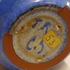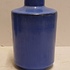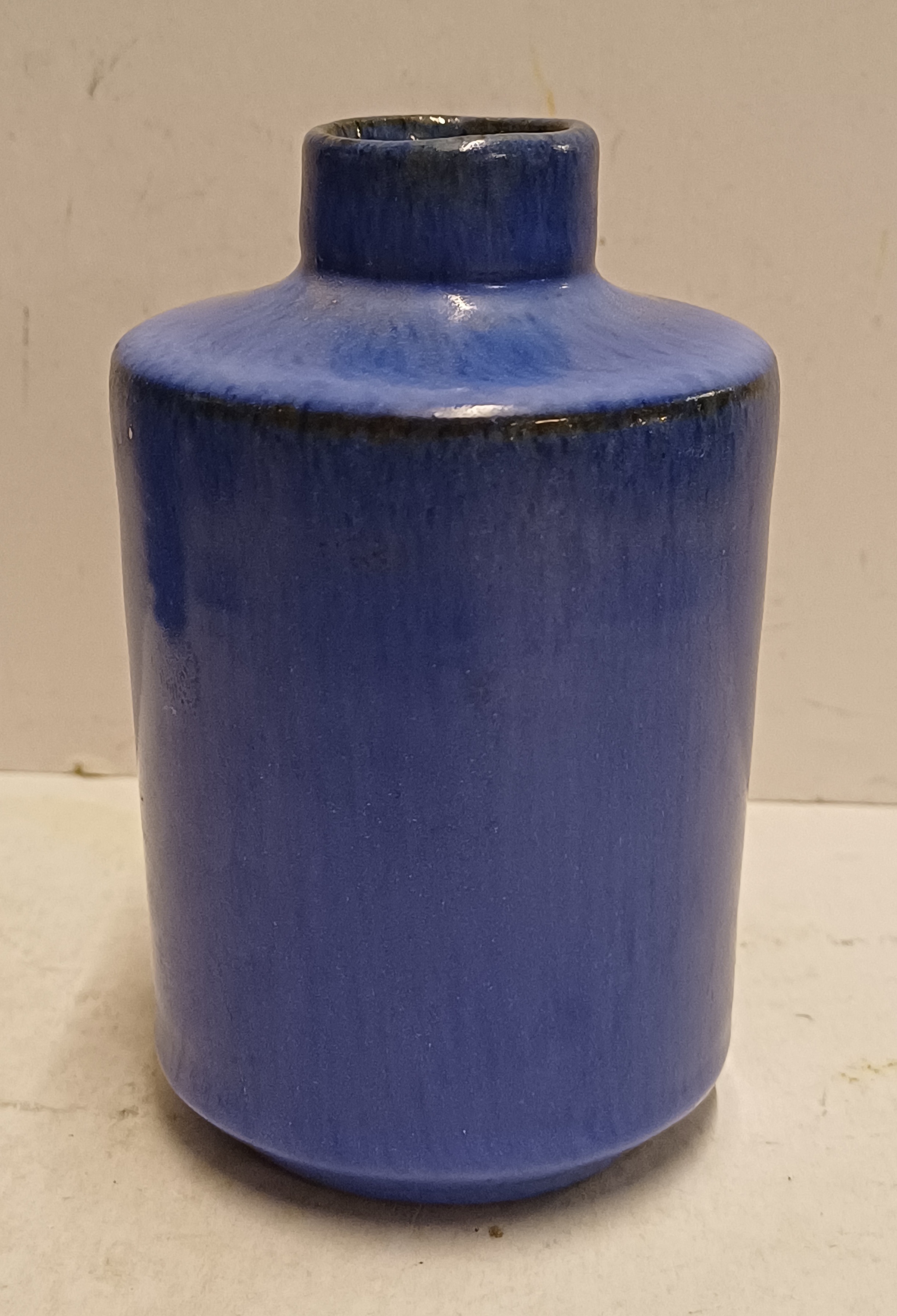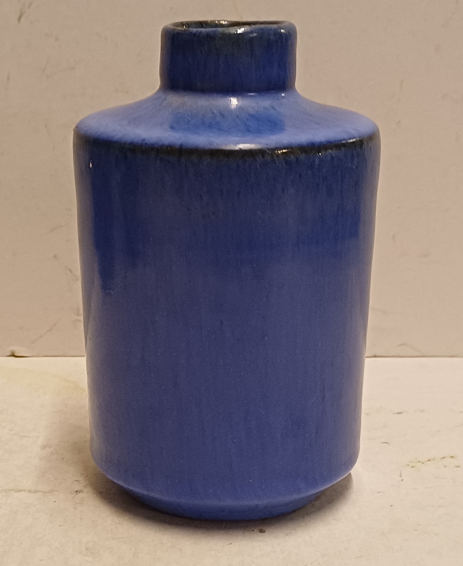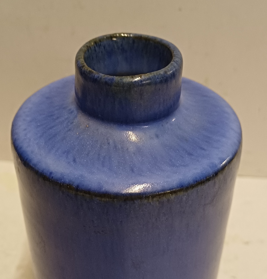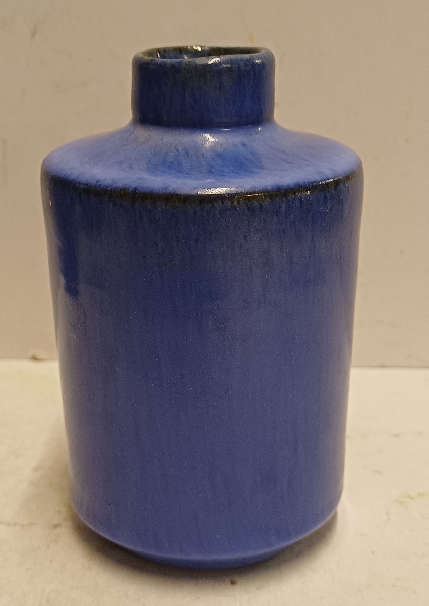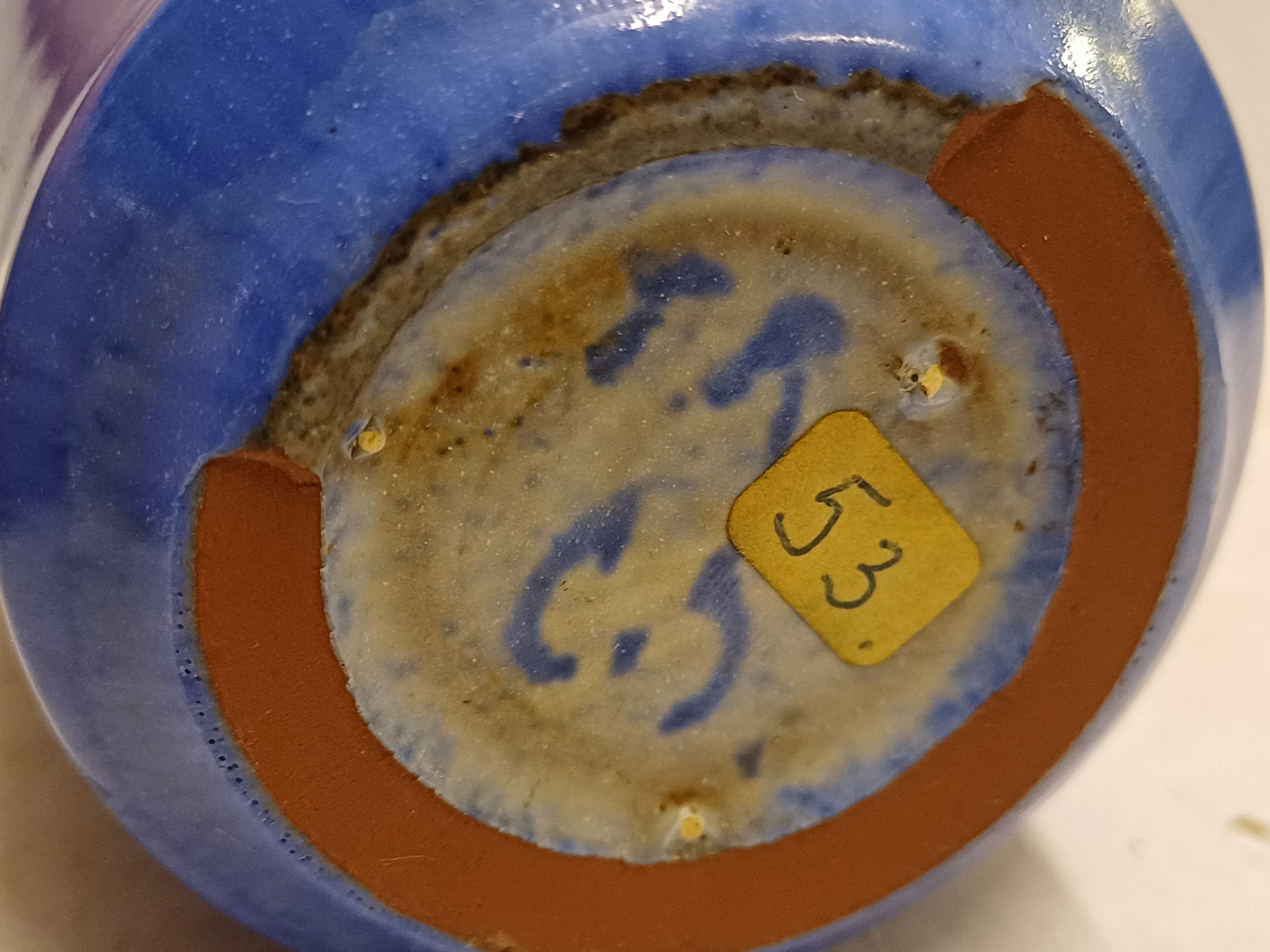 Aardewerken gedraaid vaasje met fijne blauwe stroomglazuur. Onderzijde gesigneerd.