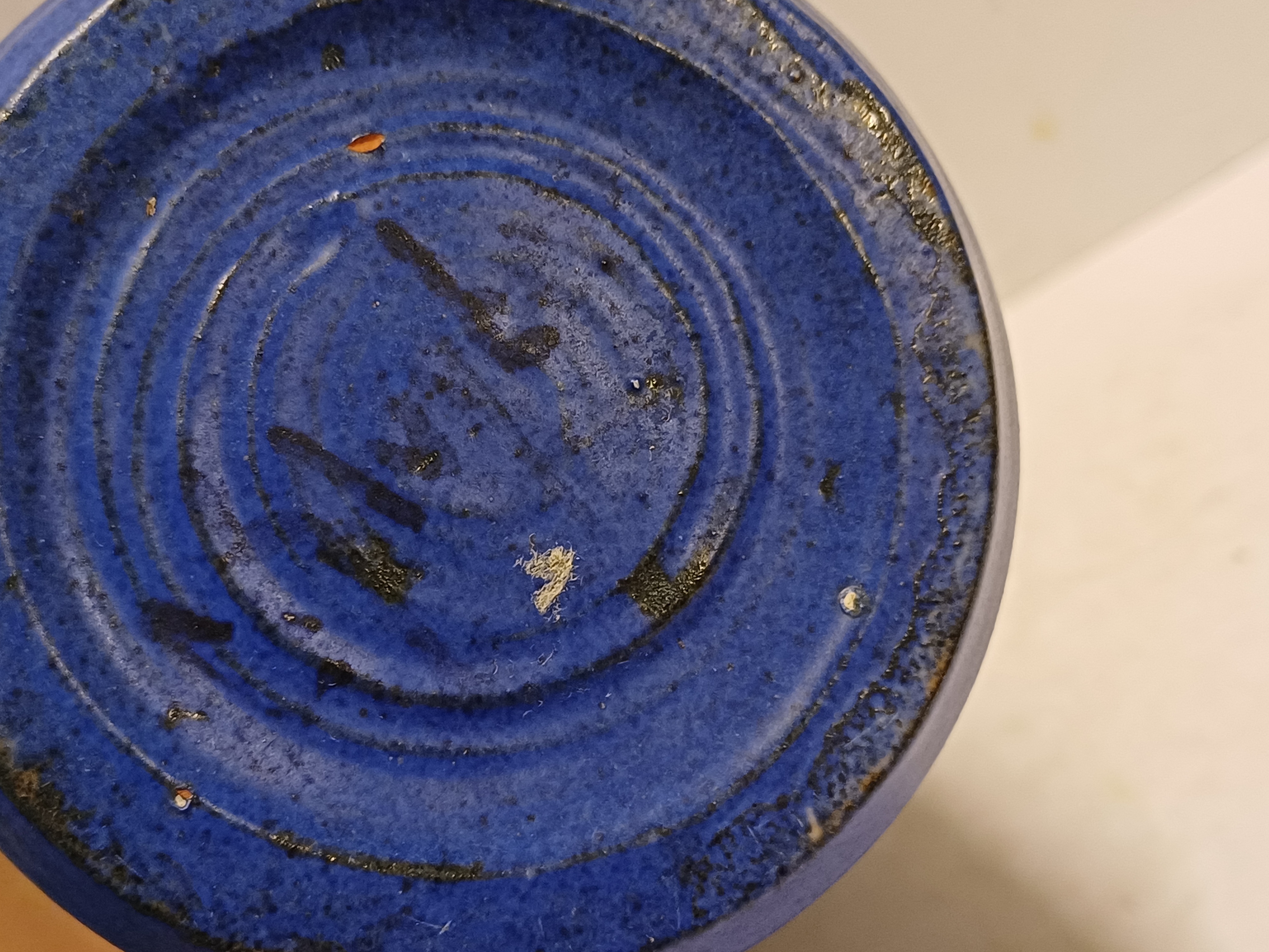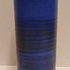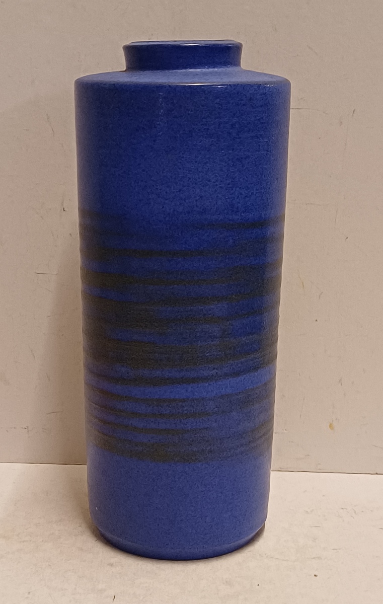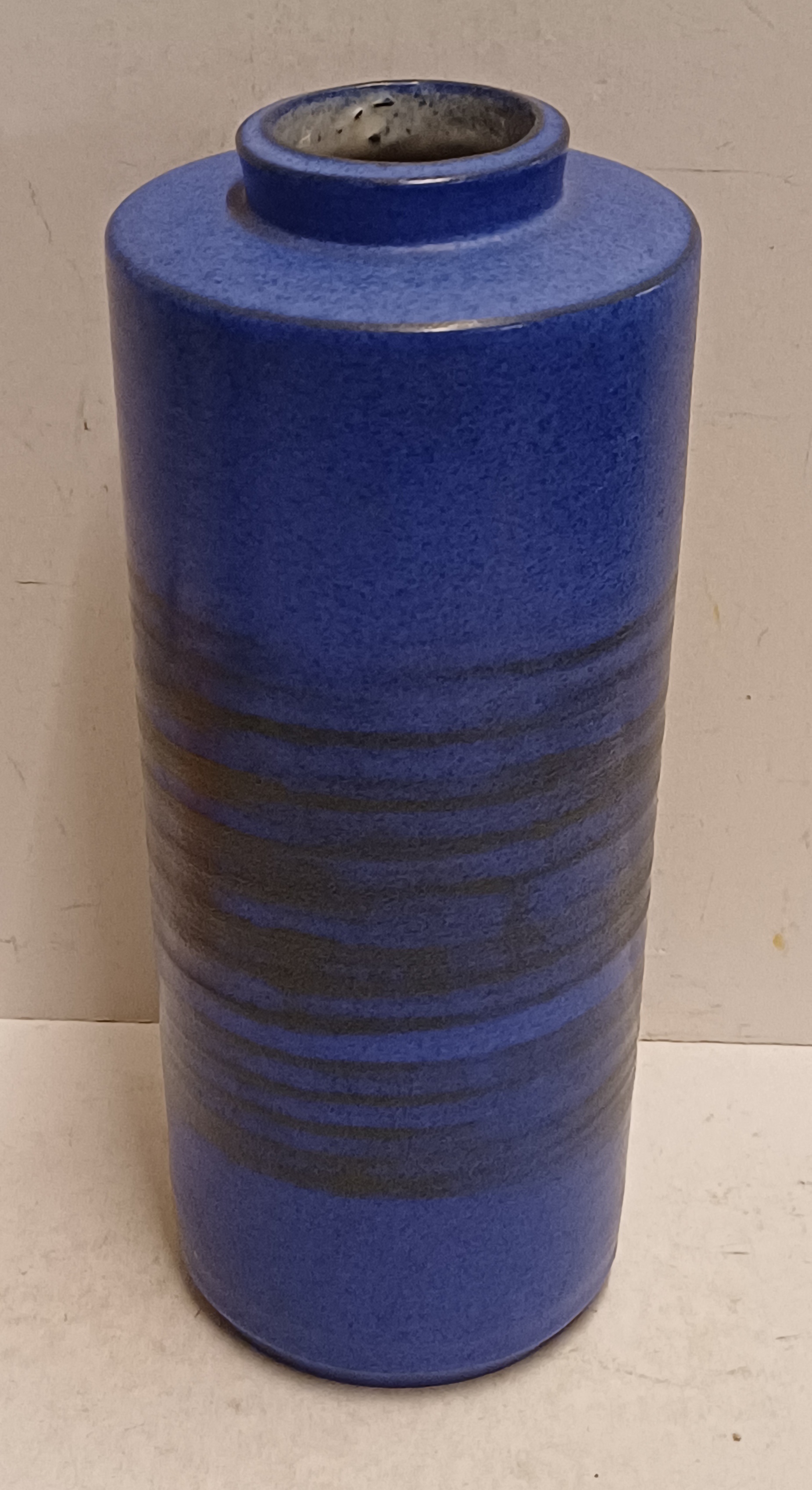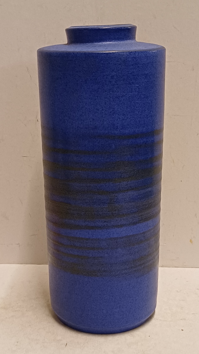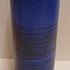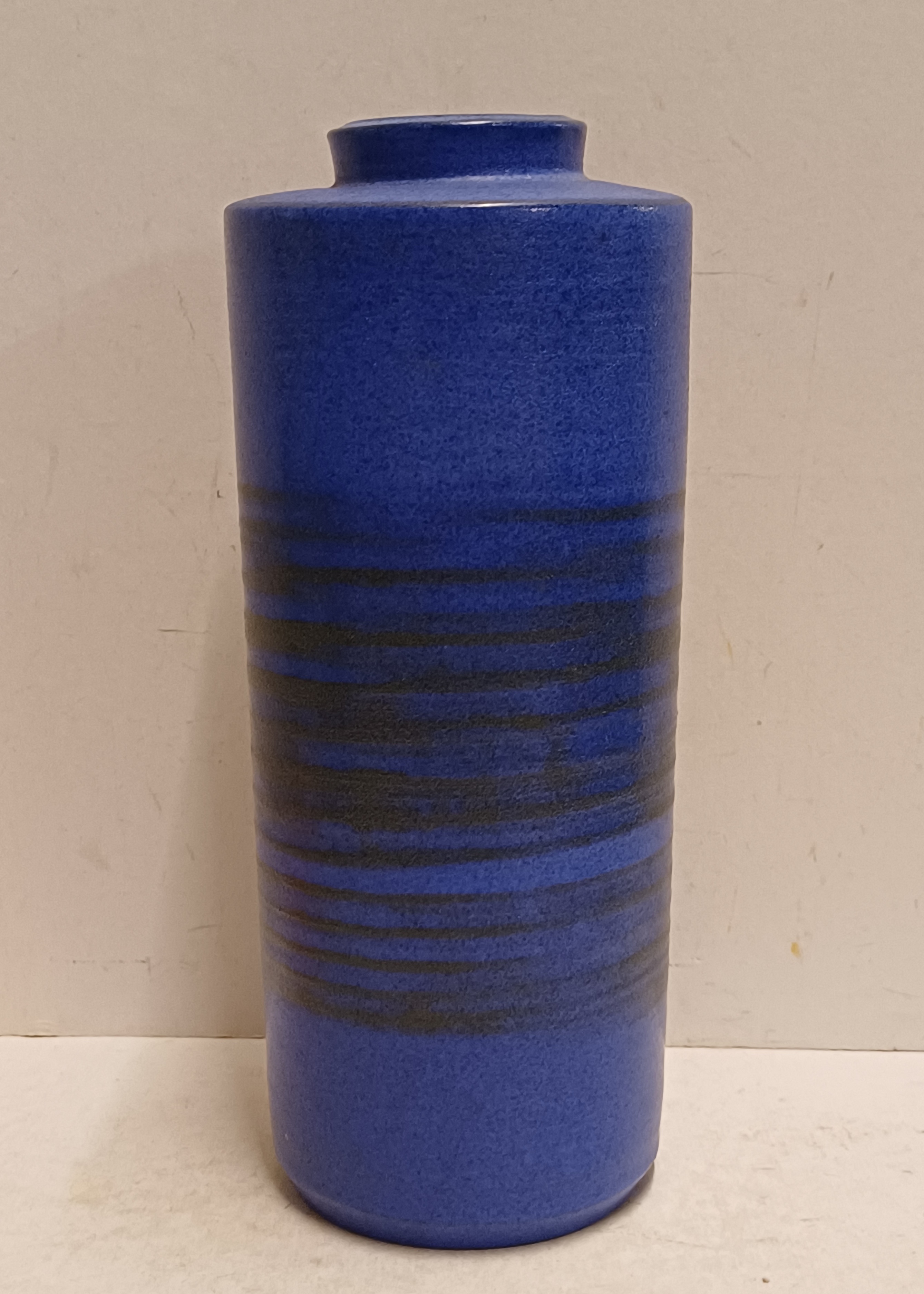 Aardewerken cilindrische vaas met een blauwe glazuur met zwarte banden. Onderzijde voluit gesigneerd