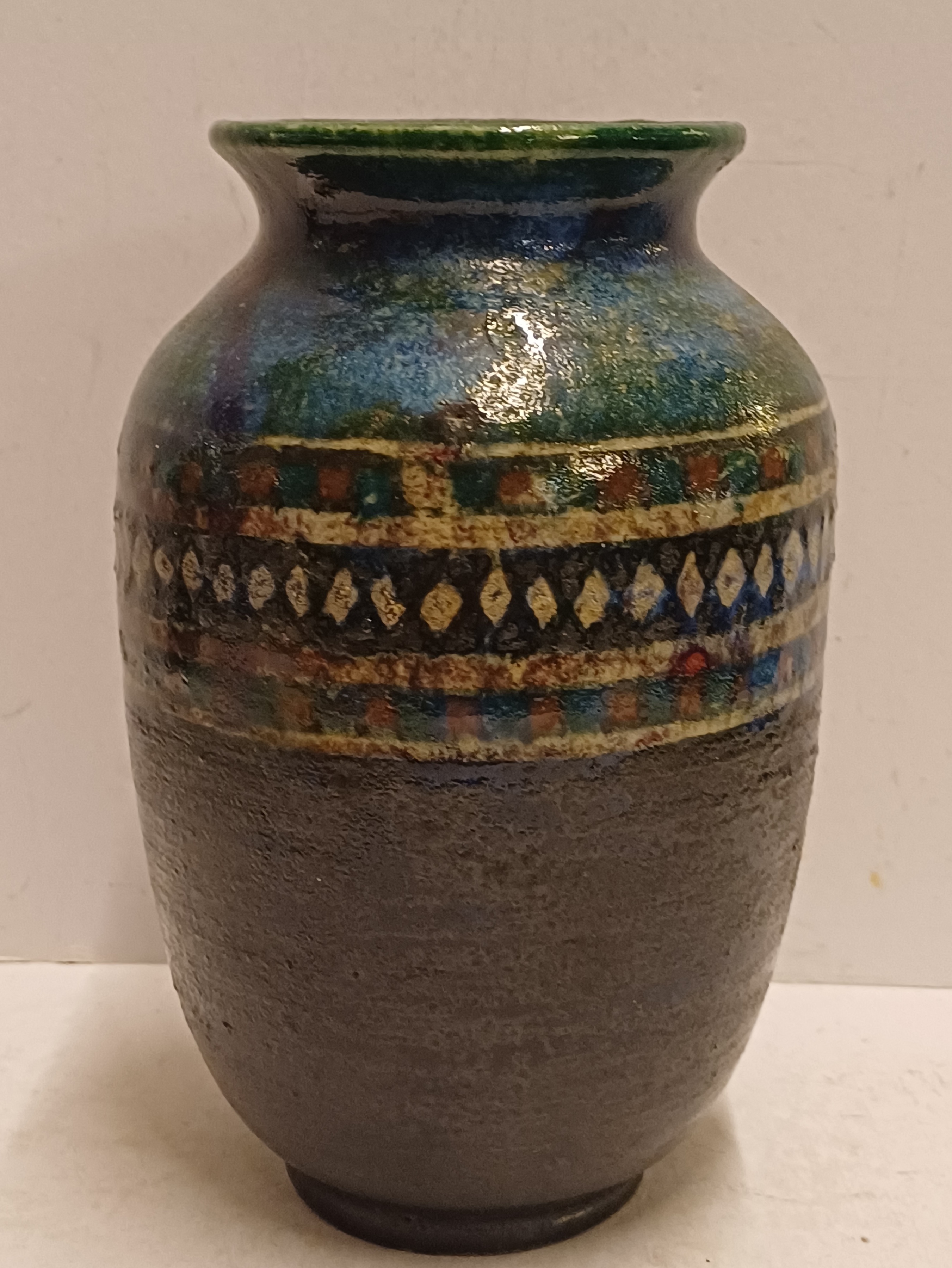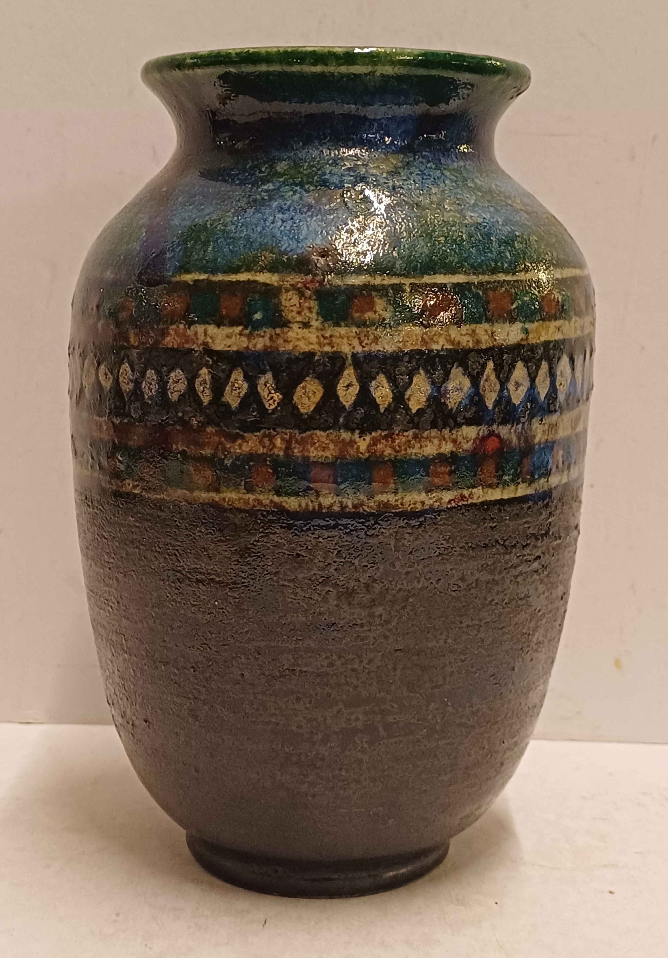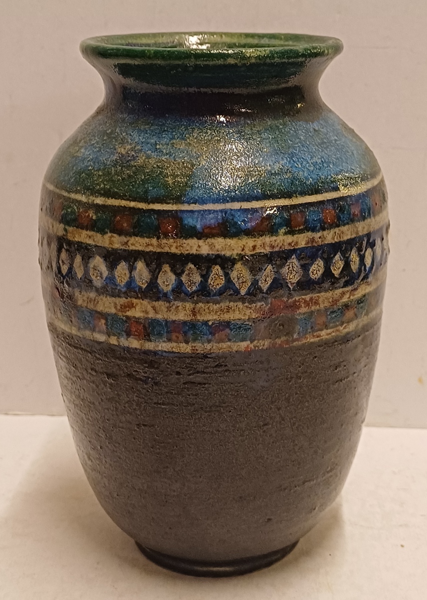 Handgedraaide vaas met meerkleurige glazuur en band met lijnen en ruitjes decor. Onderzijde met monogram.