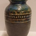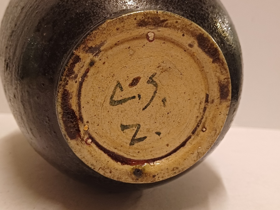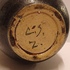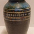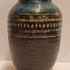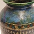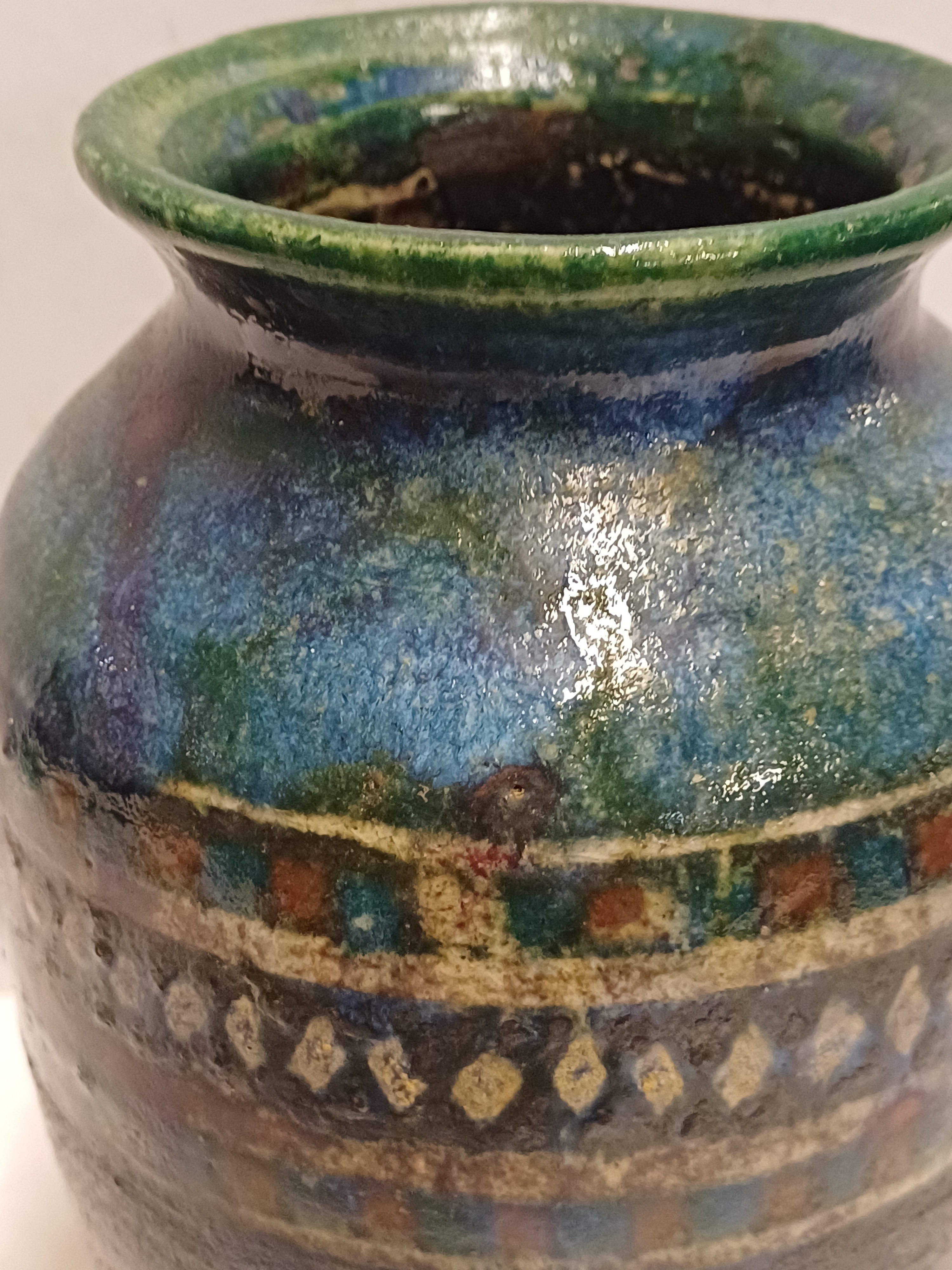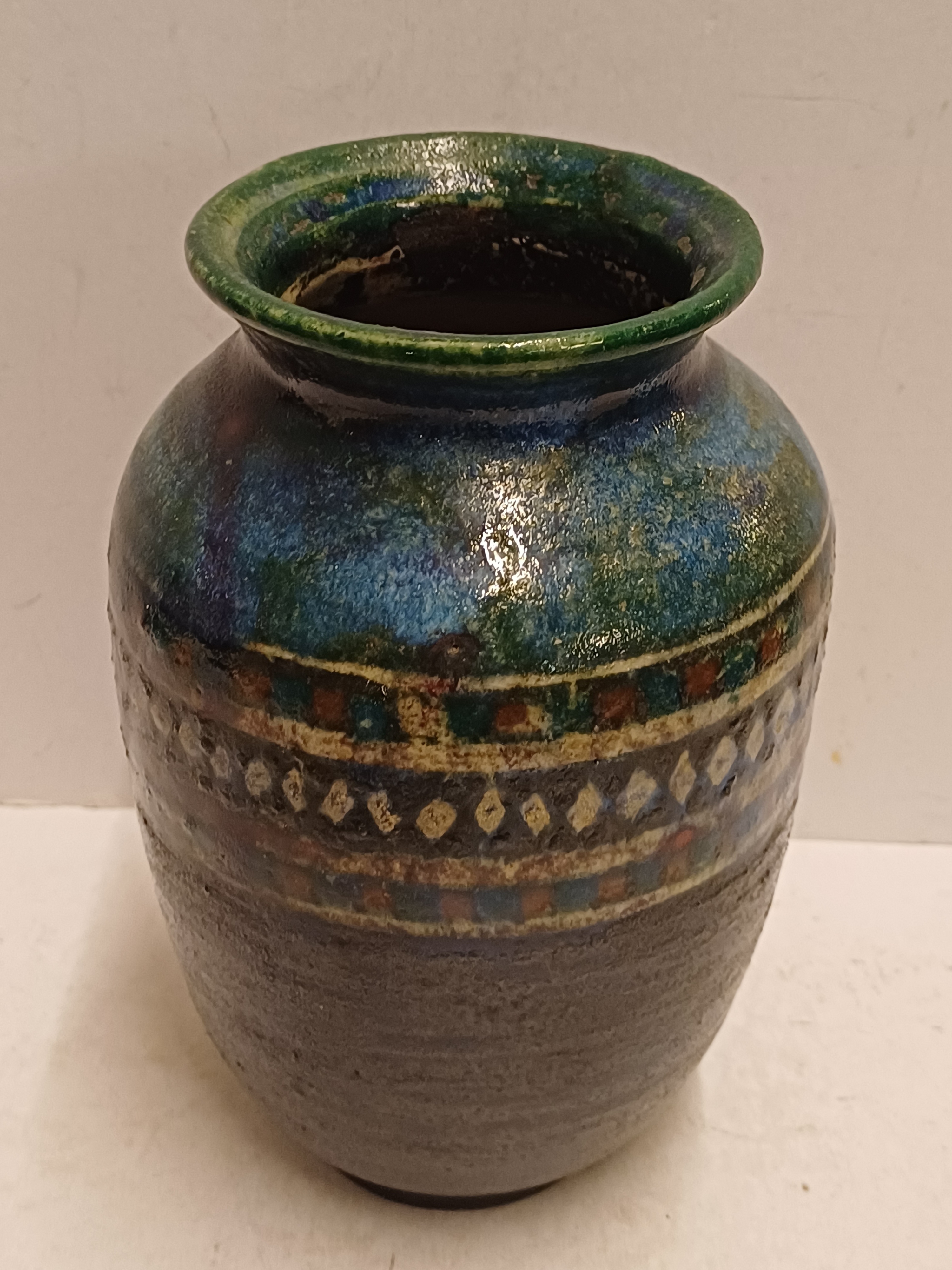 Handgedraaide vaas met meerkleurige glazuur en band met lijnen en ruitjes decor. Onderzijde met monogram.