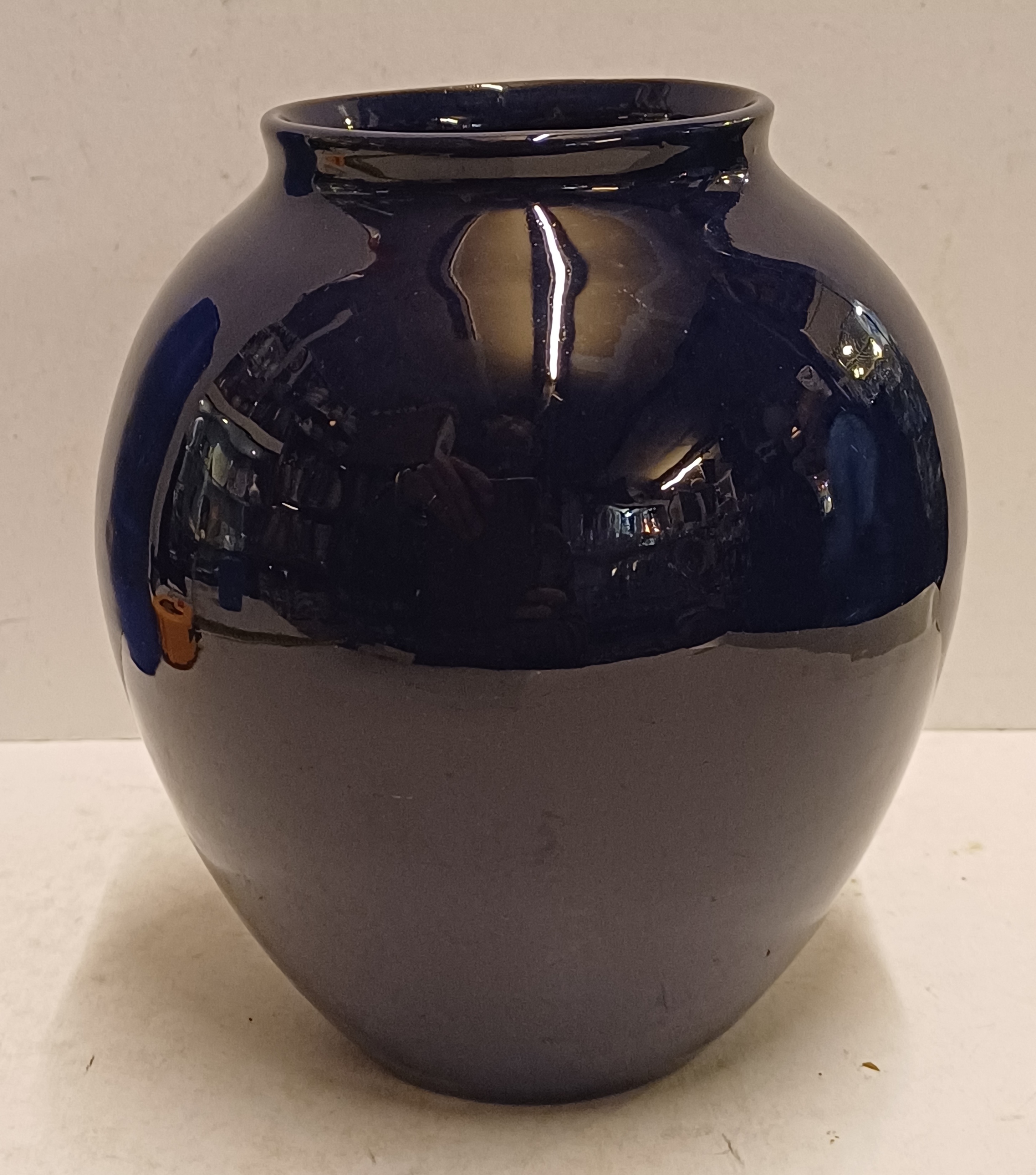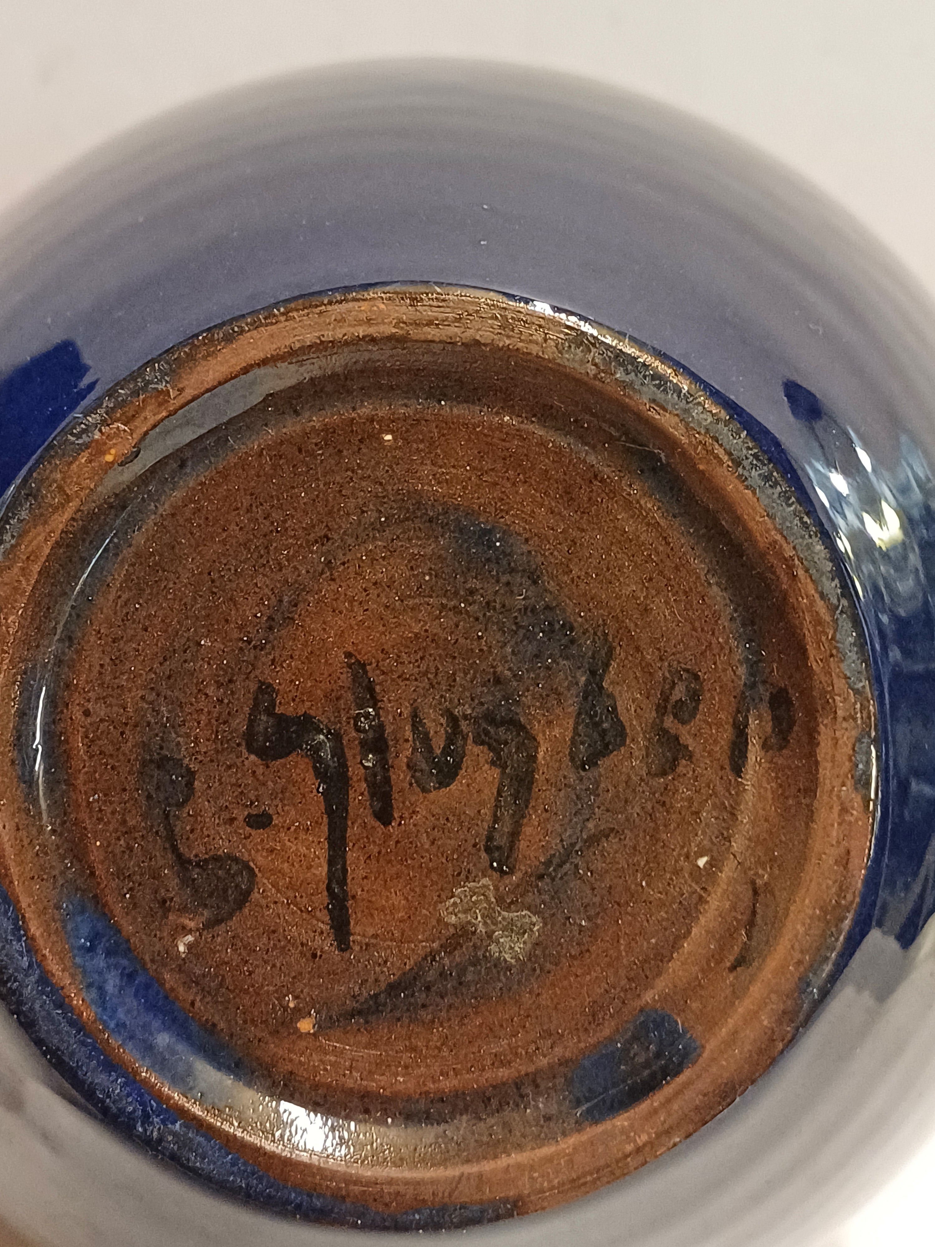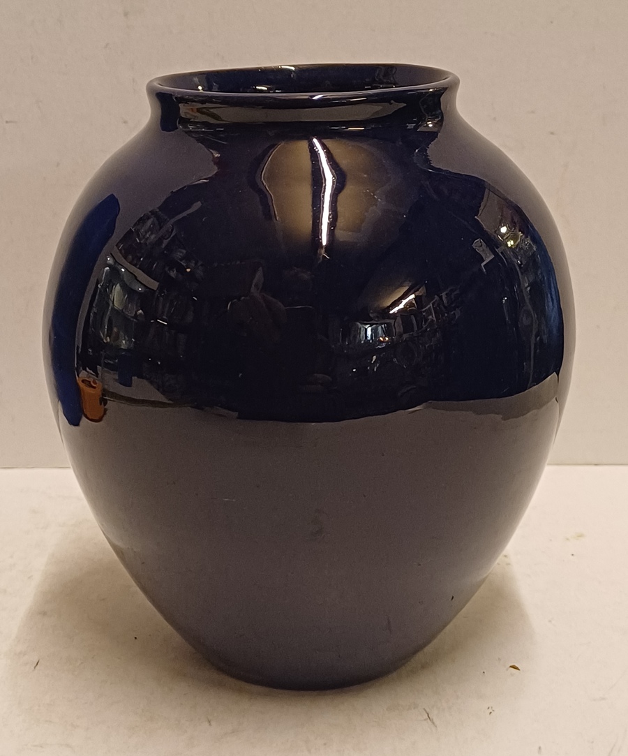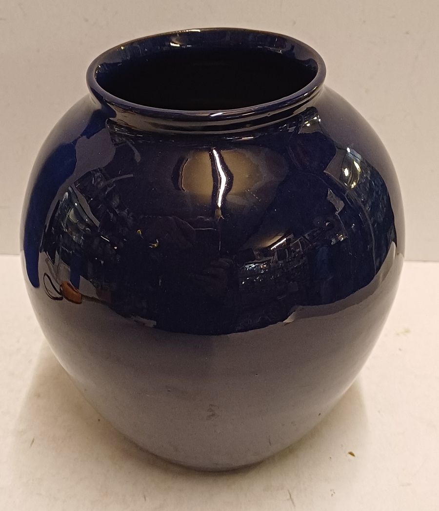 Aardewerken gedraaide vaas met donker blauwe glazuur. Onderzijde voluit gesigneerd.