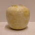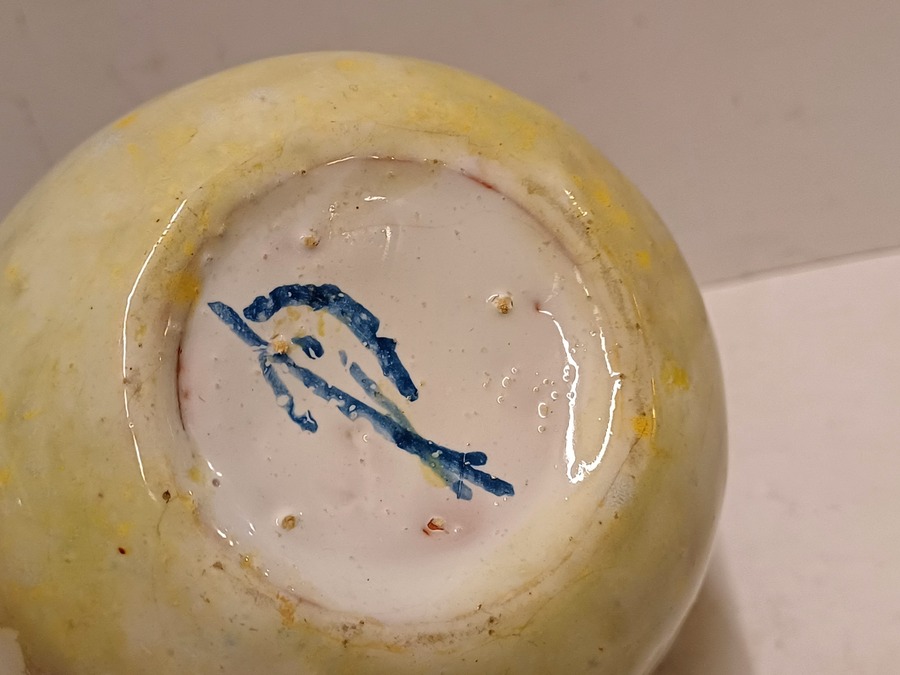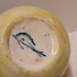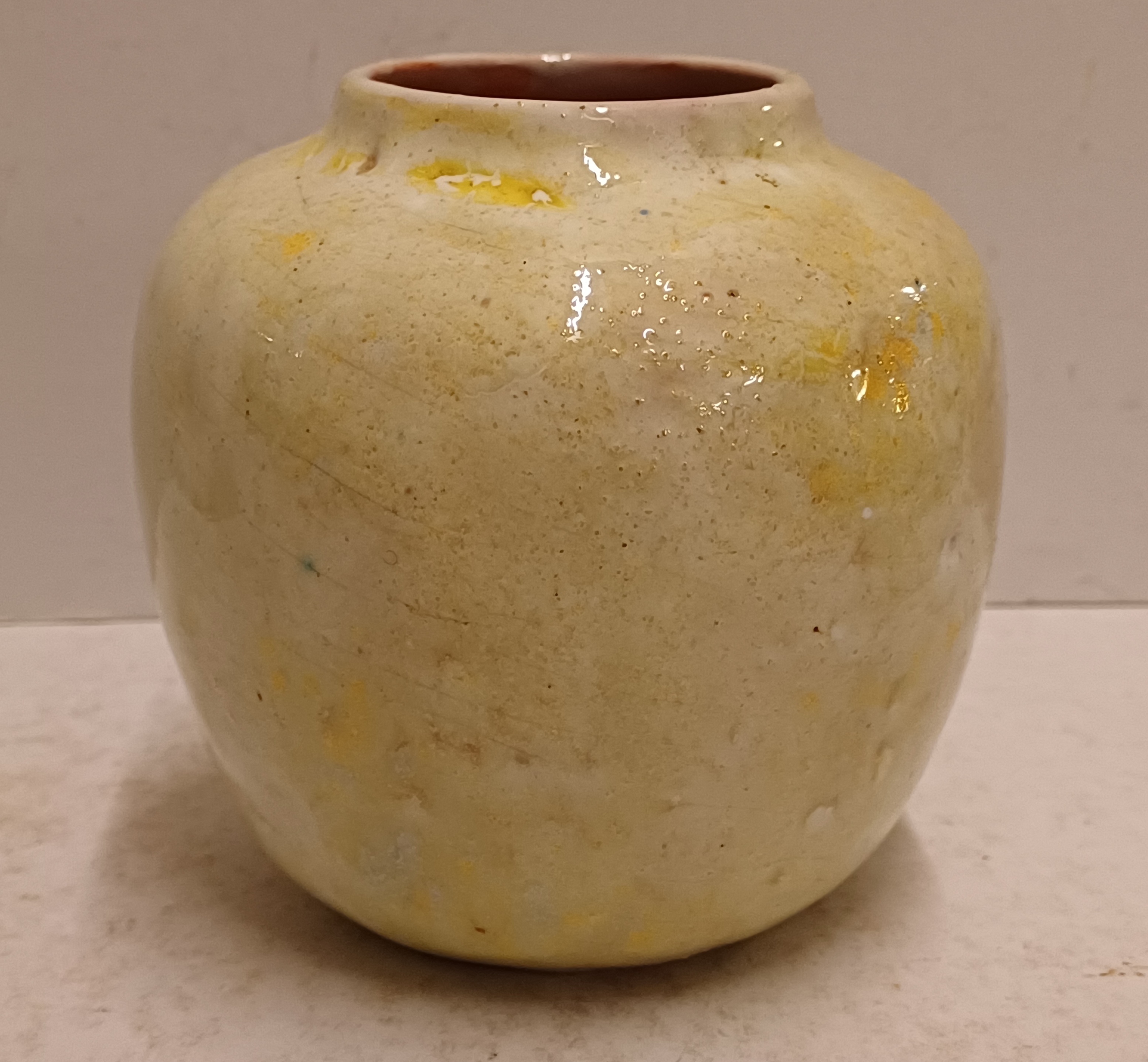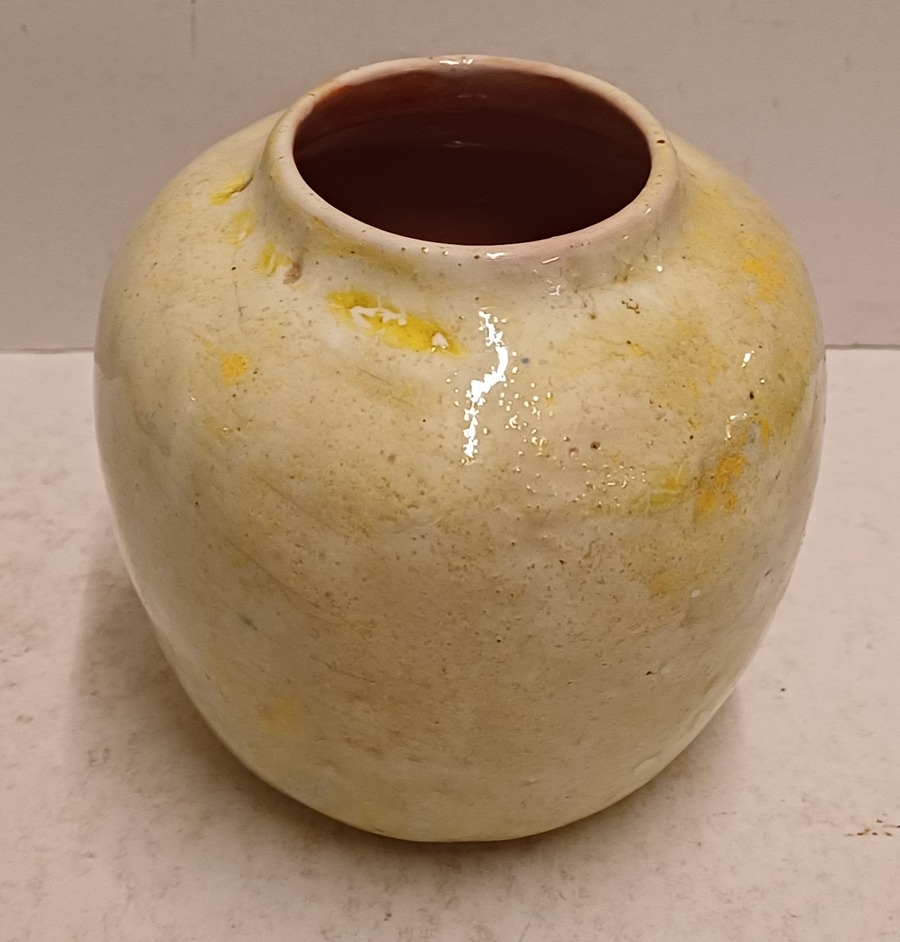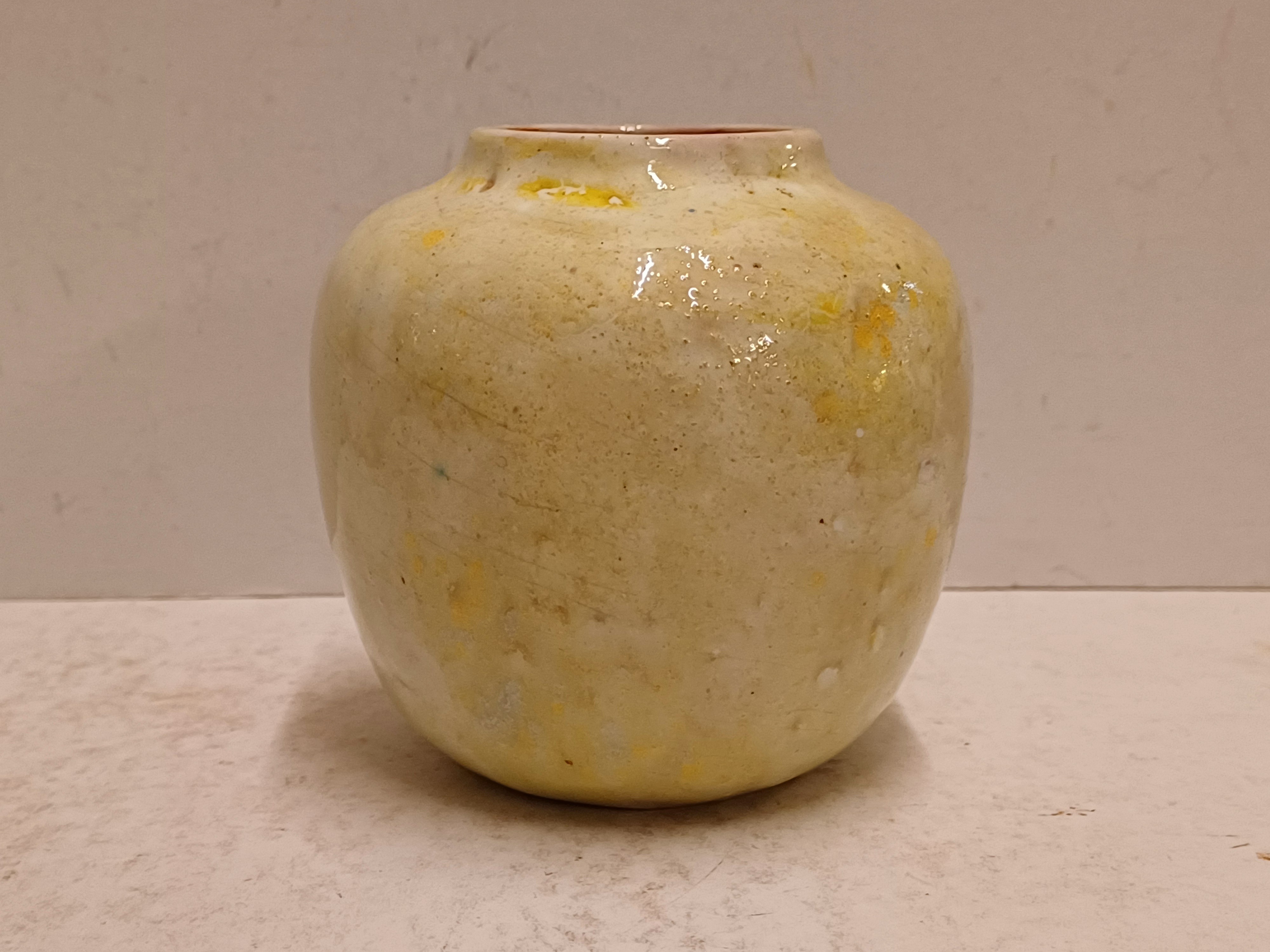 Aardewerken vaas met gemeleerde gele glazuur. Onderzijde gesigneerd