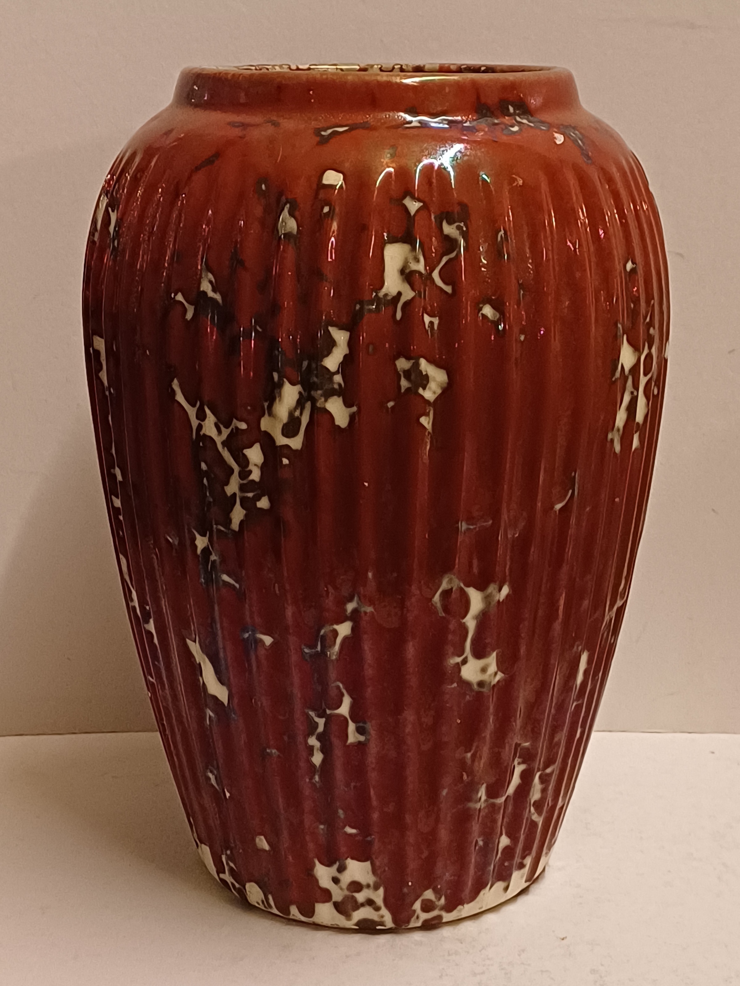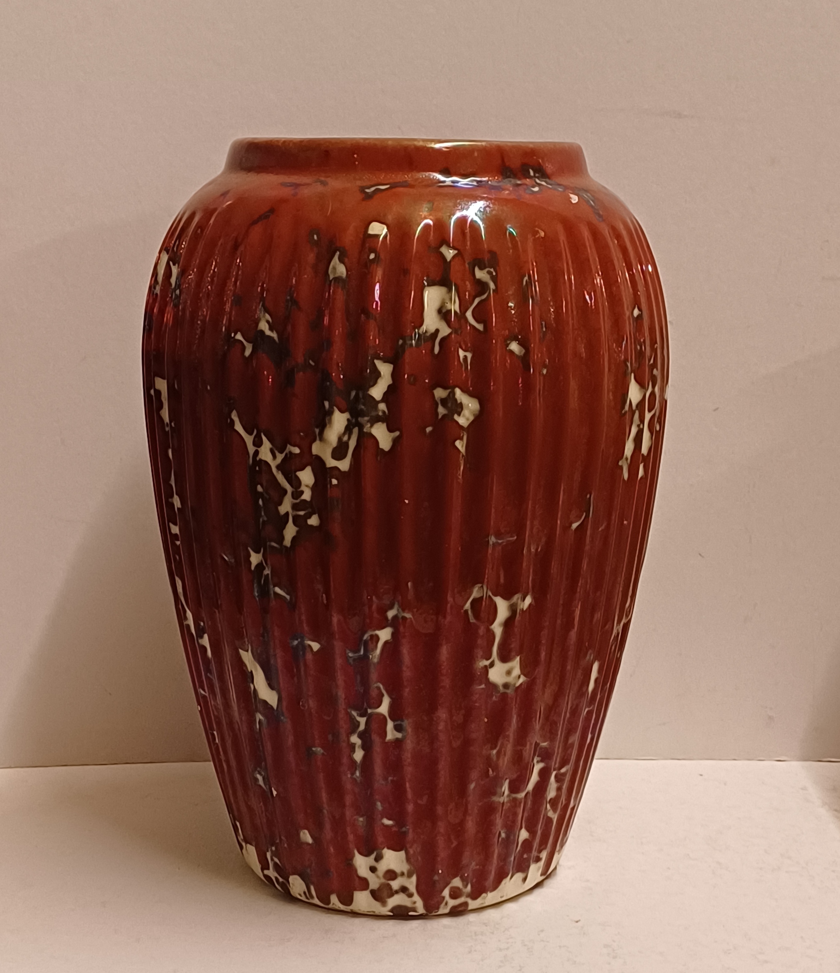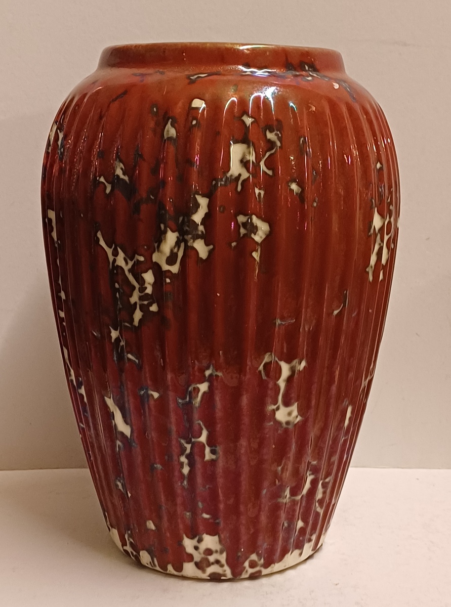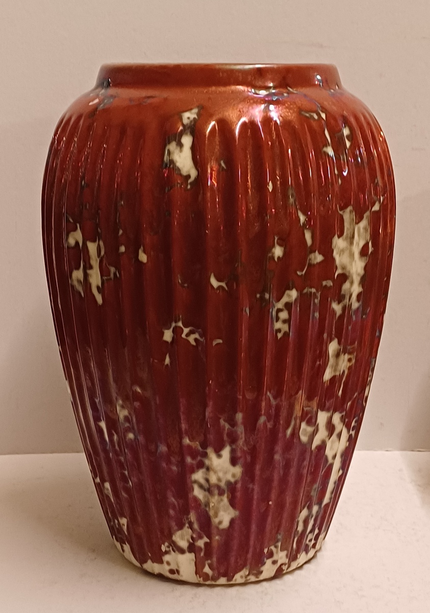 Grote vaas met rode reflet metalique glazuur. Onderzijde met fabrieksmerk.