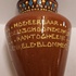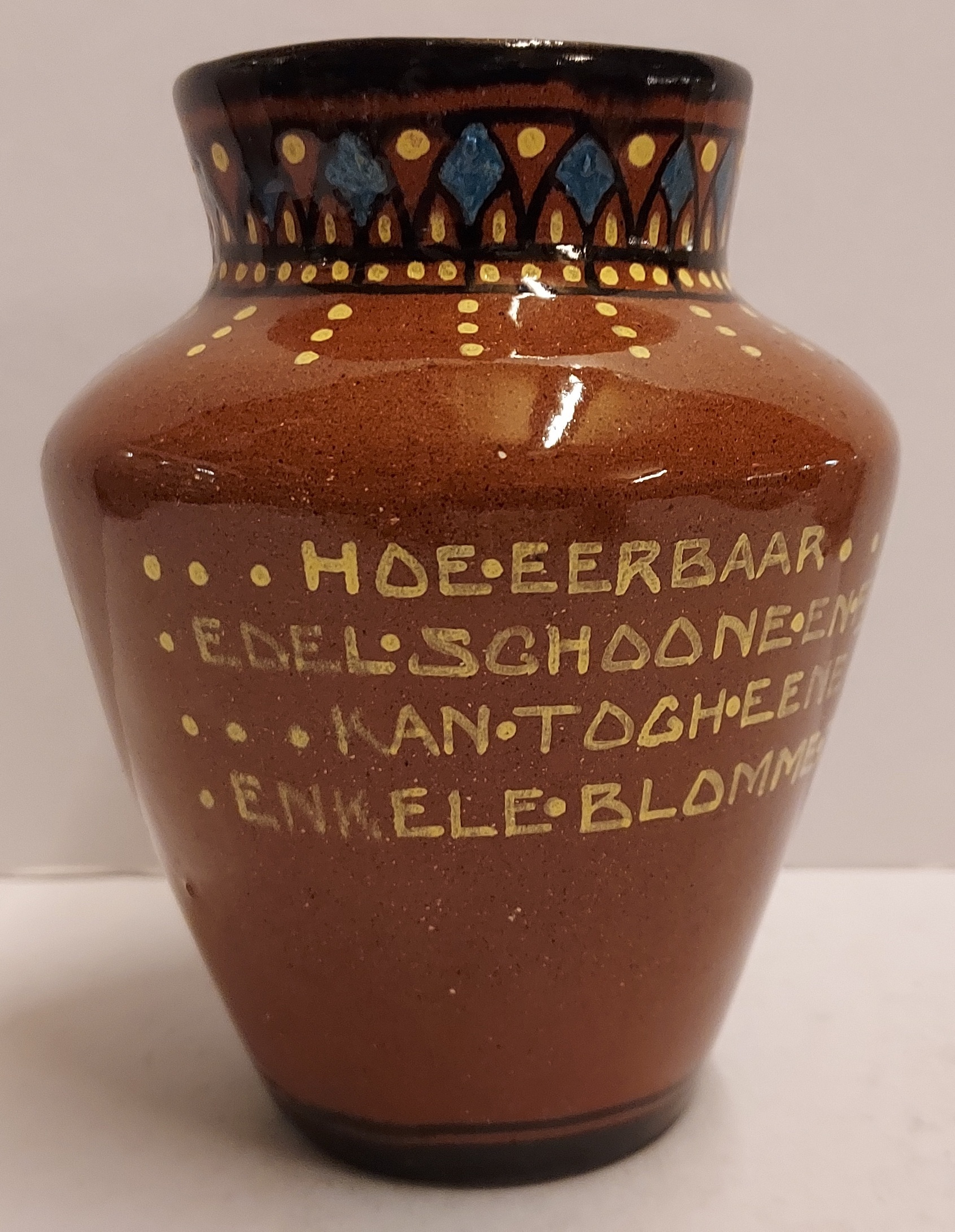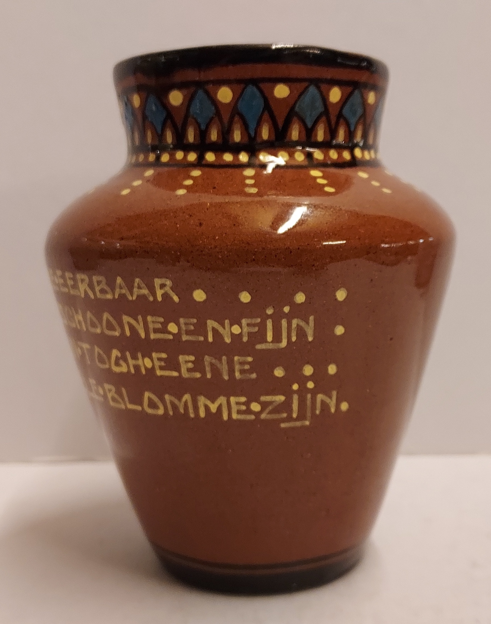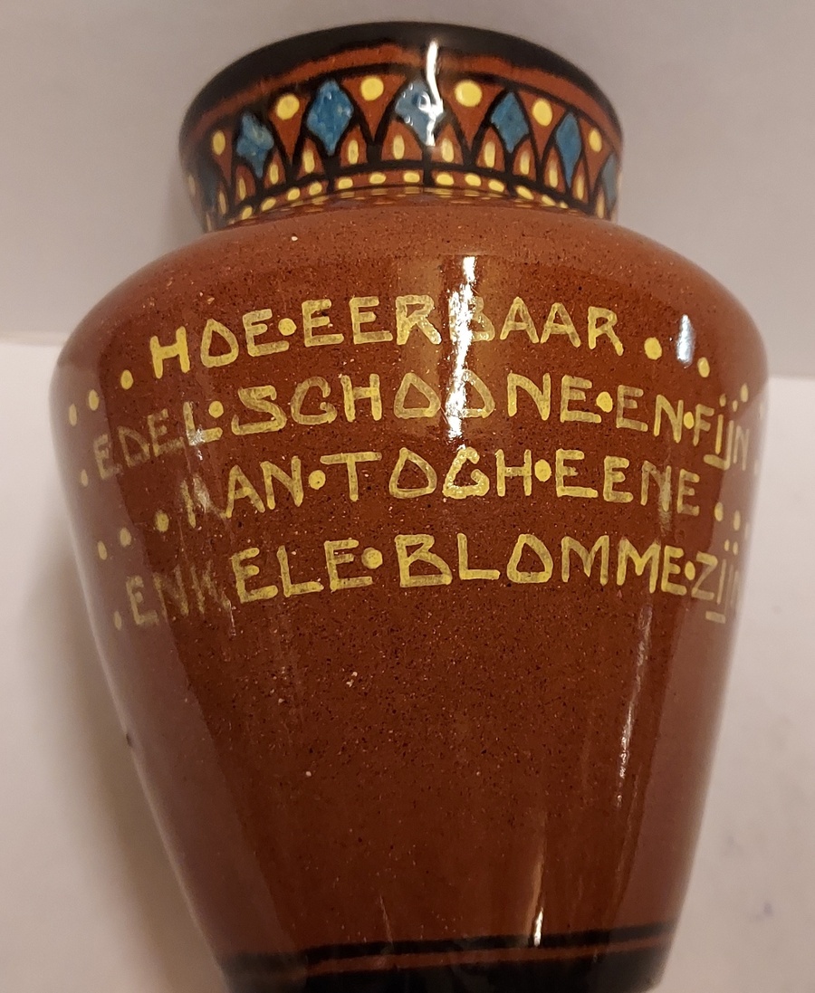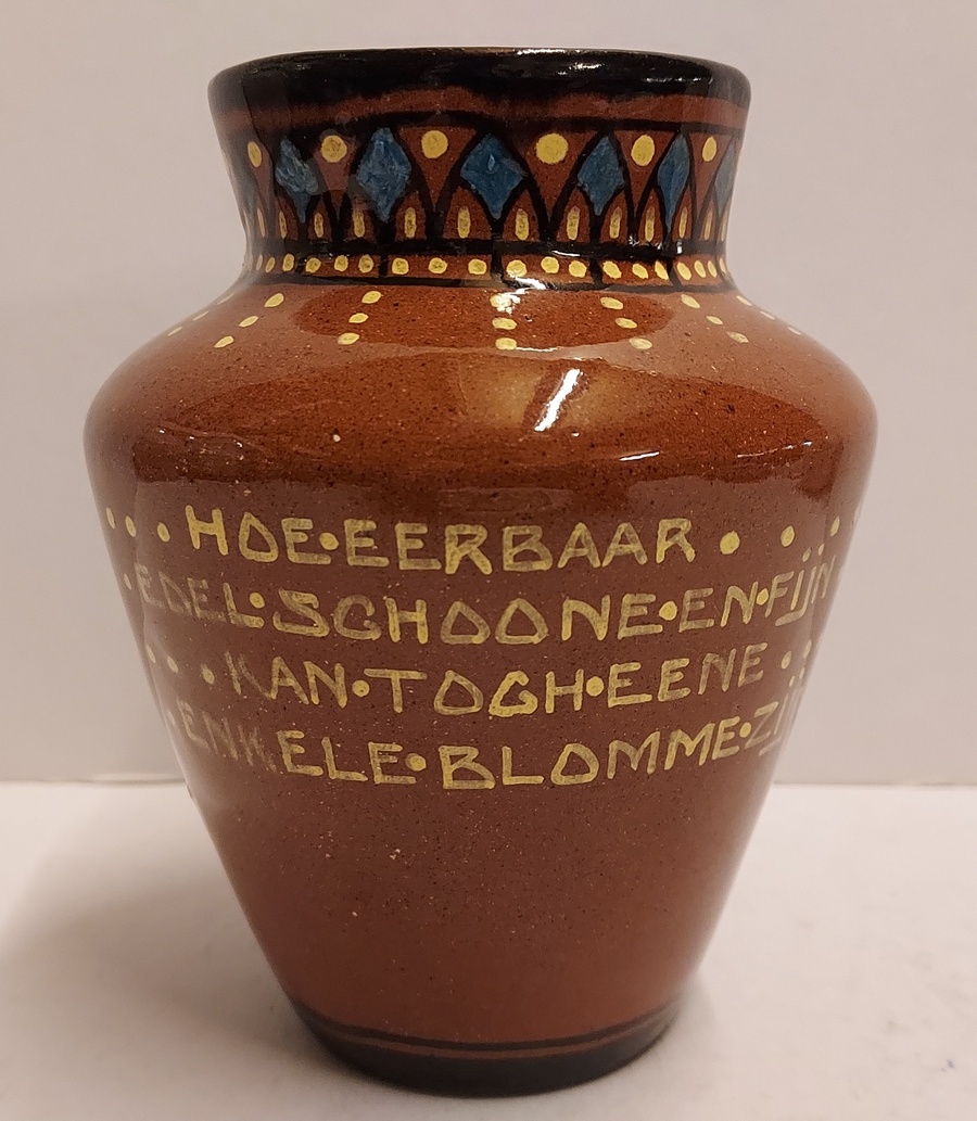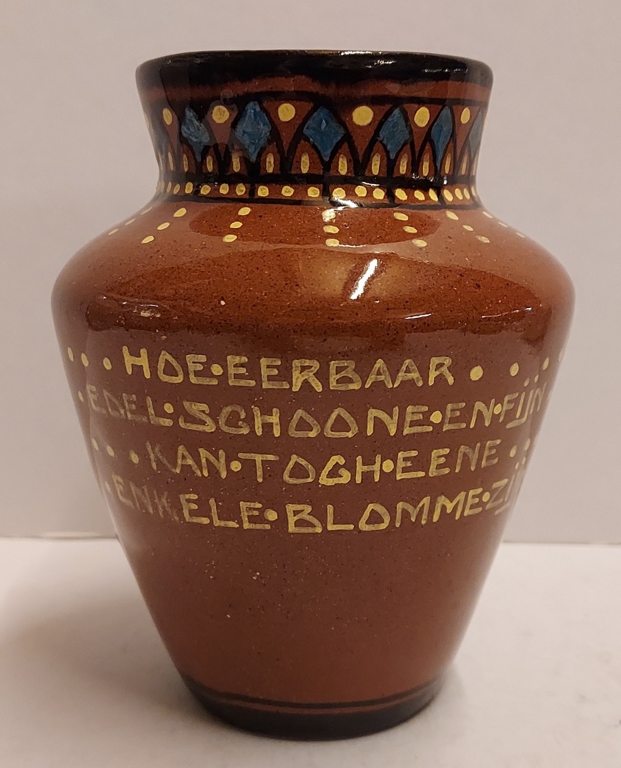 Terracotta vase with a geometric motif on the rim, and on the belly the text "Hoe eerbaar edel schoone en fijn kan tog eene enkele blomme zijn." Bottom with painted factory mark.