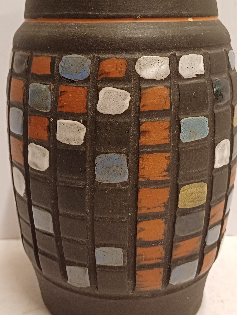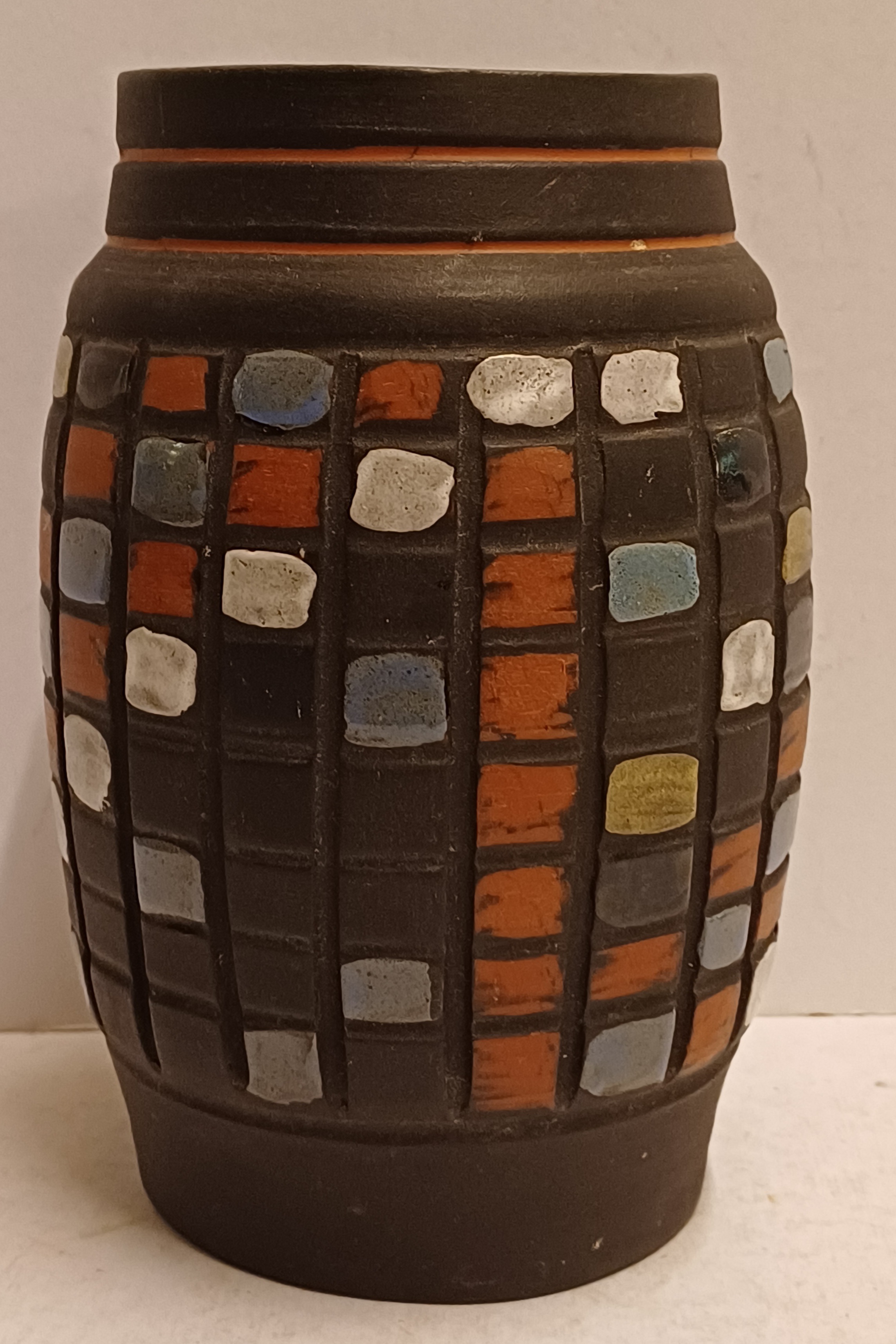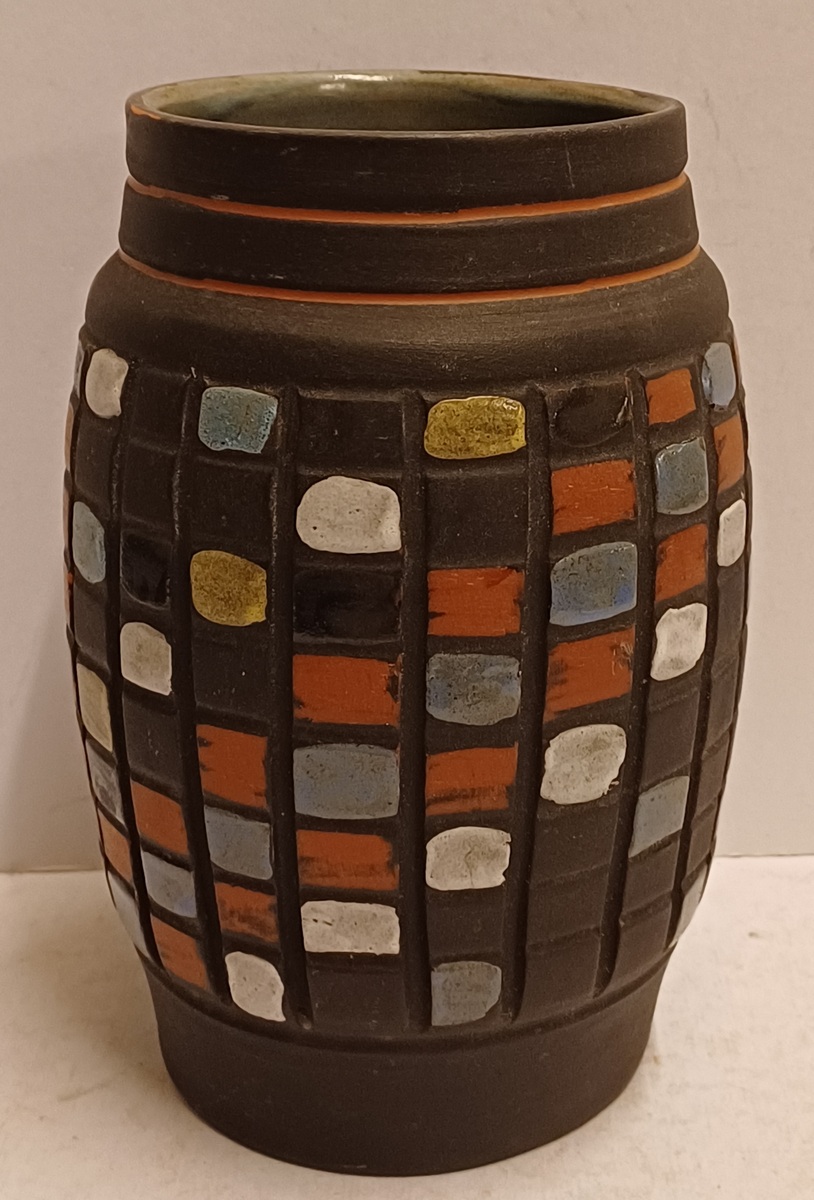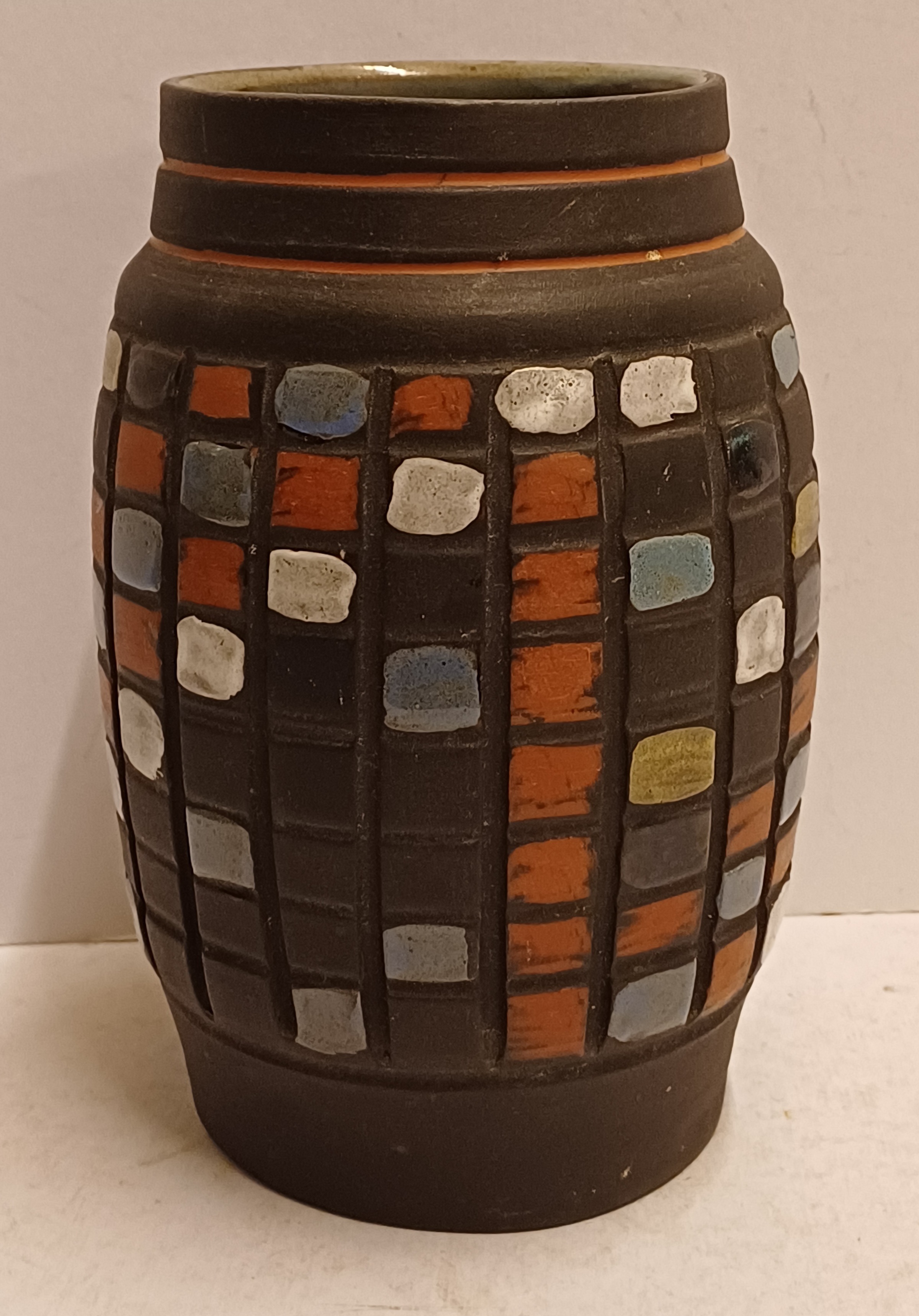 Earthenware vase with a recessed block decor. Designed by Piet Kurstjens, signed on the bottom.
