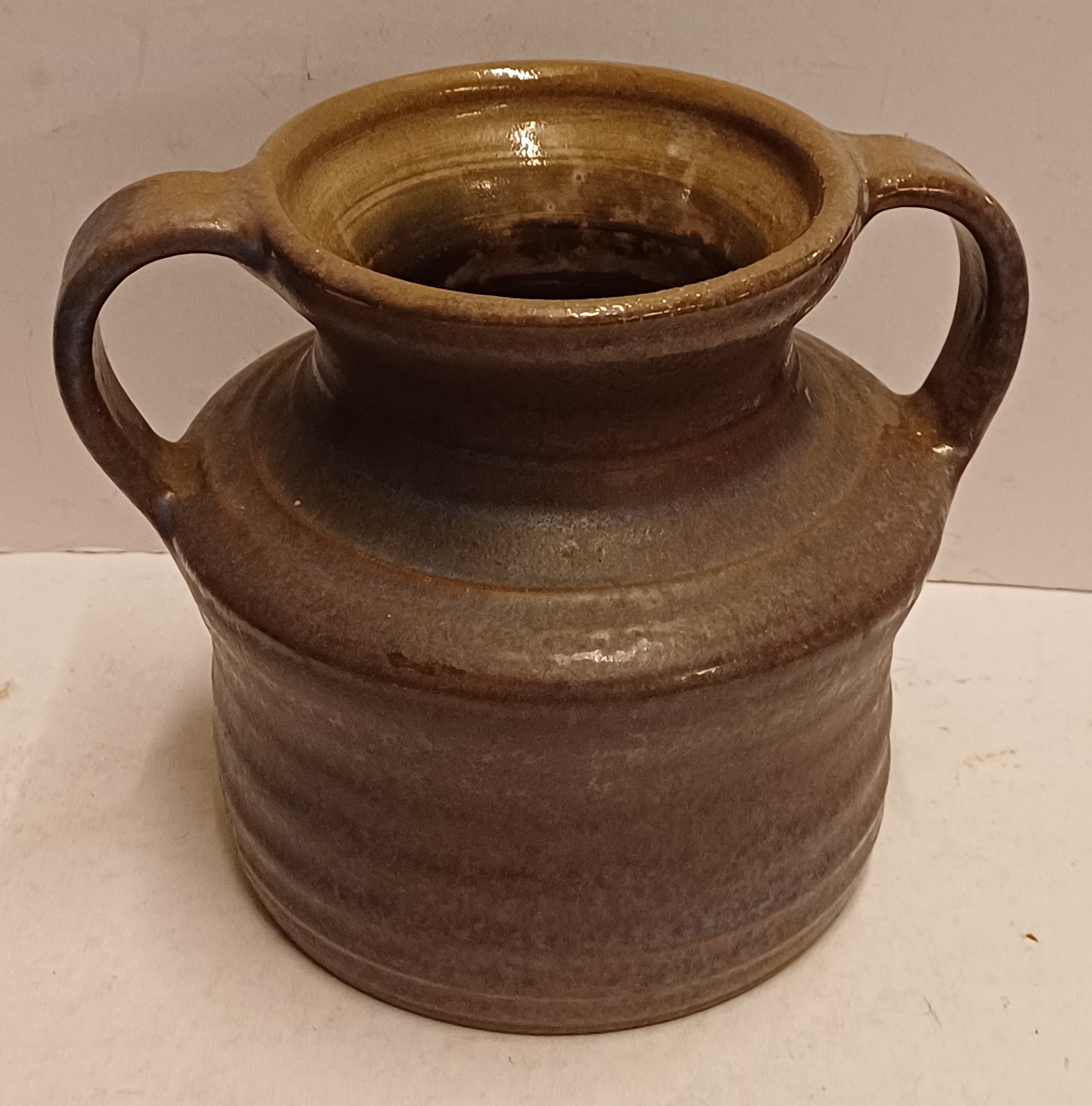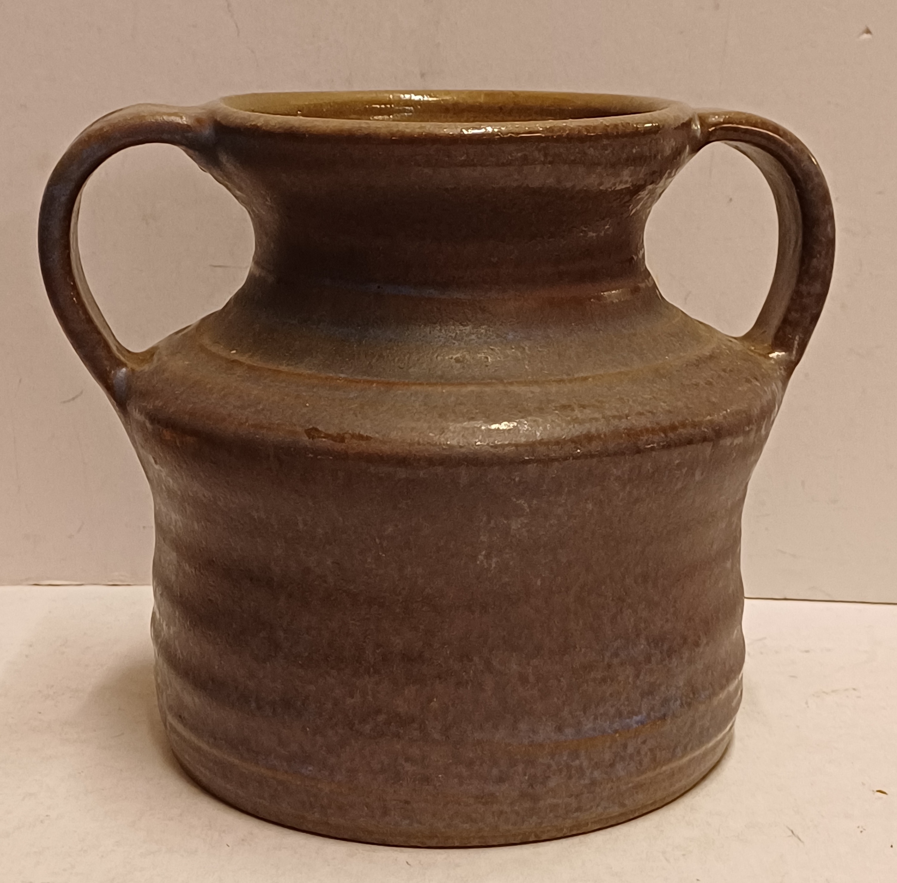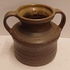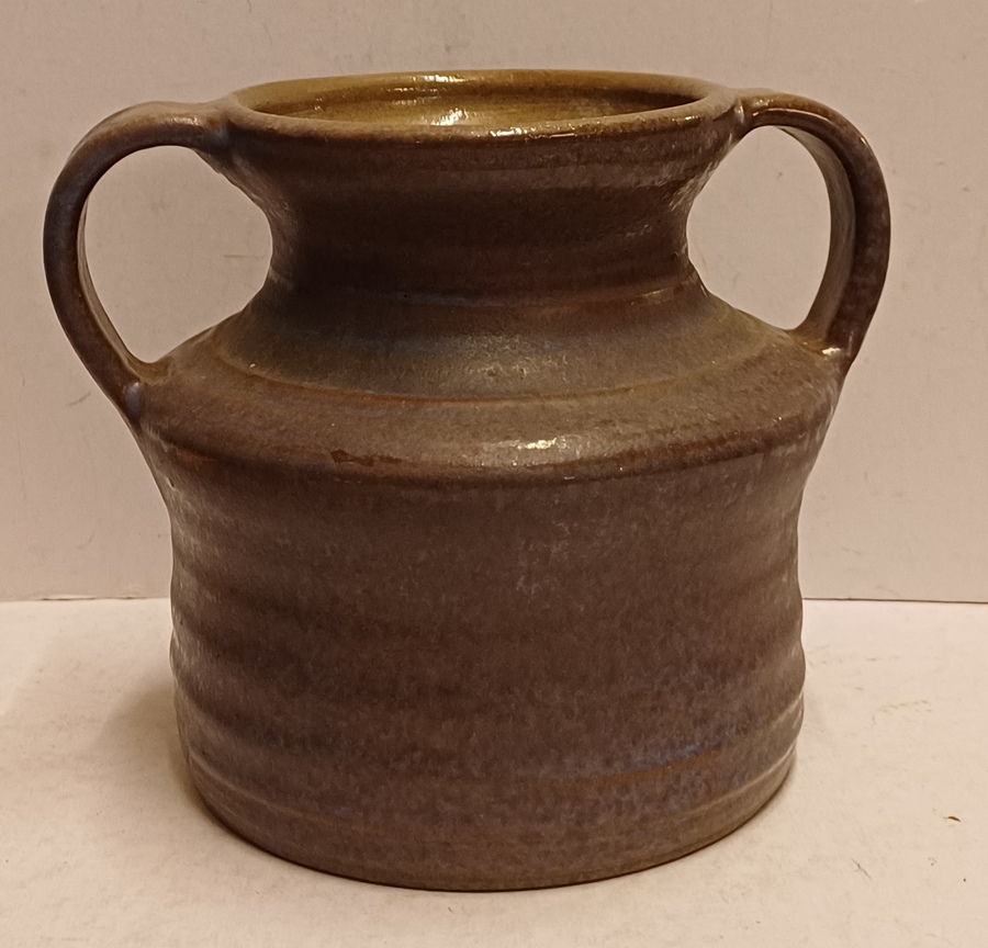 Aardewerken vaas met 2 oren met paars grijze glazuur. Onderzijde gemerkt.