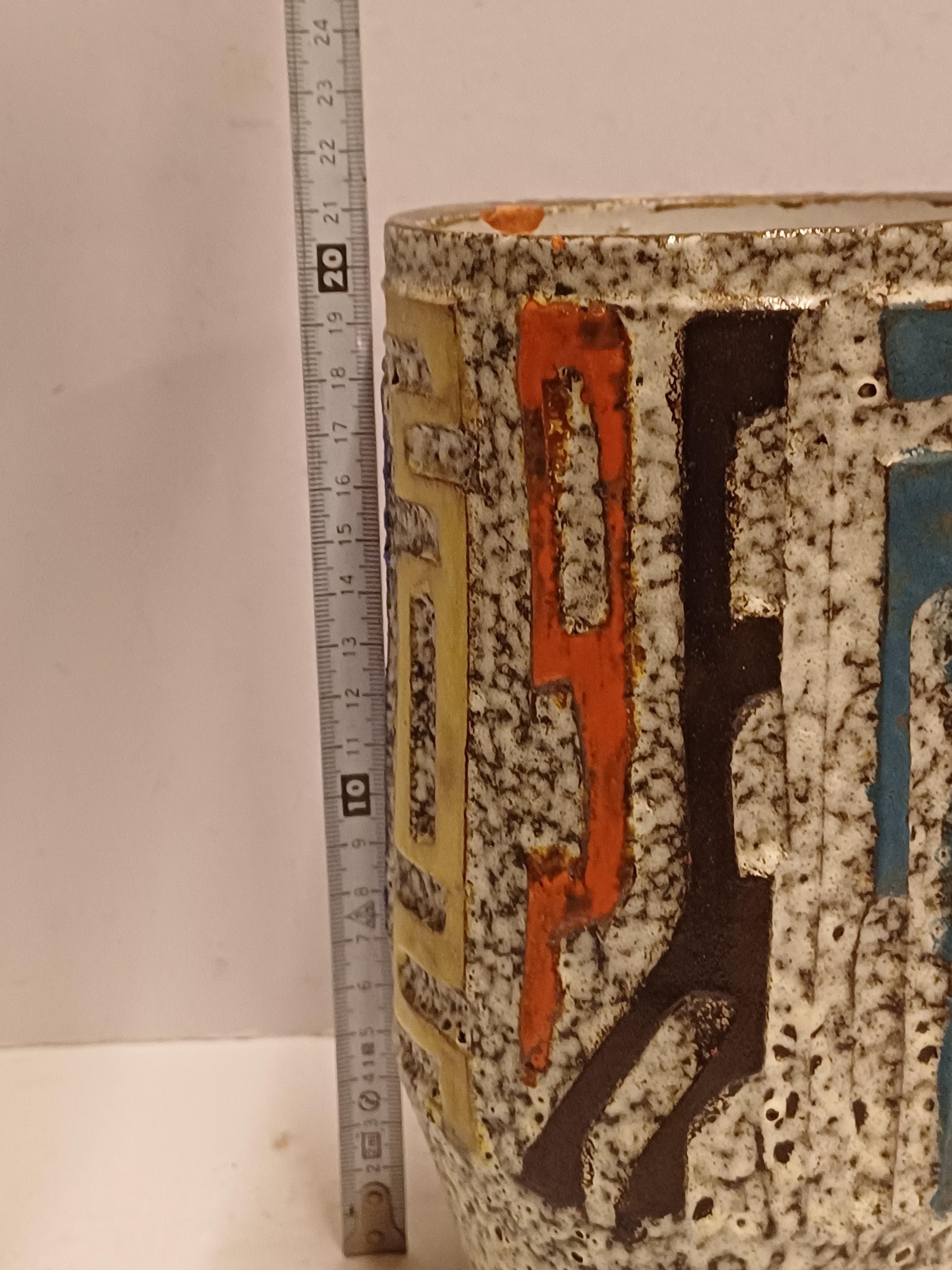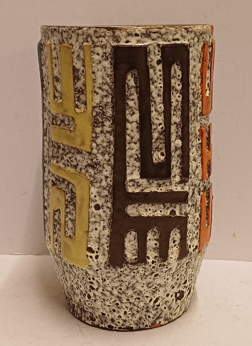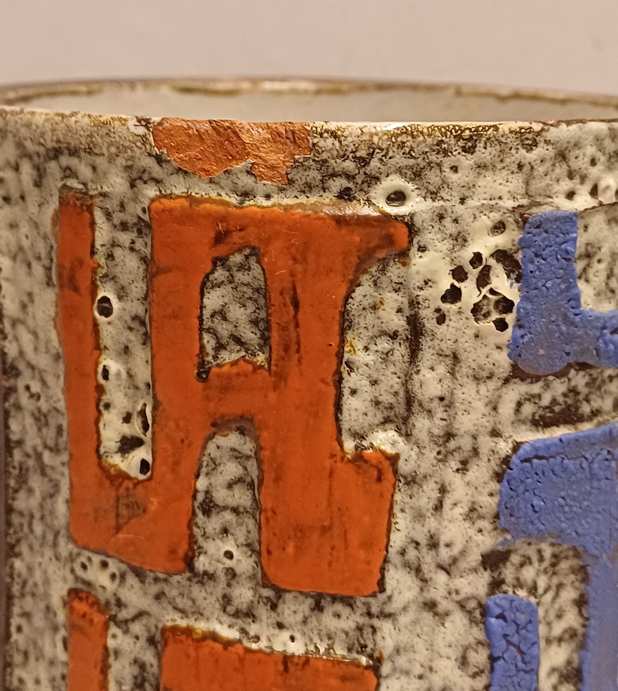 Aardewerken cilindrische vaas met uitgesneden decor met meerkleurige glazuur. Zogenaamd Sequoia aardewerk. Onderzijde niet gesigneerd.