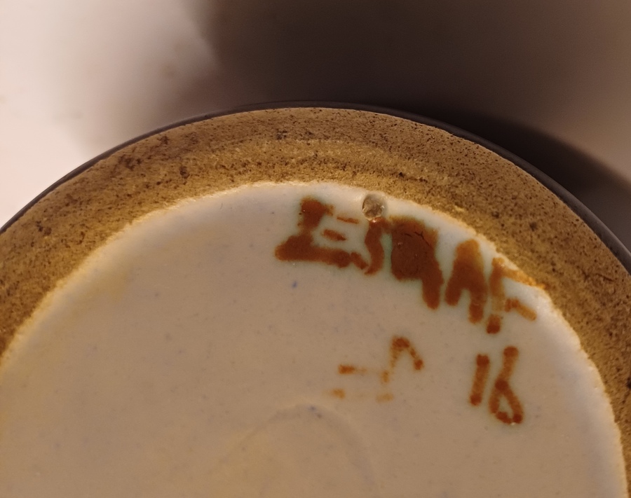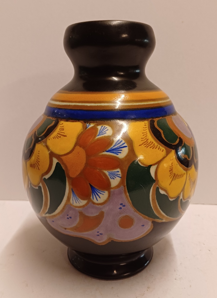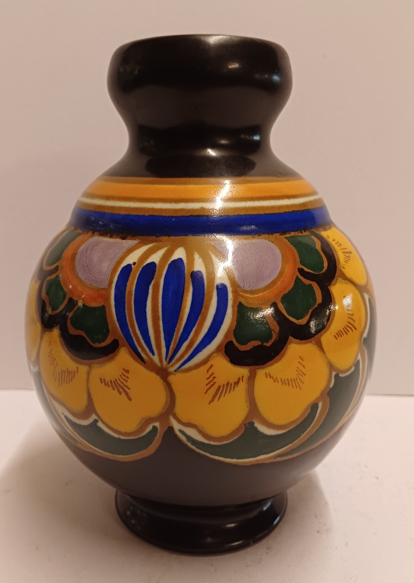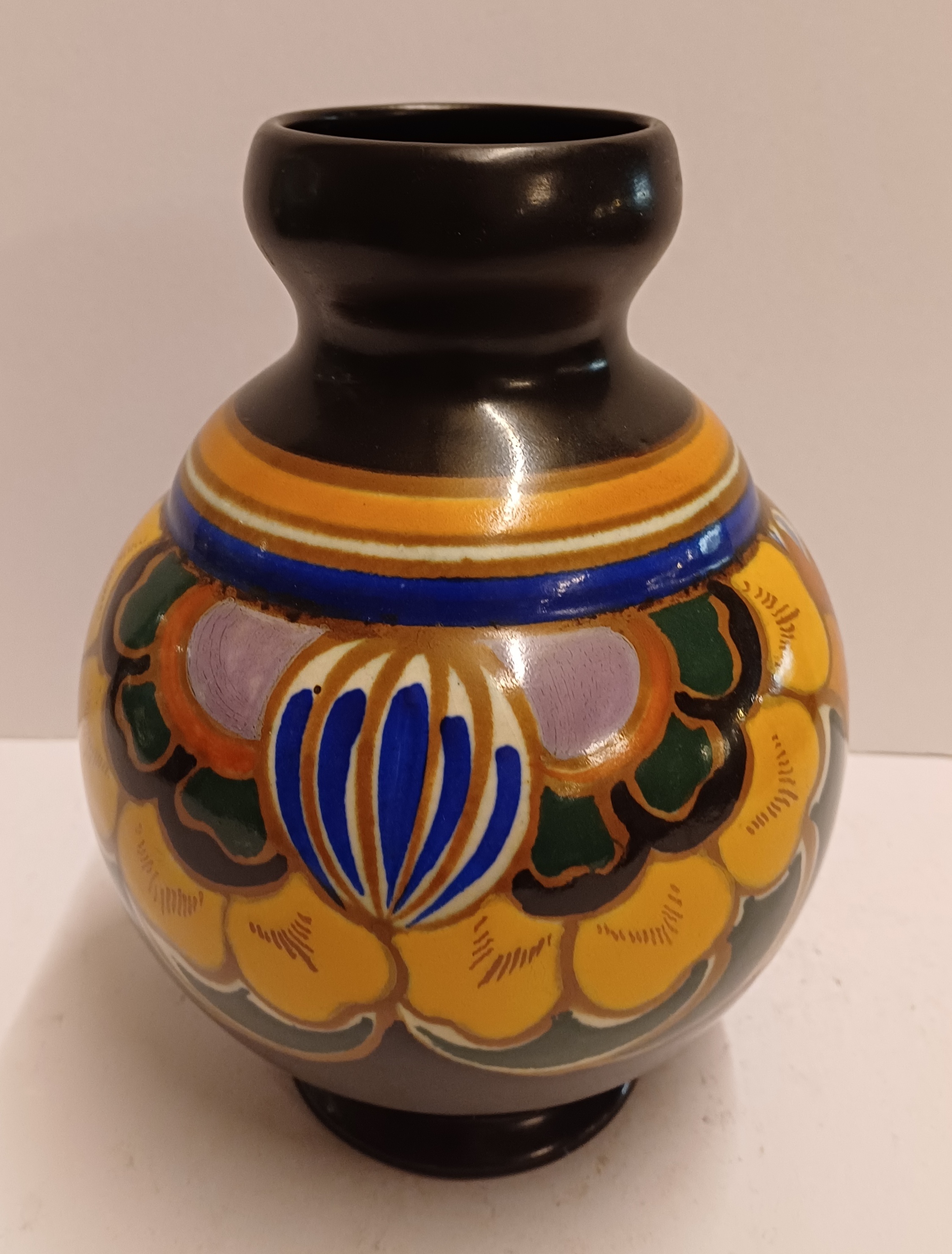 Faience vase with stylized floral decor. Bottom with painted brand mark.