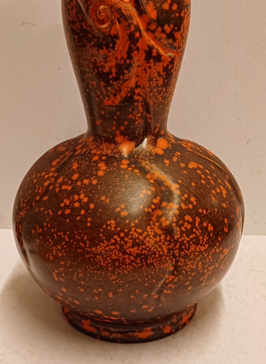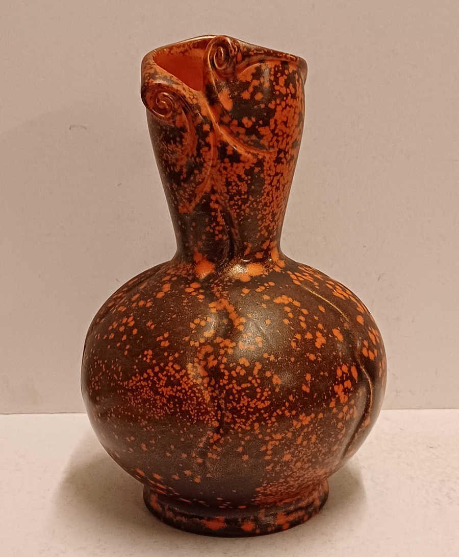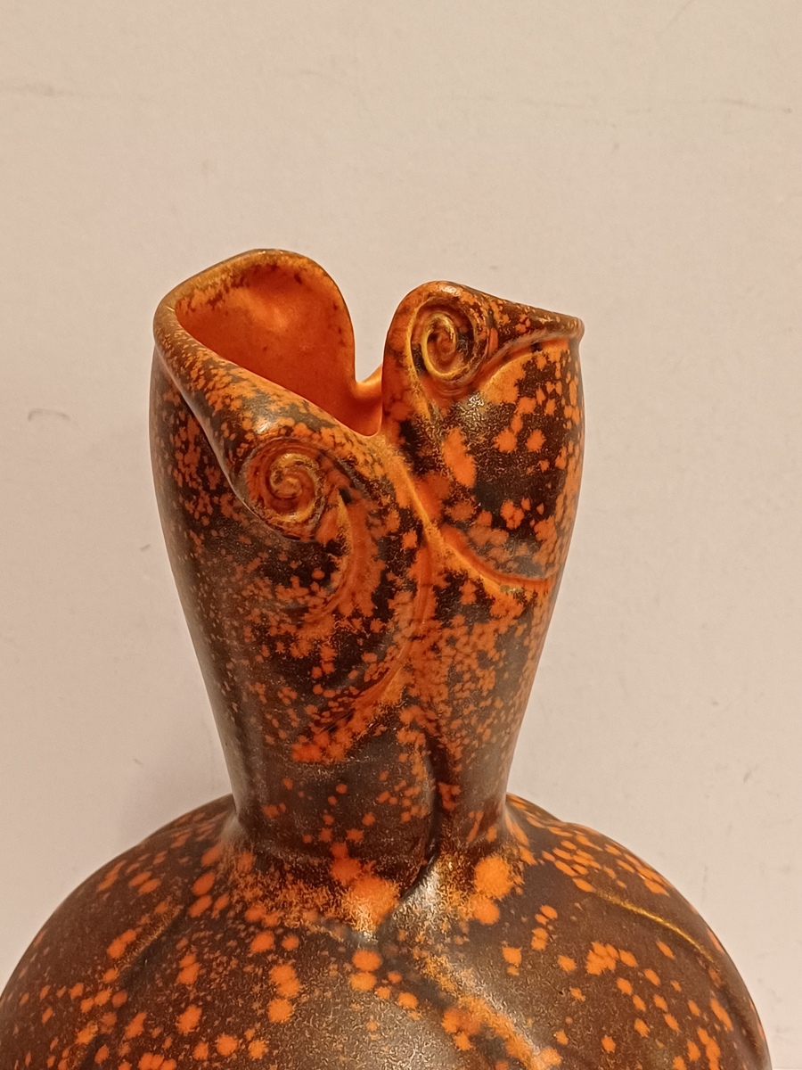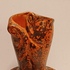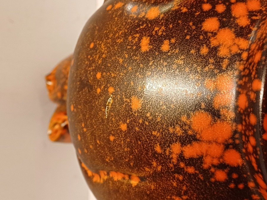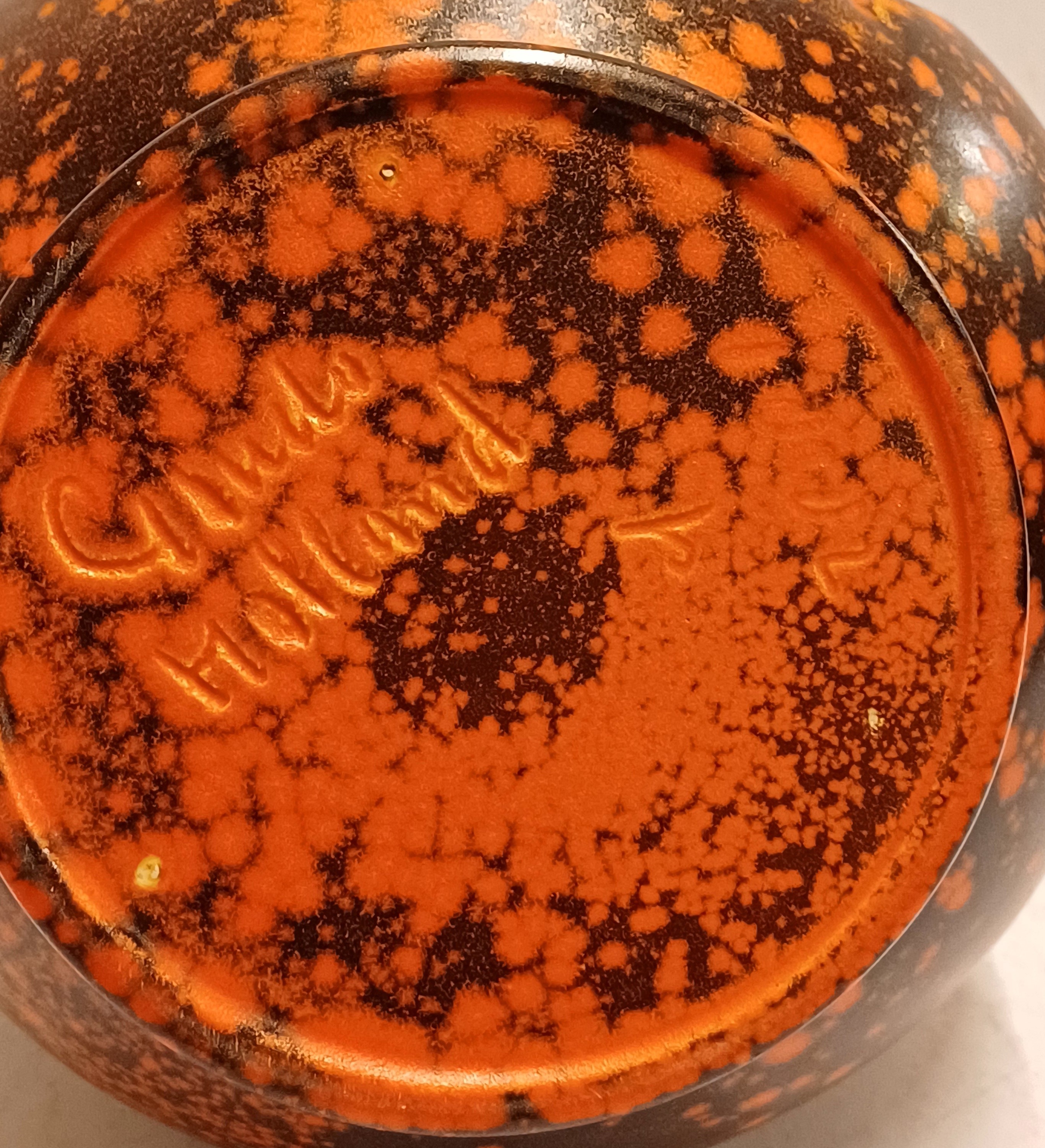 Oranje gemeleerde glazuur op grillige gesneden vaas. Ontwerp Fons Decker voor Plateelbakkerij Zuid Holland.