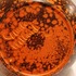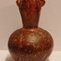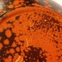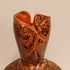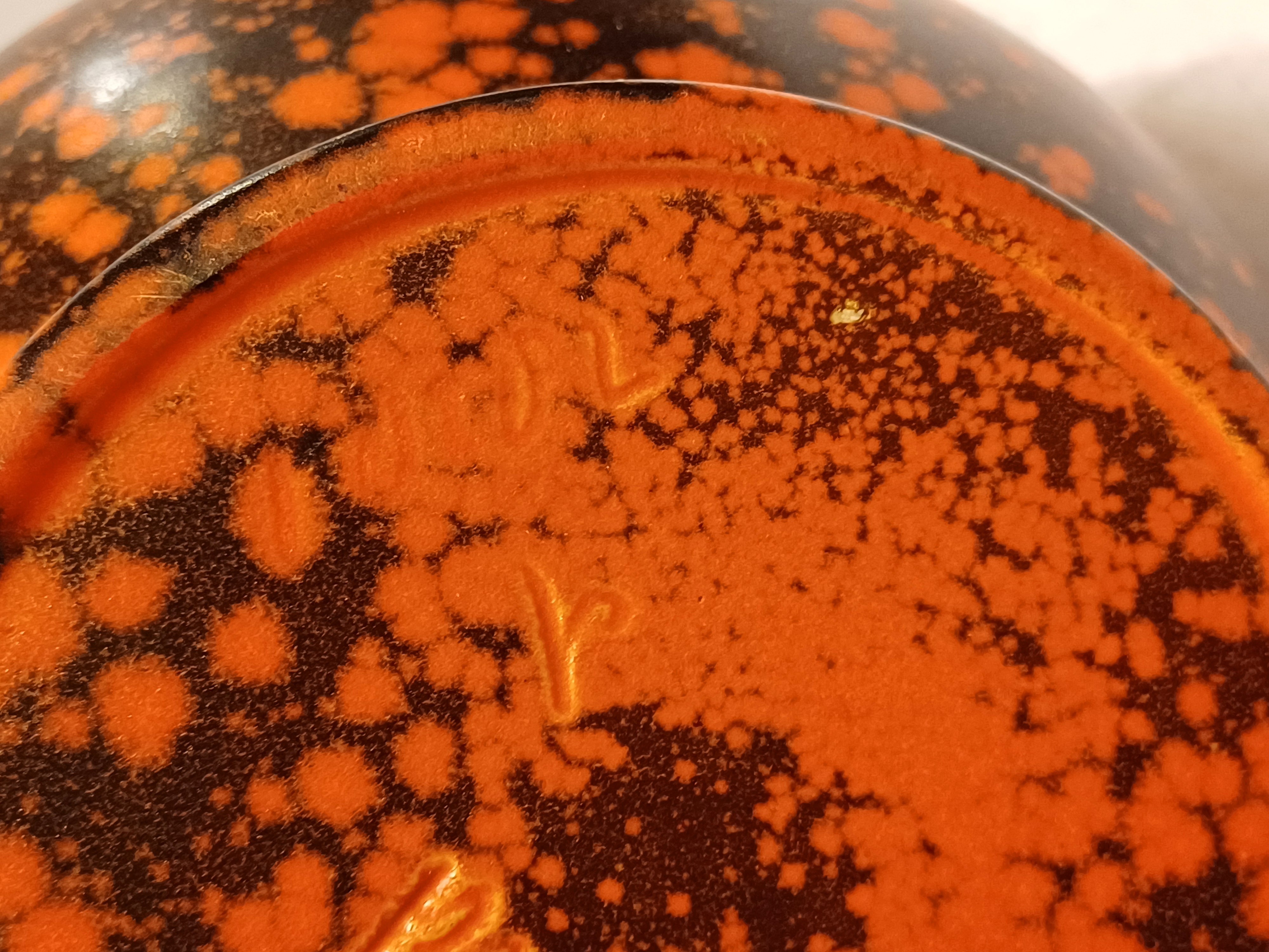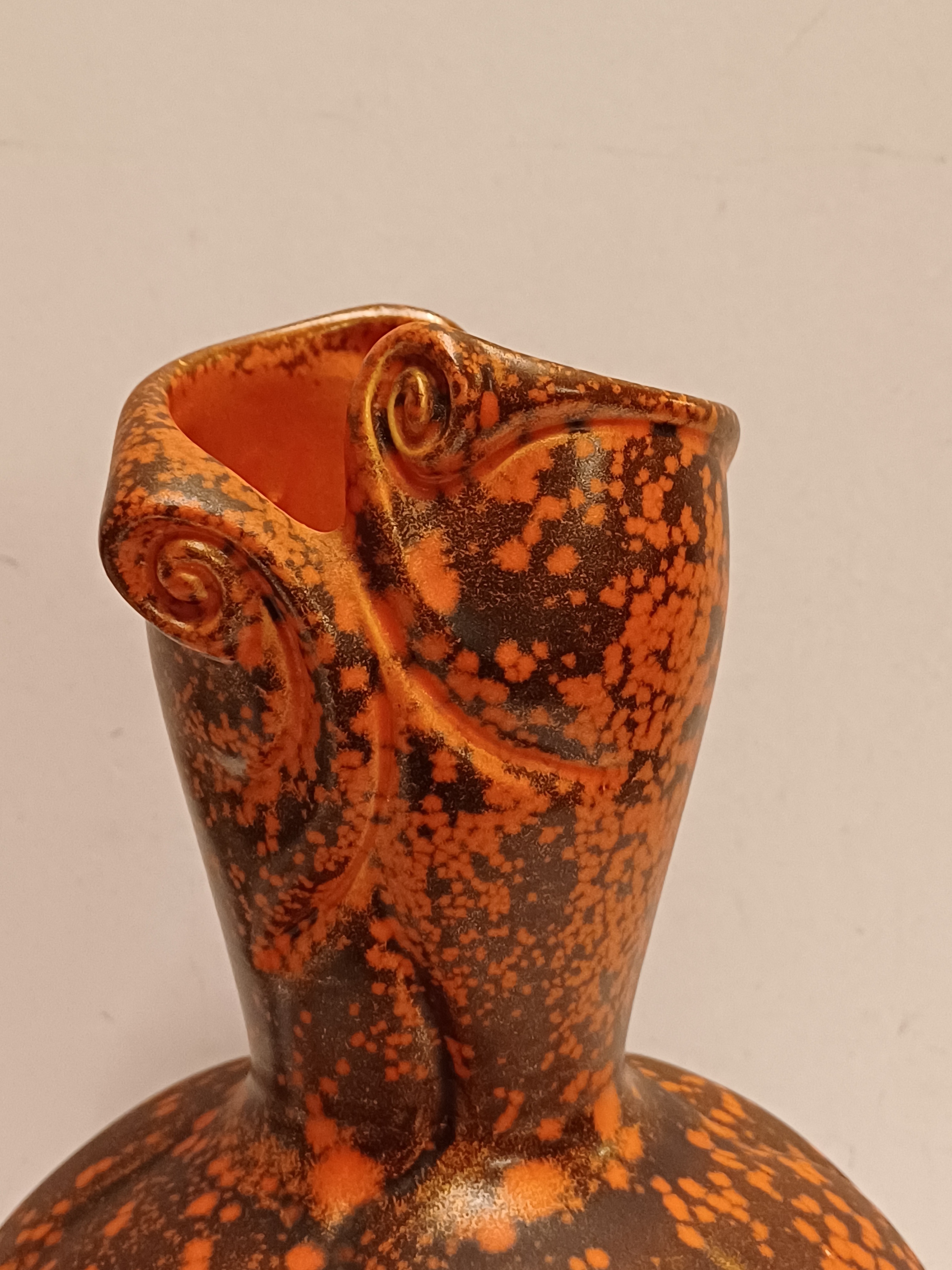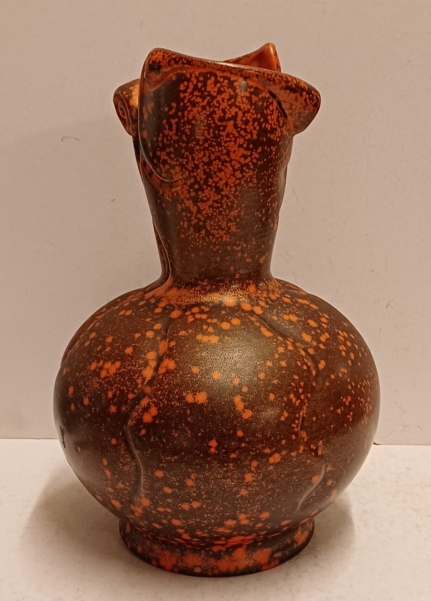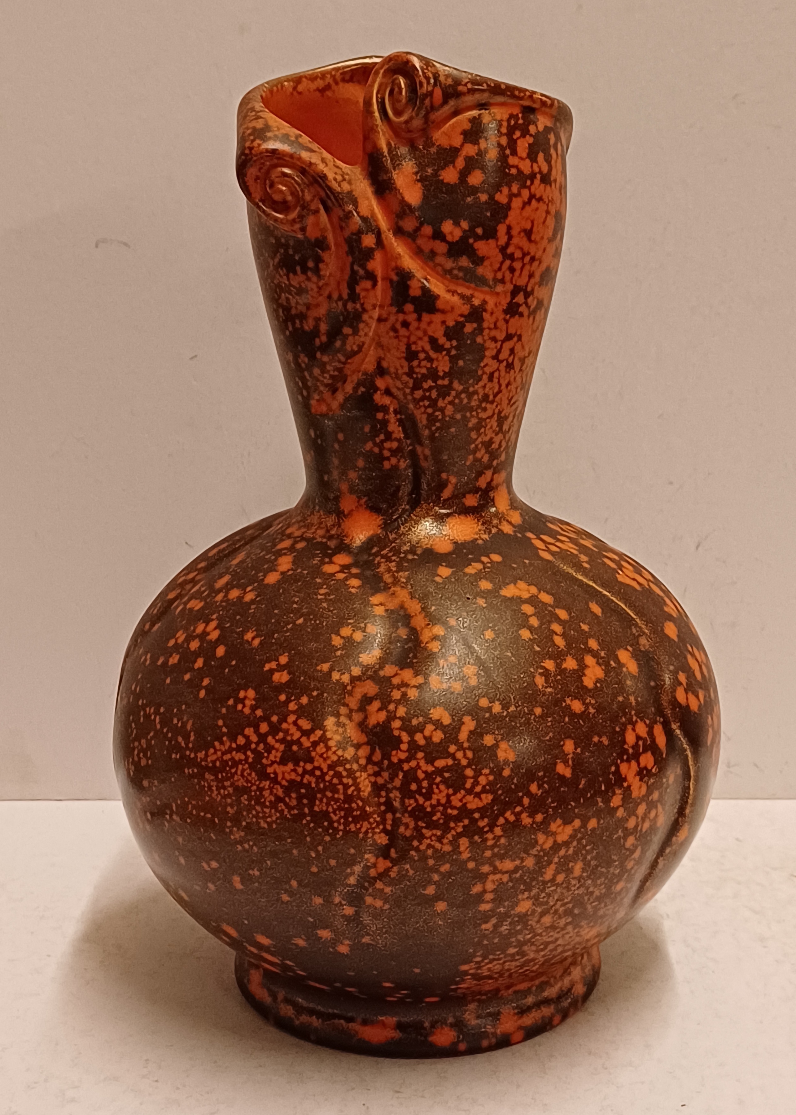 Oranje gemeleerde glazuur op grillige gesneden vaas. Ontwerp Fons Decker voor Plateelbakkerij Zuid Holland.