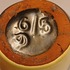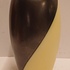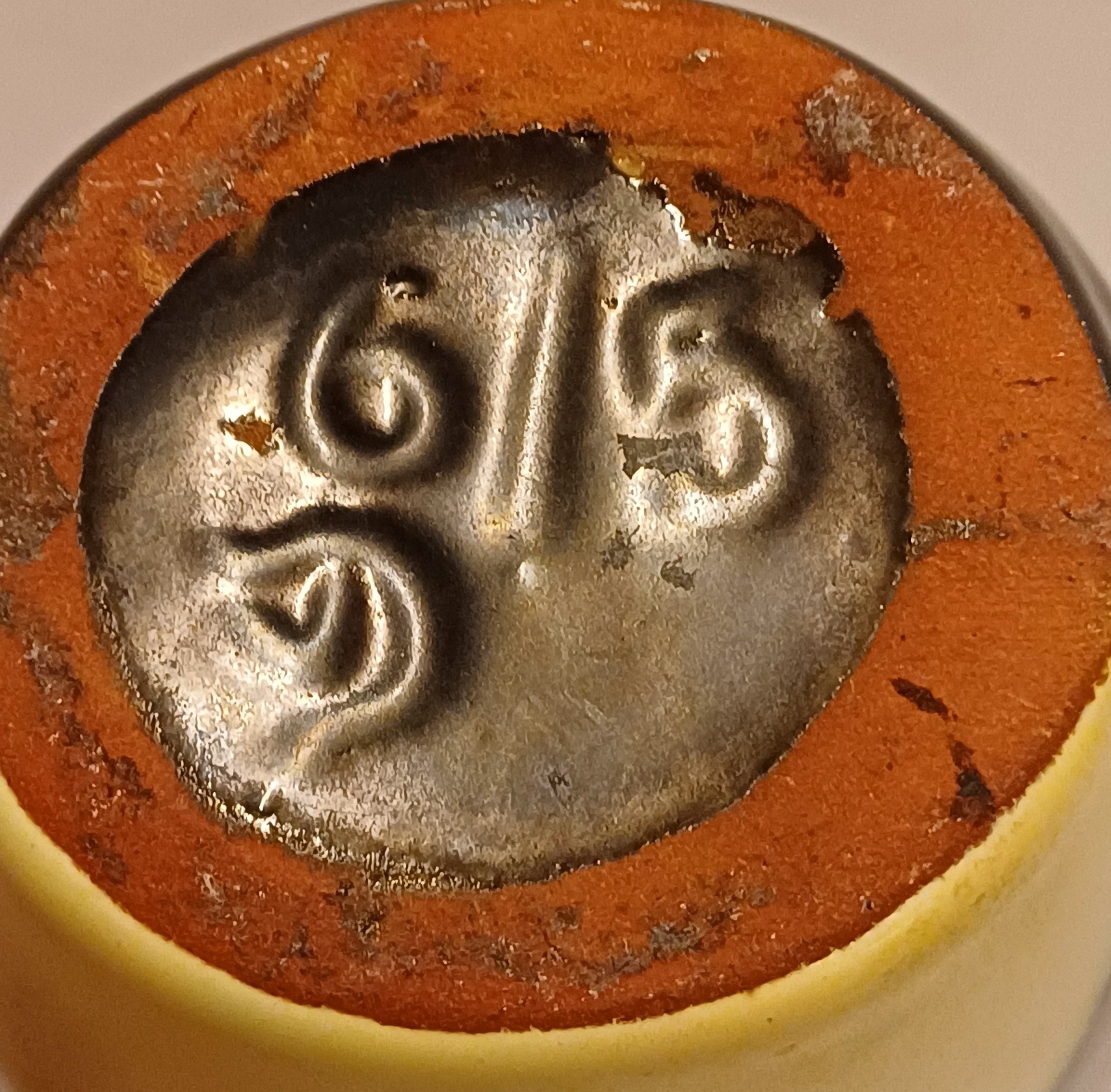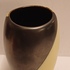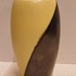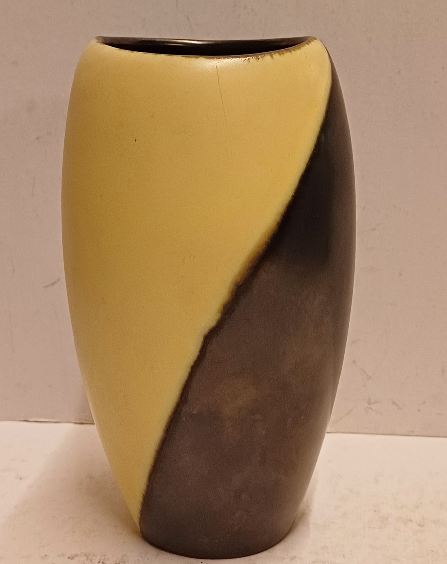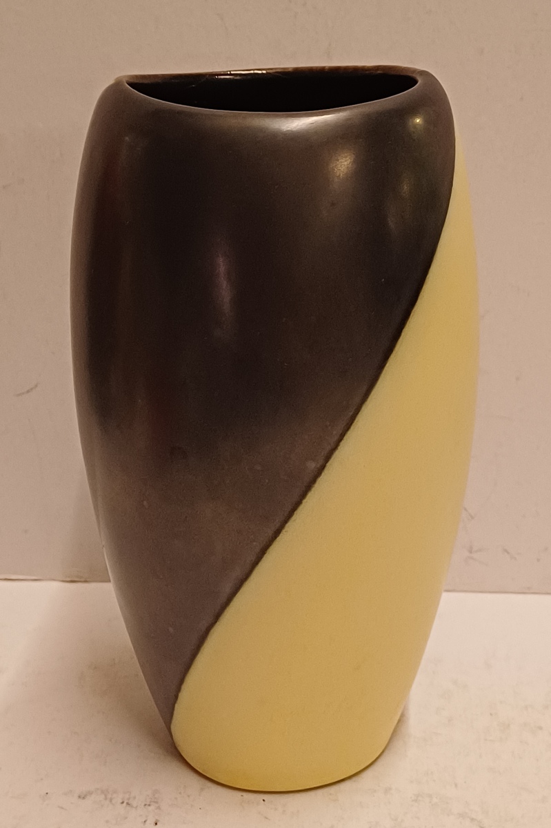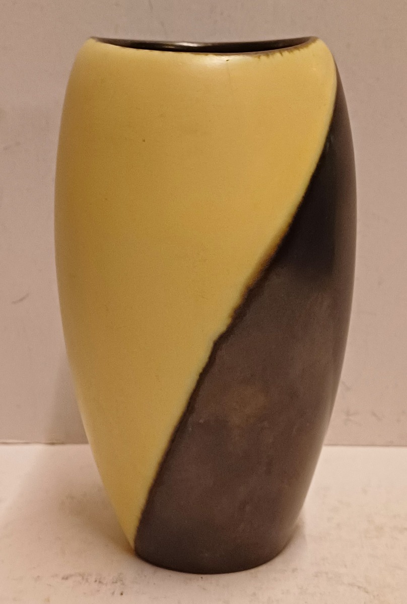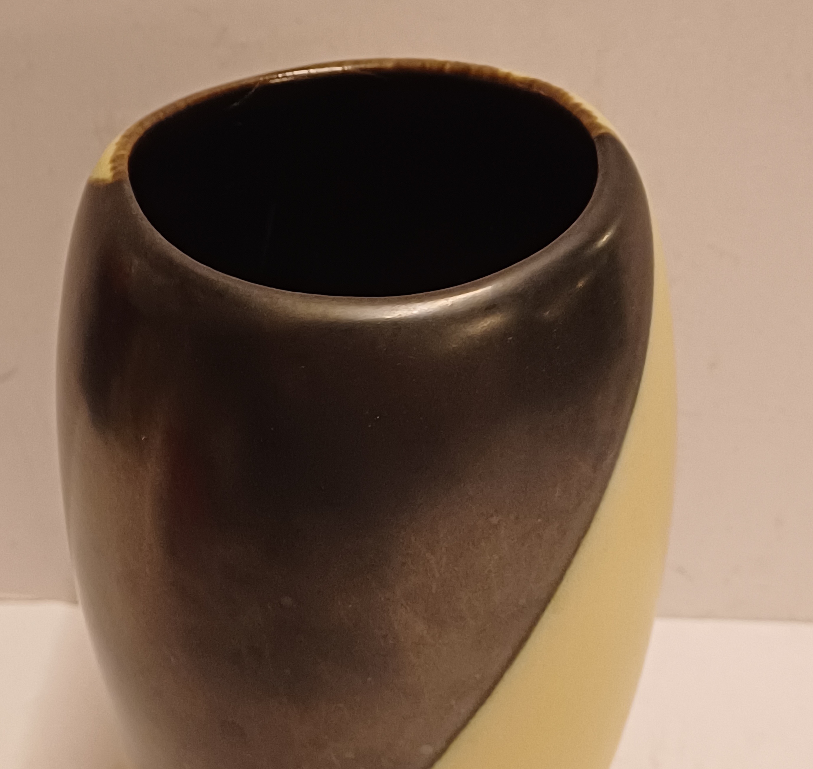 Gegoten aardewerken vaas met creme en zwarte glazuur. Onderzijde met signatuur en modelnummer.