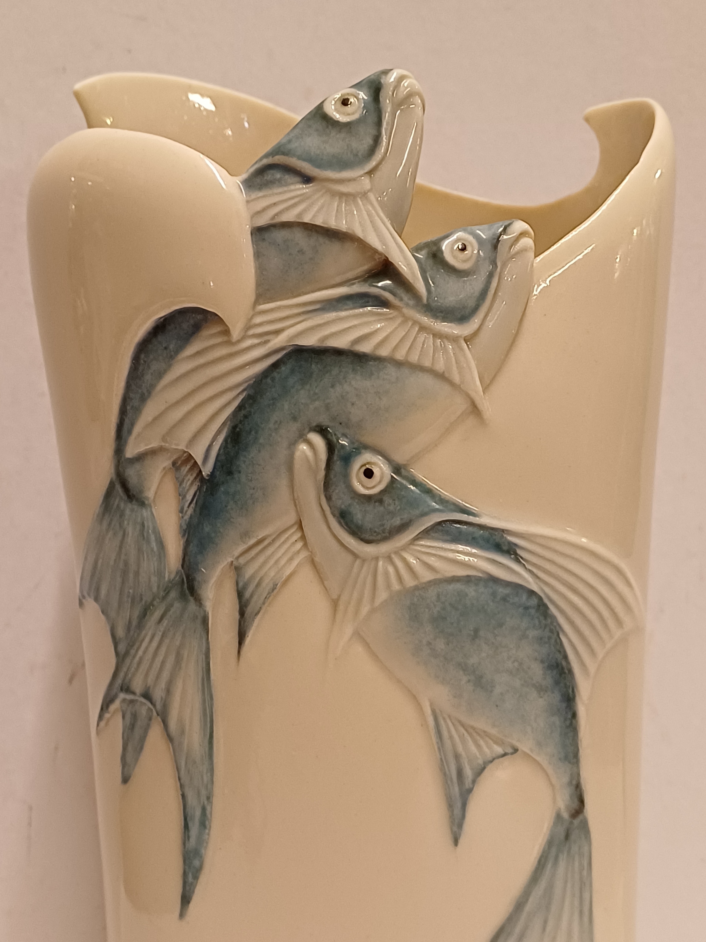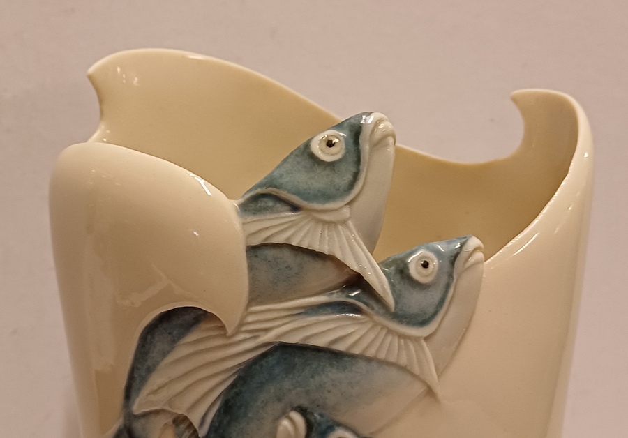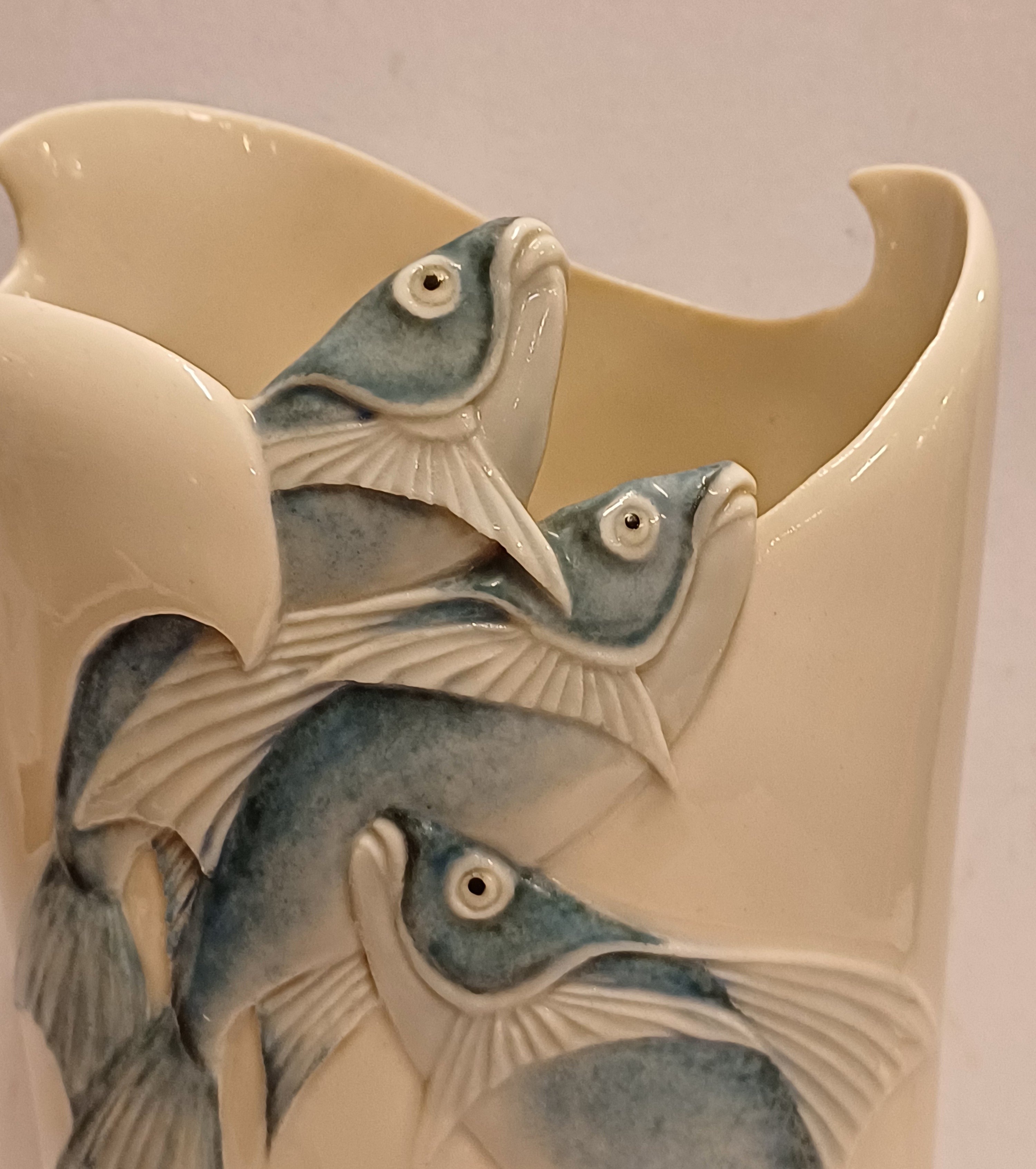 Aardewerken vaas met decor van een drietal vissen die de vaas uitzwemmen. Onderzijde met kunstenaars monogram en datering '85.