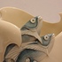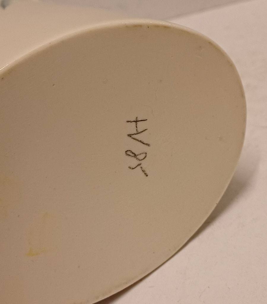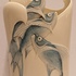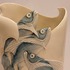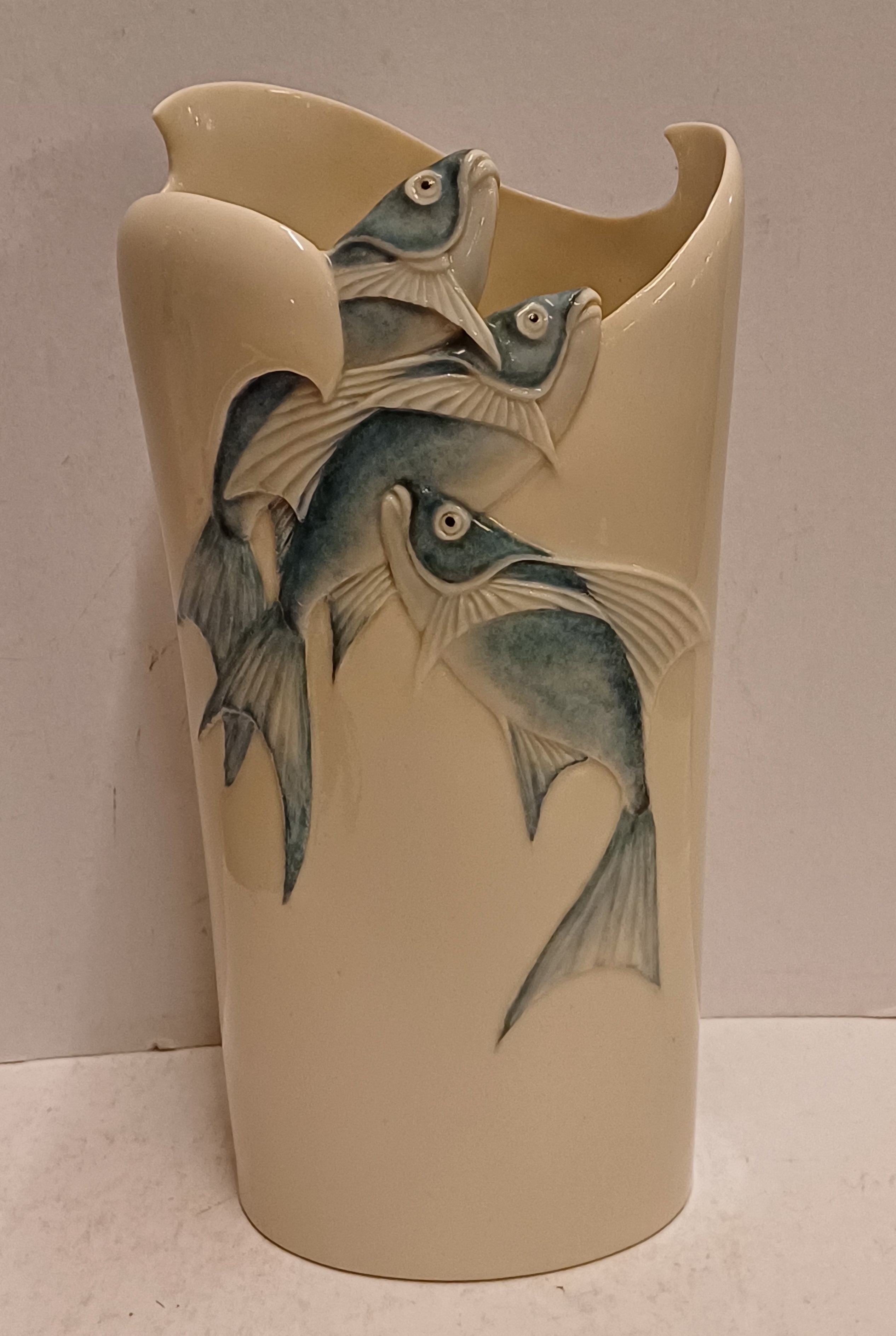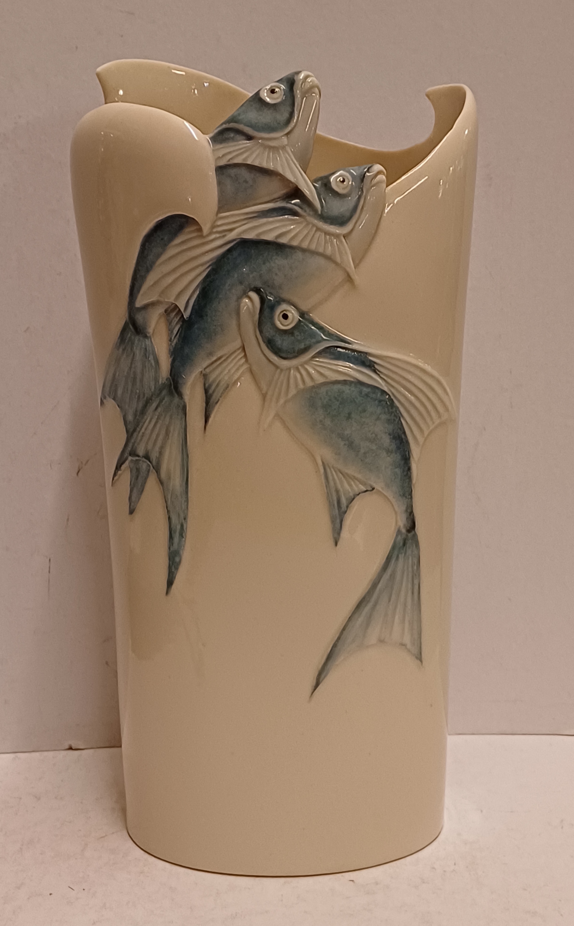 Aardewerken vaas met decor van een drietal vissen die de vaas uitzwemmen. Onderzijde met kunstenaars monogram en datering '85.