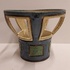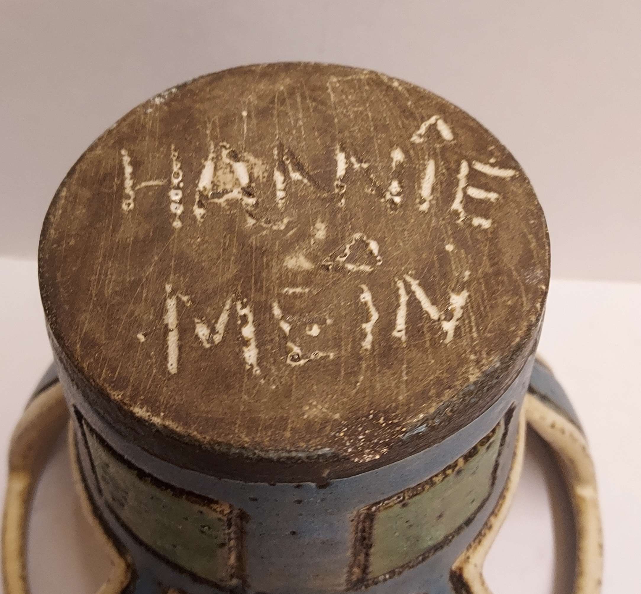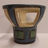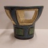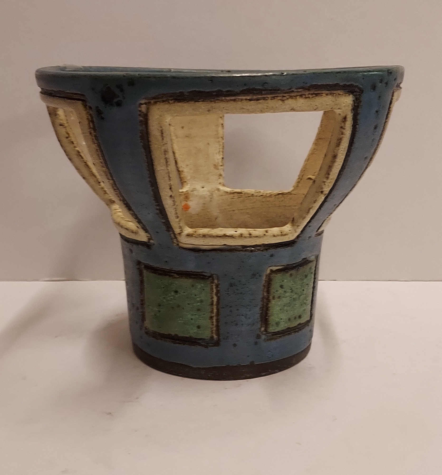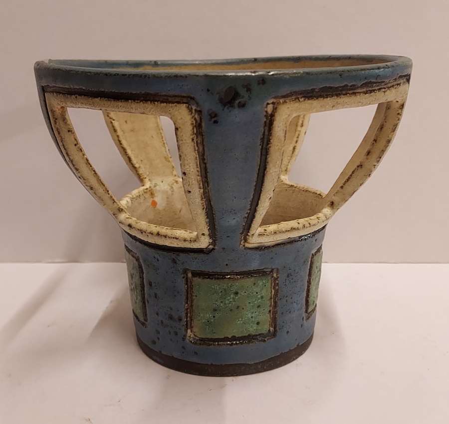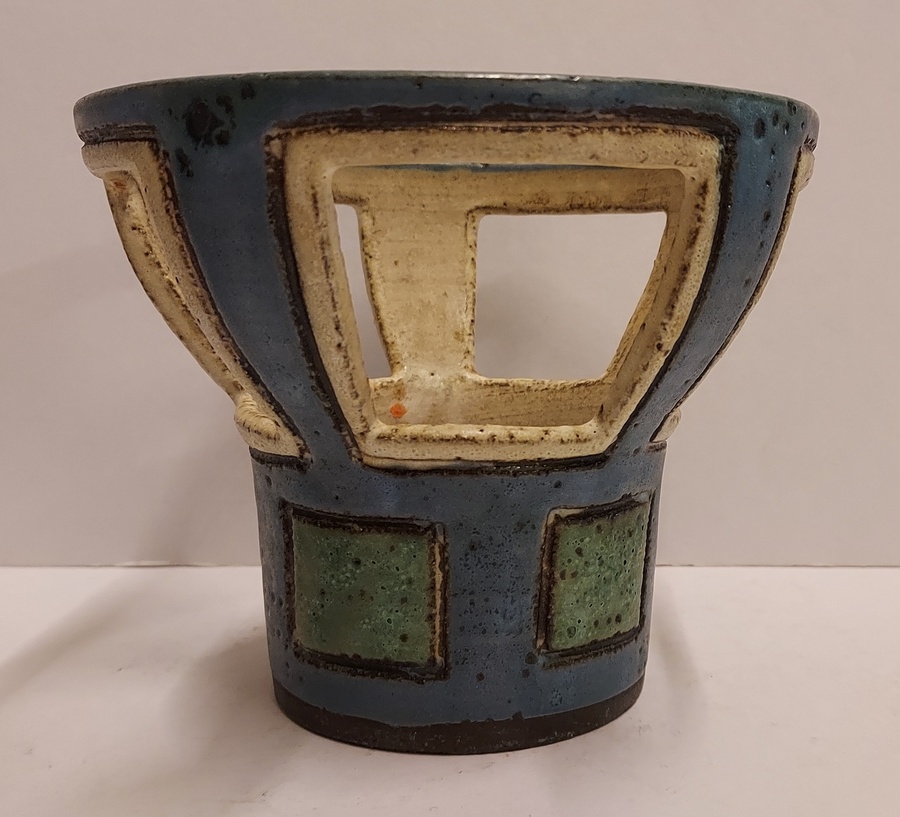 Vase with 3 open windows featuring cream and blue glaze and green panels. Fully signed on the bottom.