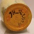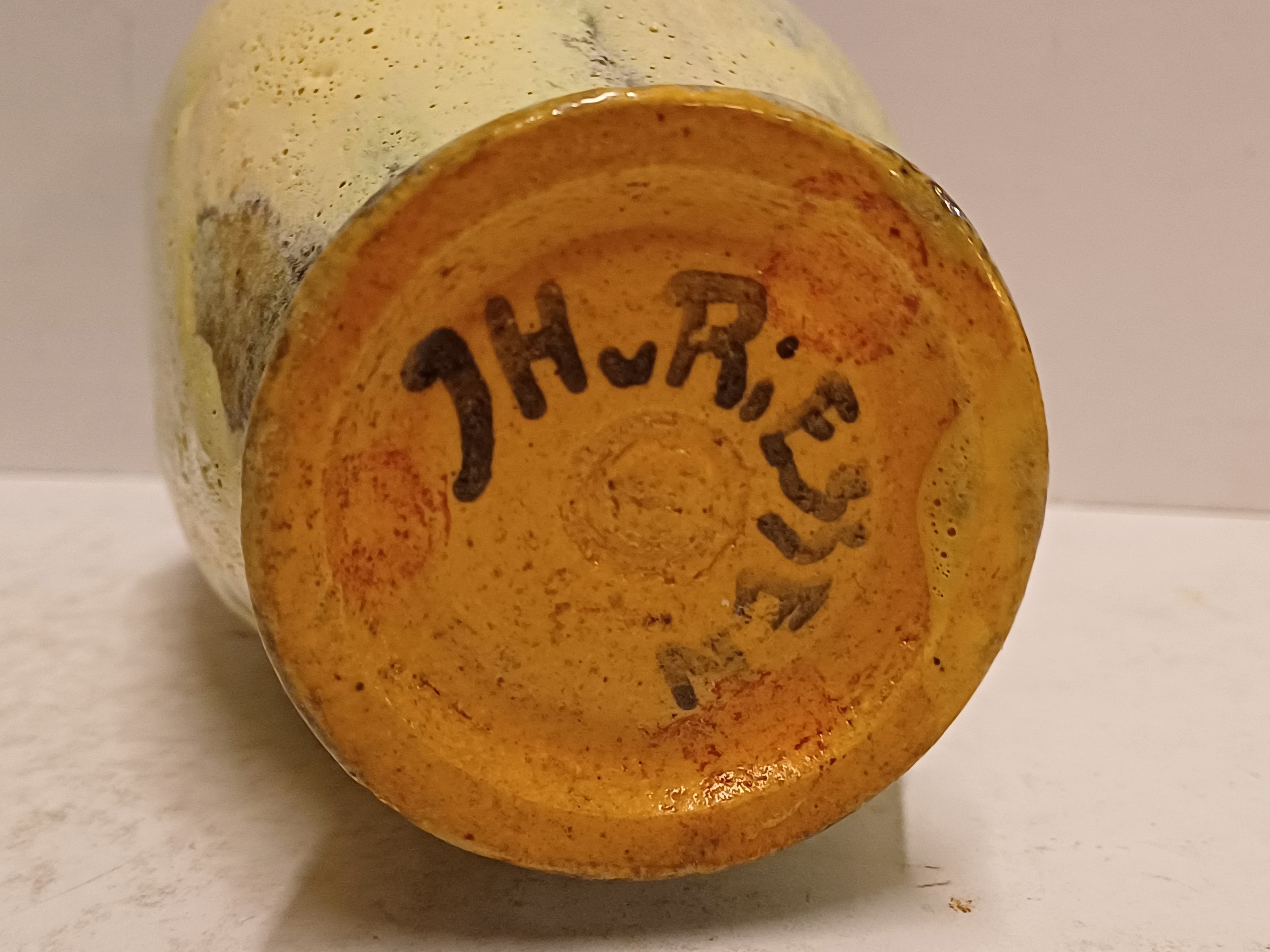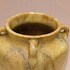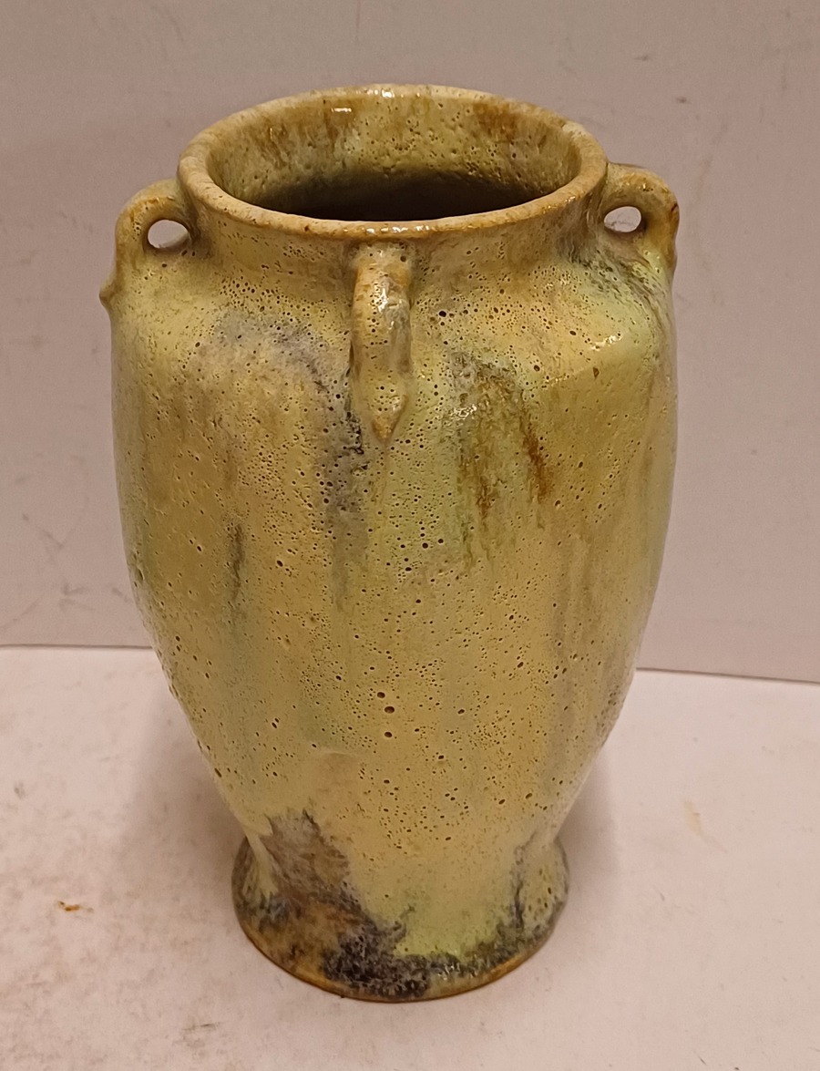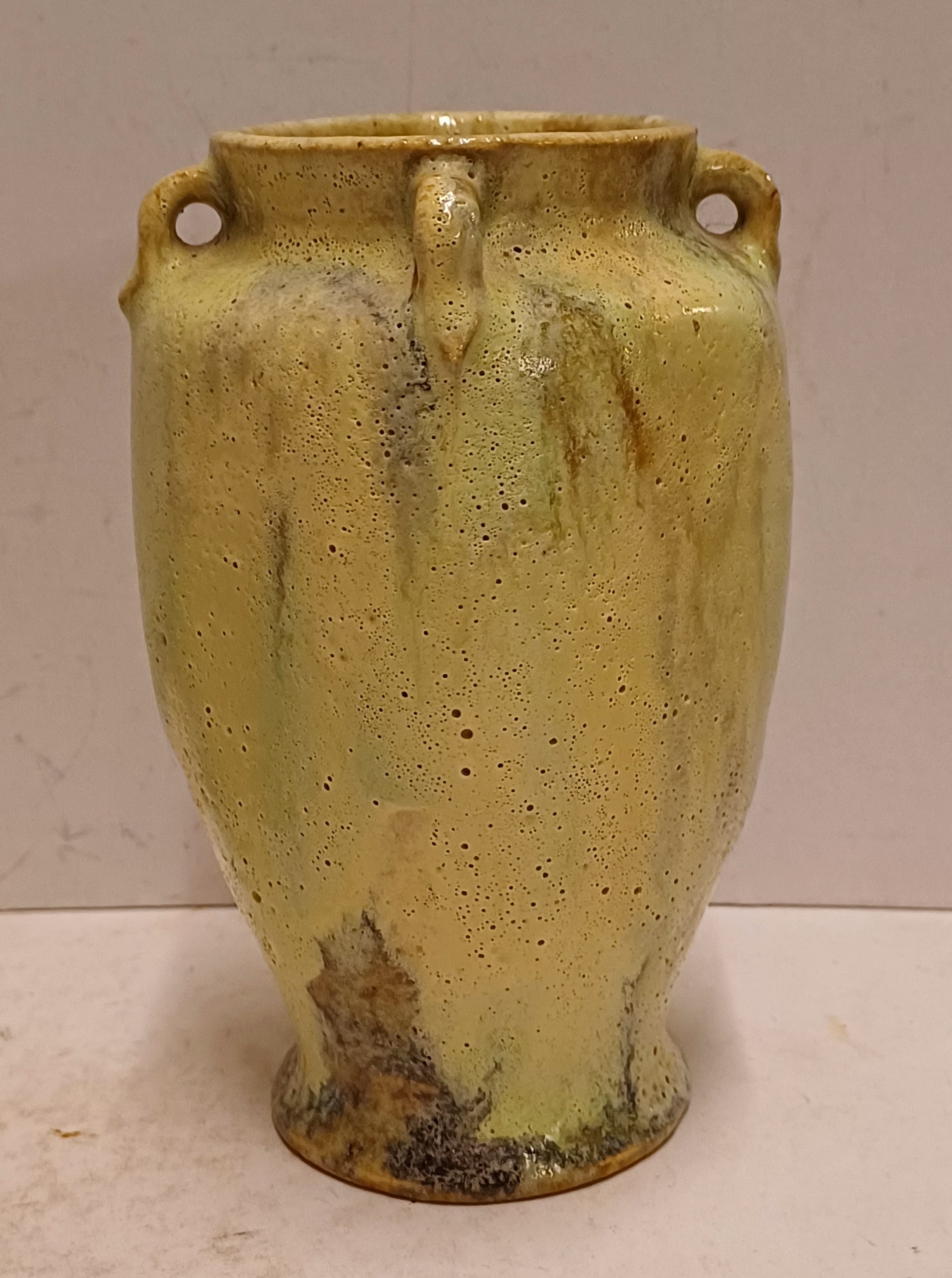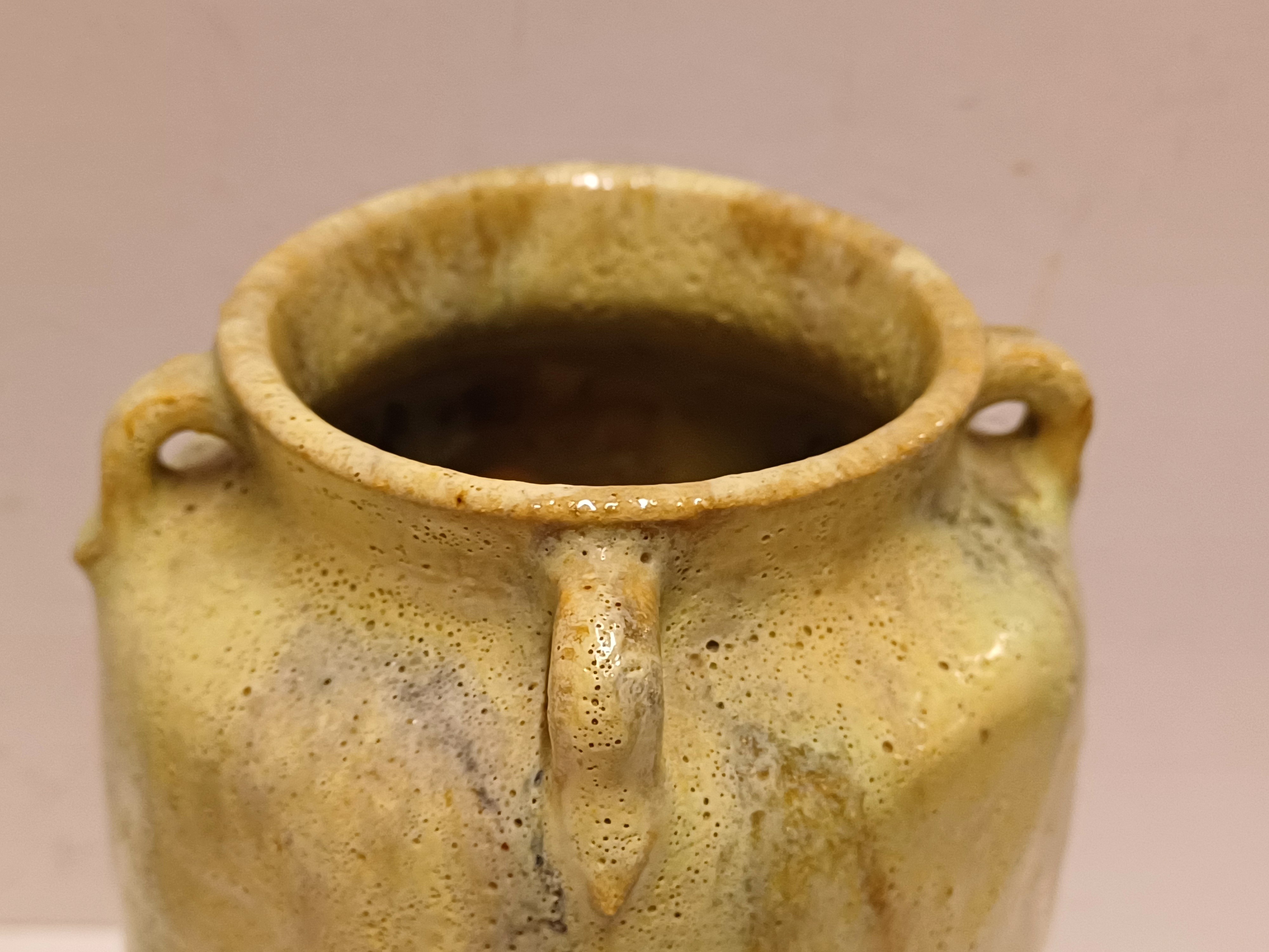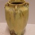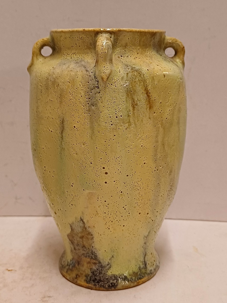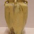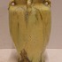 Vaasje met 4 kleine grepen aan de bovenrand met een gele stroomglazuur. Onderzijde gesigneerd