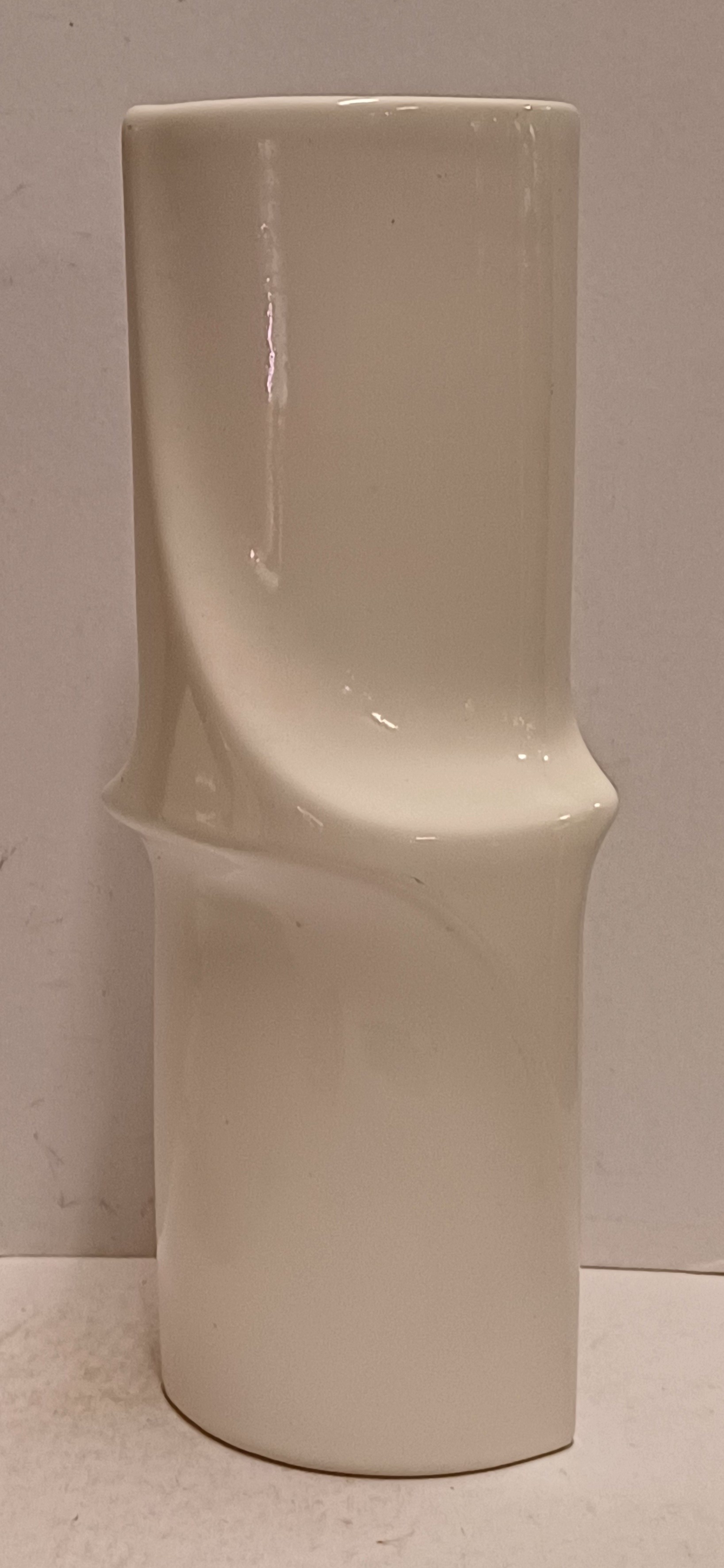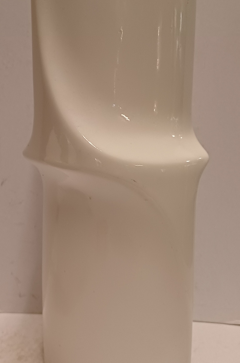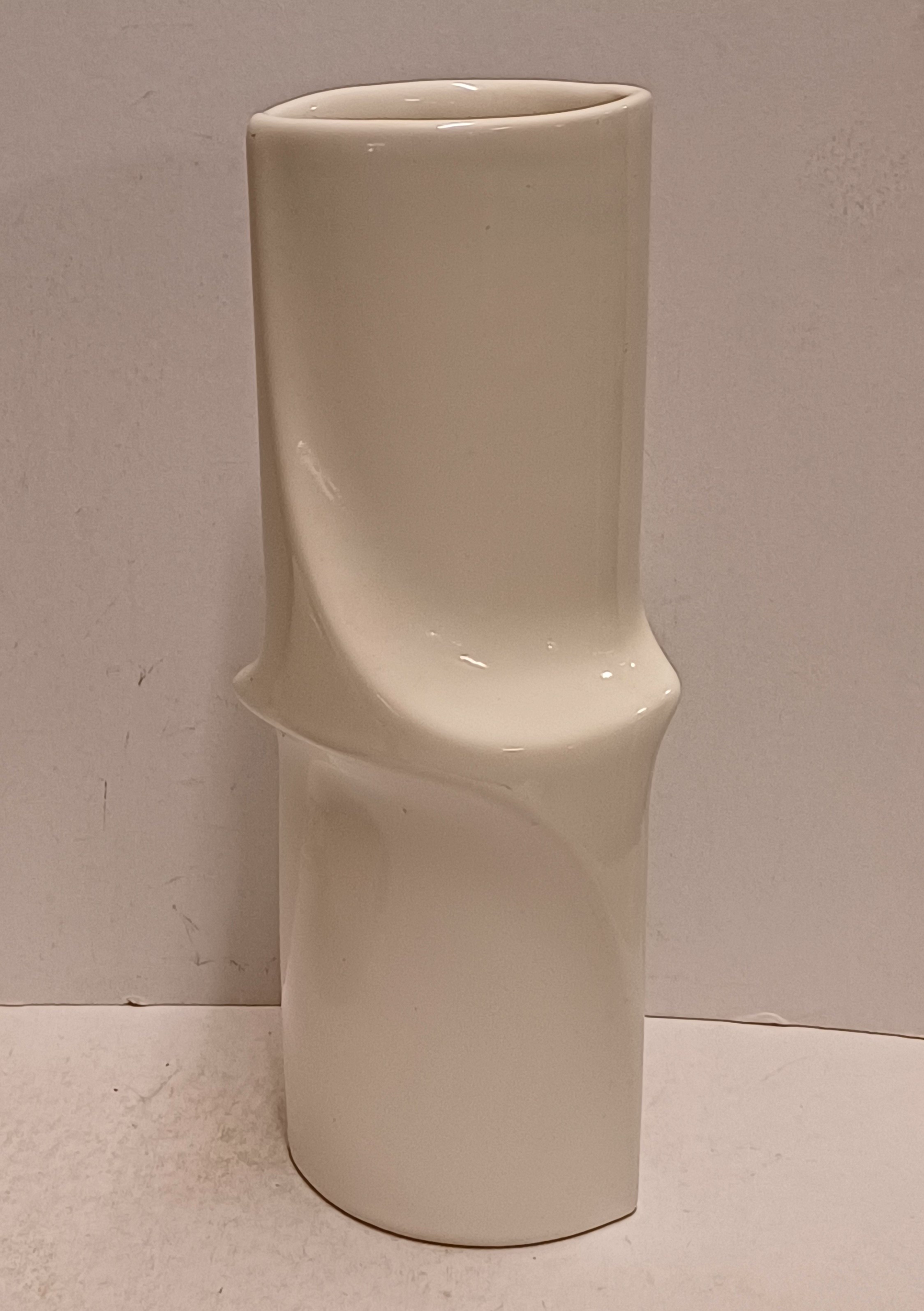 Earthenware vase with a twist in the middle, coated with white glaze. Bottom signed and dated '82.