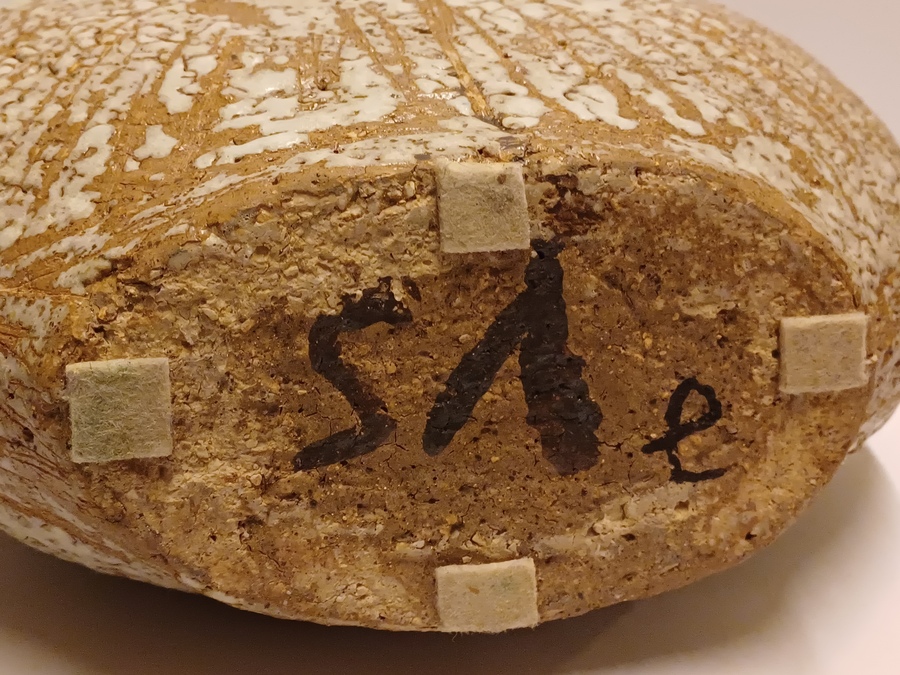 Aardewerken vaas met 3 tuiten en opening in de buik, met ruwe bruine grijze glazuur. Onderzijde met kunstenaars monogram.