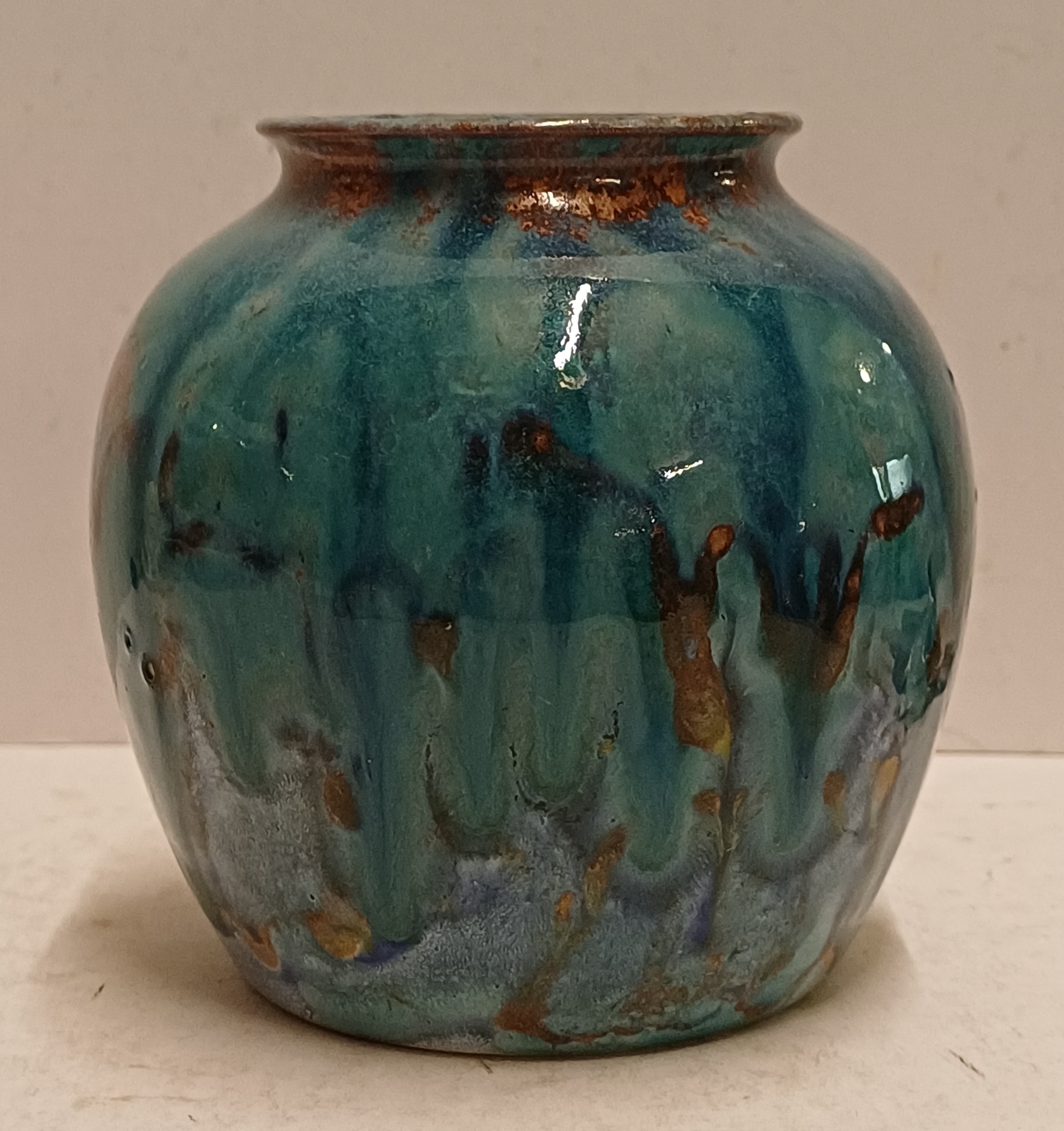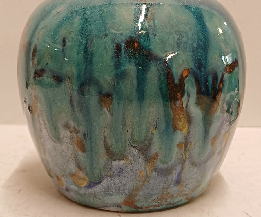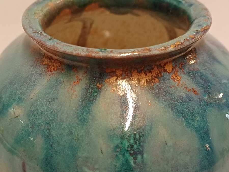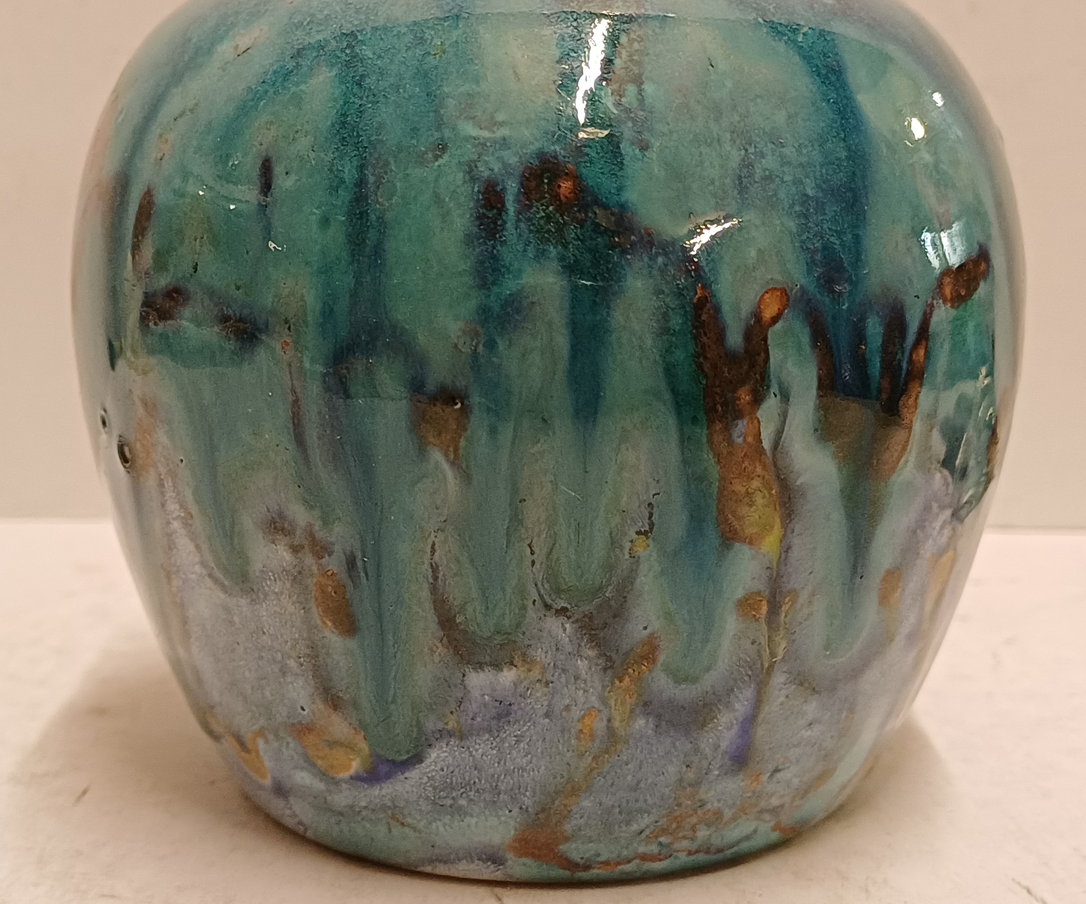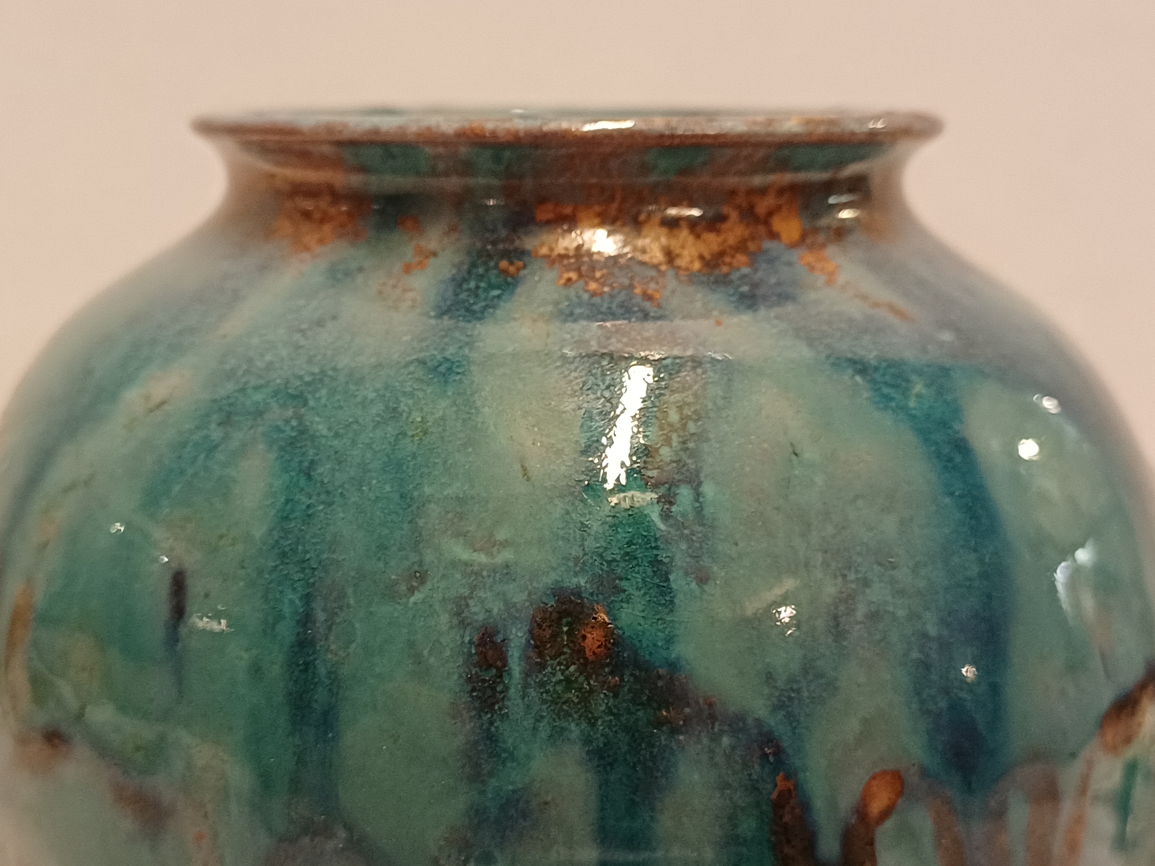 Dun gedraaide vaas met groen blauwe glazuur met rode en bruine accenten. Onderzijde gesigneerd met glazuur en werknummers.