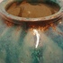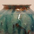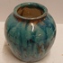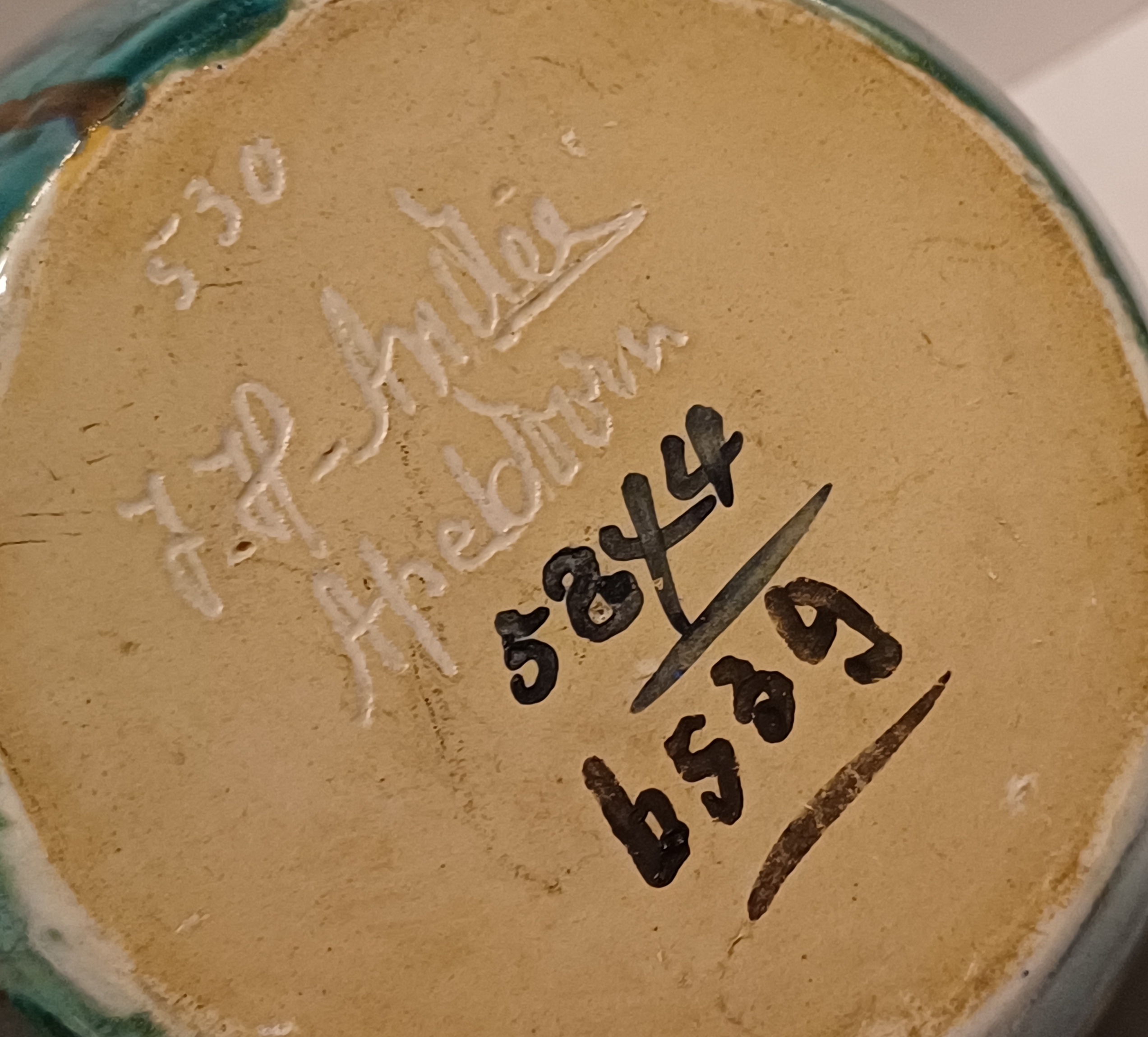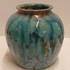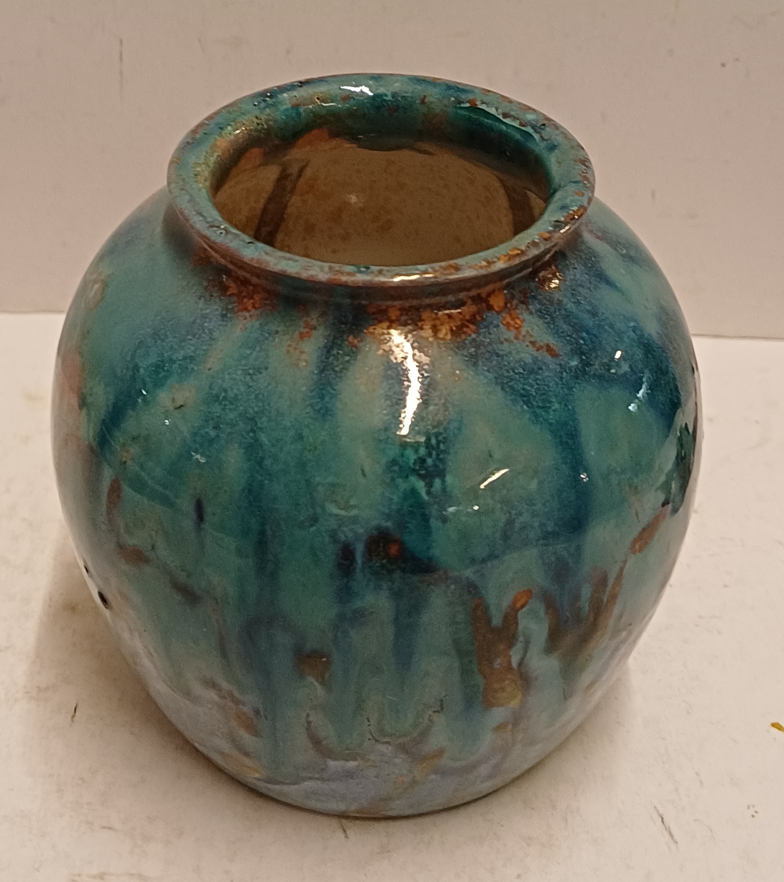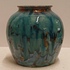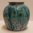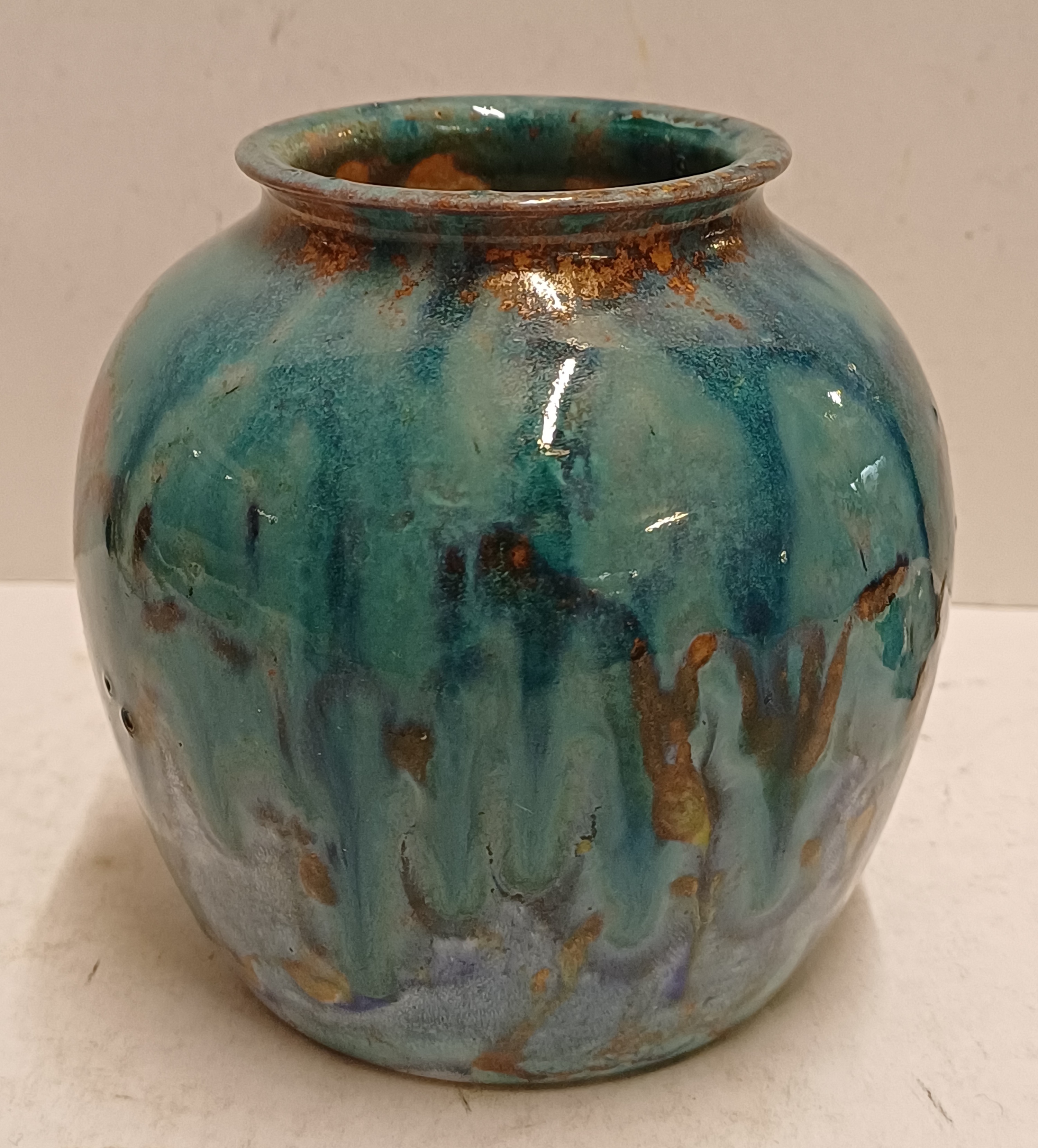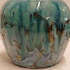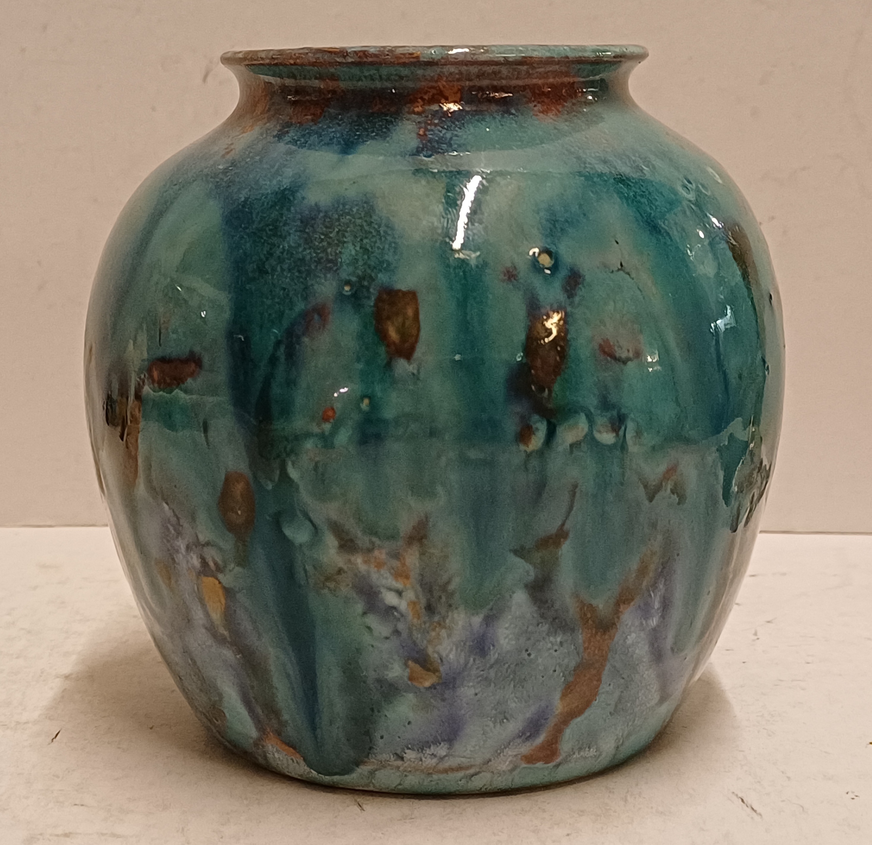 Dun gedraaide vaas met groen blauwe glazuur met rode en bruine accenten. Onderzijde gesigneerd met glazuur en werknummers.