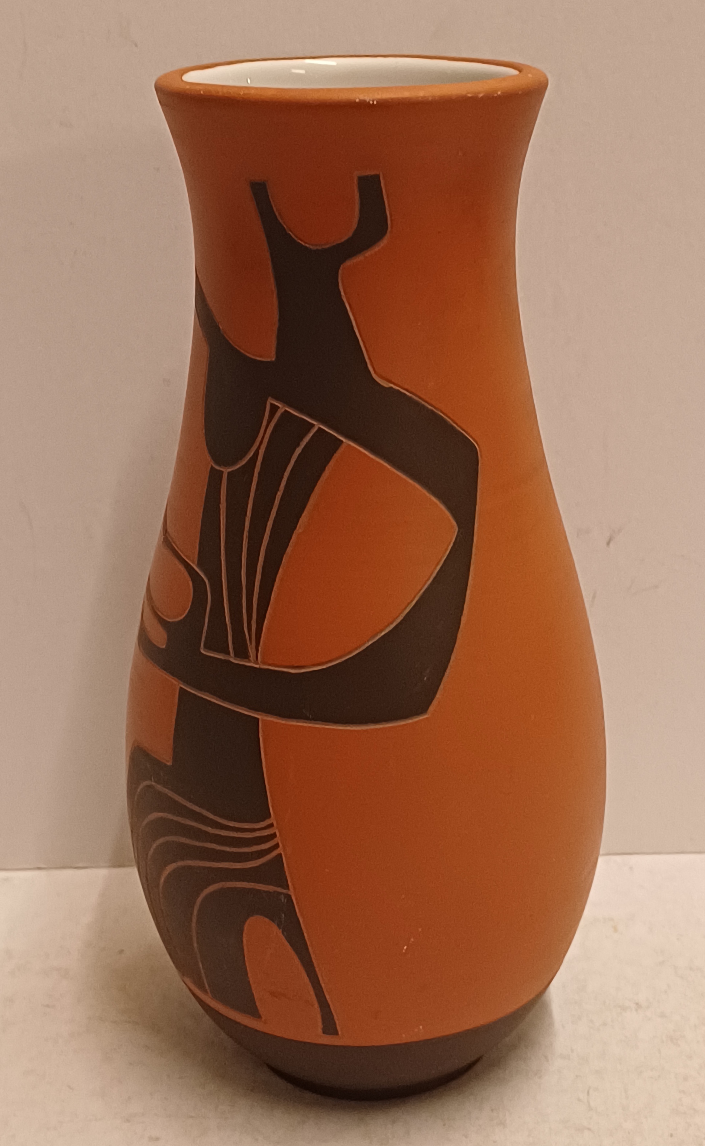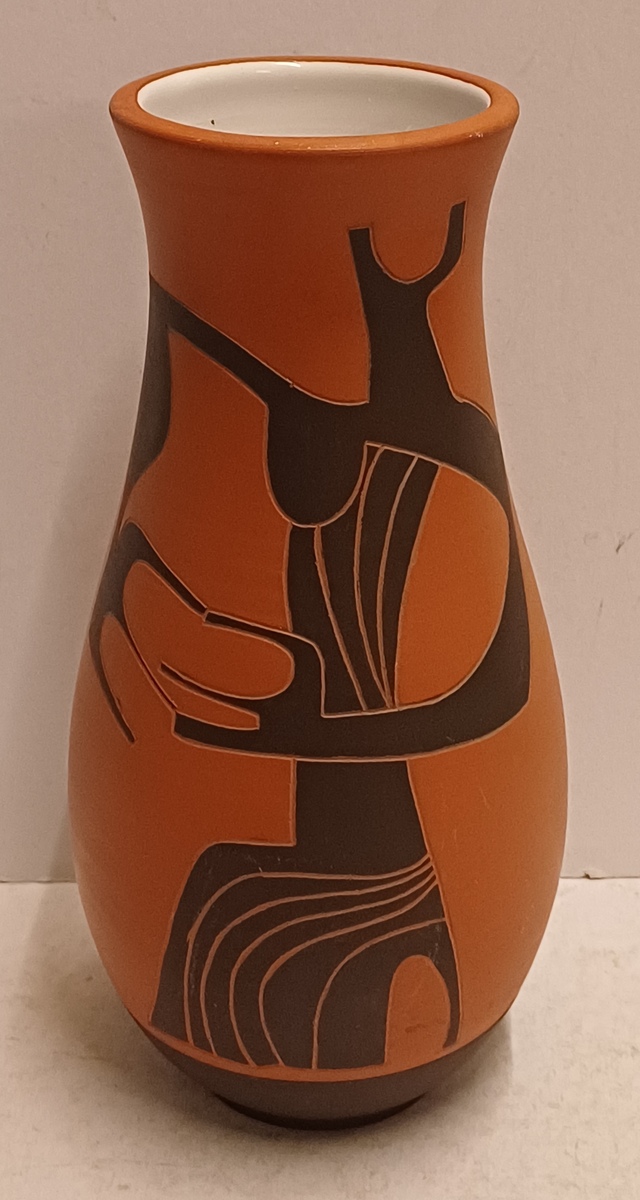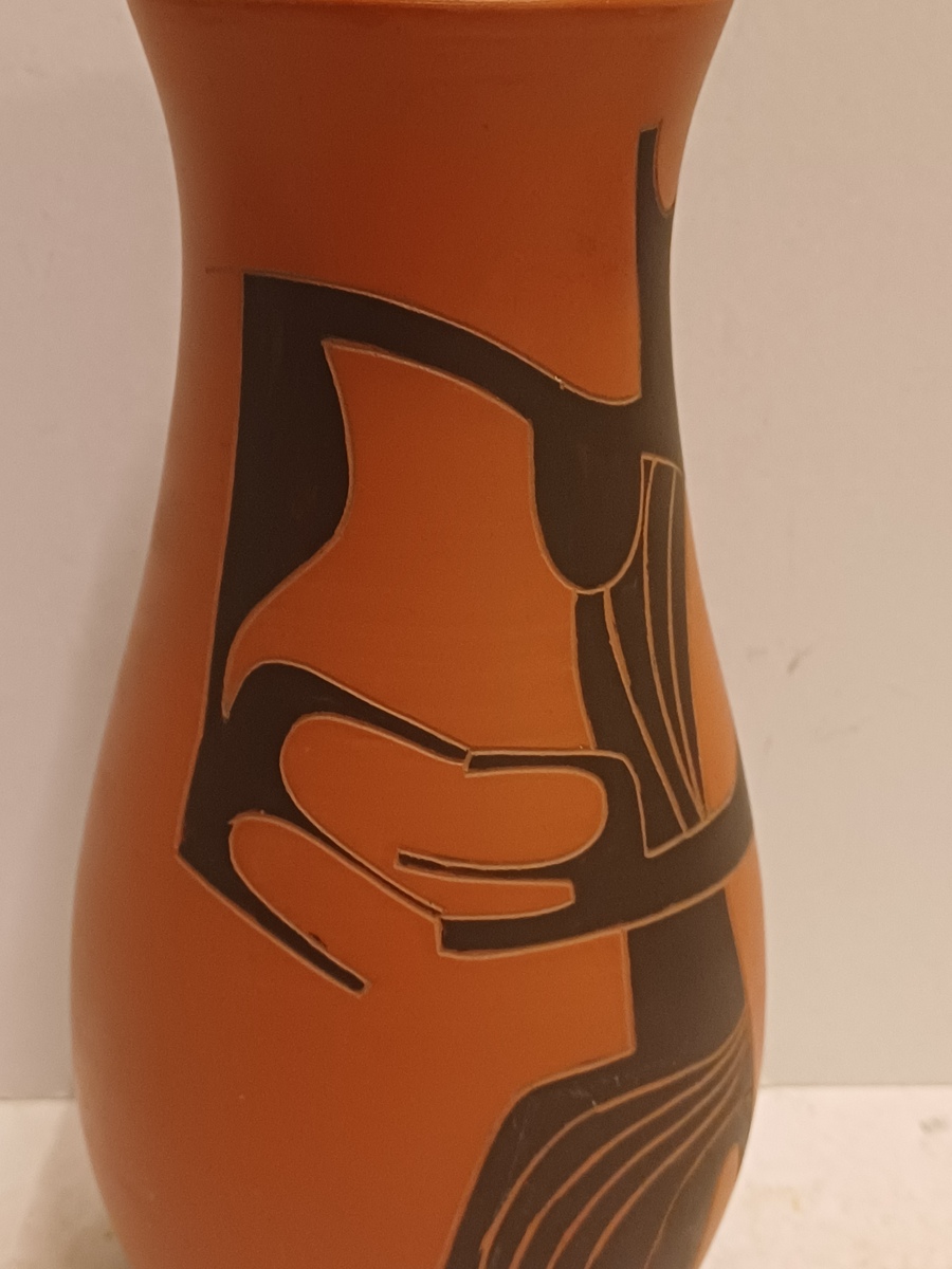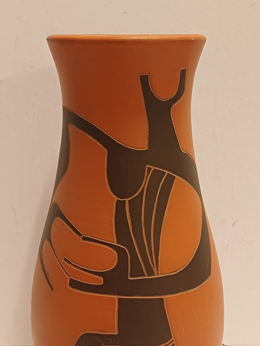 Terracotta vase with black engobe and scratched decoration of a stylized figure. Bottom marked and monogrammed by Joep Thisen.