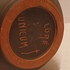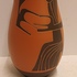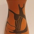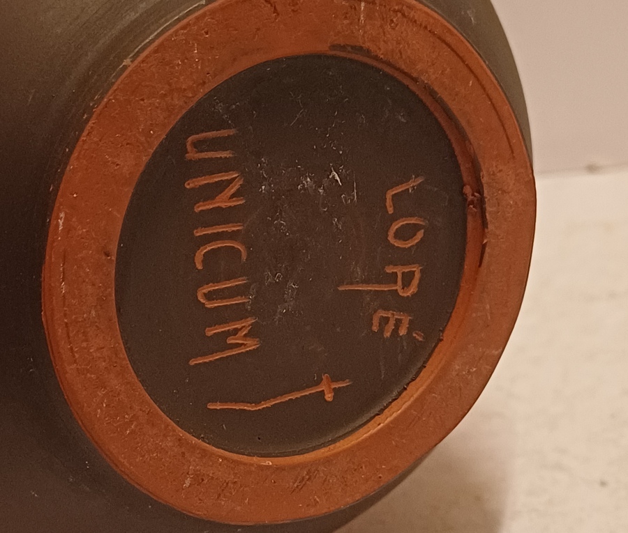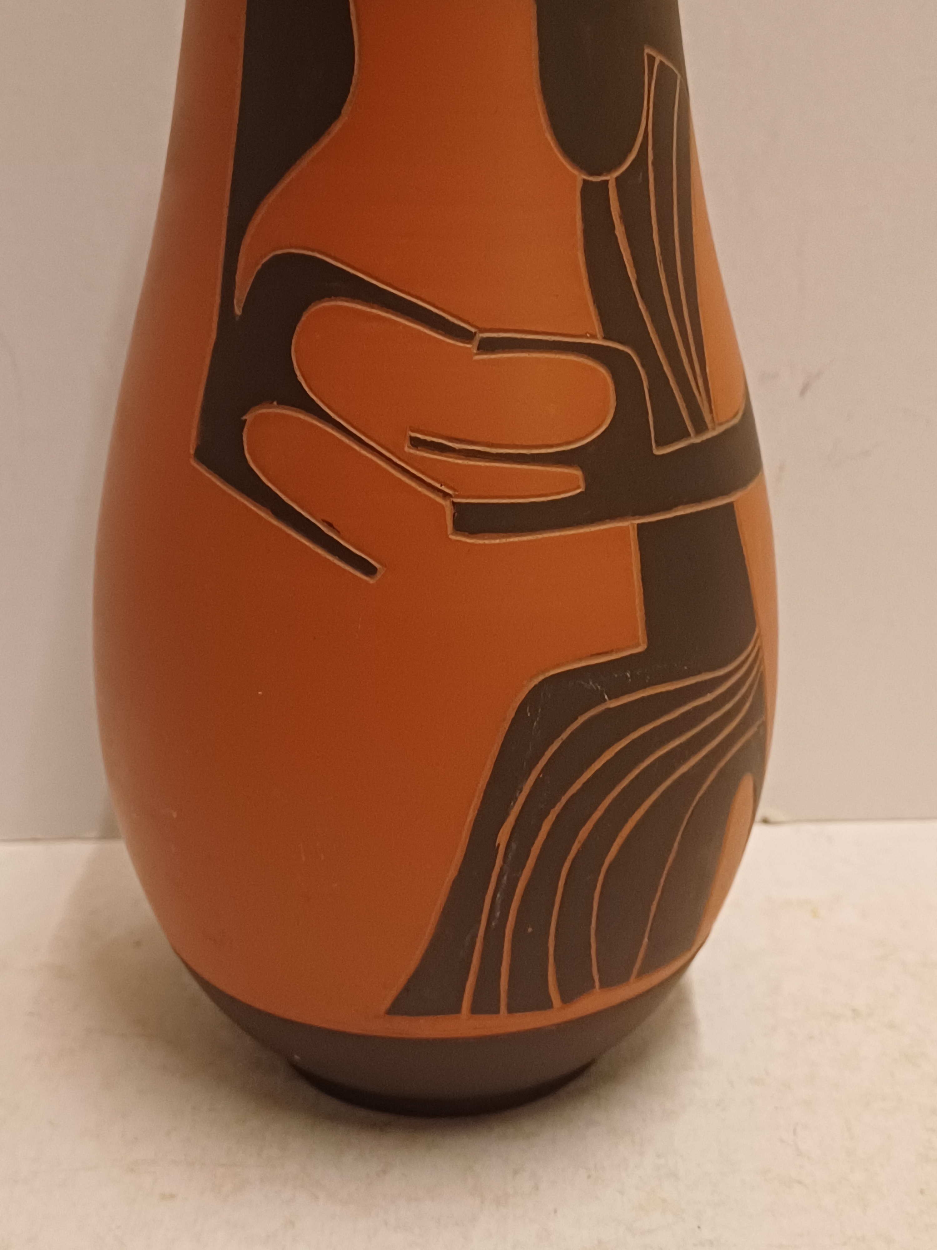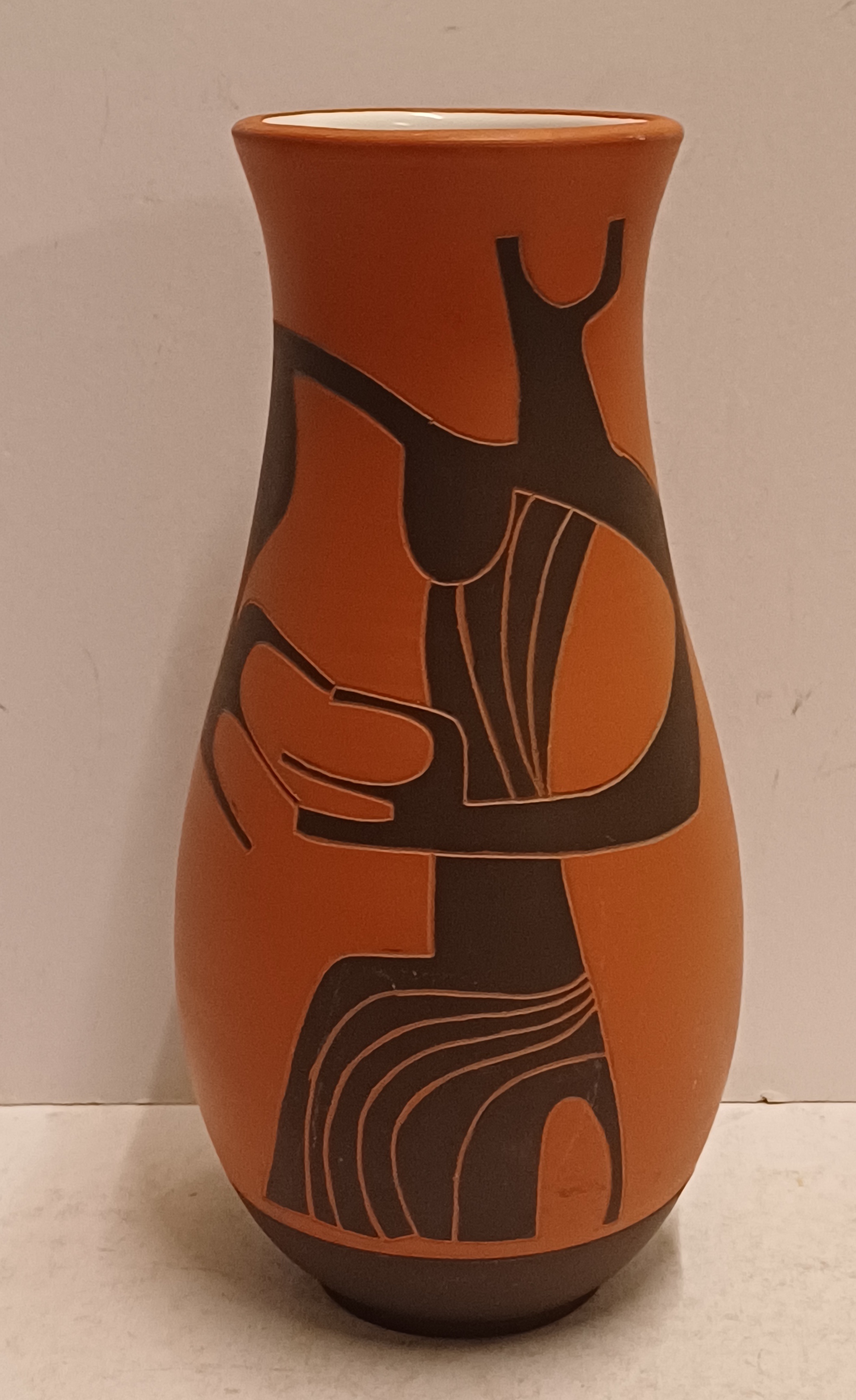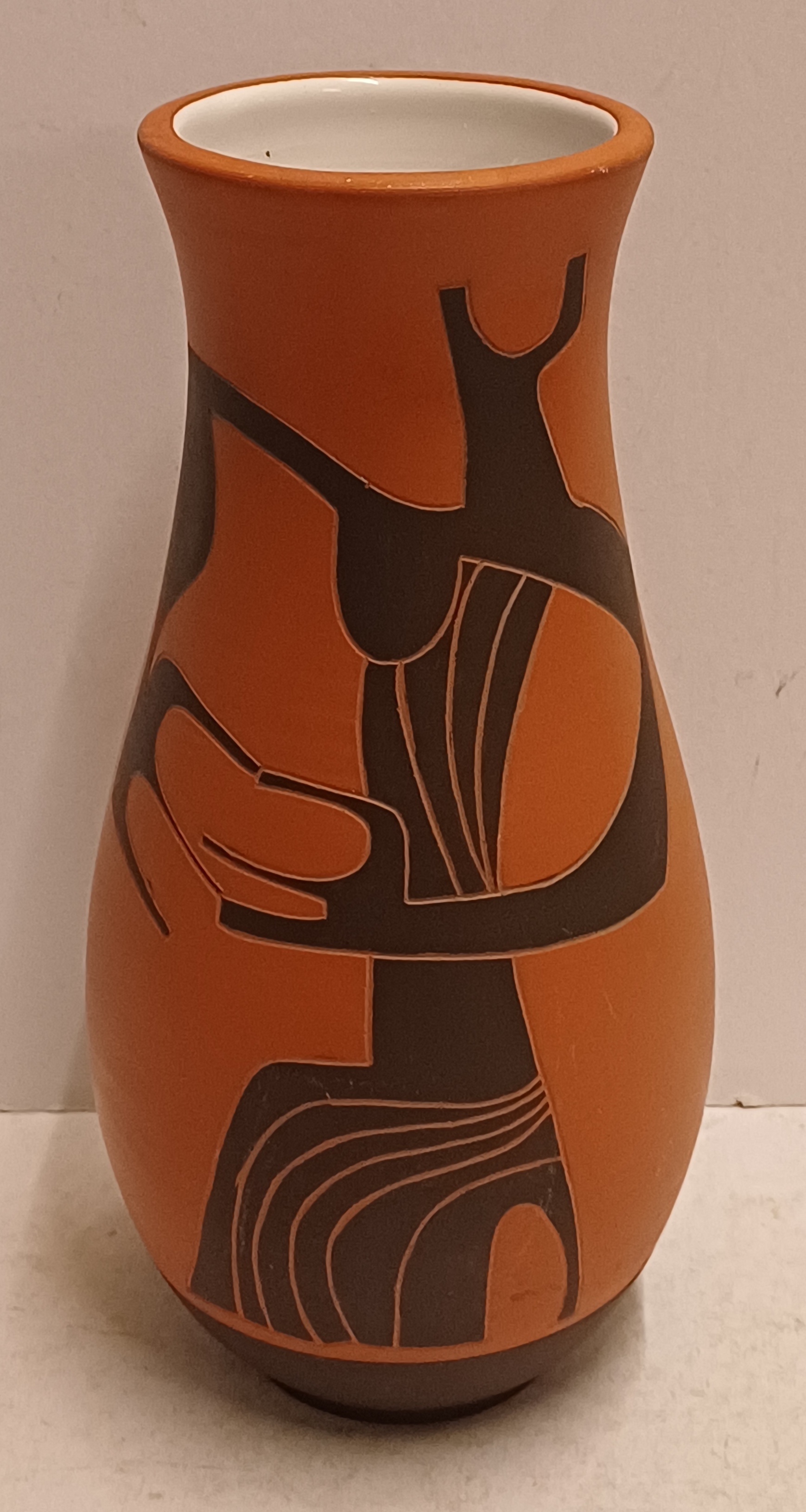 Terracotta vase with black engobe and scratched decoration of a stylized figure. Bottom marked and monogrammed by Joep Thisen.