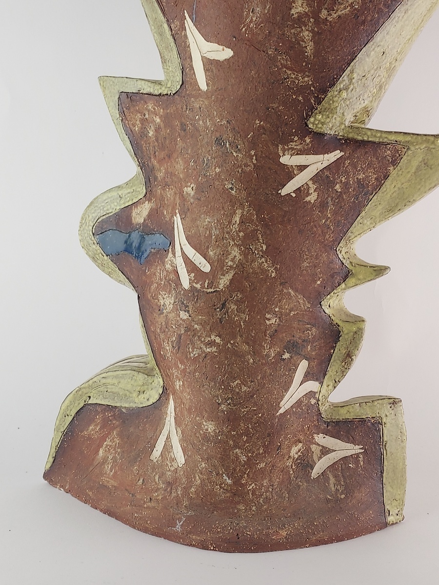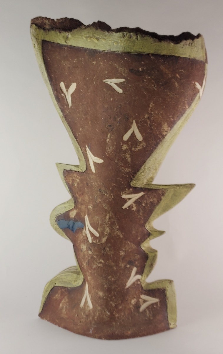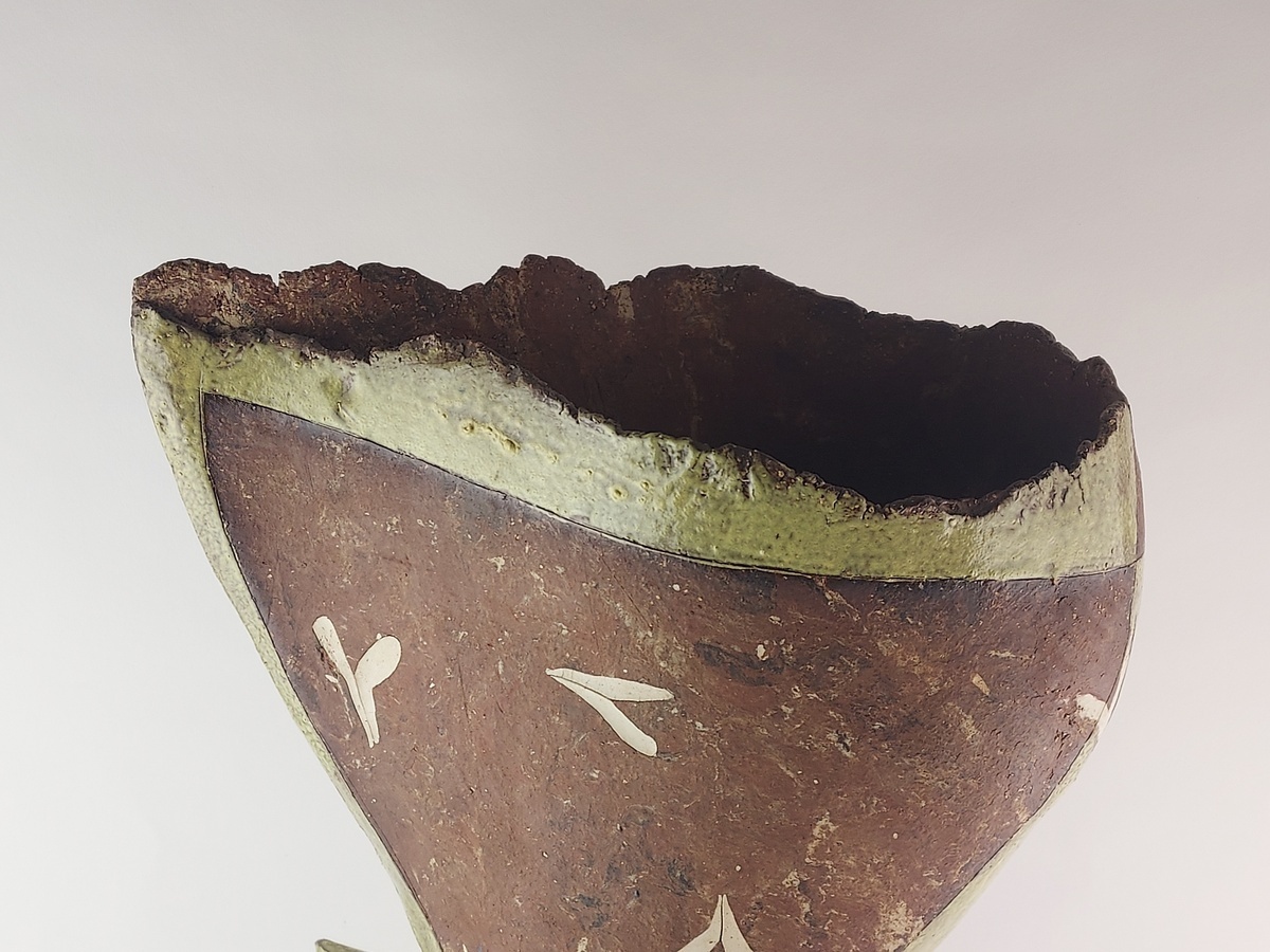 Large free-formed vase with partially glazed decorations. Not signed.