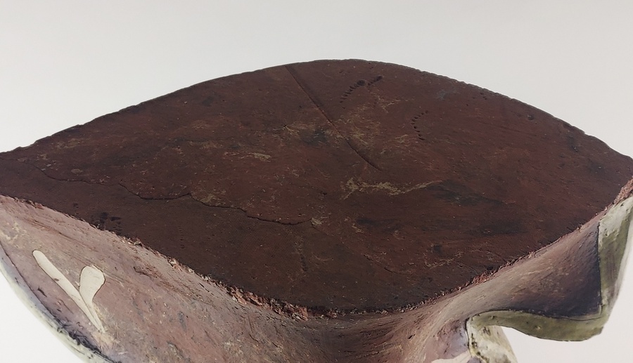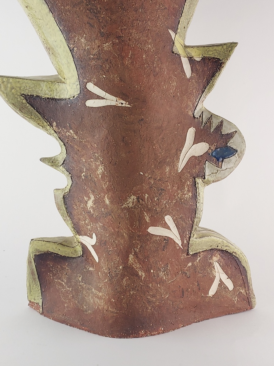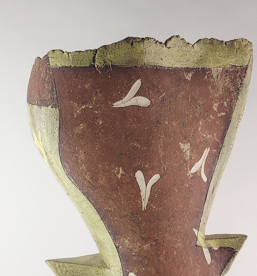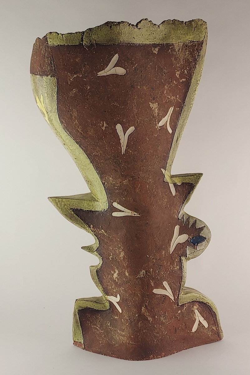 Large free-formed vase with partially glazed decorations. Not signed.