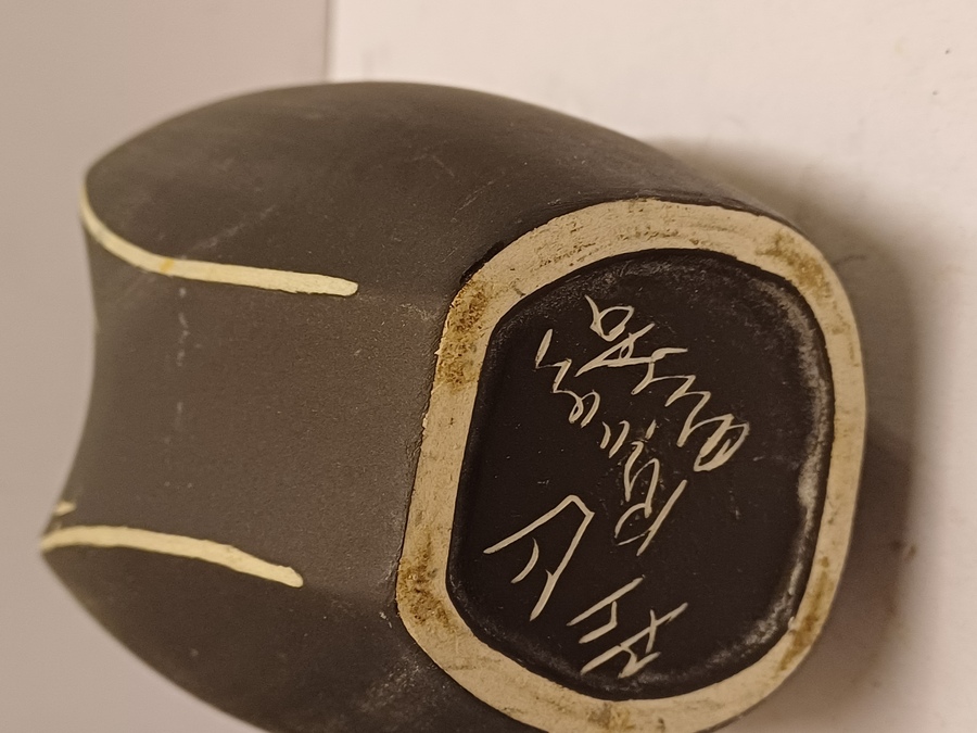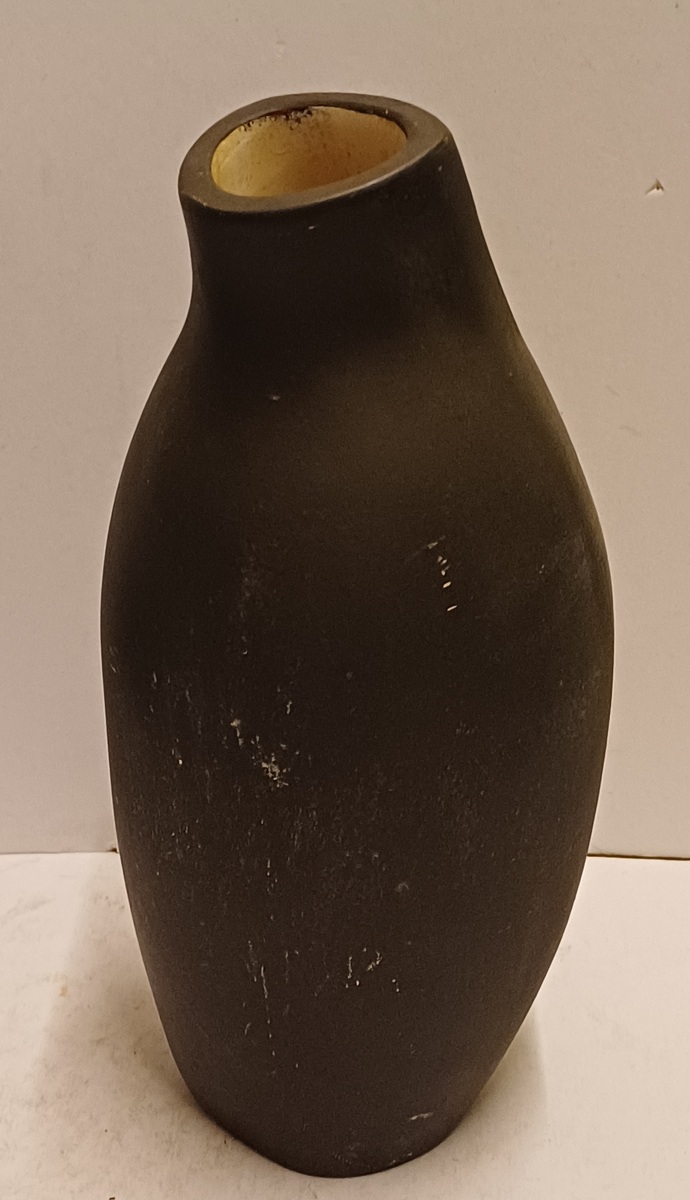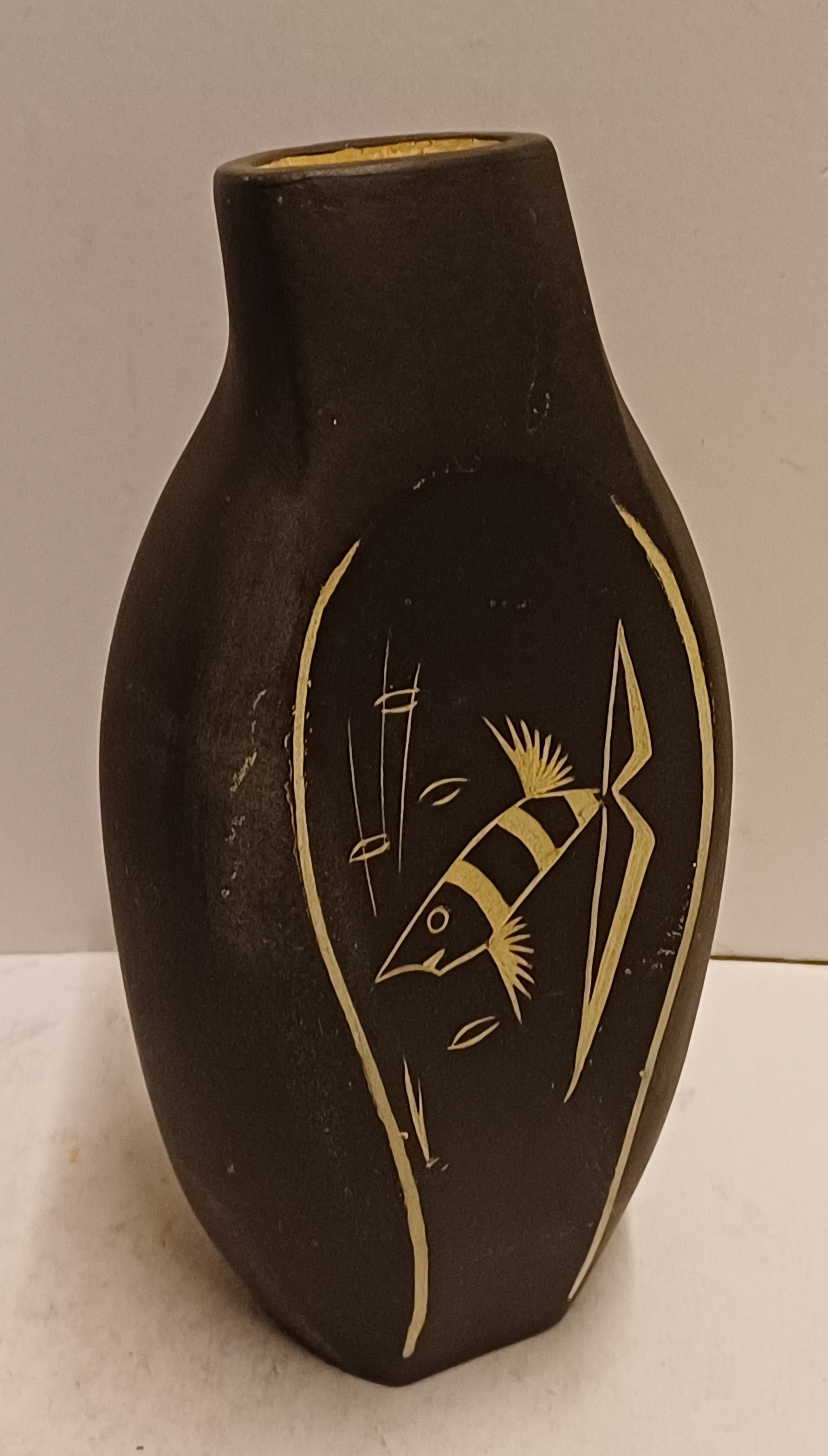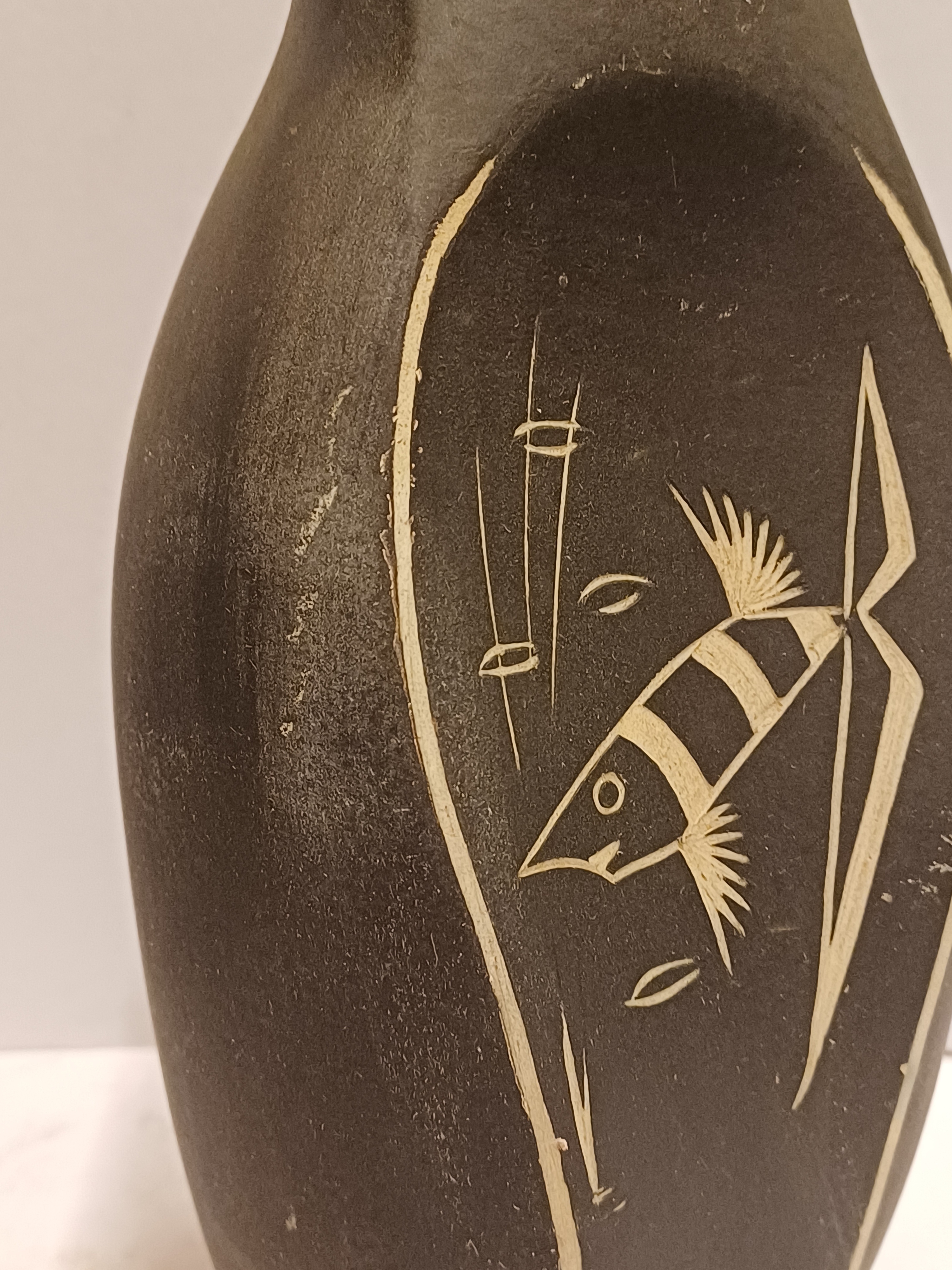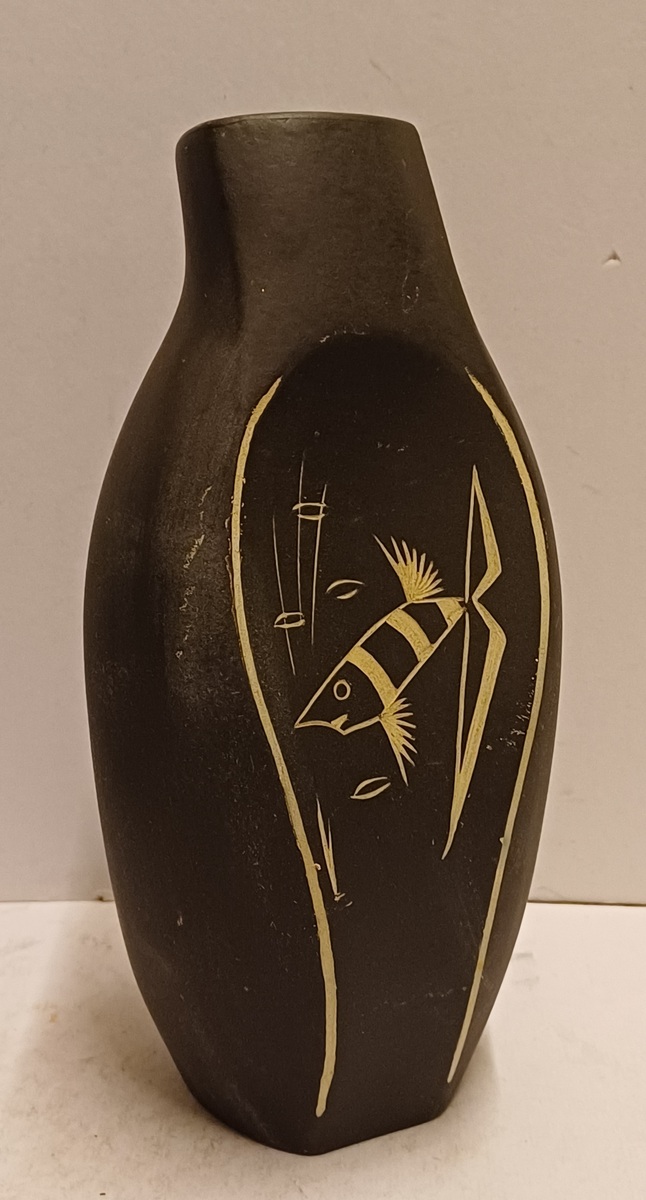 Freely shaped vase with an incised decoration of a fish on a black background. Base marked Kroon Aristo and numbered.