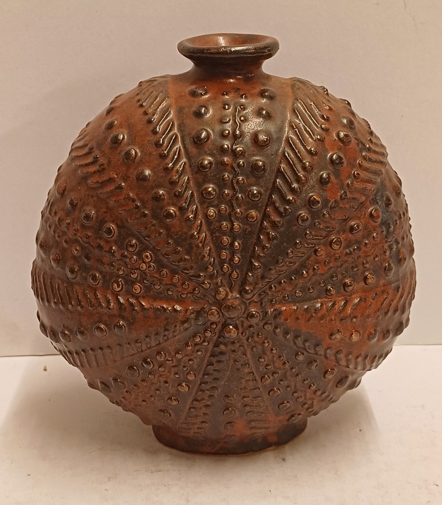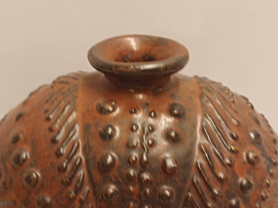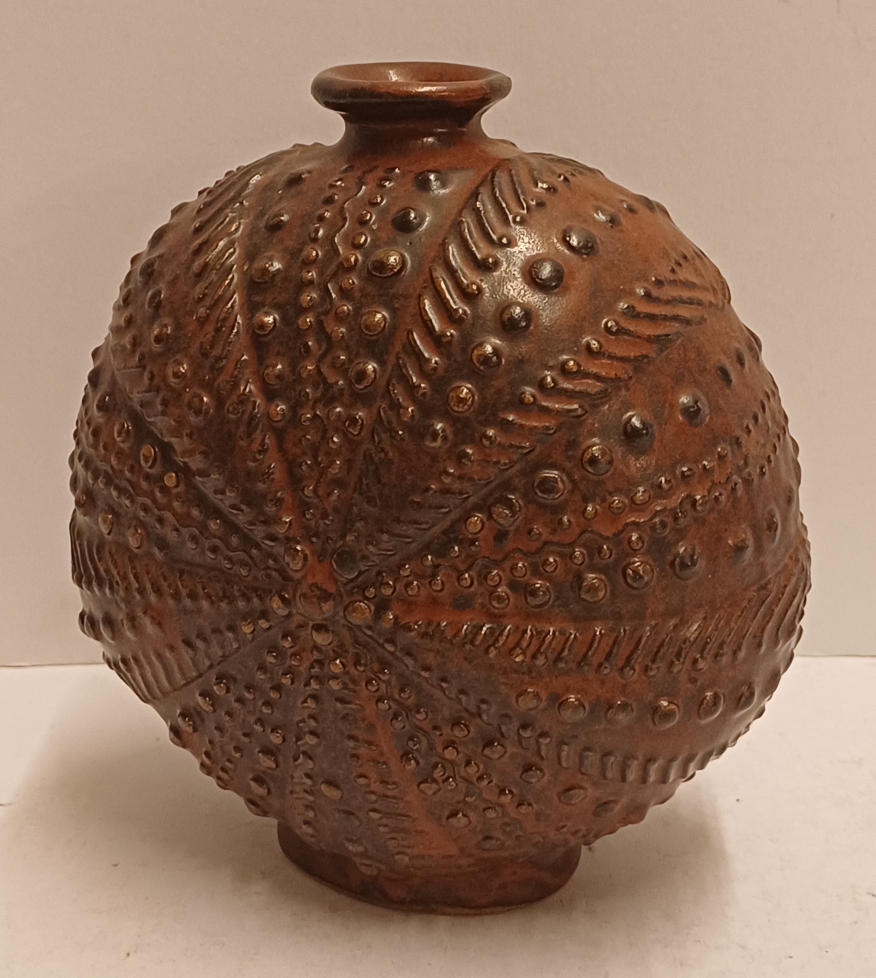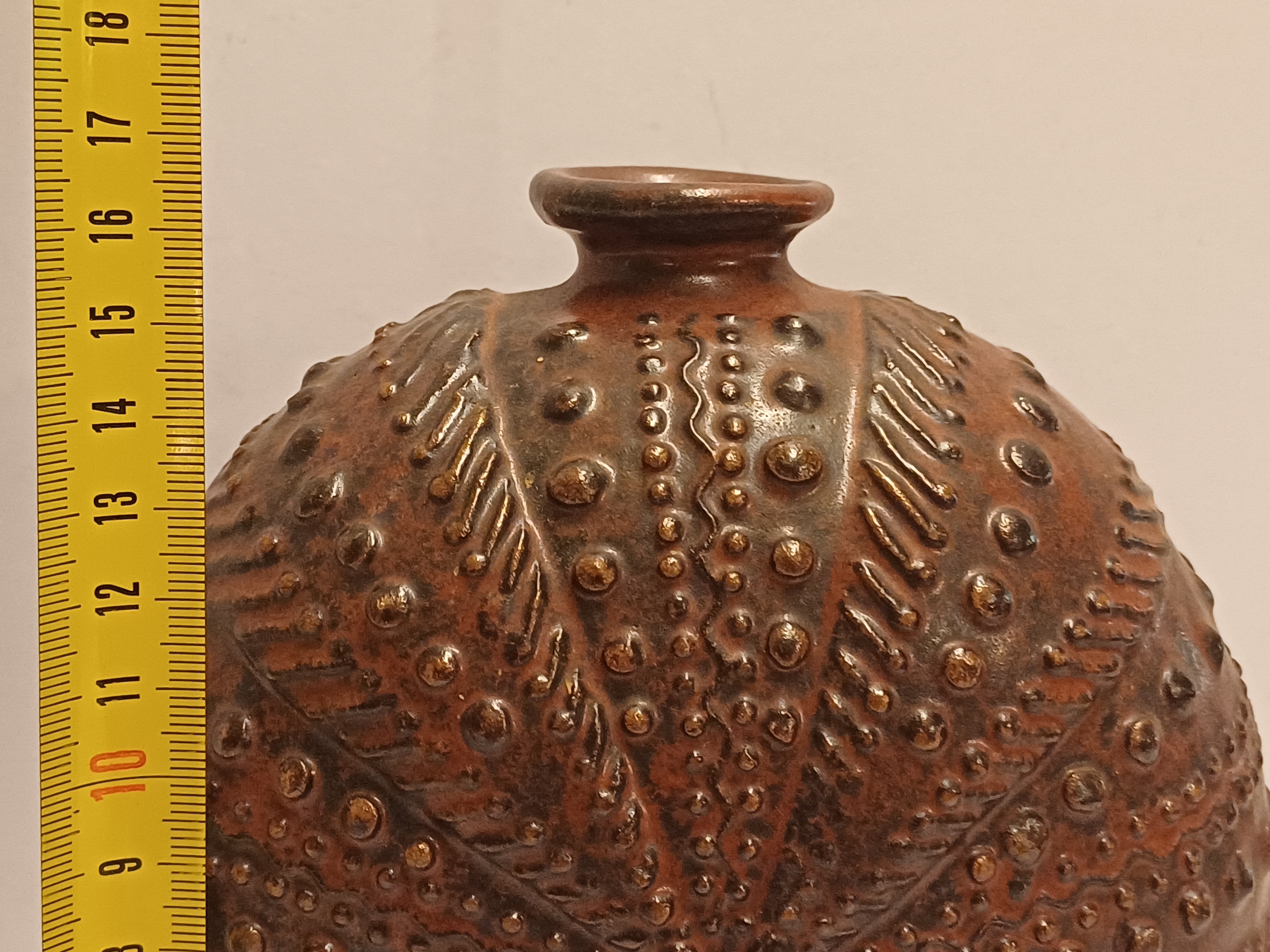 Vase with relief decorations covered with a rust-brown glaze. Bottom with LTK monogram and dated 1979.