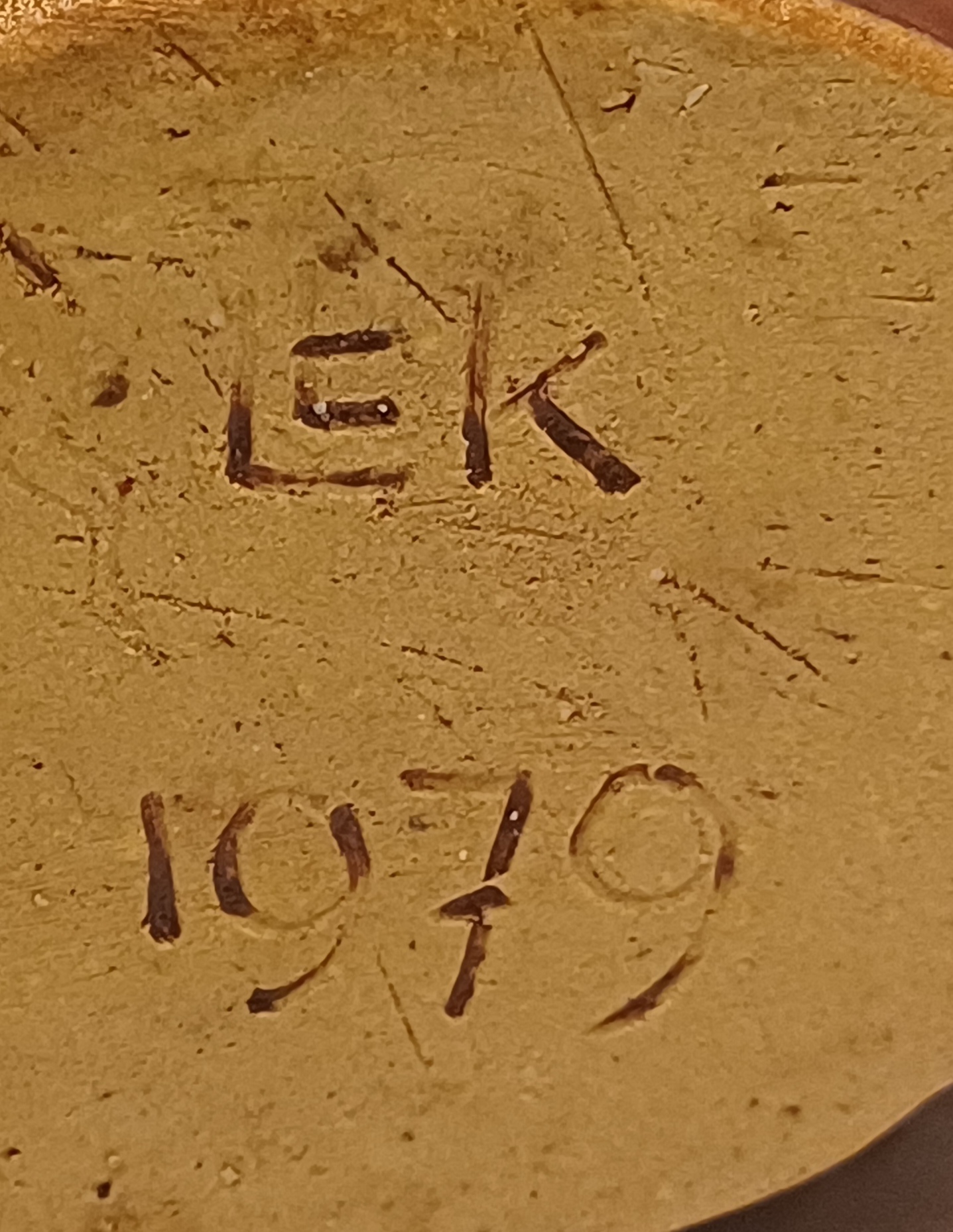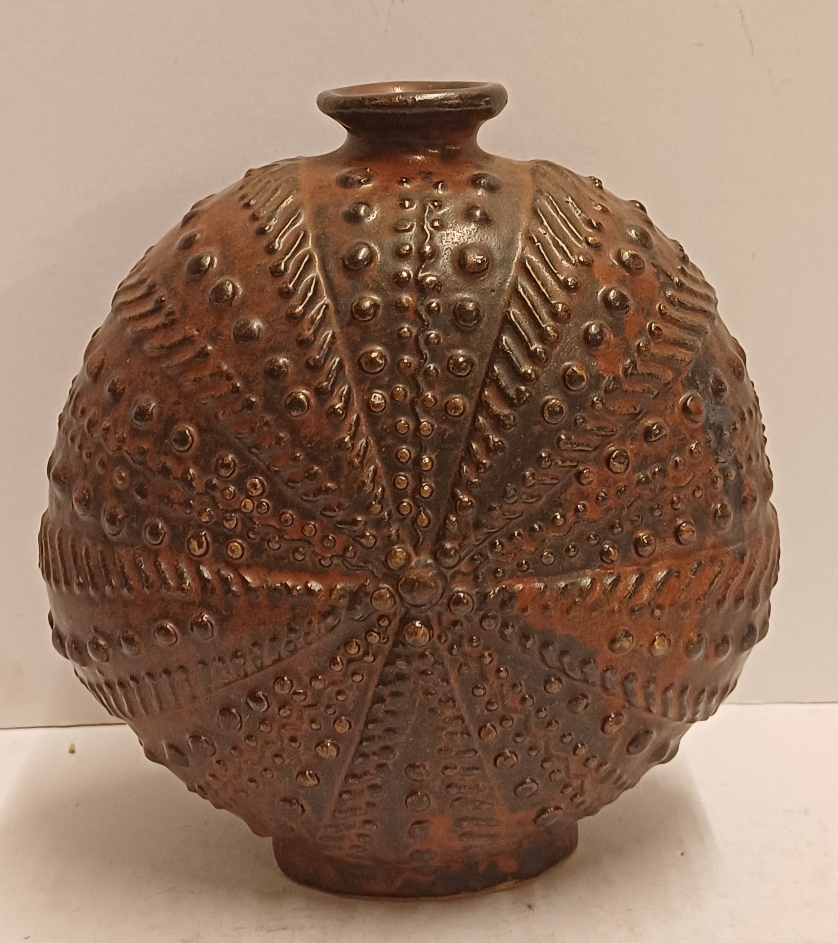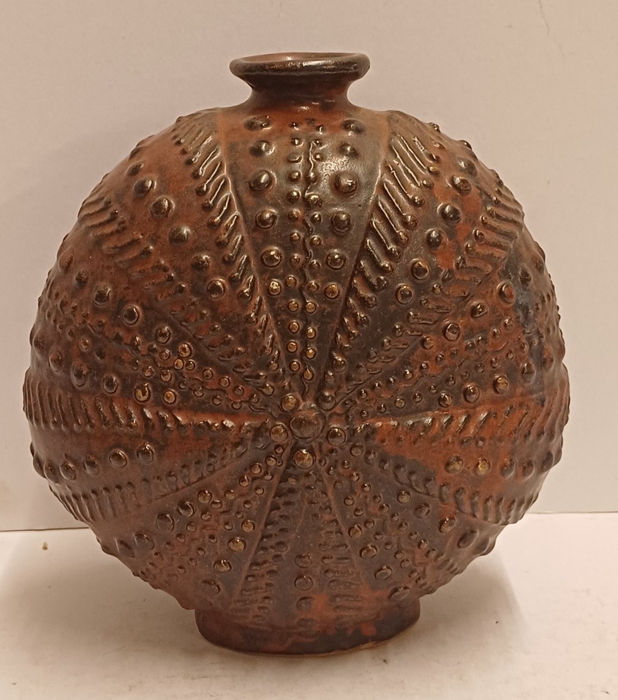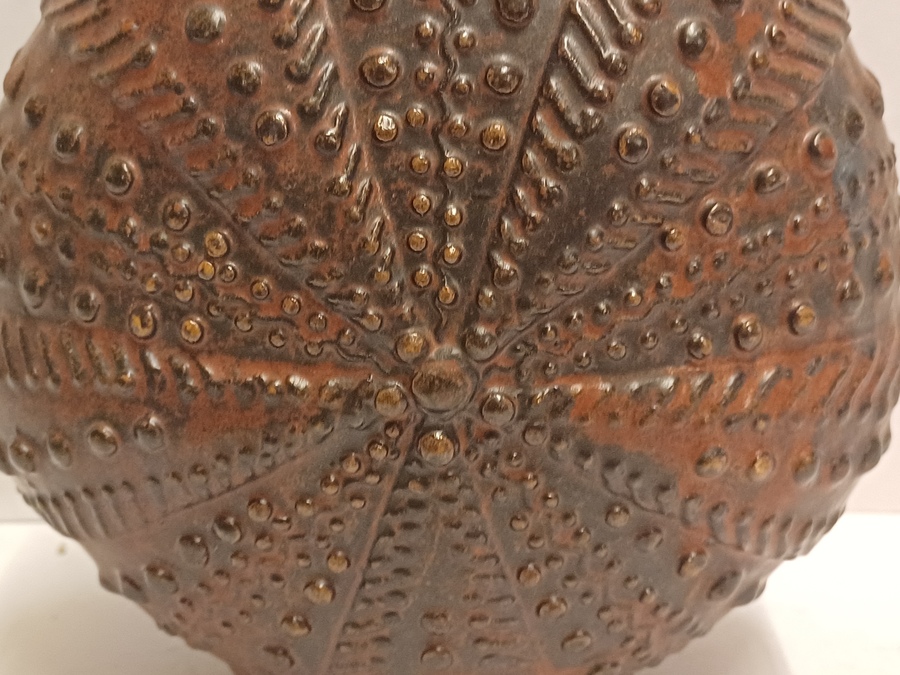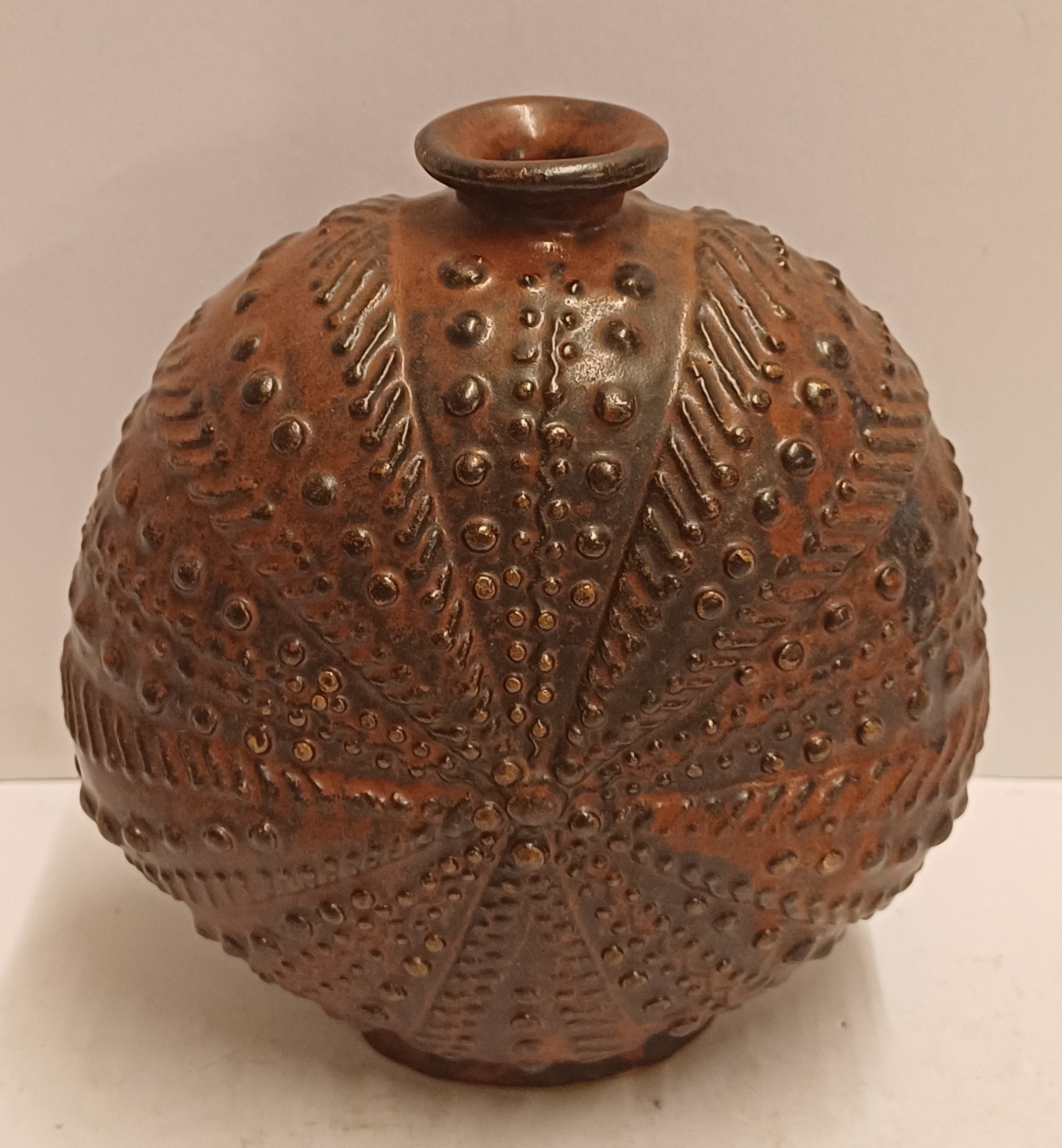 Vase with relief decorations covered with a rust-brown glaze. Bottom with LTK monogram and dated 1979.