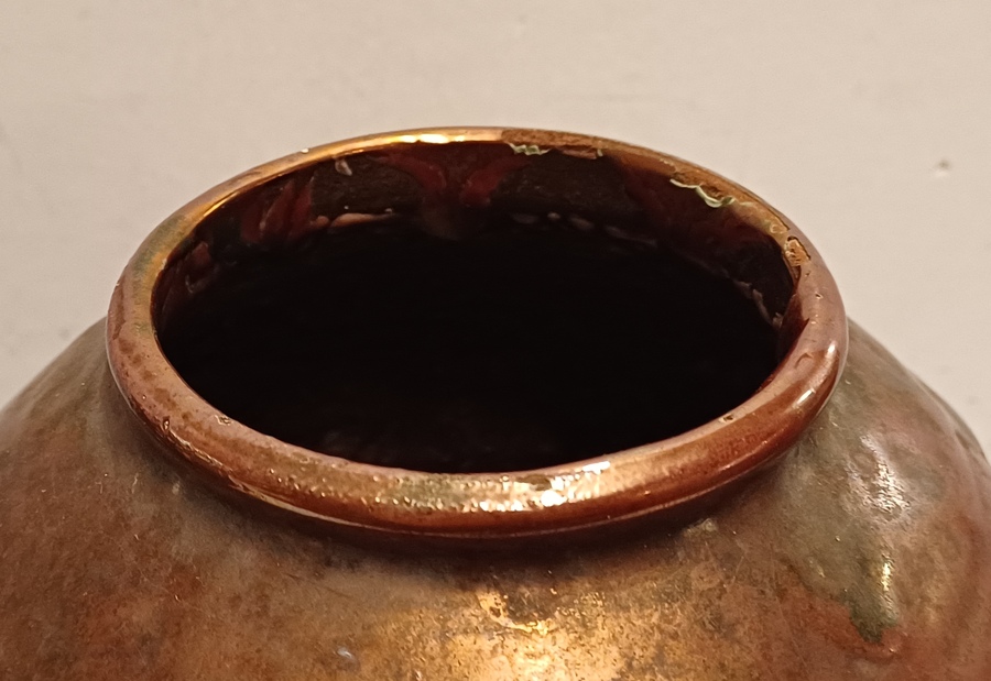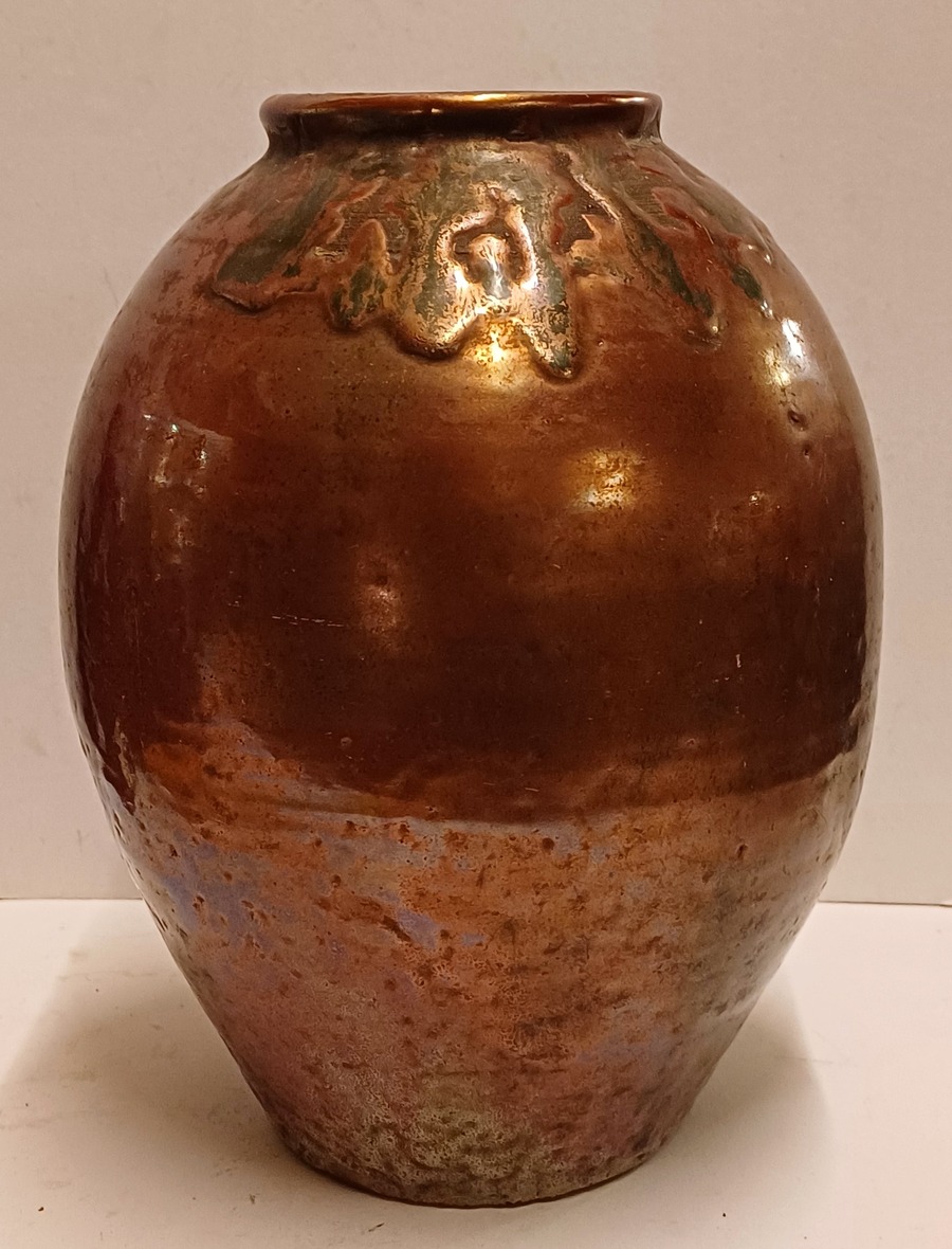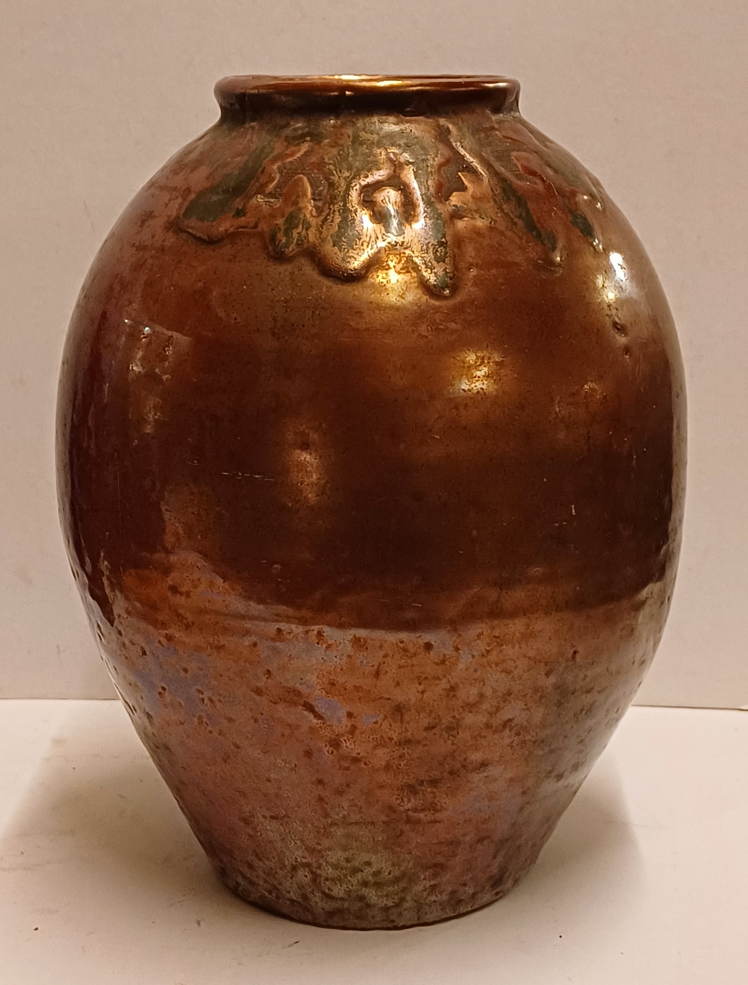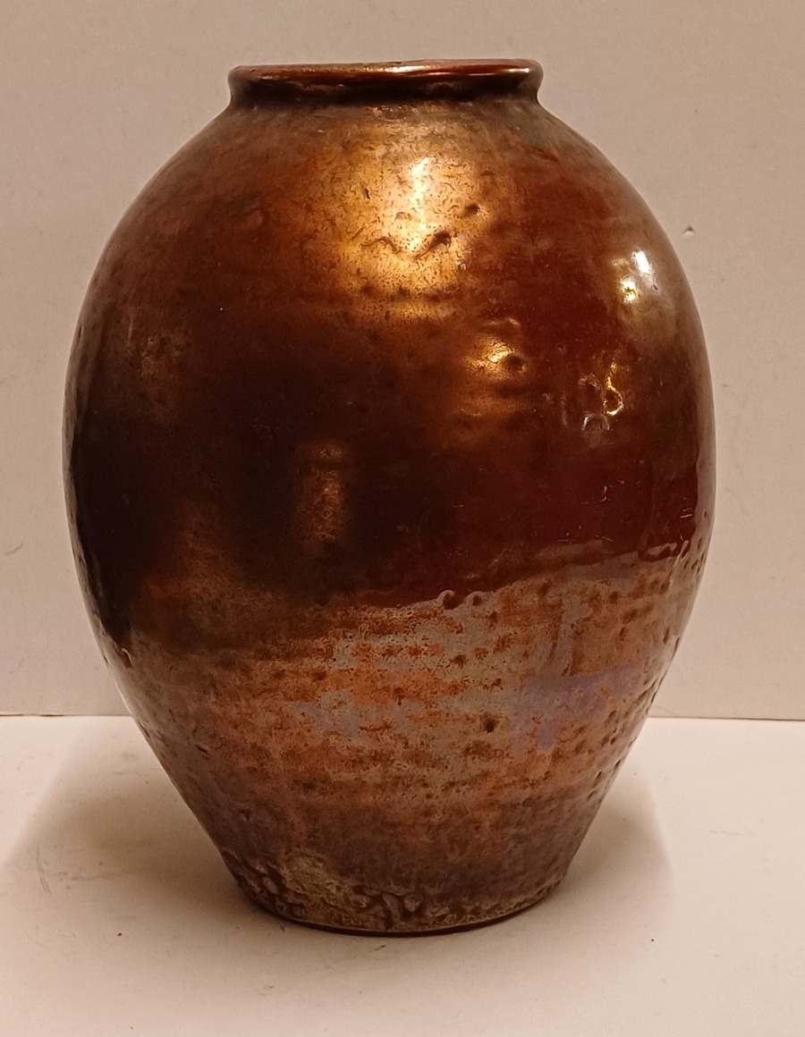 Grote vaas met rode metallic glazuur. Onderzijde met ingekrast merk.