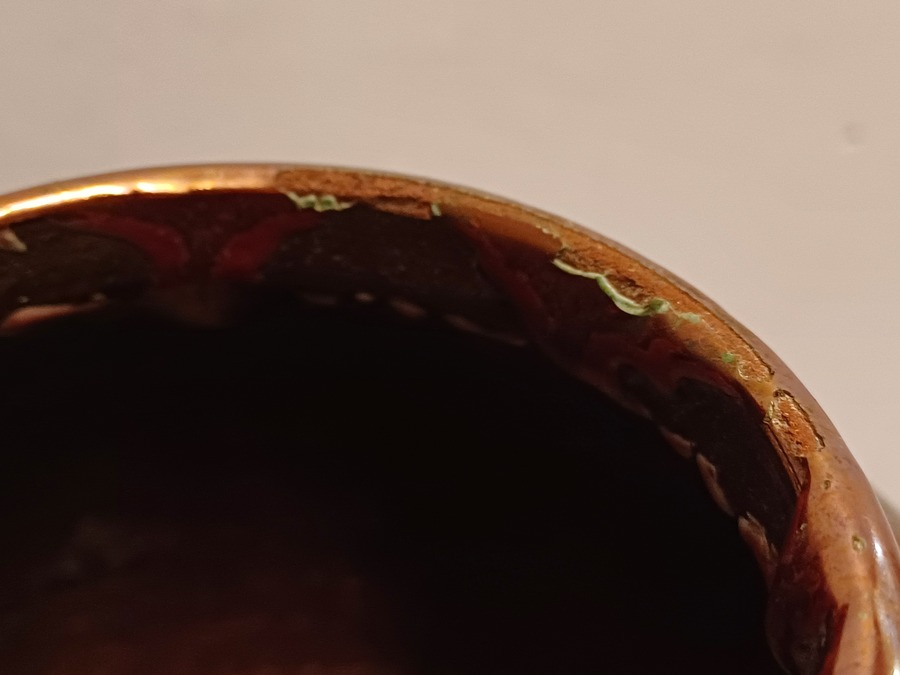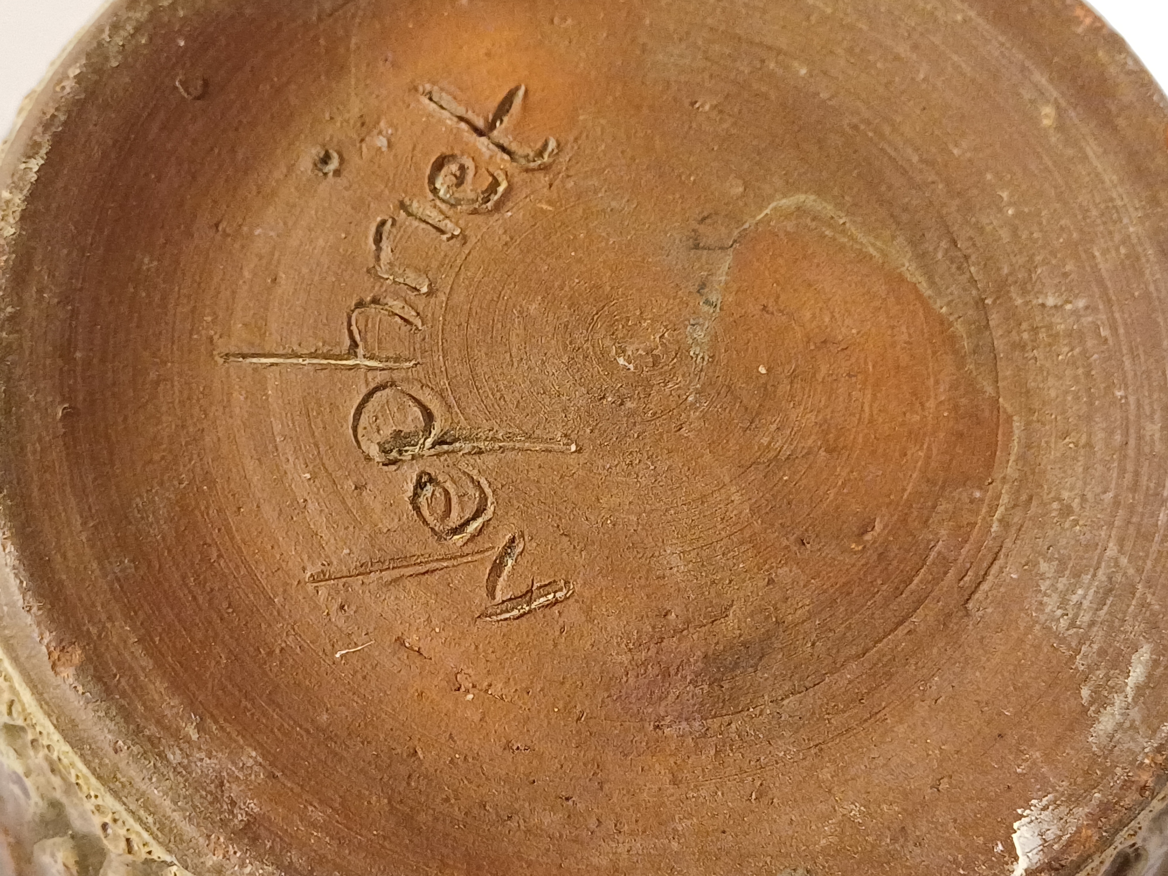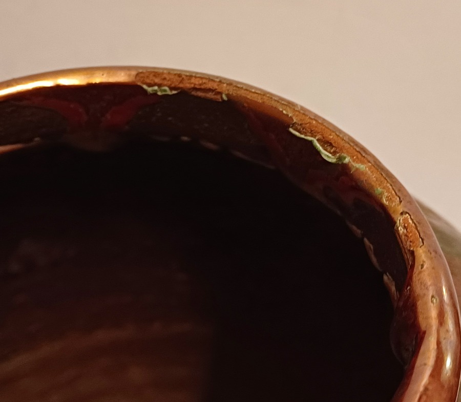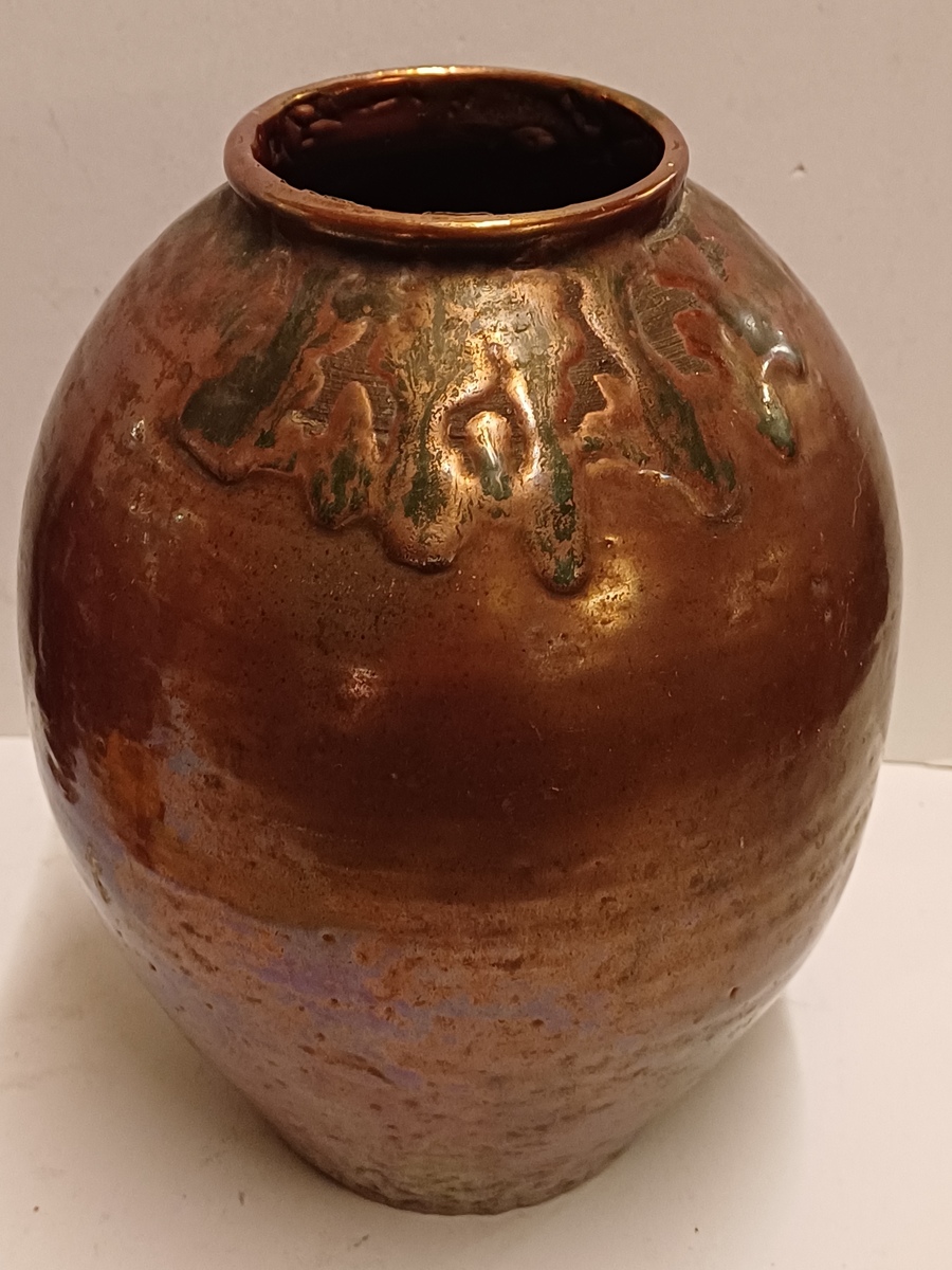 Grote vaas met rode metallic glazuur. Onderzijde met ingekrast merk.