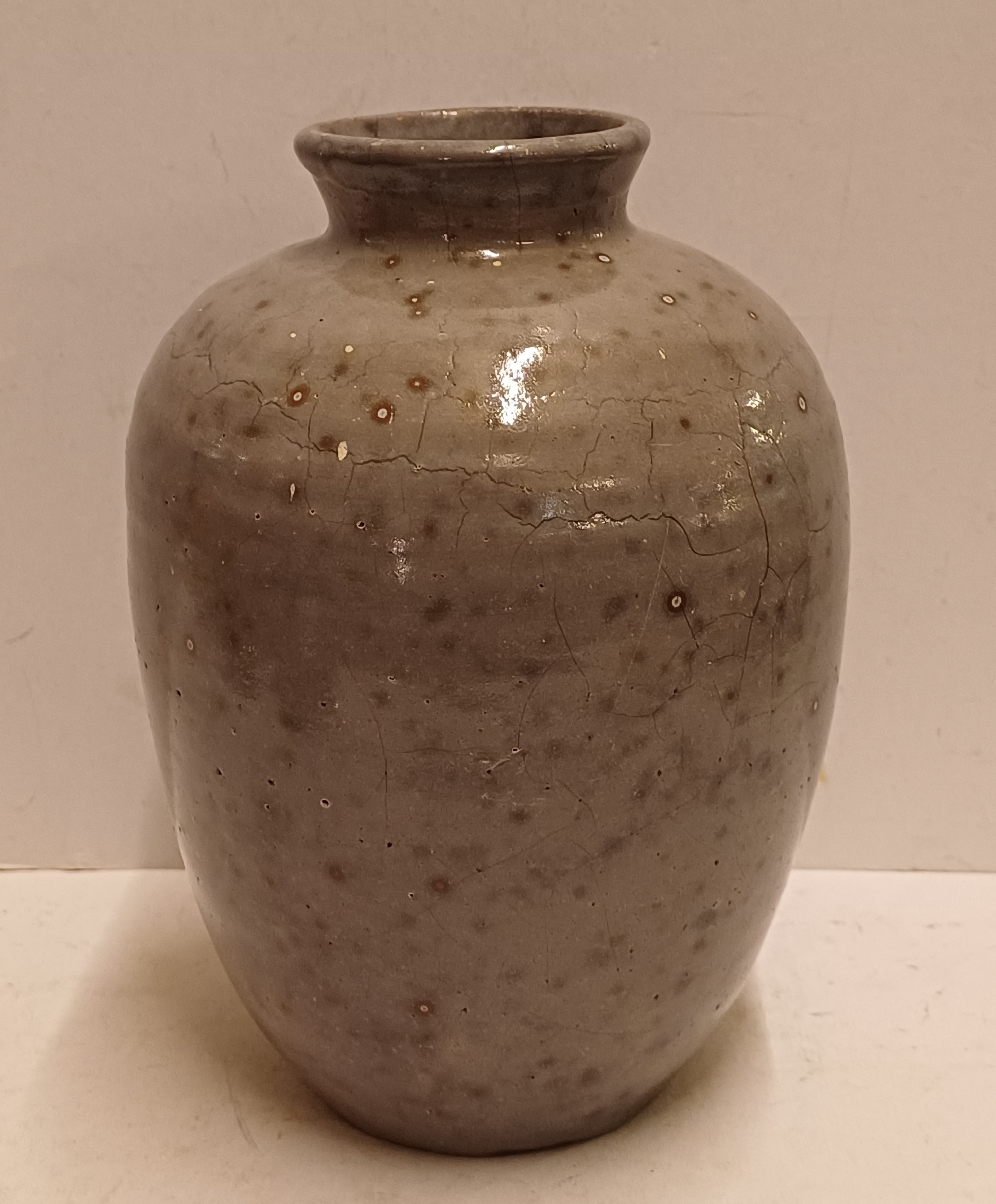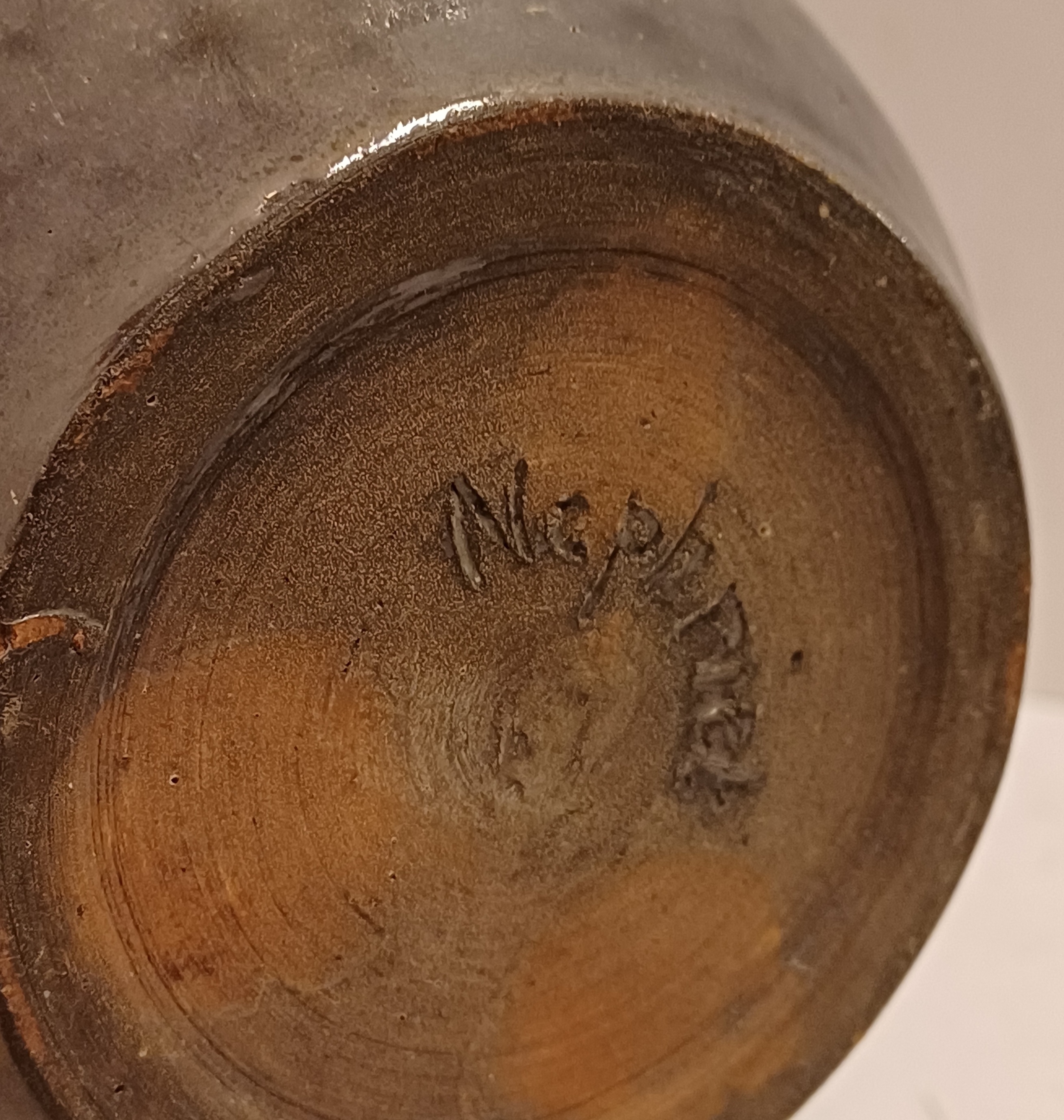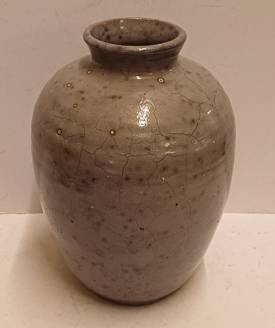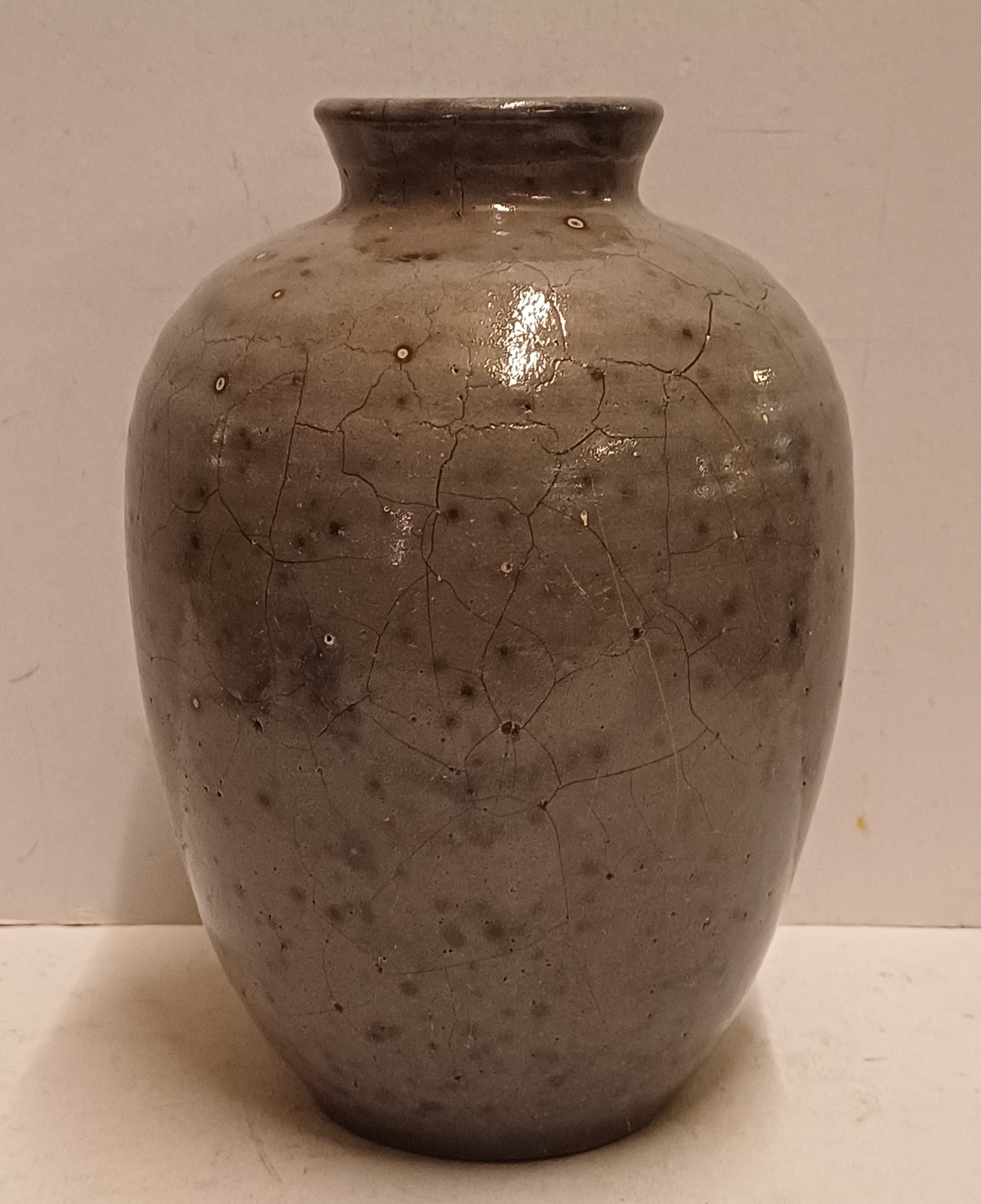 Aardewerken vaas met grijze gereduceerde glazuur. Onderzijde hand gesigneerd.