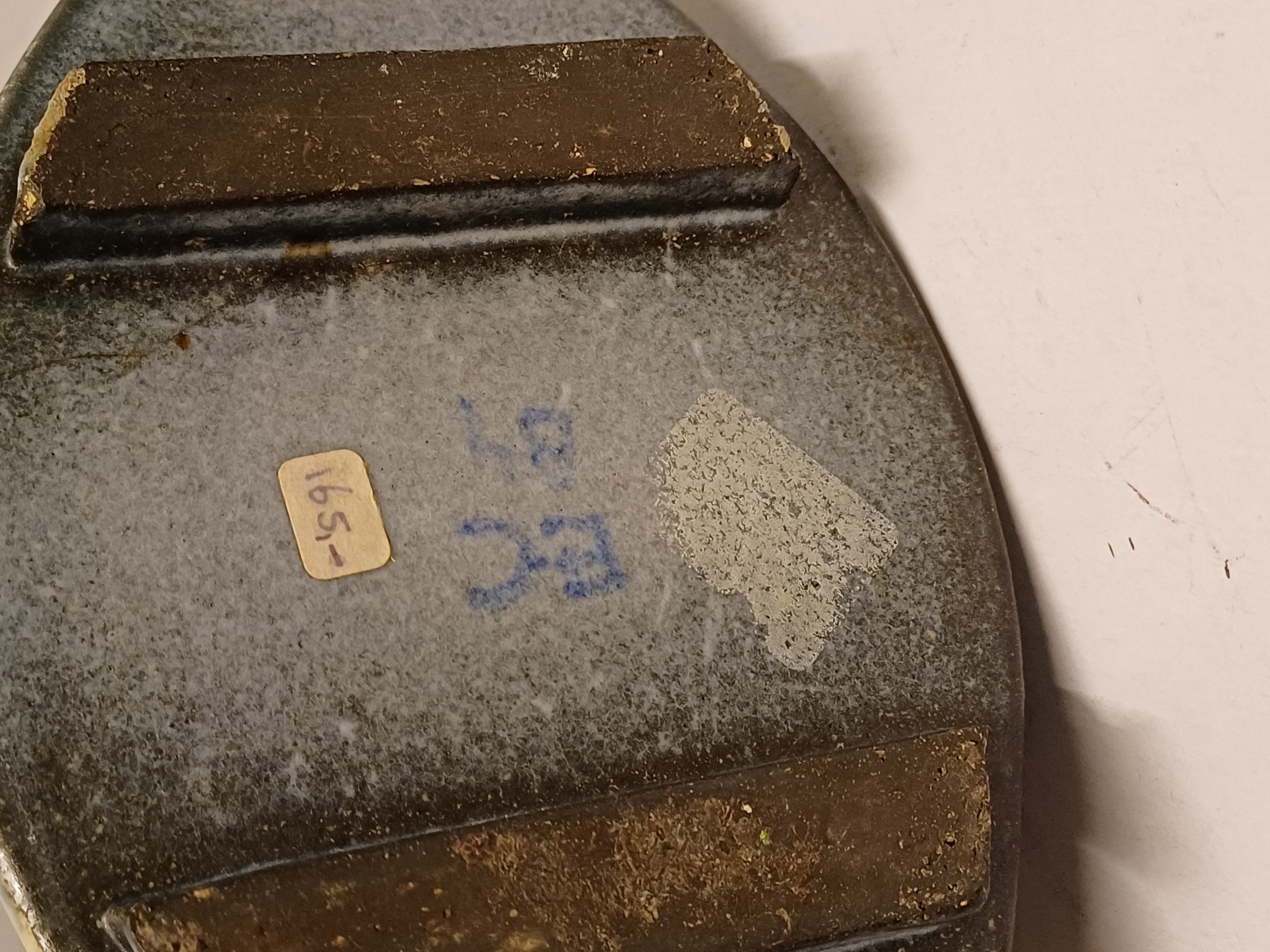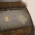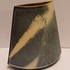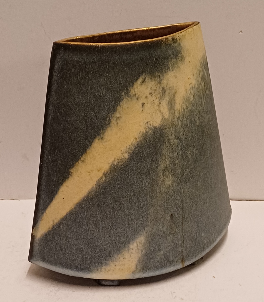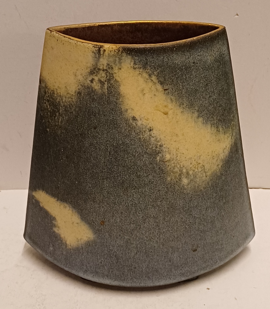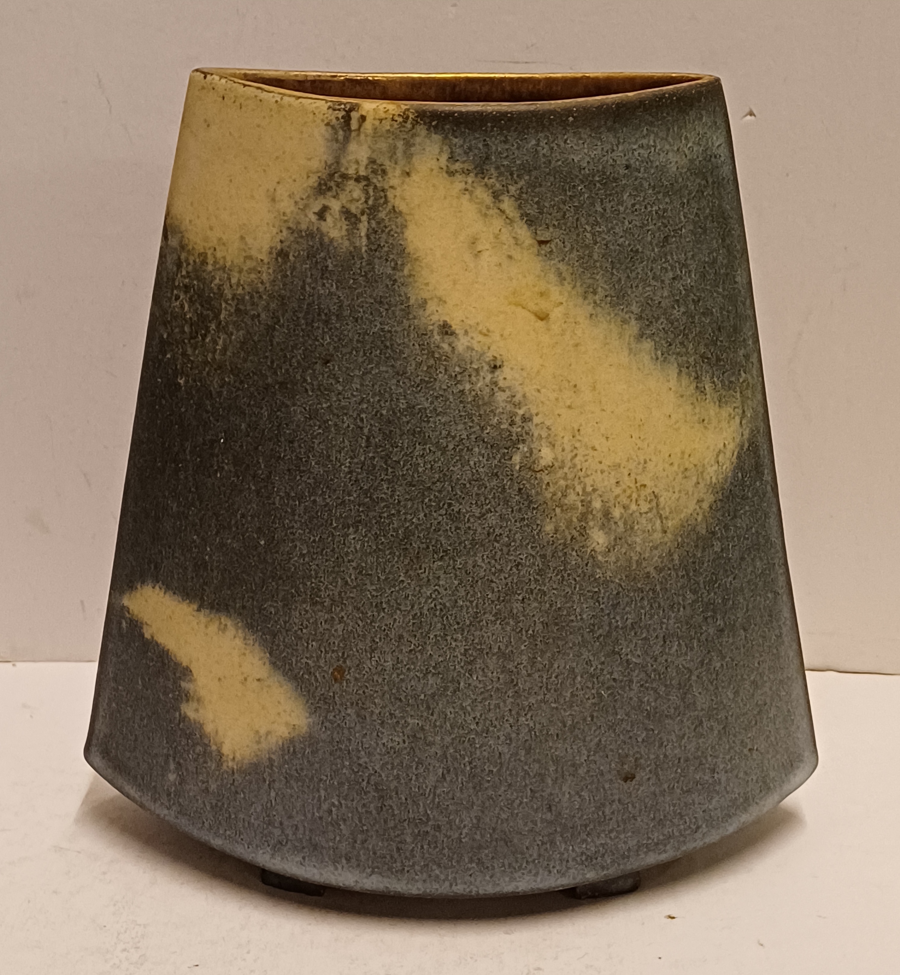 Earthenware vase with blue sprayed glaze on a cream base. Bottom marked and dated '84.