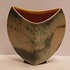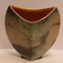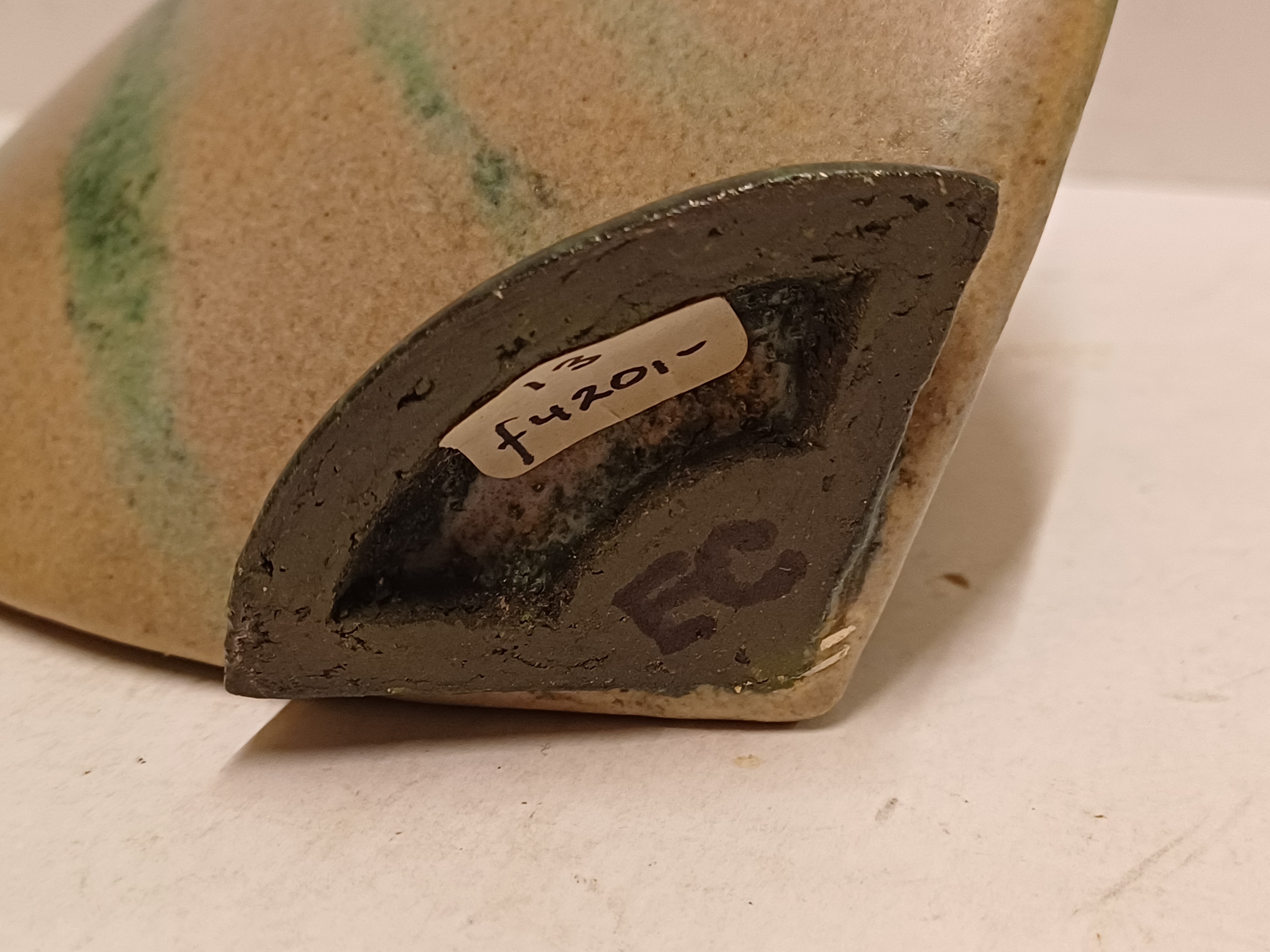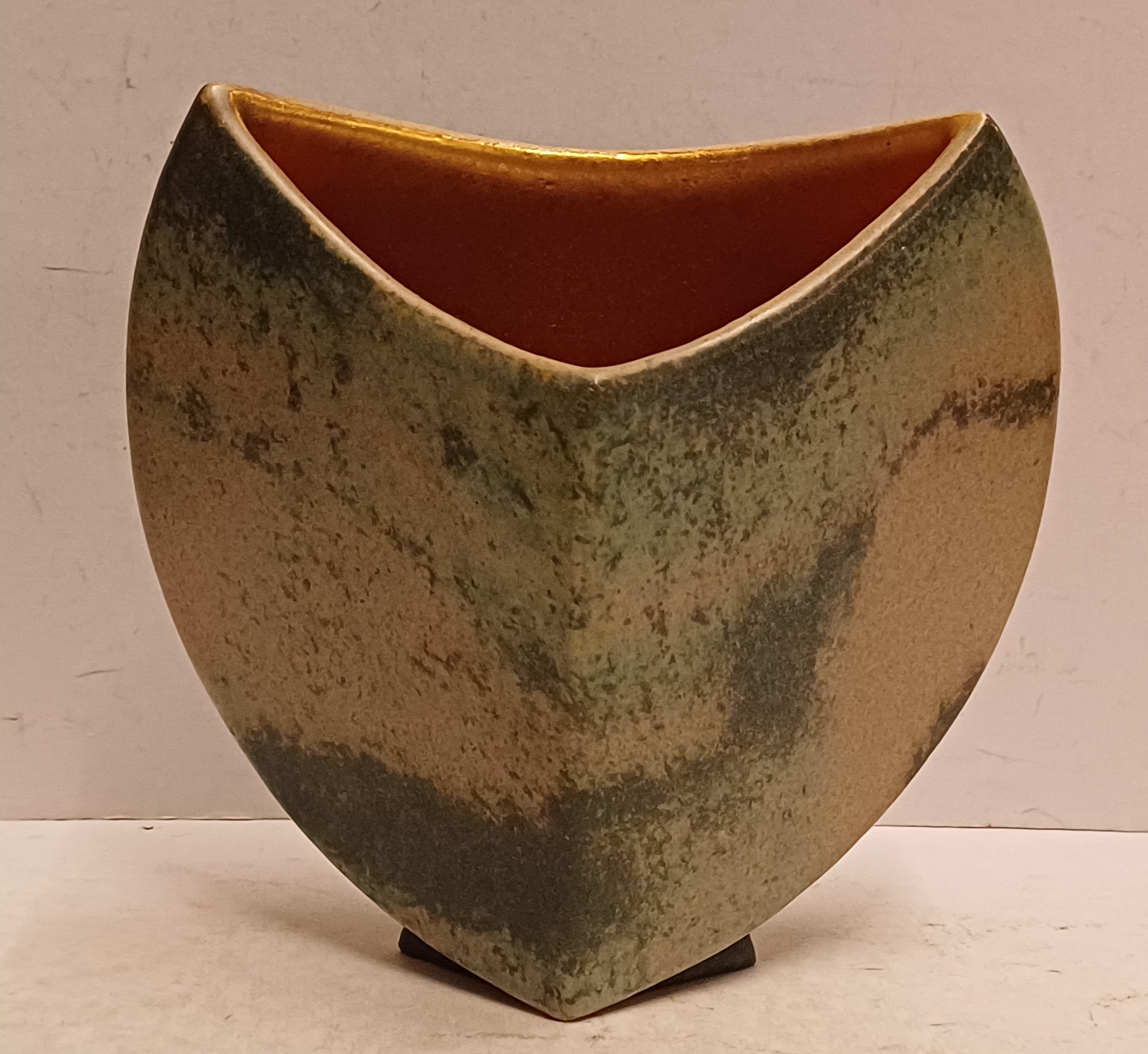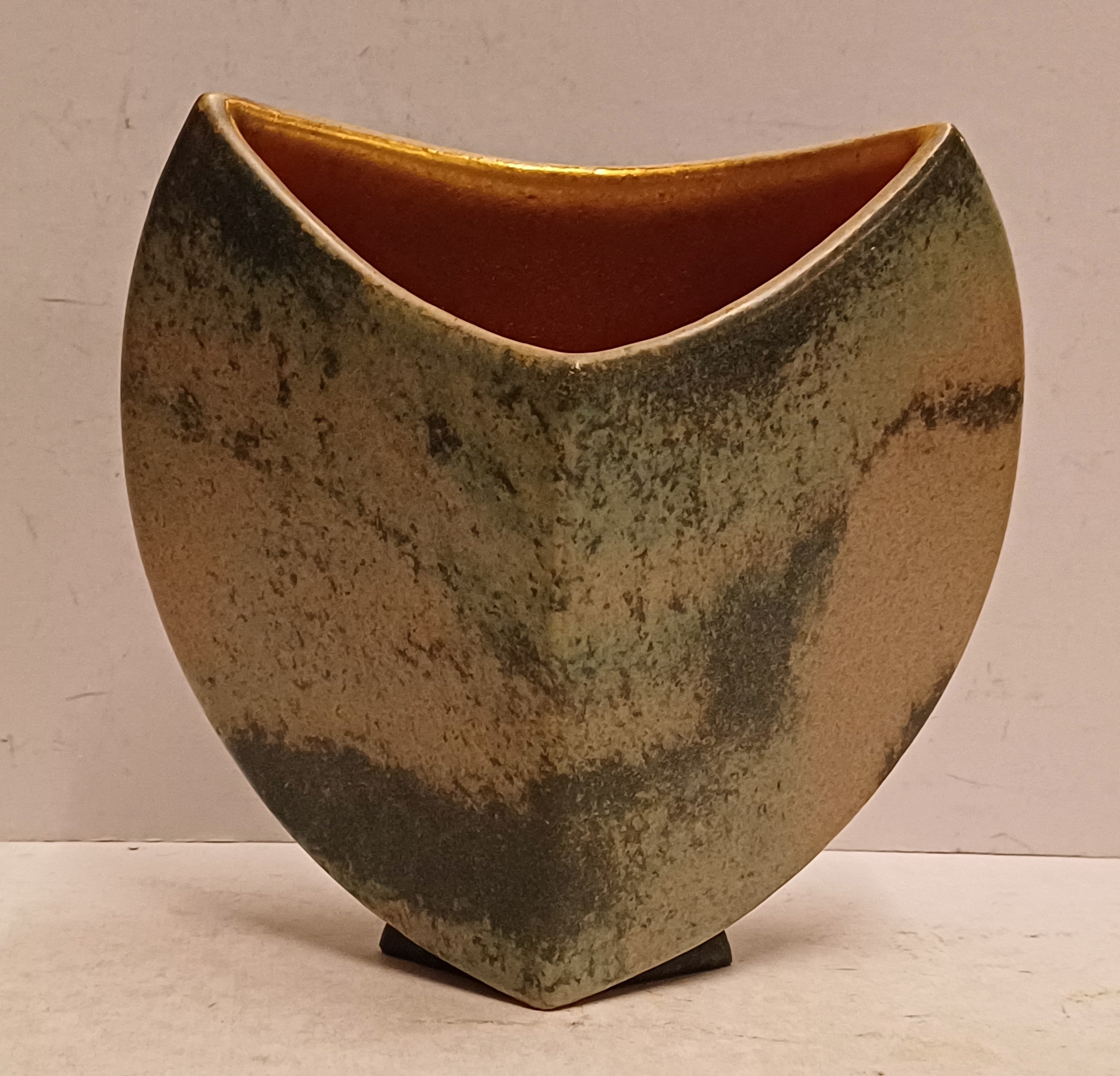 Aardewerken gegoten vaas met gesprayde glazuur en elipsvormige mondopening. Onderzijde gemerkt