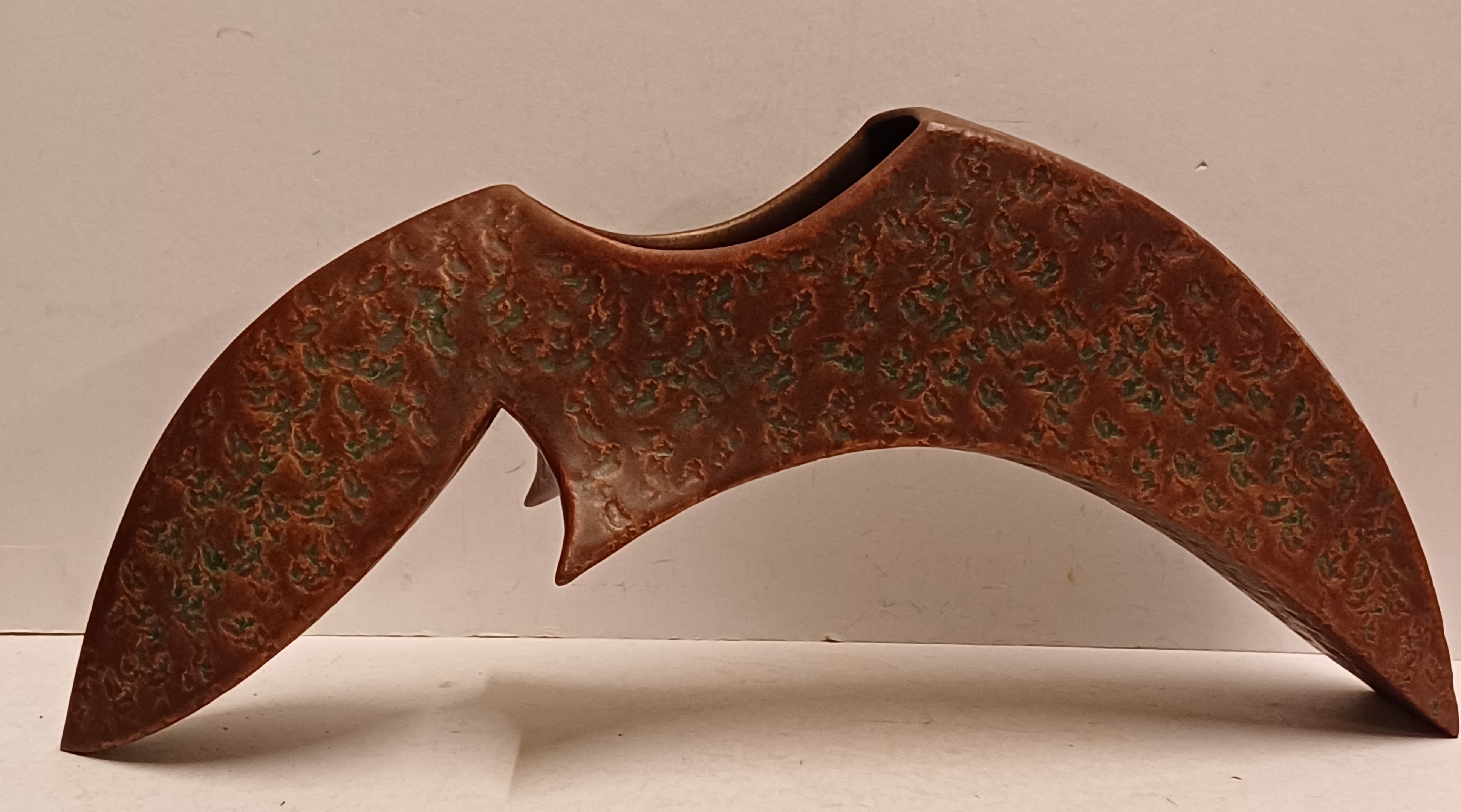 Vrij vormgegevens vaas met donker rode glazuur met fijne groene decoratie. Onderzijde gesigneerd.