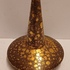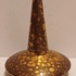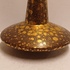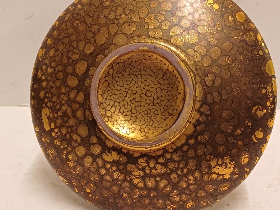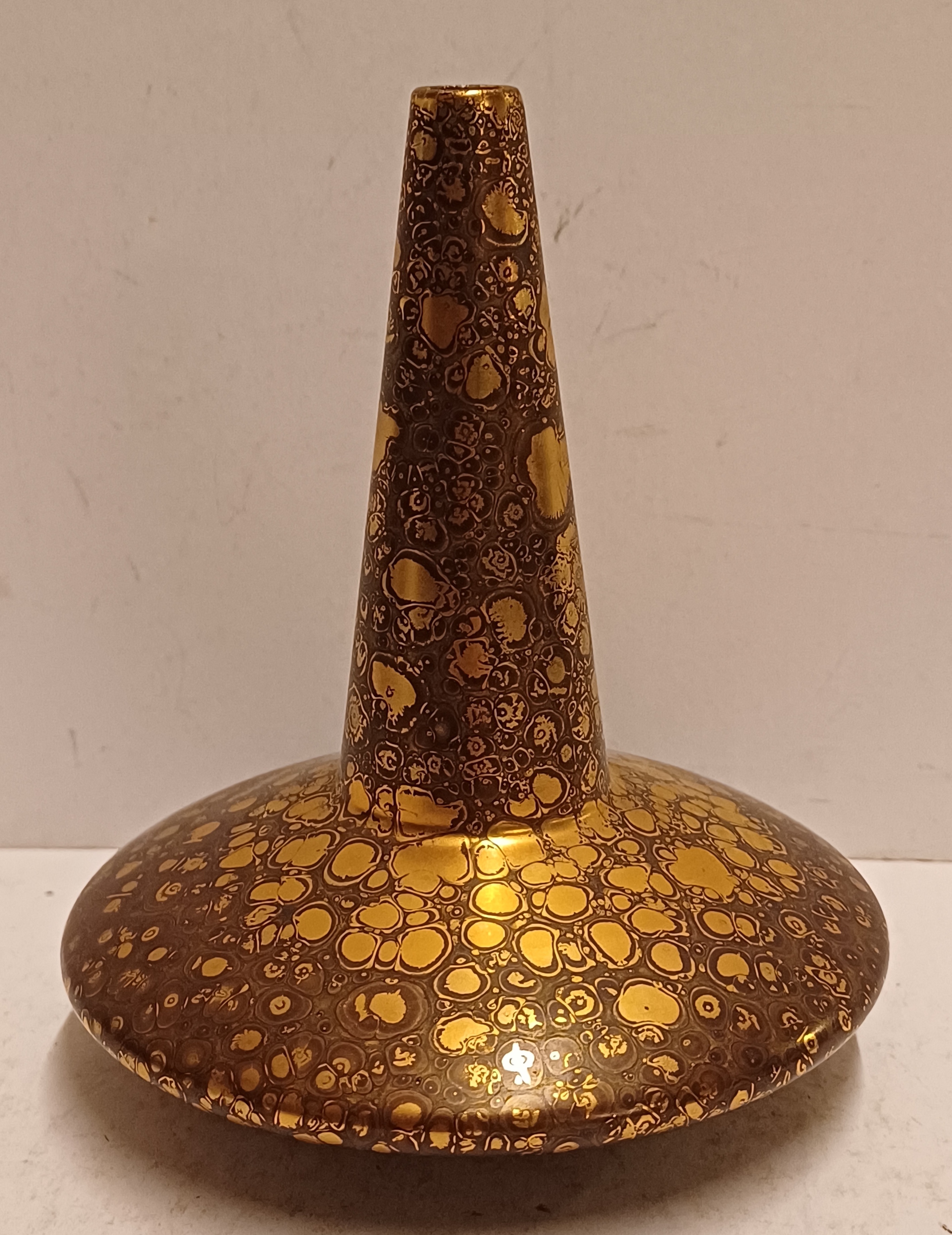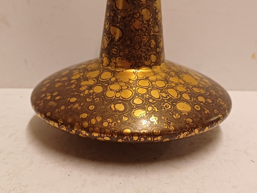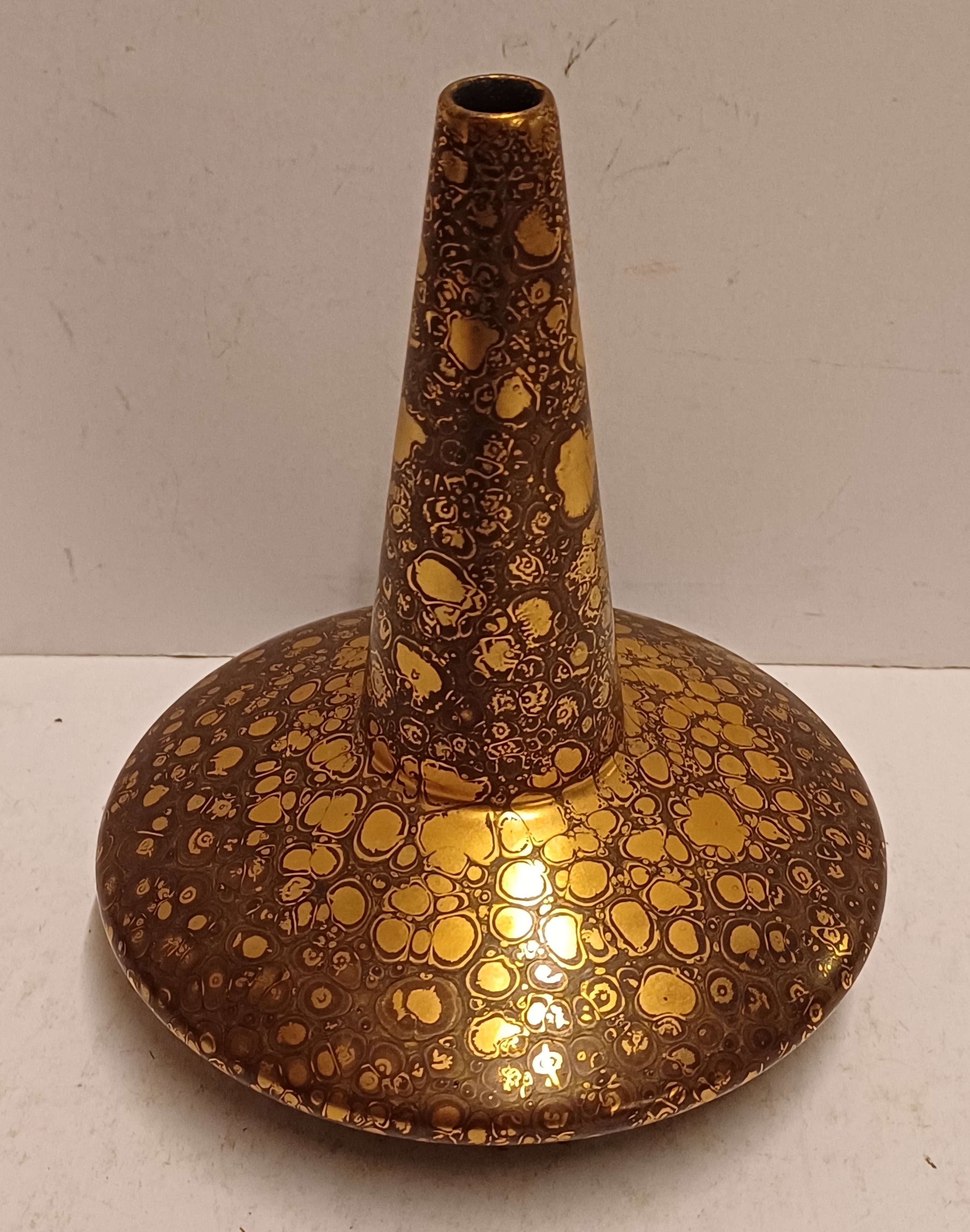 Cast vase, discus-shaped with a long conical neck. With spotted brown-gold glaze. Not signed.