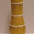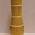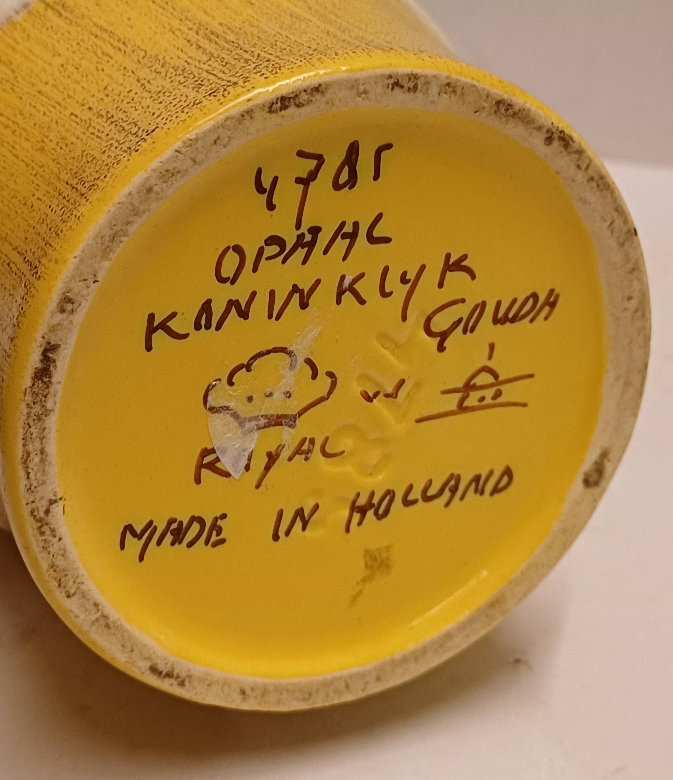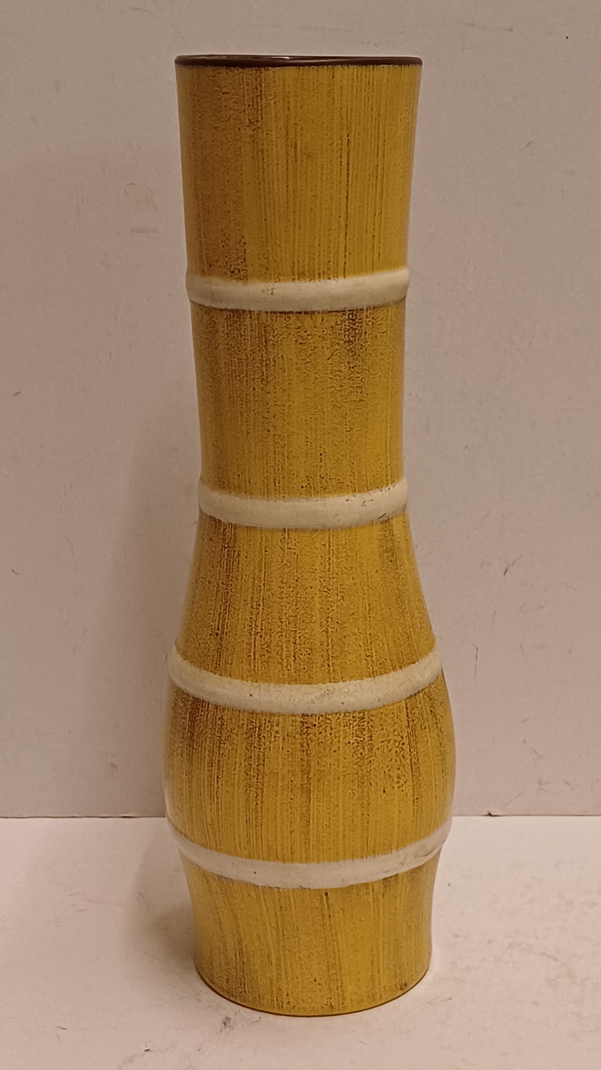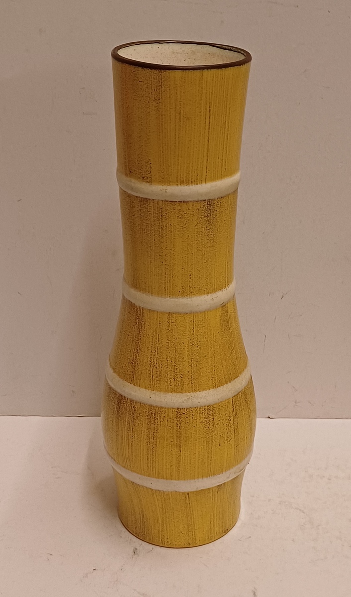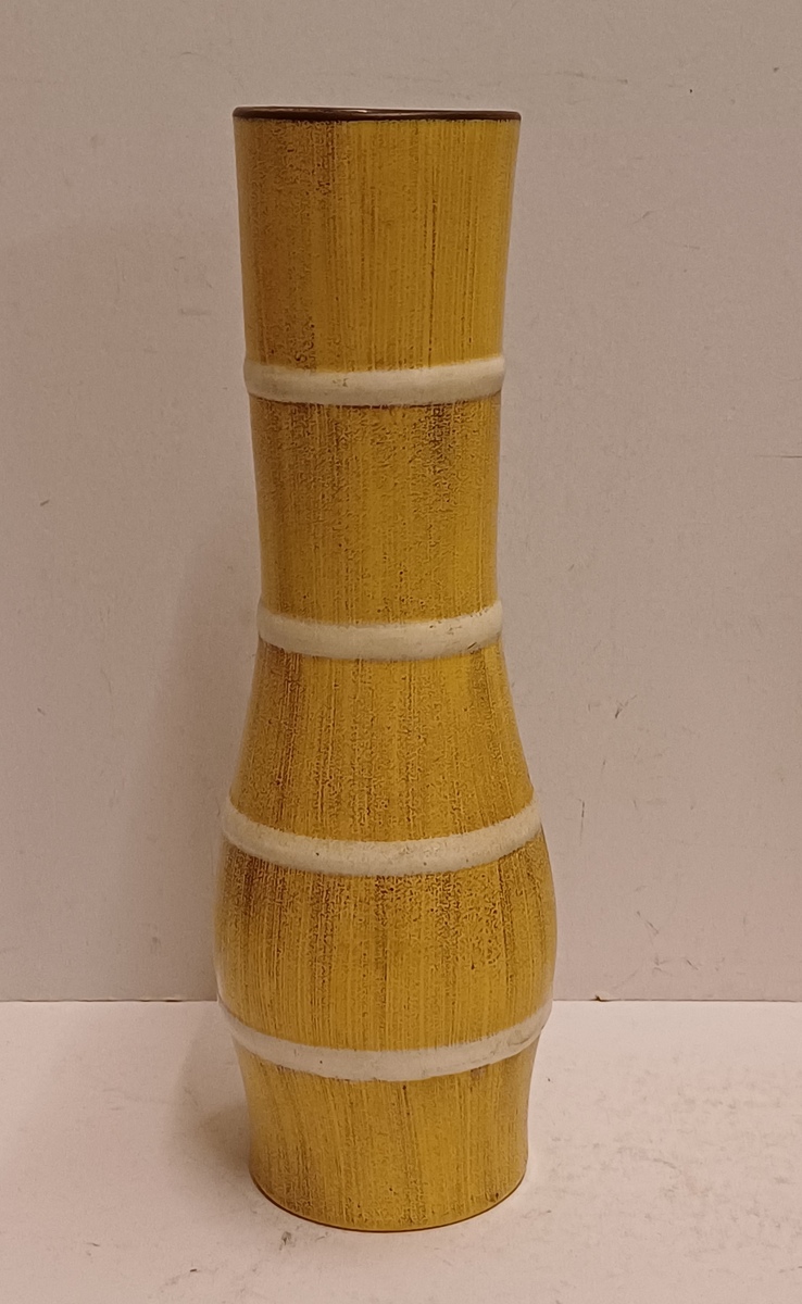 Aardewerken vaas met uitlopende hals, met decoratie opaal in geel met witte banen,. Onderzijde met fabrieksmerk.